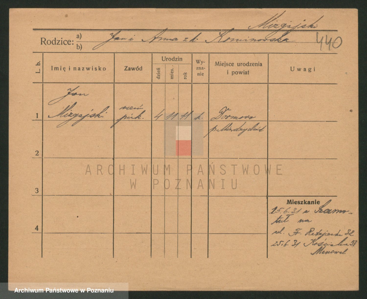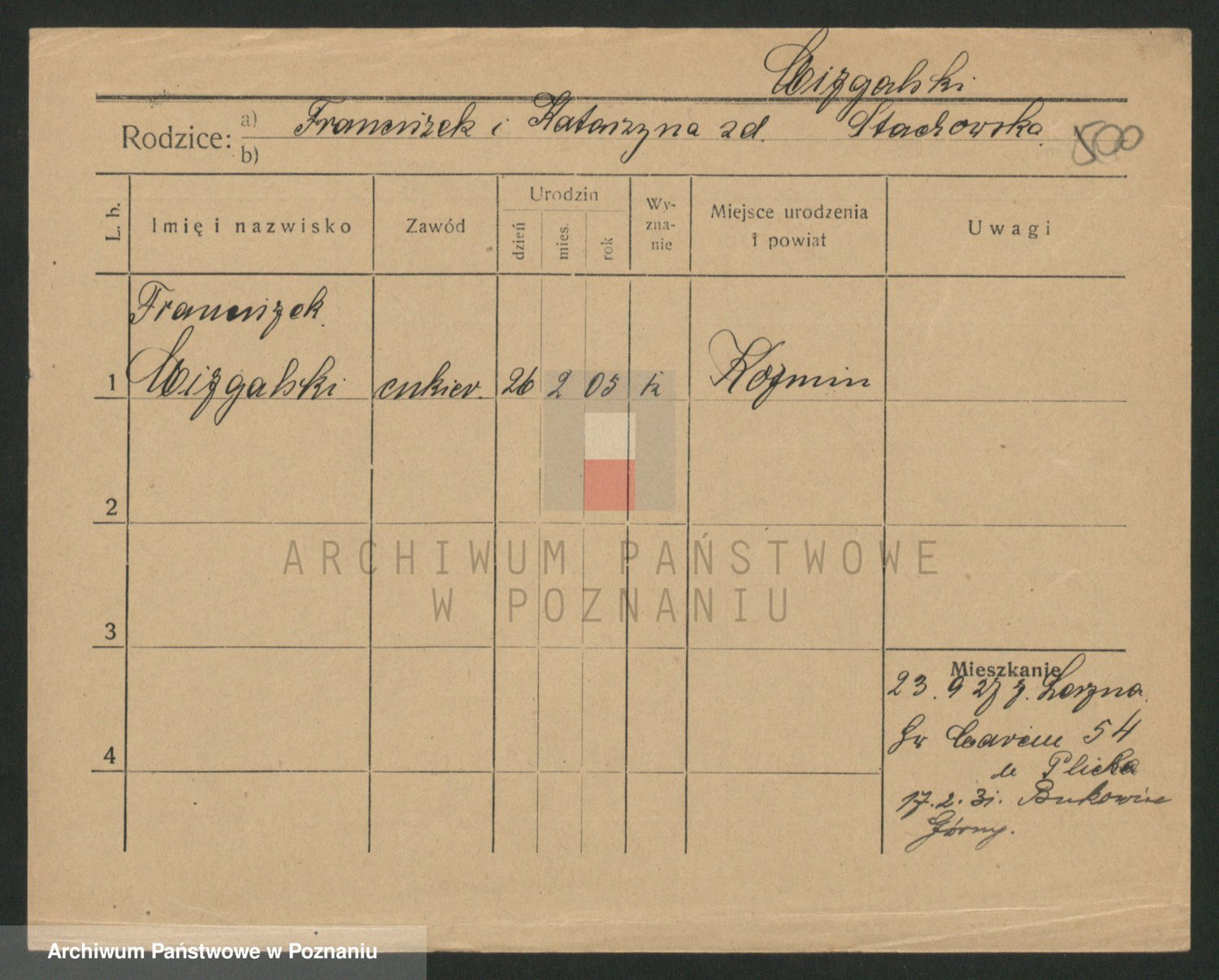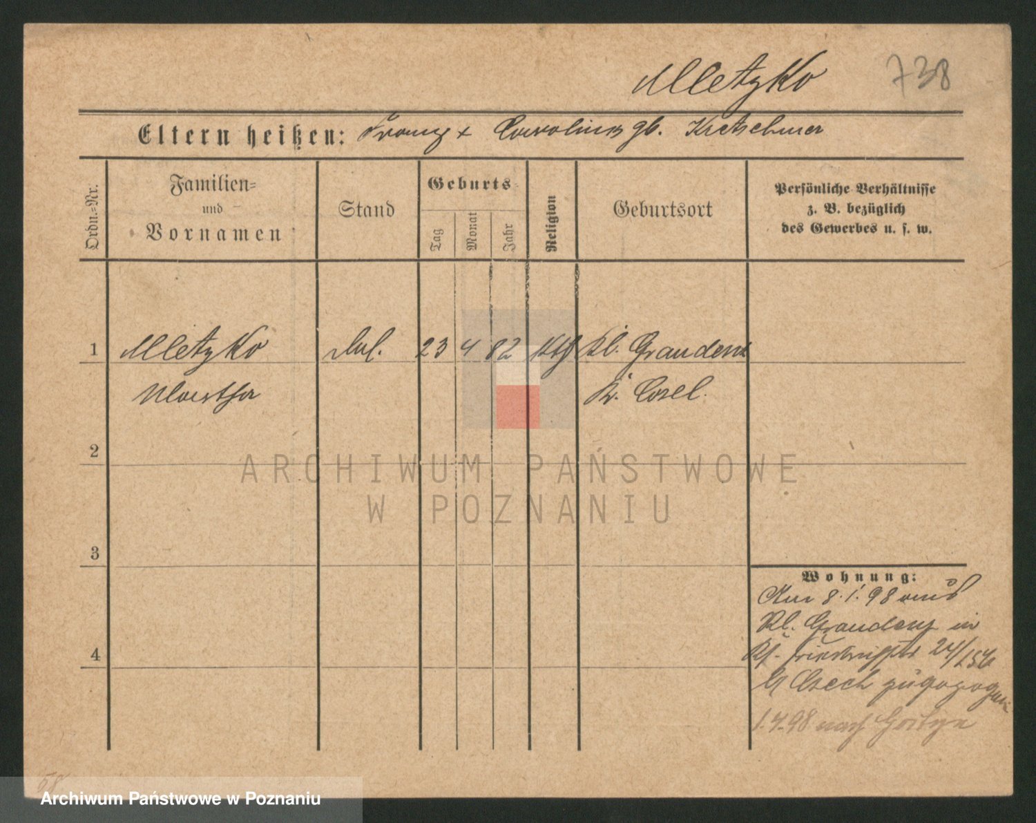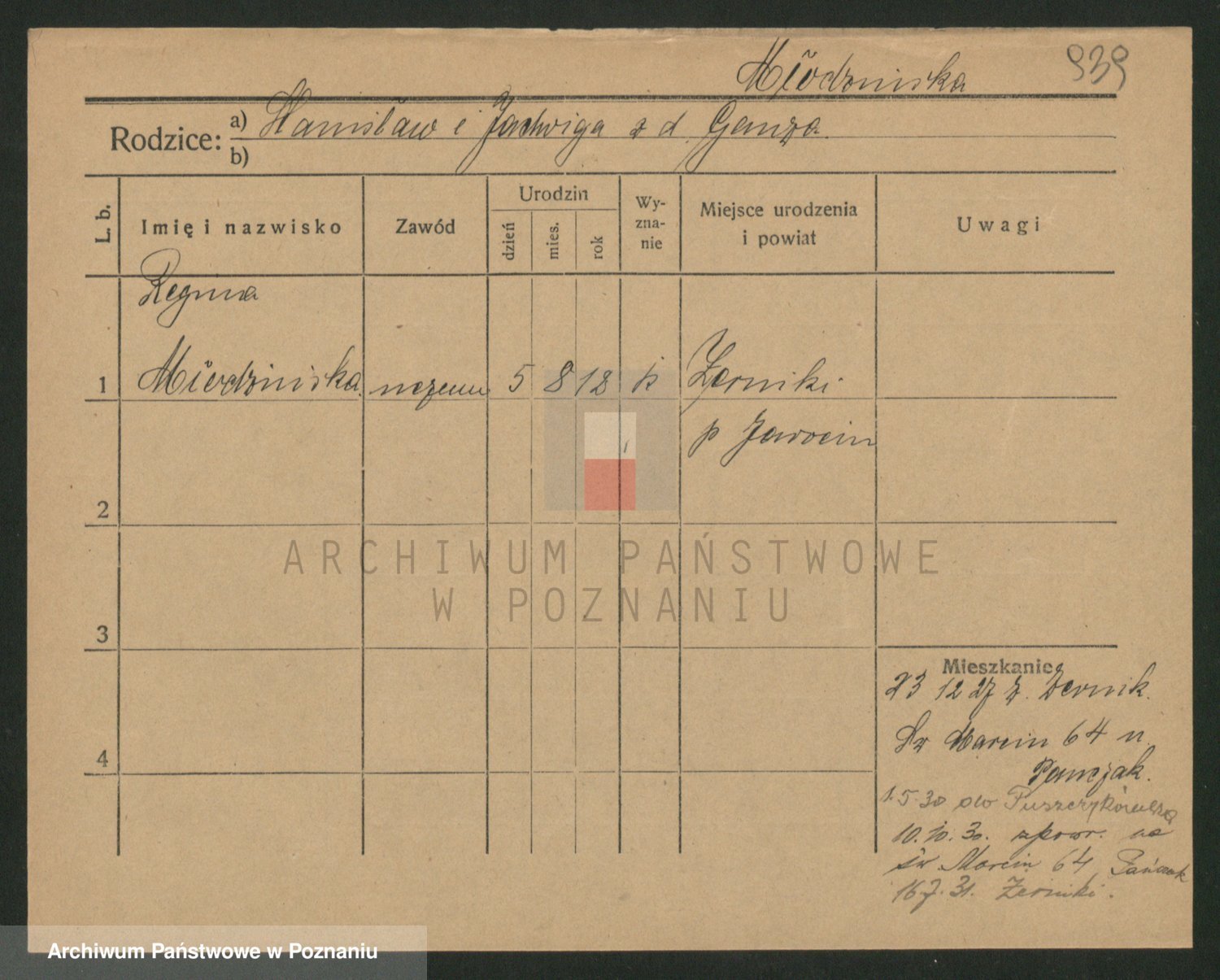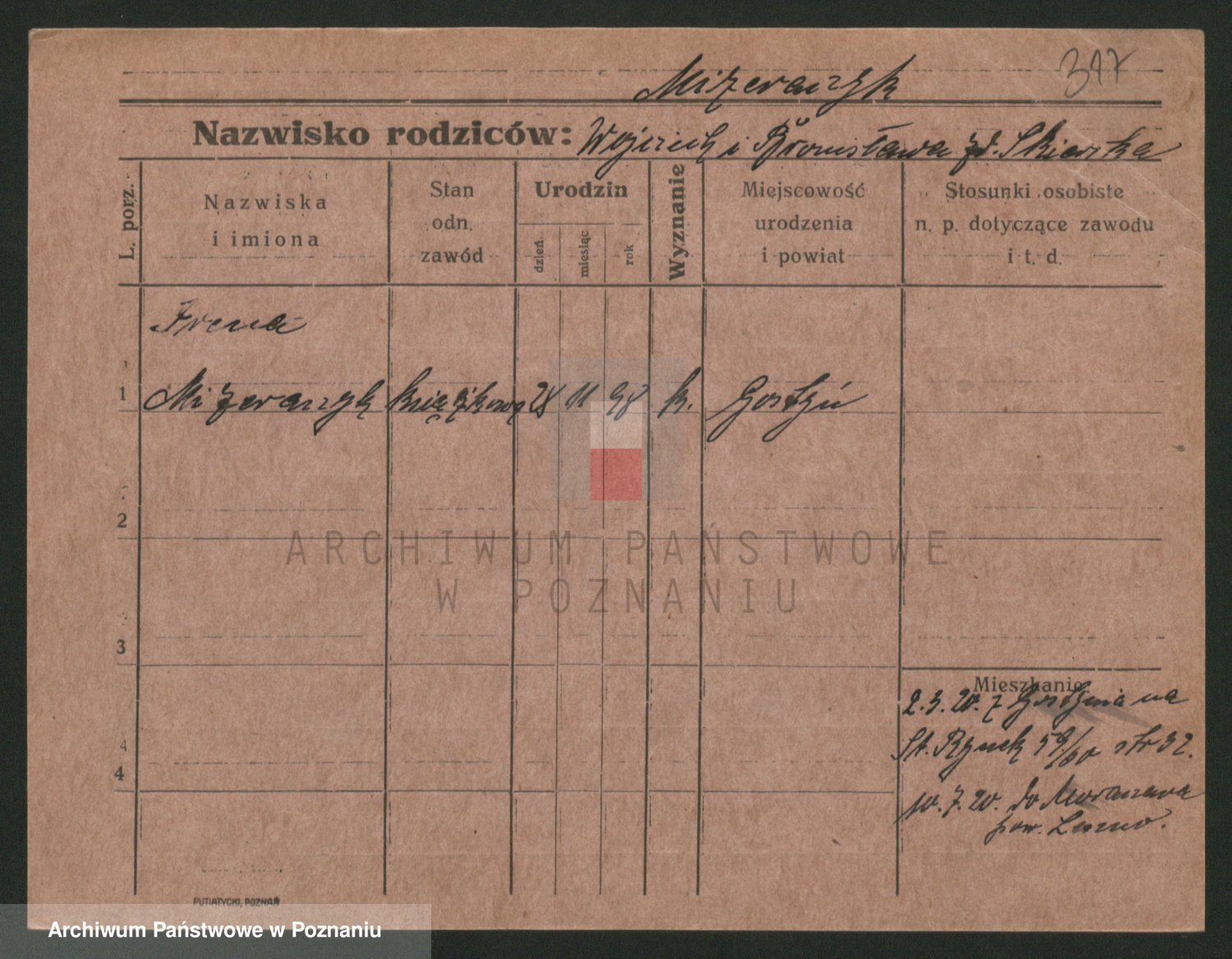 Podgląd karty osobowej dostępny jest po kliknięciu na nazwisko lub ikonkę karty. Można dokonywać powiększenia (ikony na górze) lub przechodzić między kolejnymi skanami (strzałki po bokach).