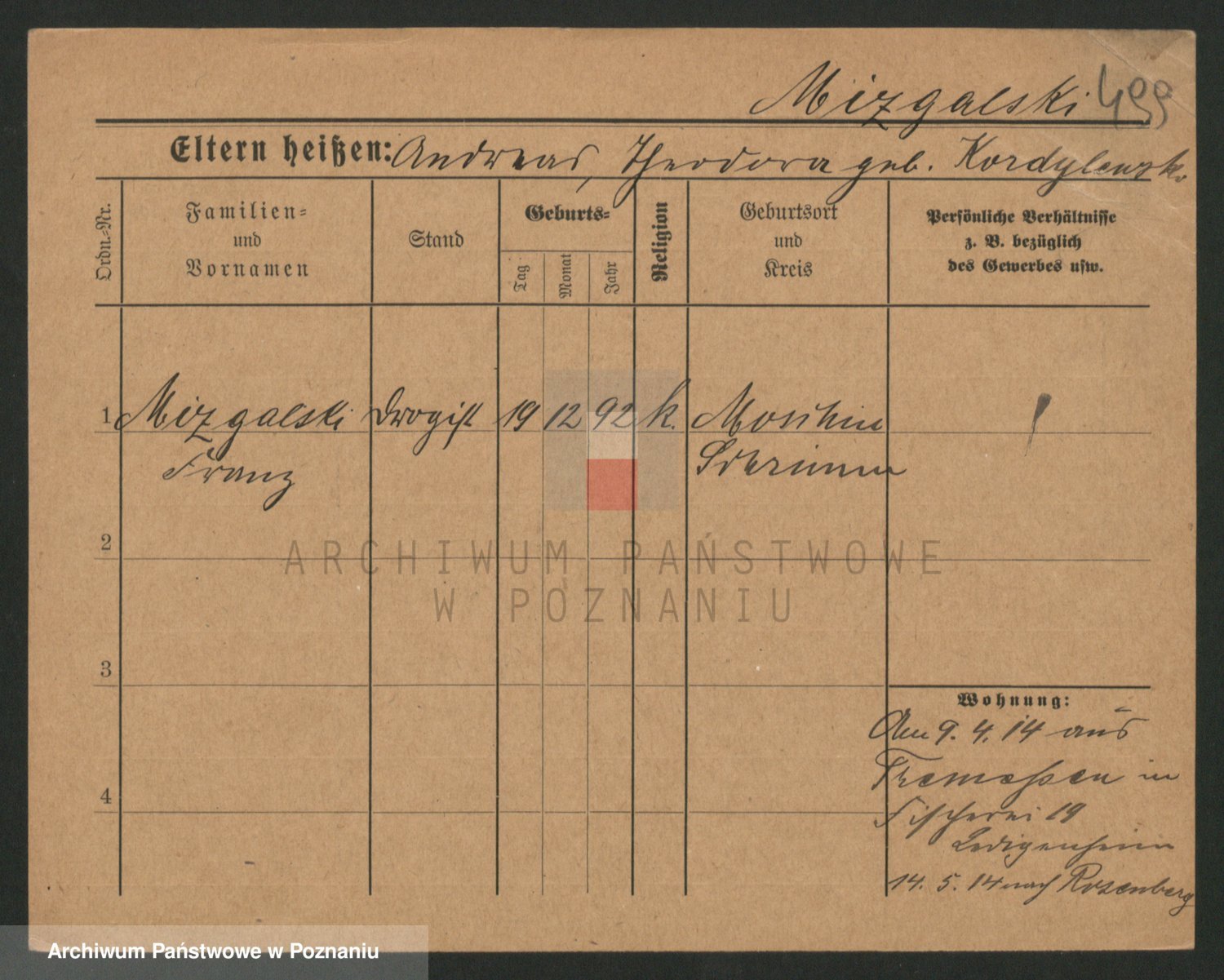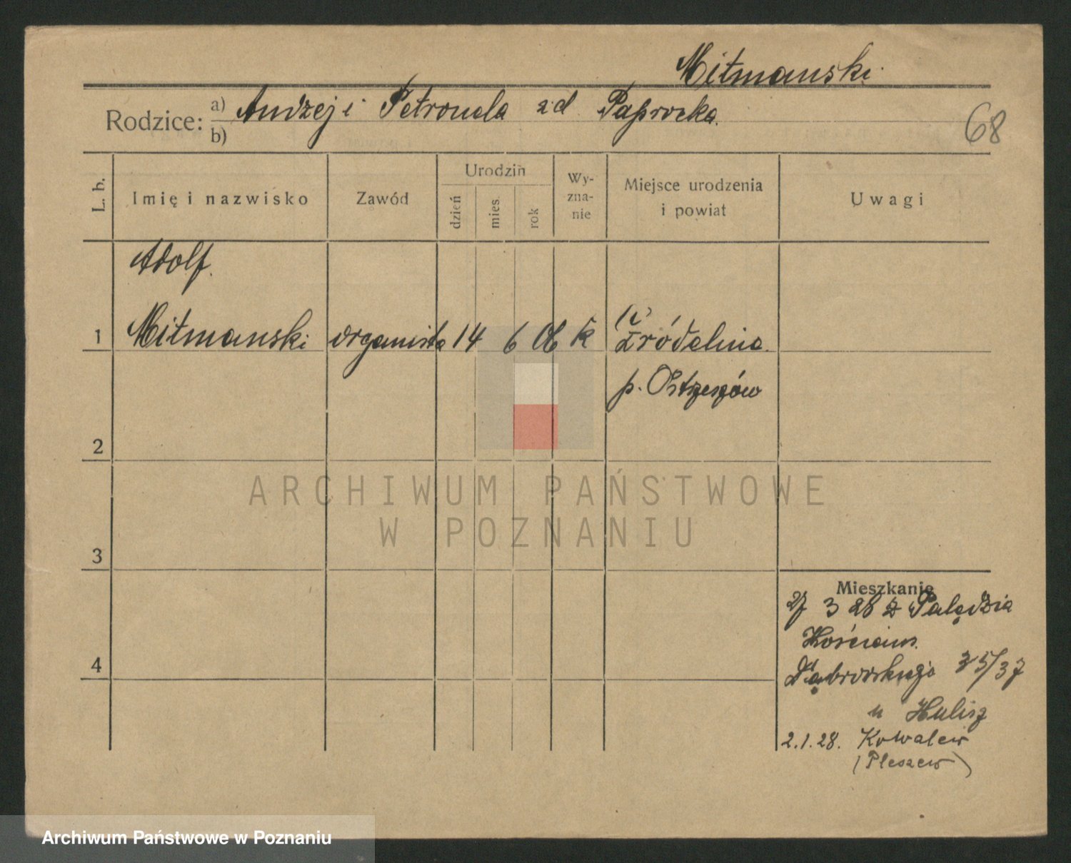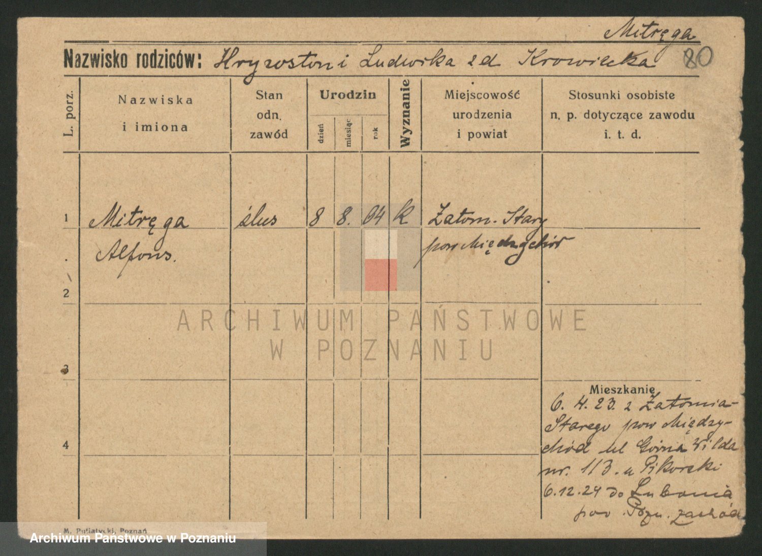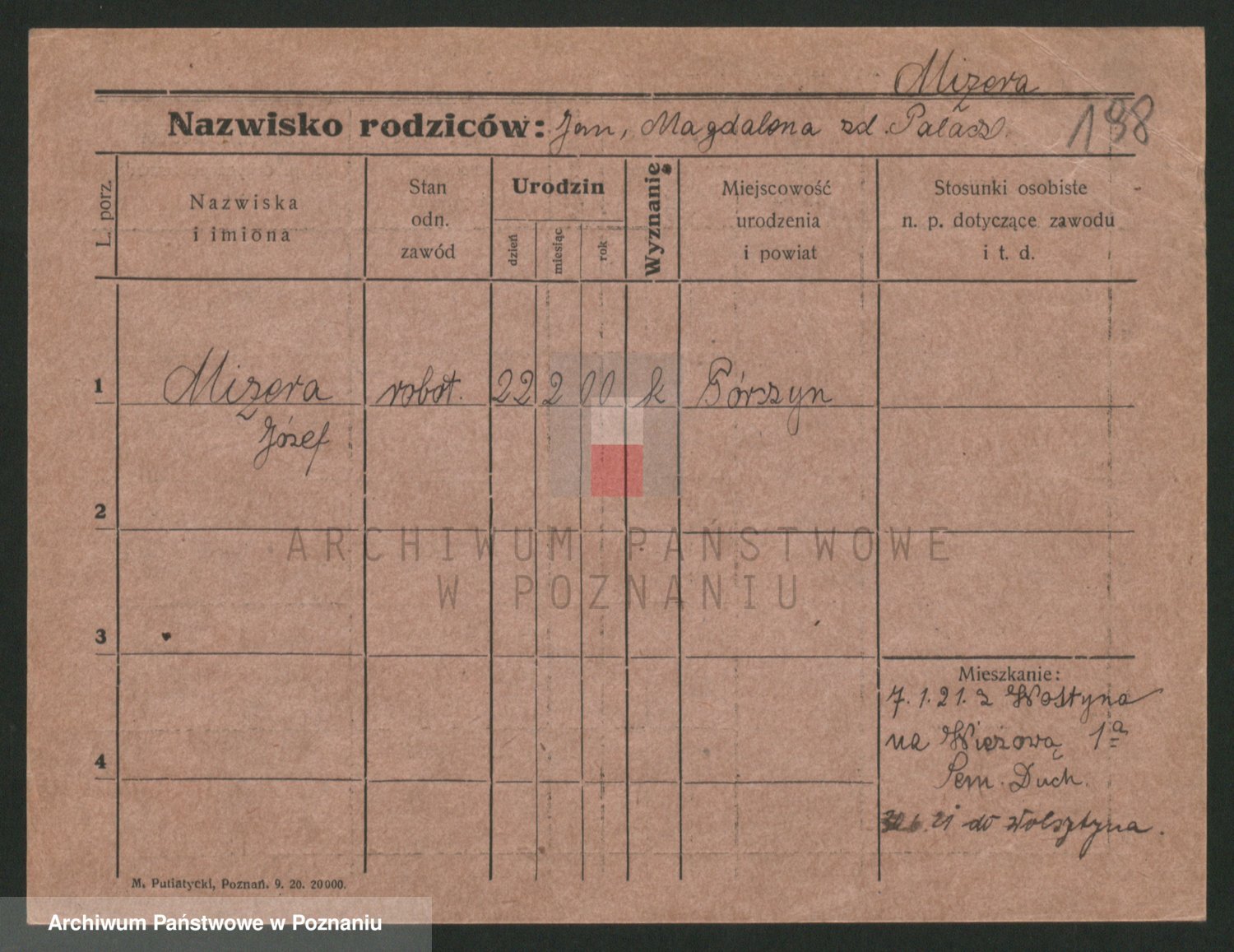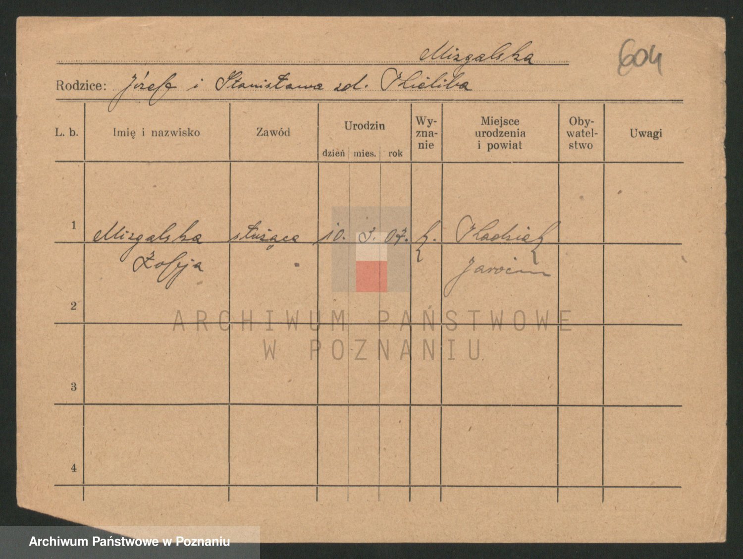 Podgląd karty osobowej dostępny jest po kliknięciu na nazwisko lub ikonkę karty. Można dokonywać powiększenia (ikony na górze) lub przechodzić między kolejnymi skanami (strzałki po bokach).