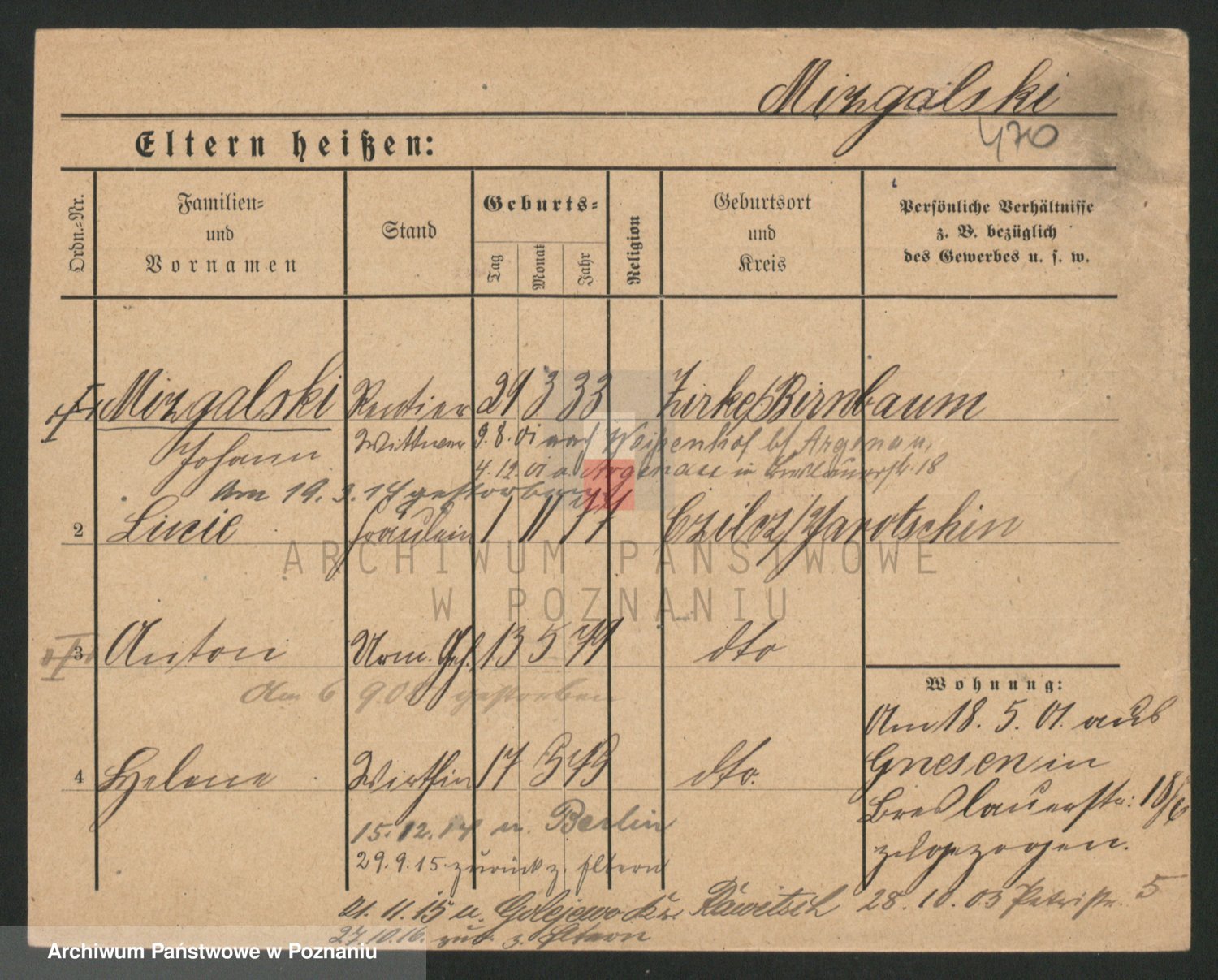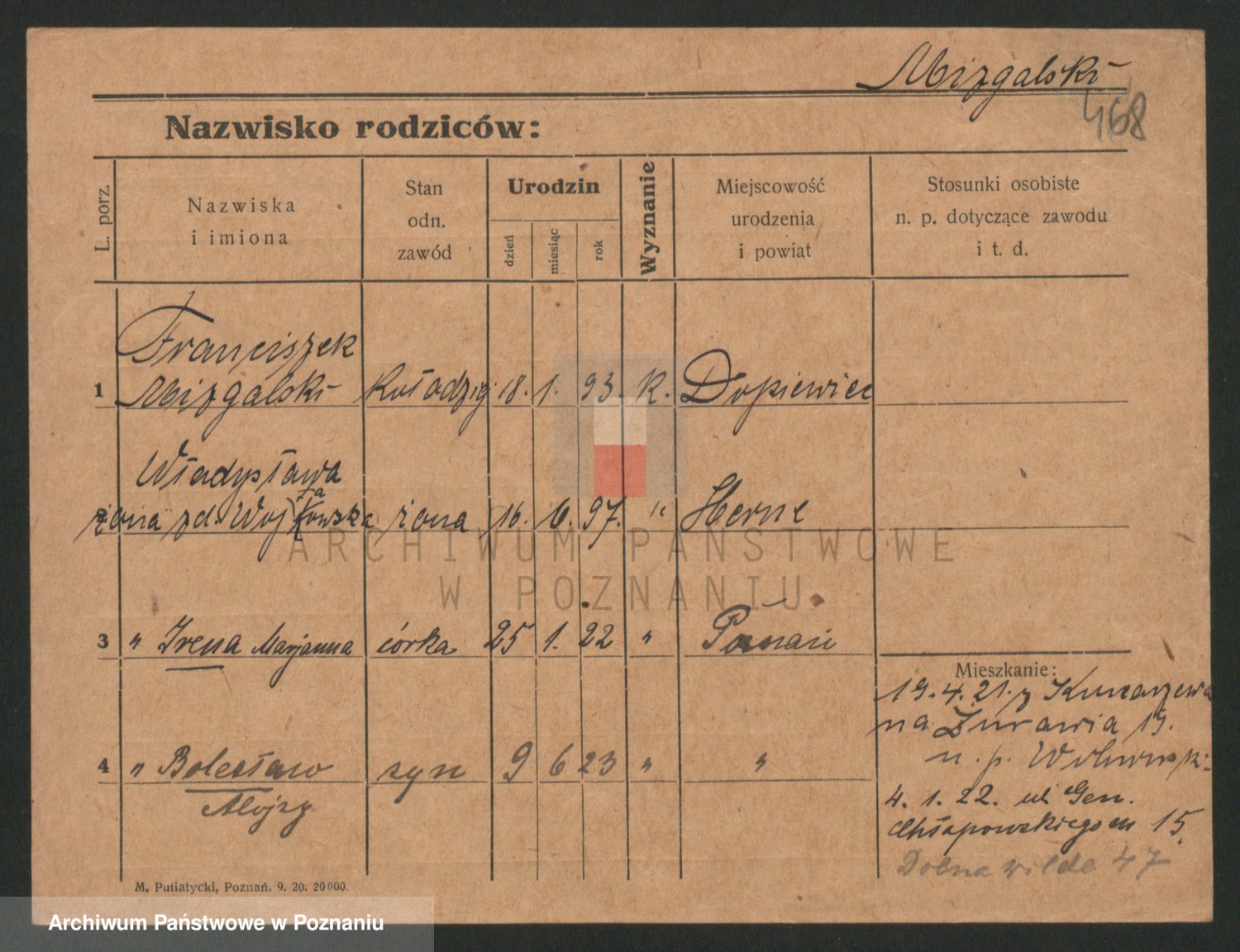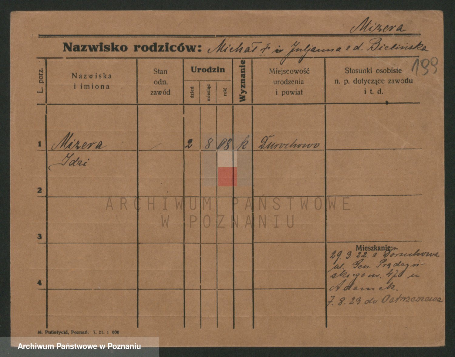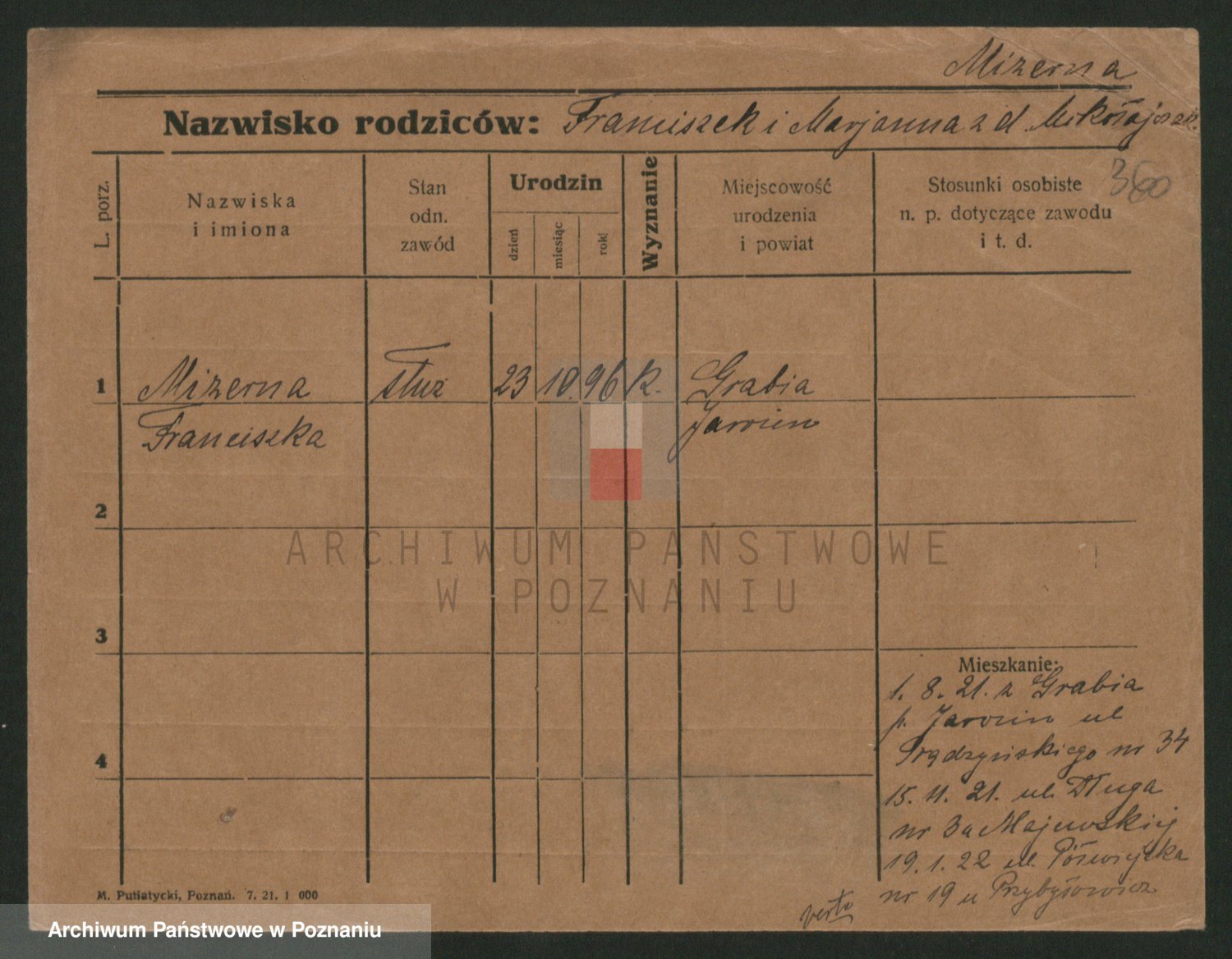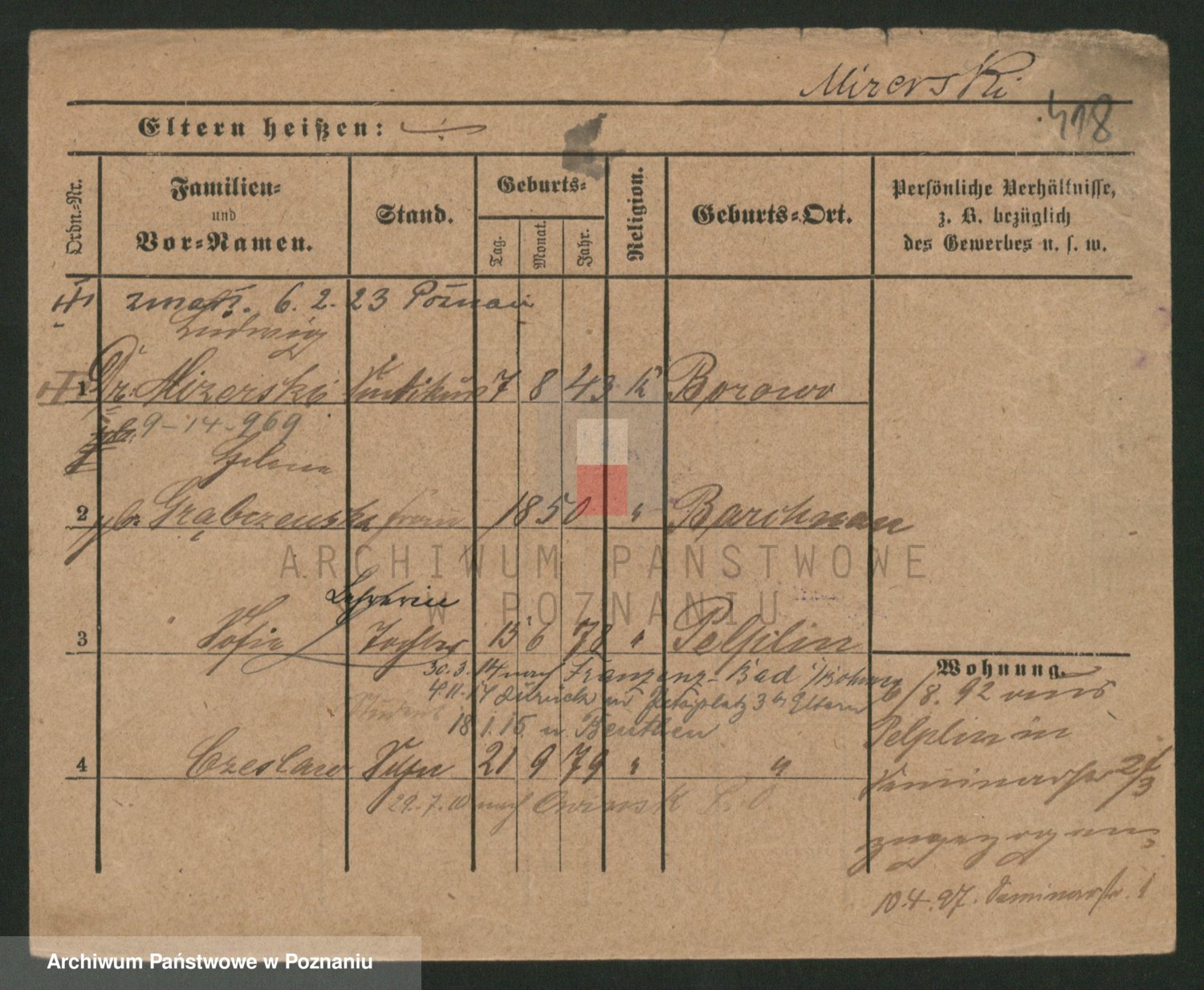 Podgląd karty osobowej dostępny jest po kliknięciu na nazwisko lub ikonkę karty. Można dokonywać powiększenia (ikony na górze) lub przechodzić między kolejnymi skanami (strzałki po bokach).