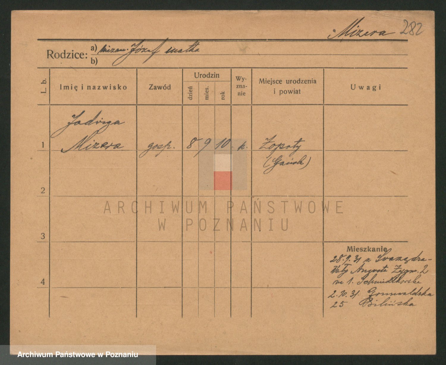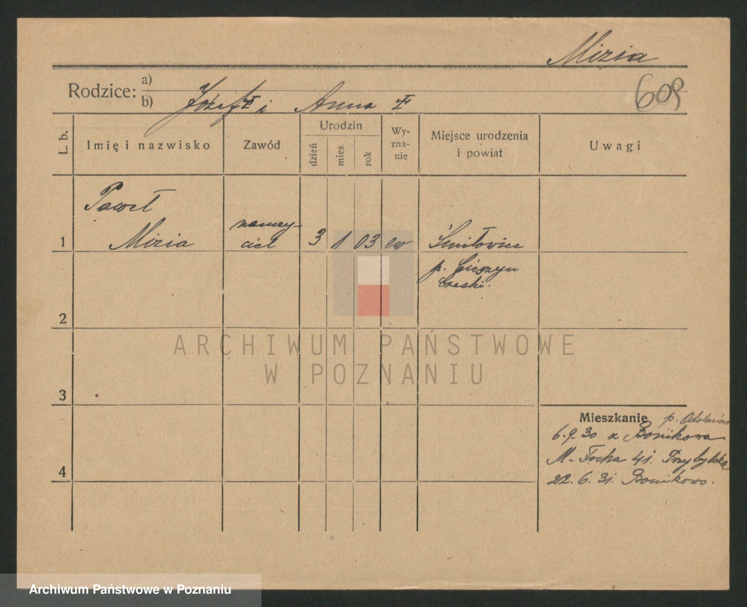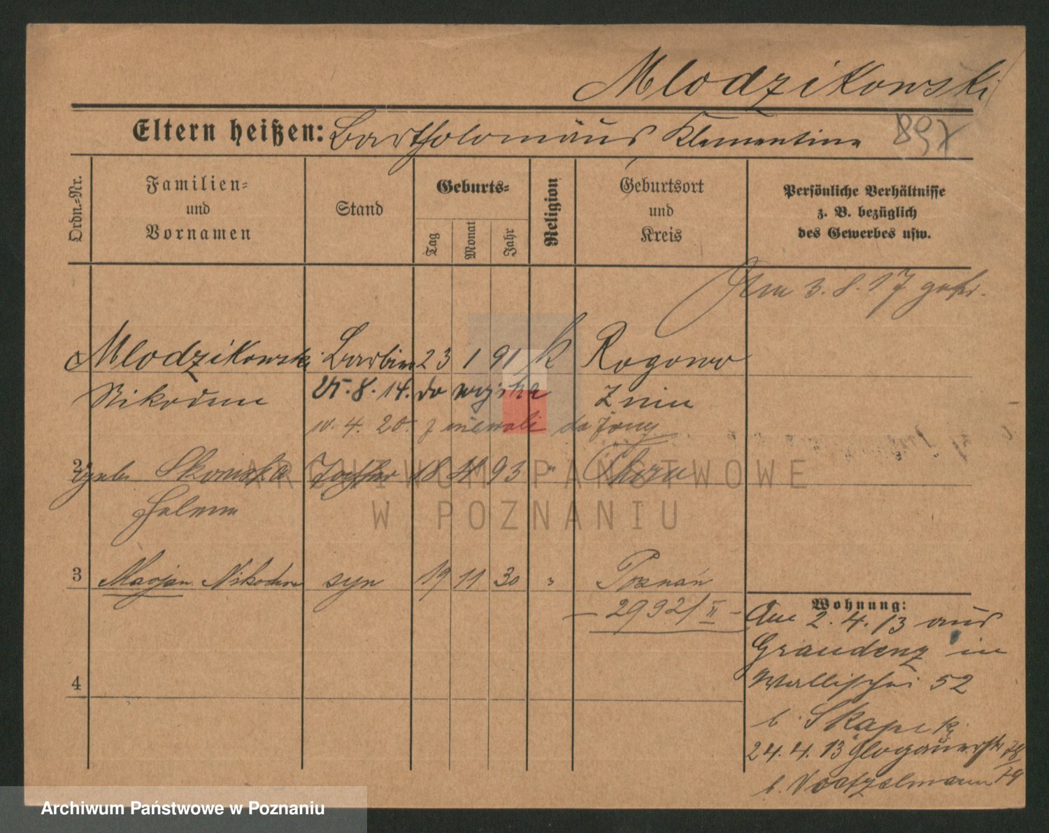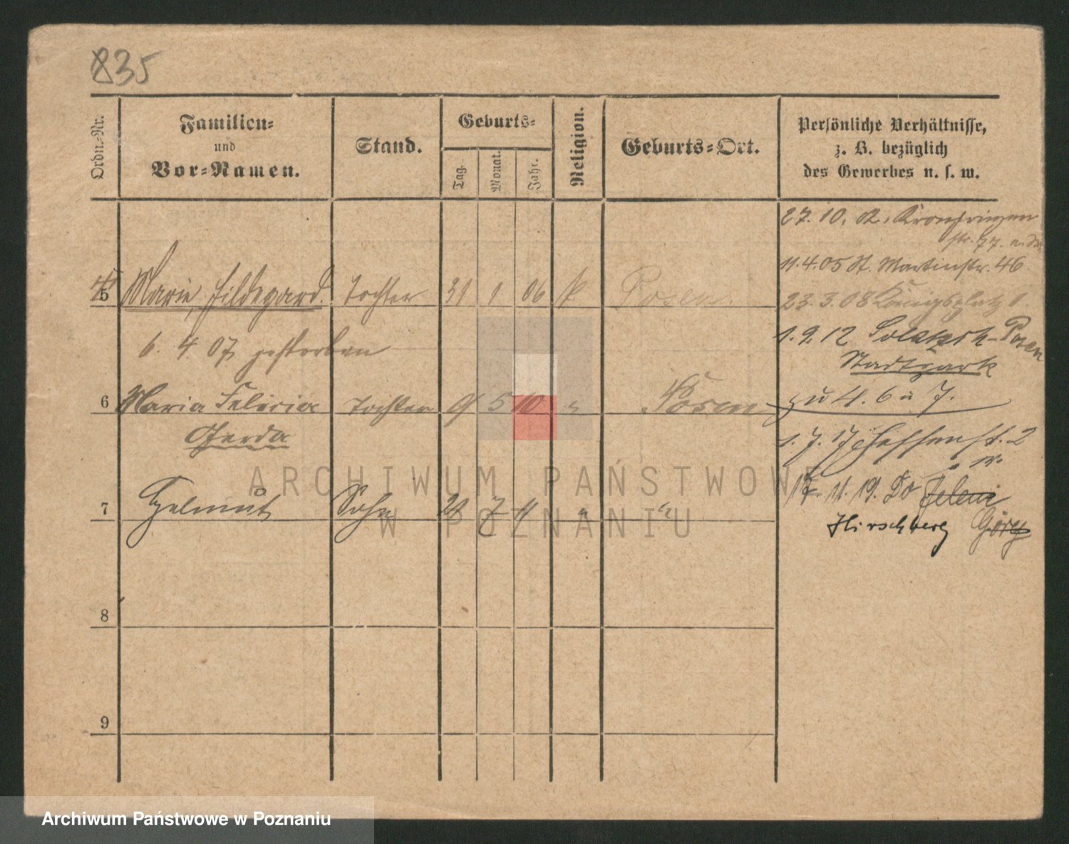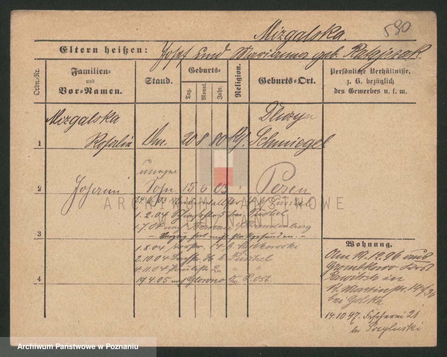 Podgląd karty osobowej dostępny jest po kliknięciu na nazwisko lub ikonkę karty. Można dokonywać powiększenia (ikony na górze) lub przechodzić między kolejnymi skanami (strzałki po bokach).