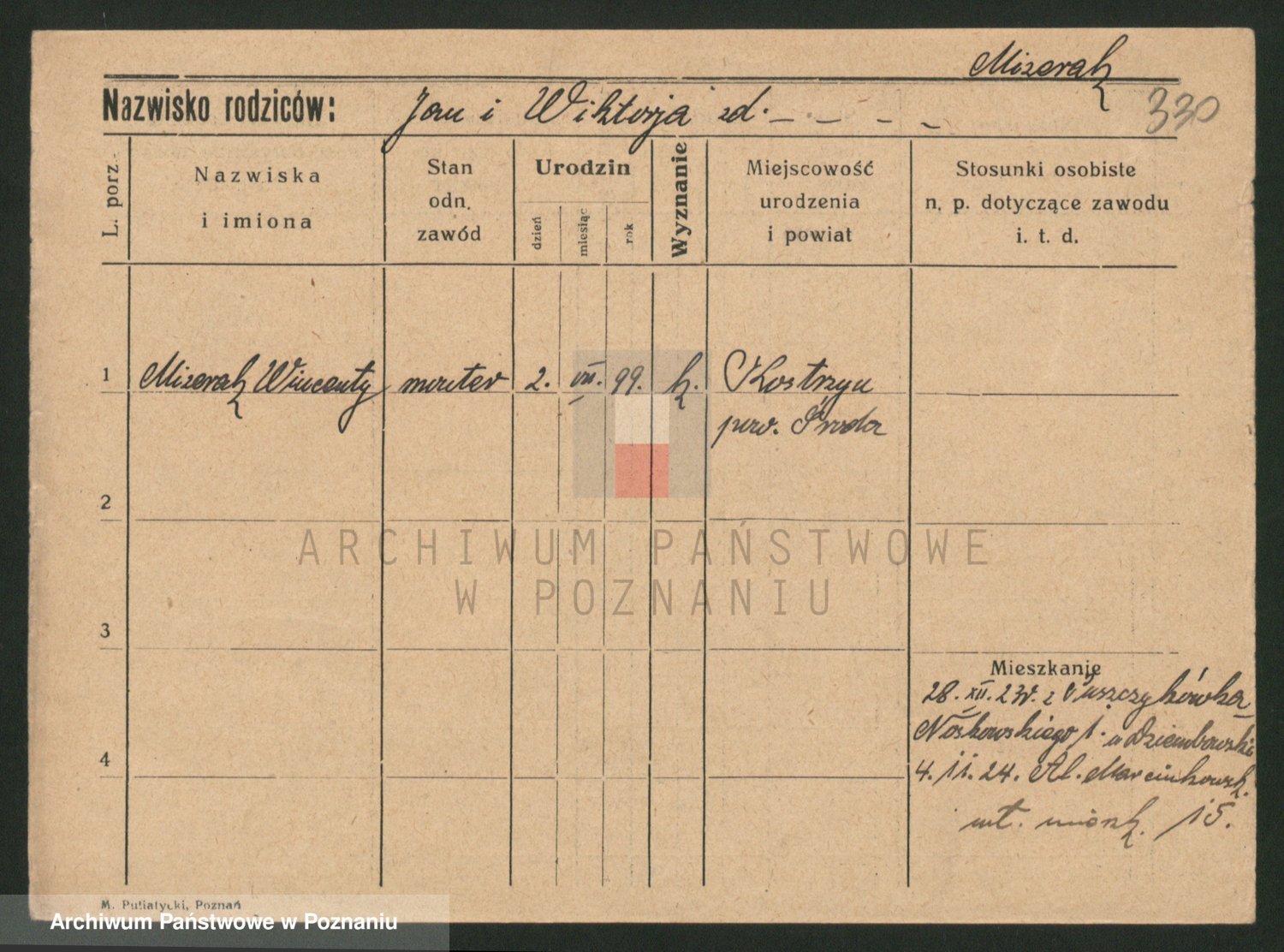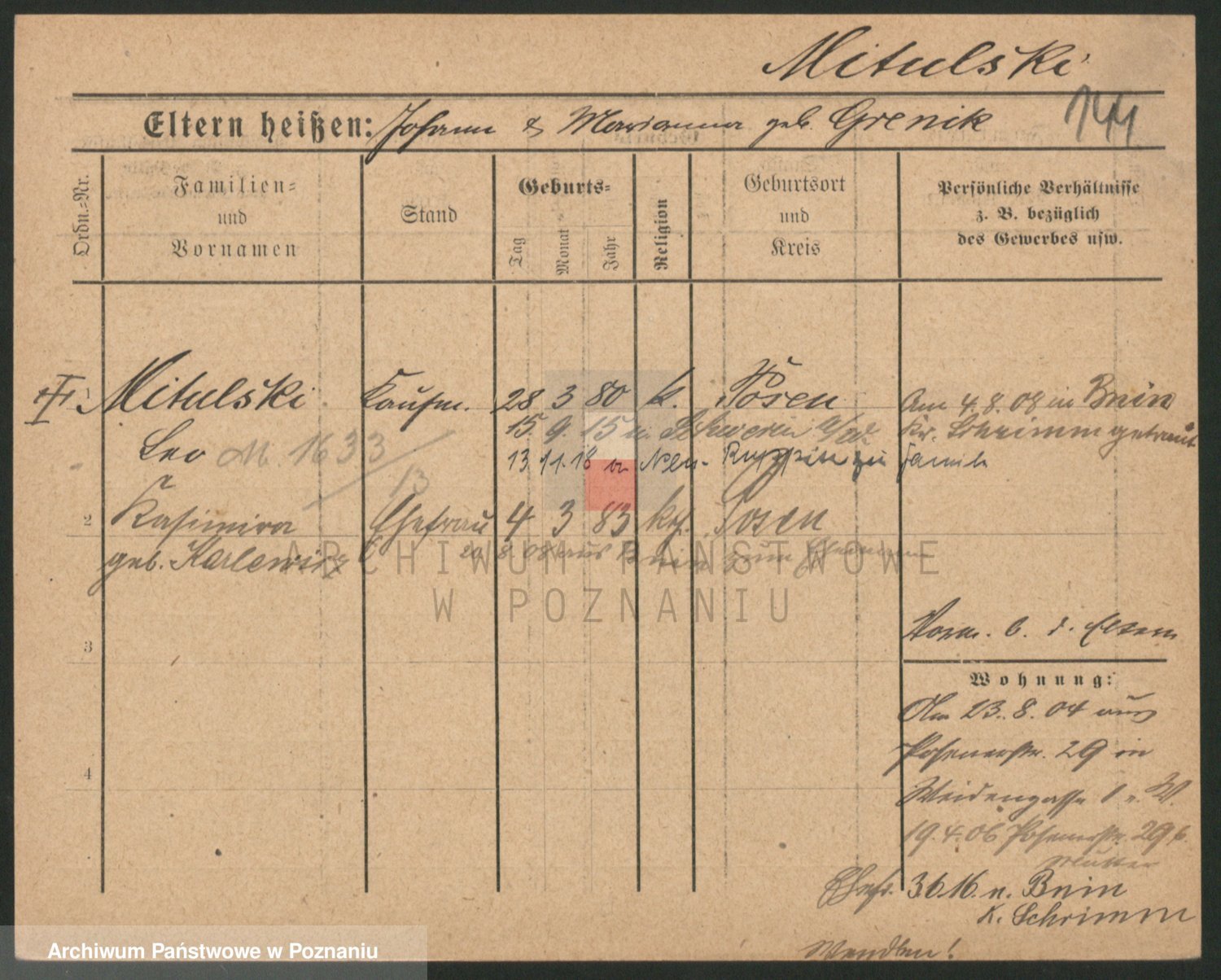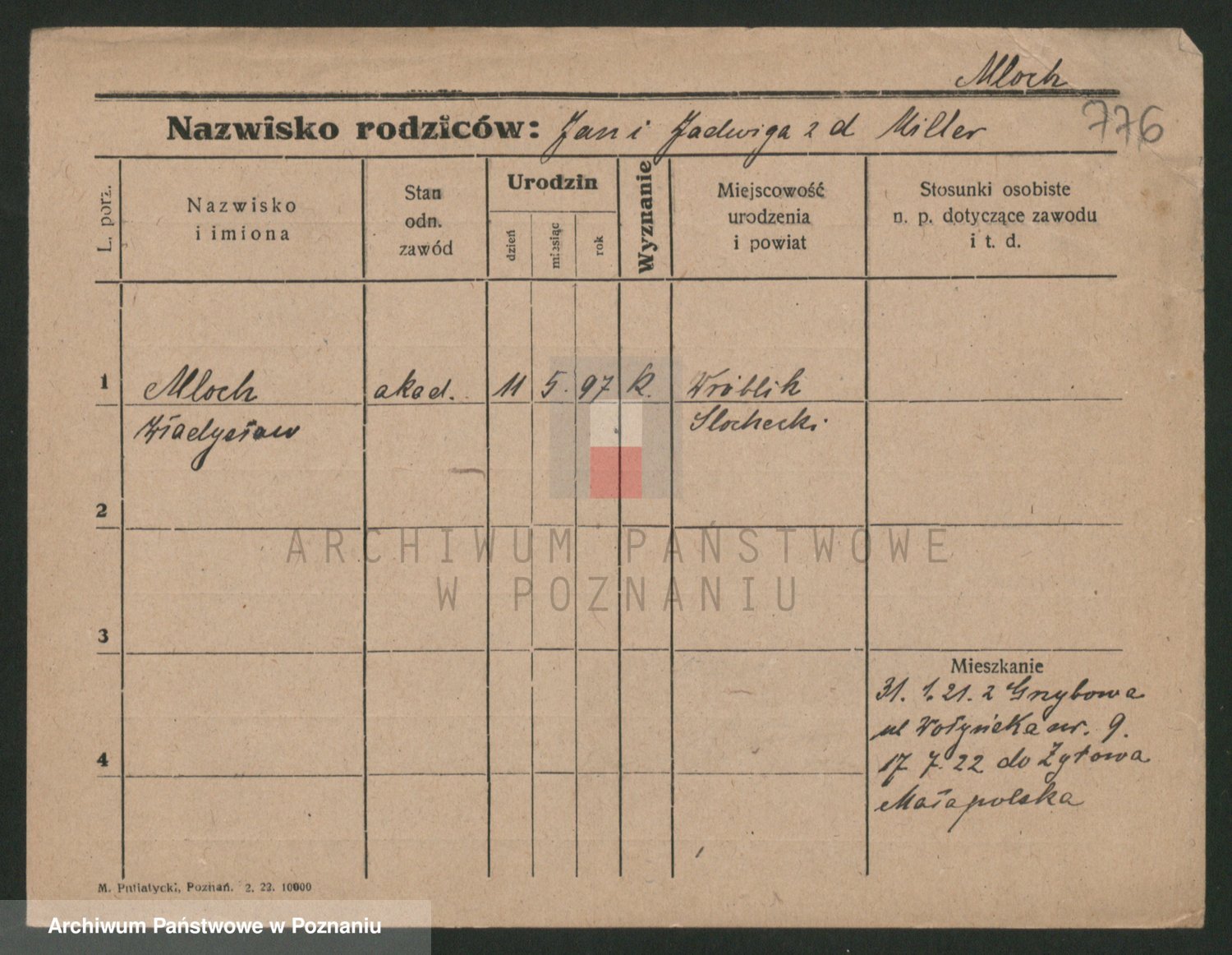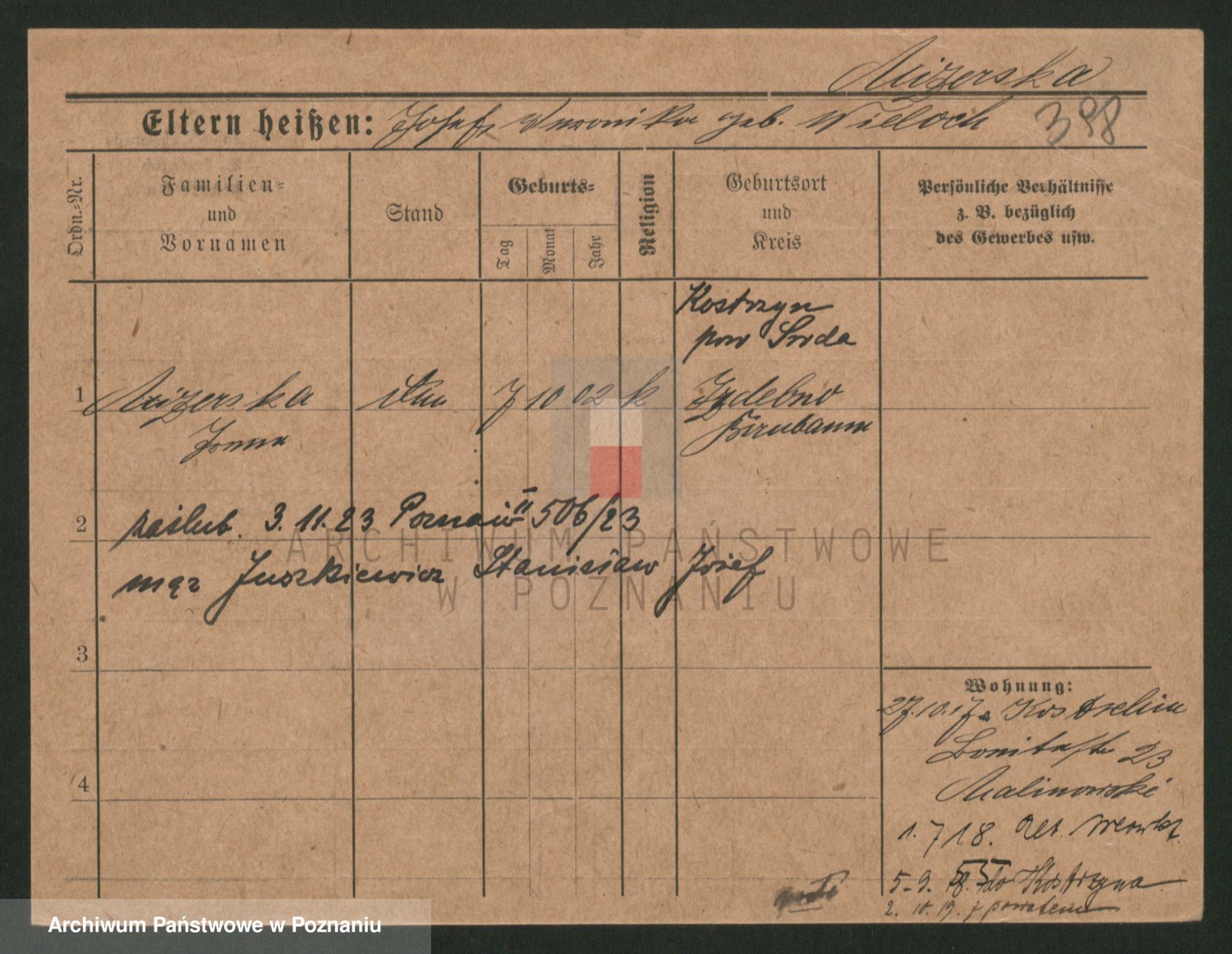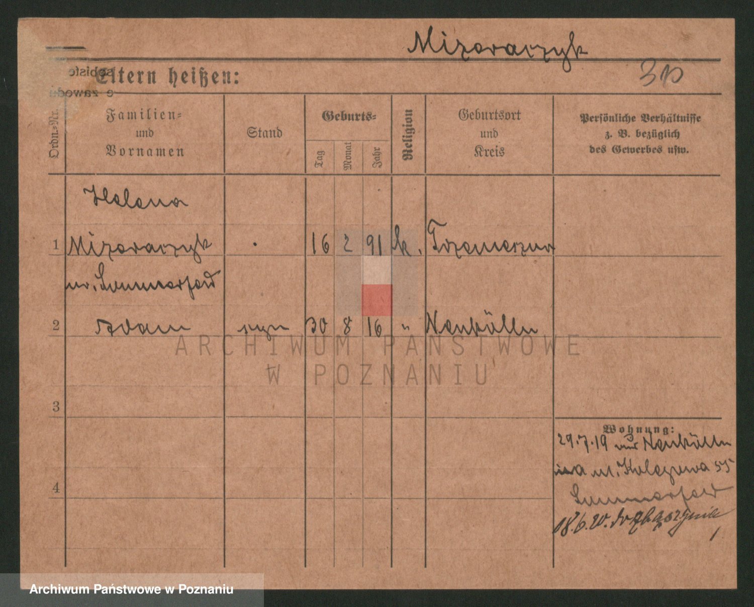 Podgląd karty osobowej dostępny jest po kliknięciu na nazwisko lub ikonkę karty. Można dokonywać powiększenia (ikony na górze) lub przechodzić między kolejnymi skanami (strzałki po bokach).
