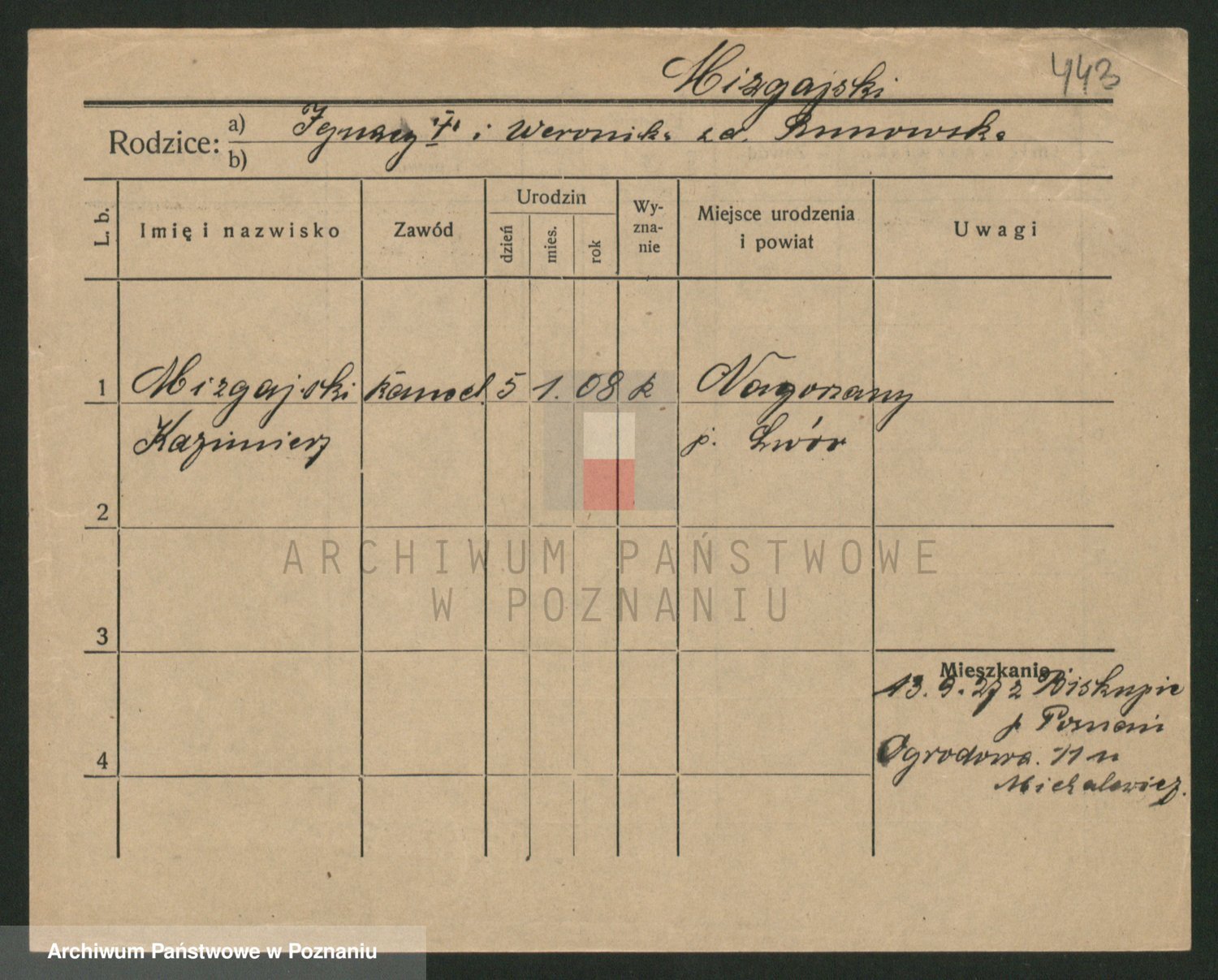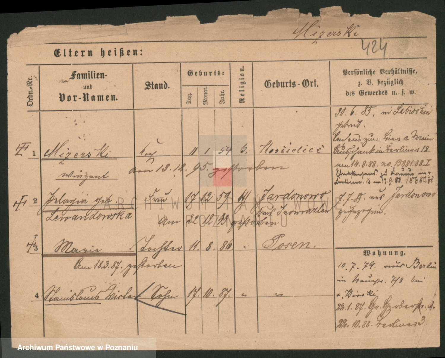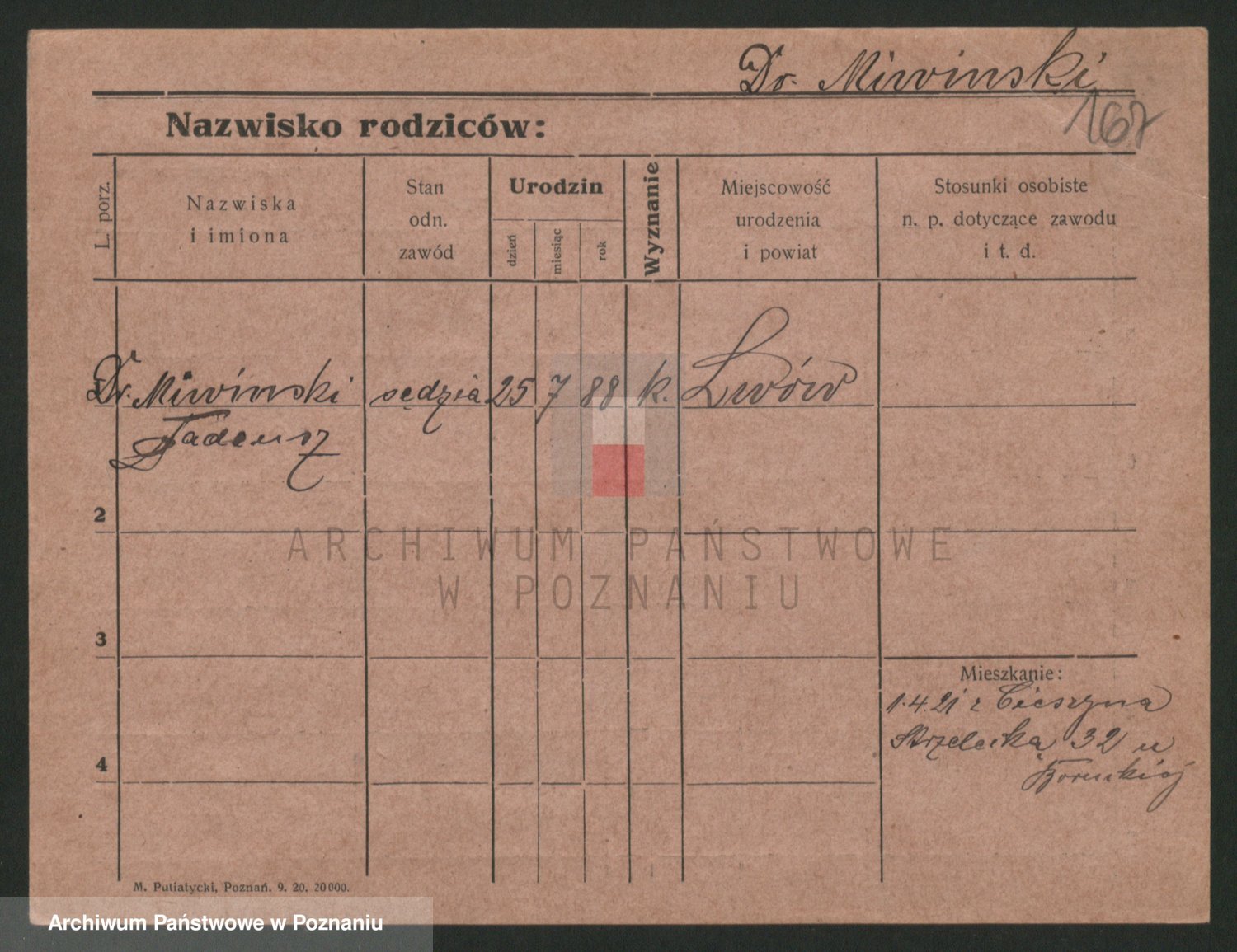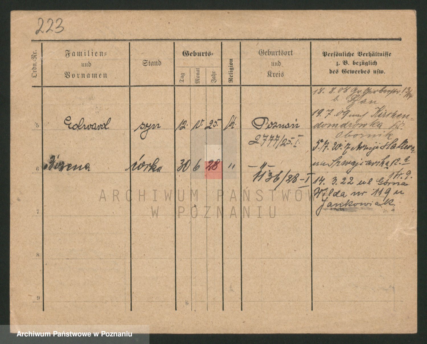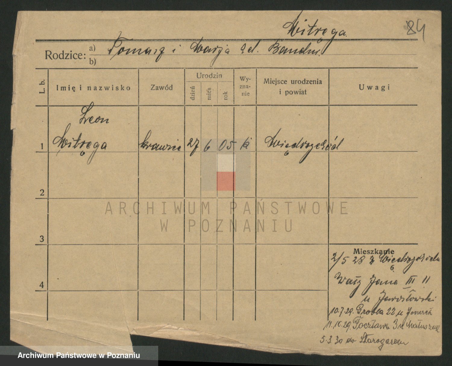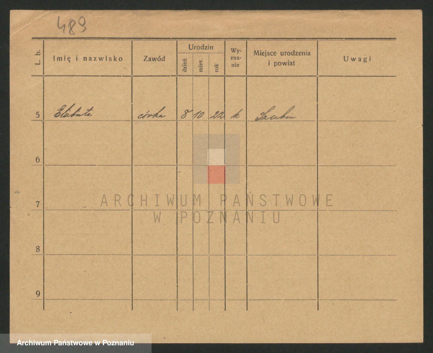 Podgląd karty osobowej dostępny jest po kliknięciu na nazwisko lub ikonkę karty. Można dokonywać powiększenia (ikony na górze) lub przechodzić między kolejnymi skanami (strzałki po bokach).