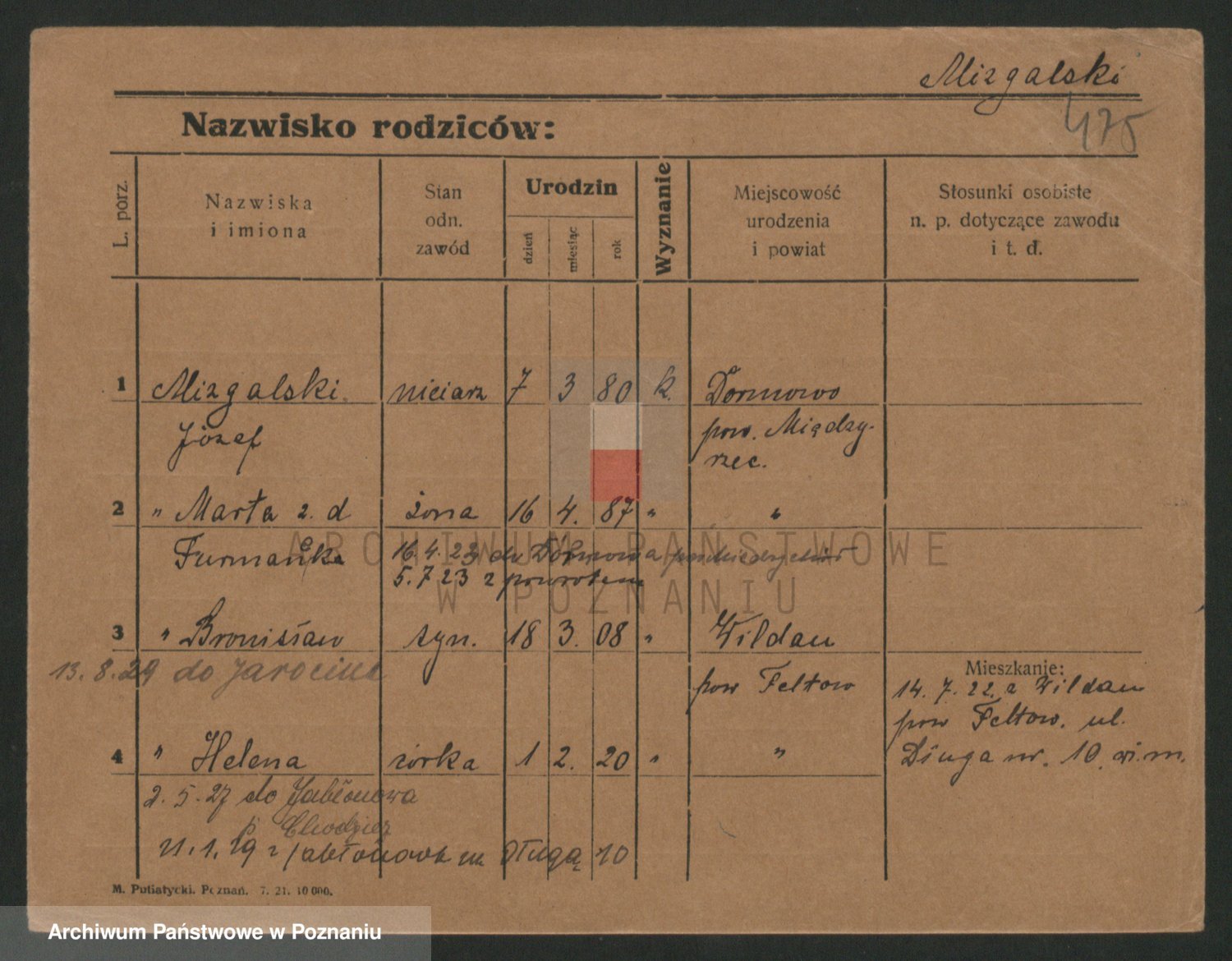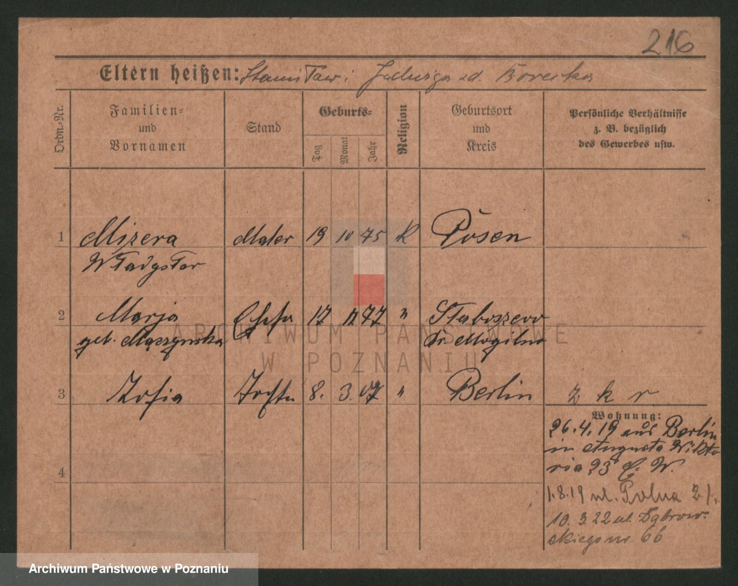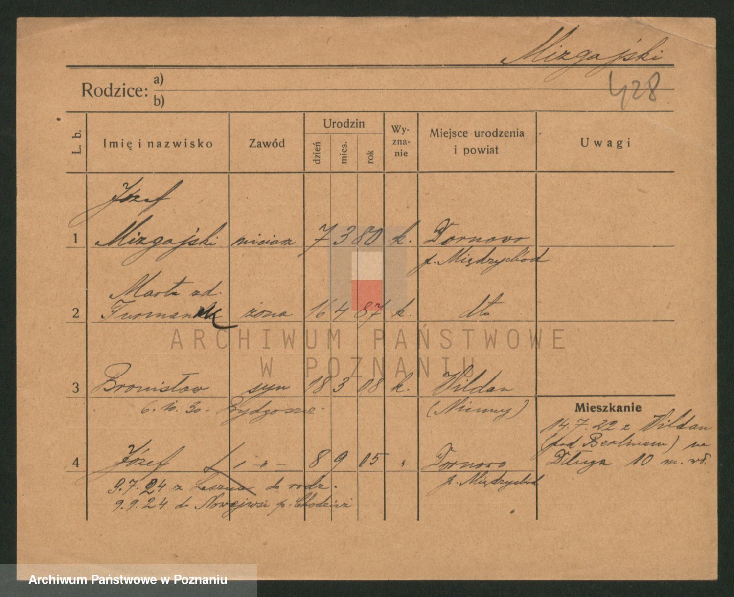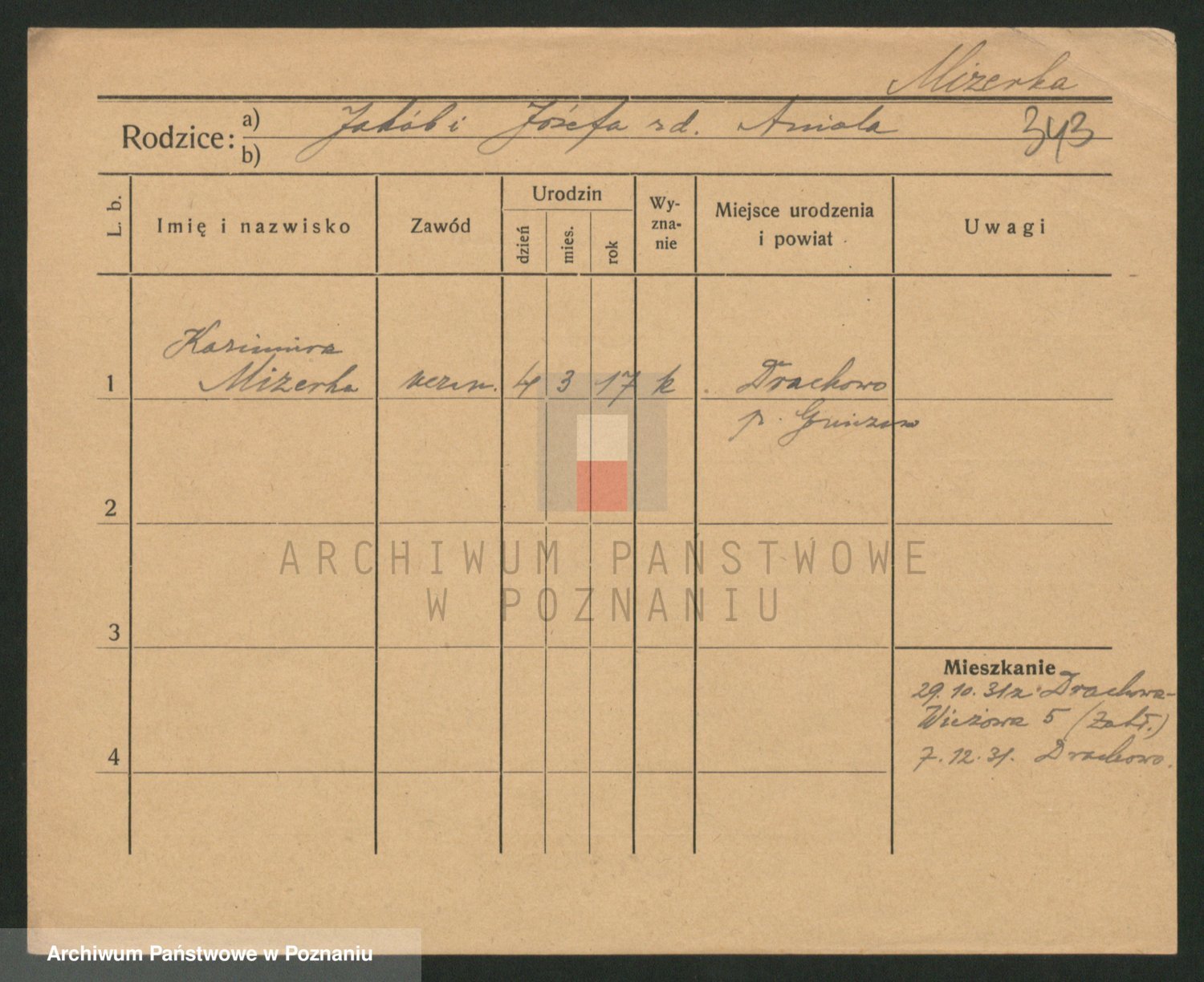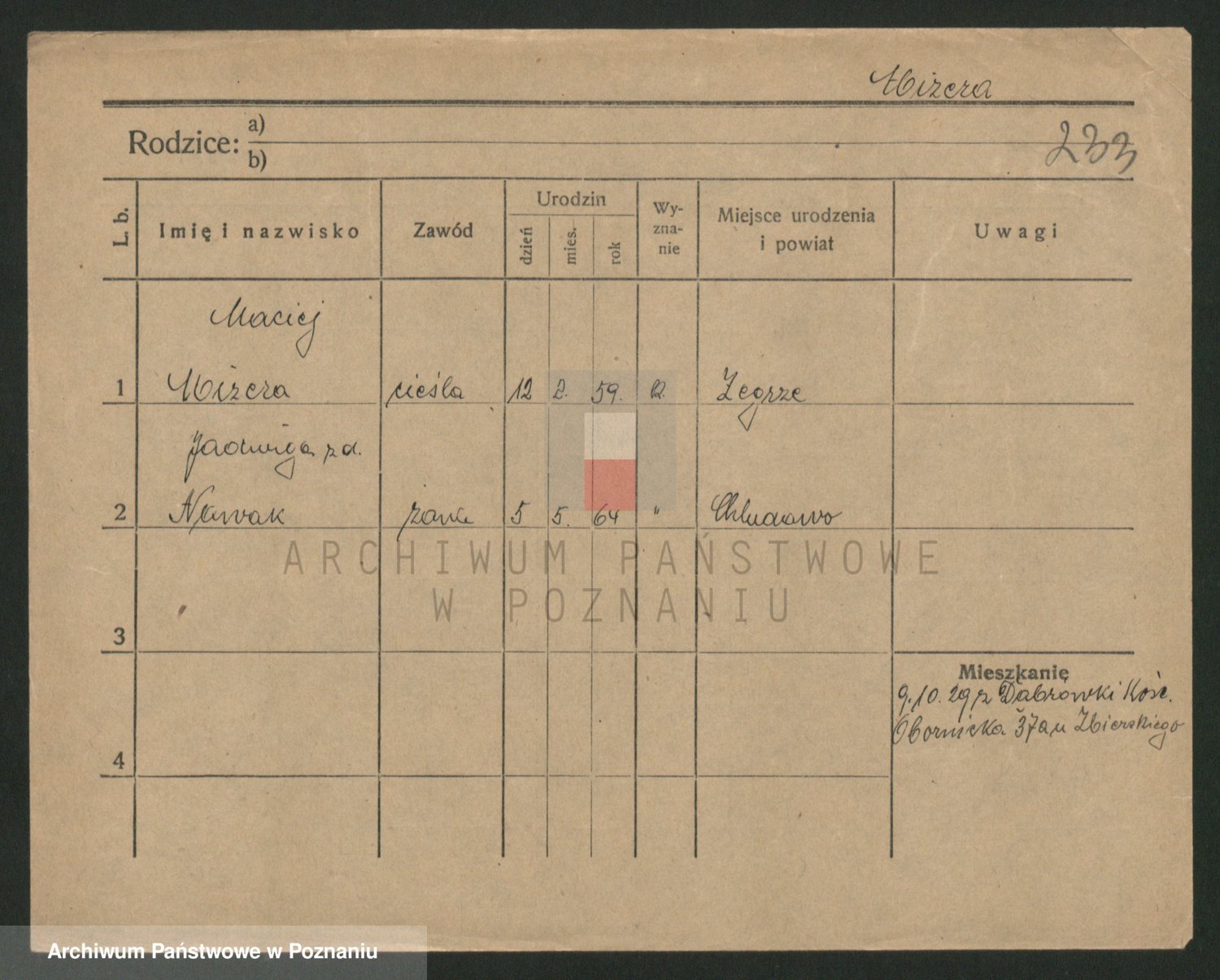 Podgląd karty osobowej dostępny jest po kliknięciu na nazwisko lub ikonkę karty. Można dokonywać powiększenia (ikony na górze) lub przechodzić między kolejnymi skanami (strzałki po bokach).