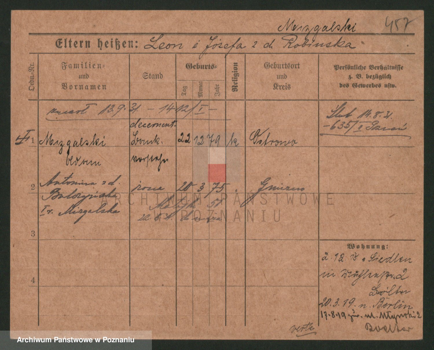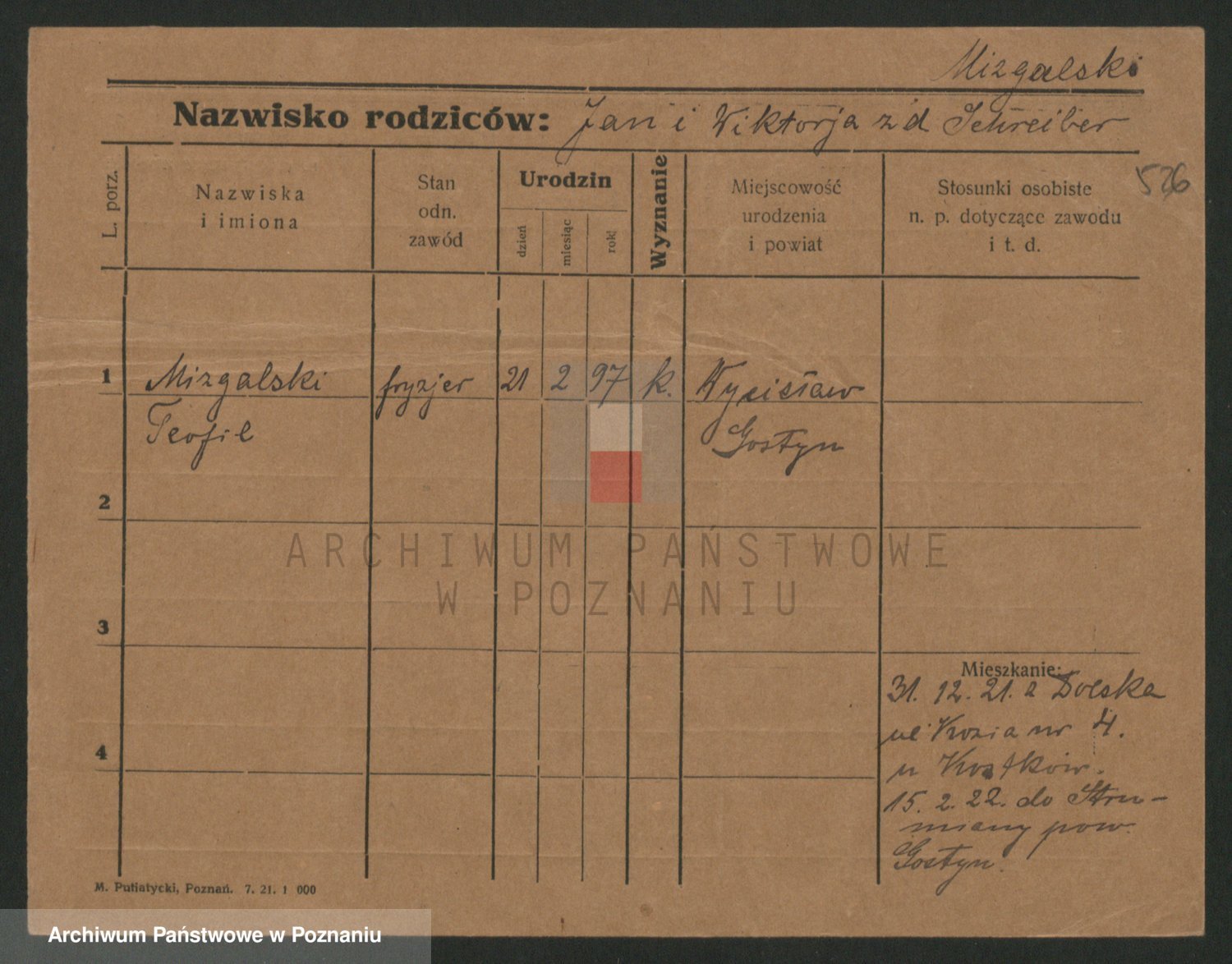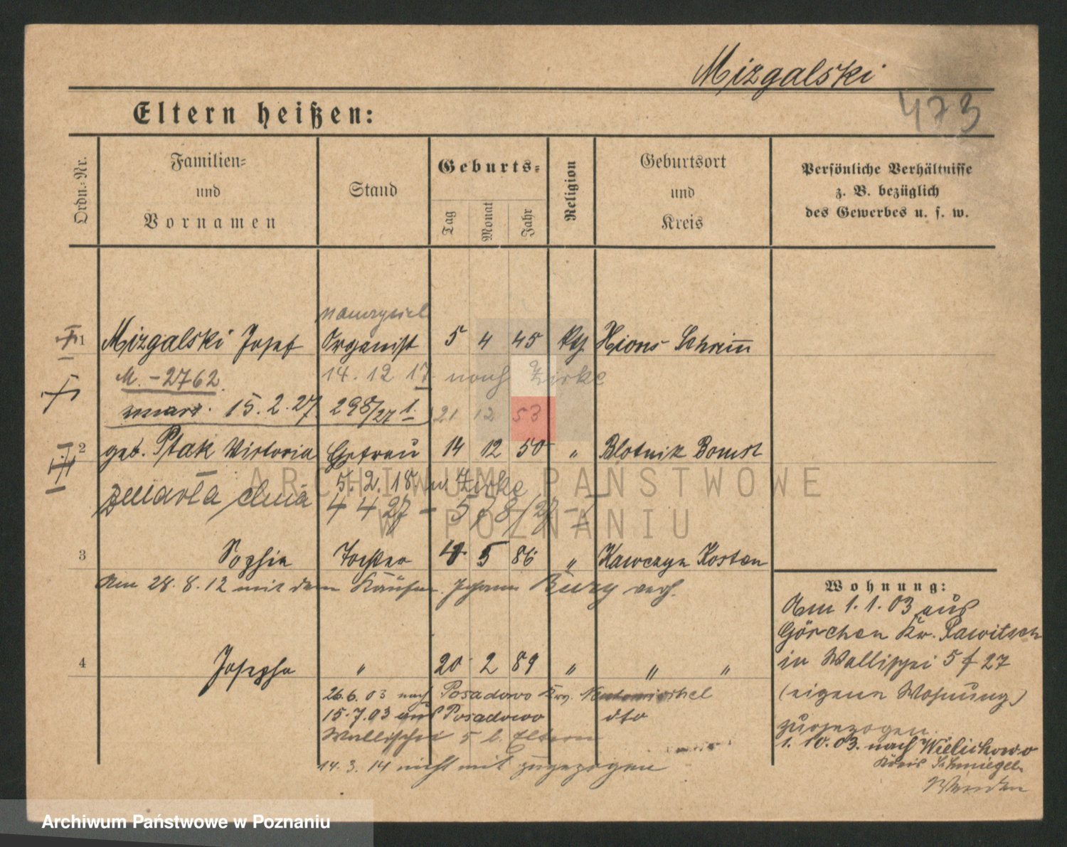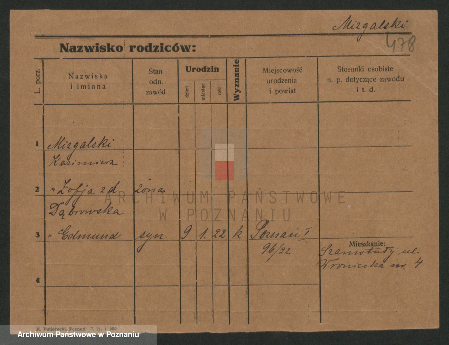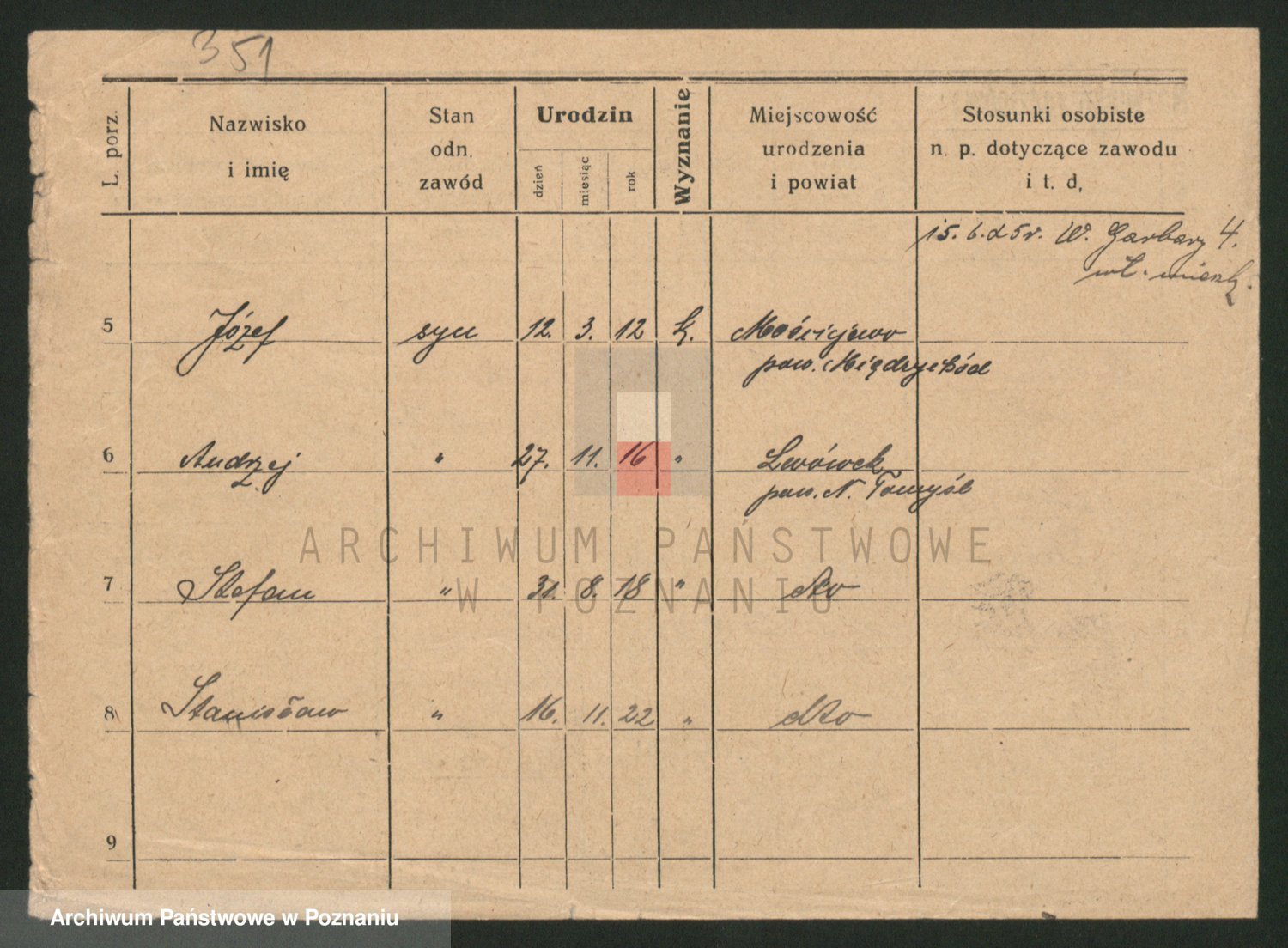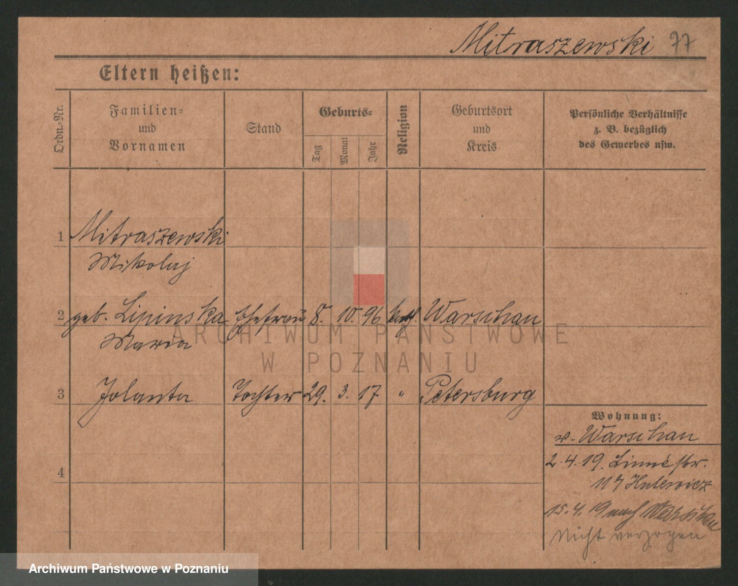 Podgląd karty osobowej dostępny jest po kliknięciu na nazwisko lub ikonkę karty. Można dokonywać powiększenia (ikony na górze) lub przechodzić między kolejnymi skanami (strzałki po bokach).