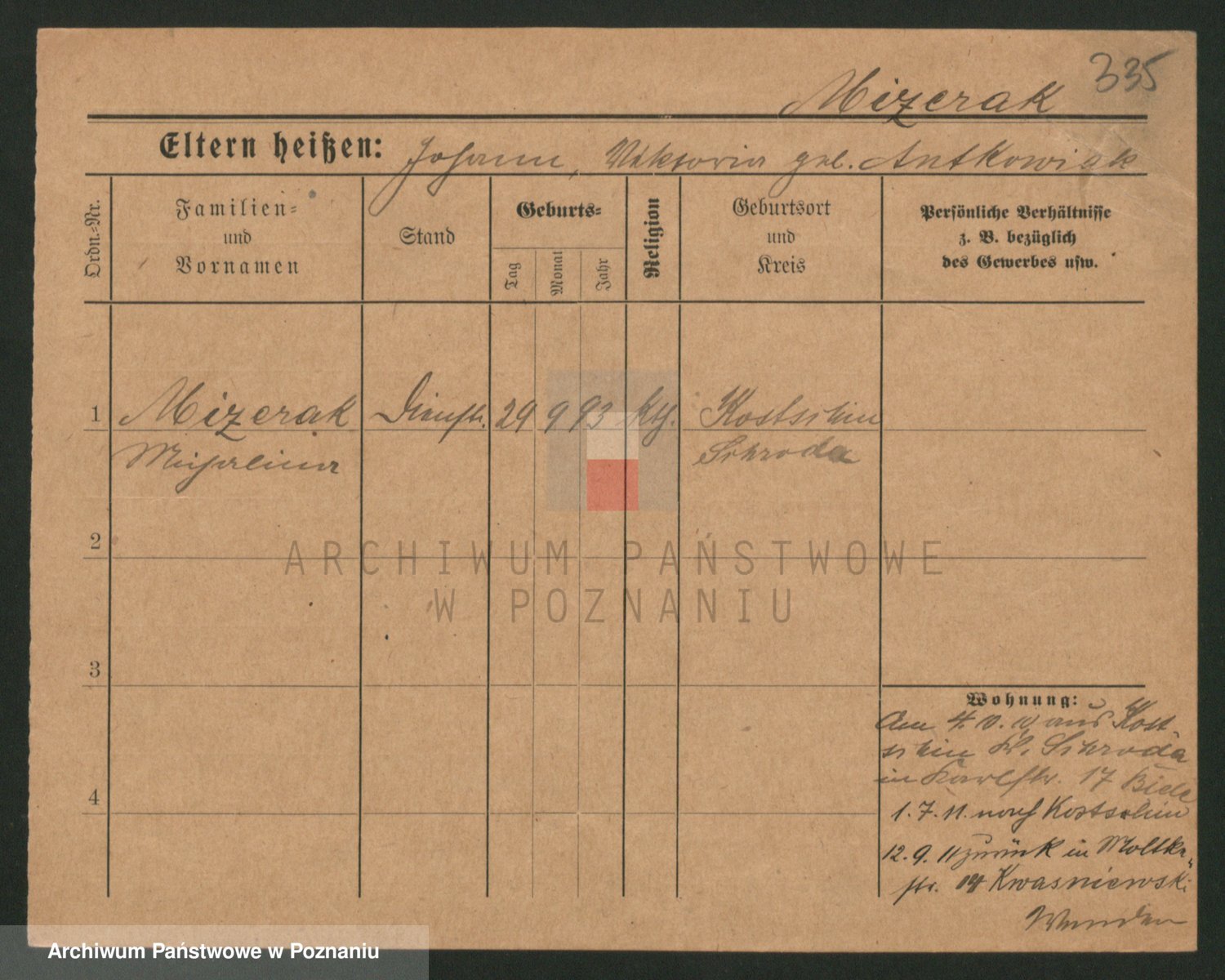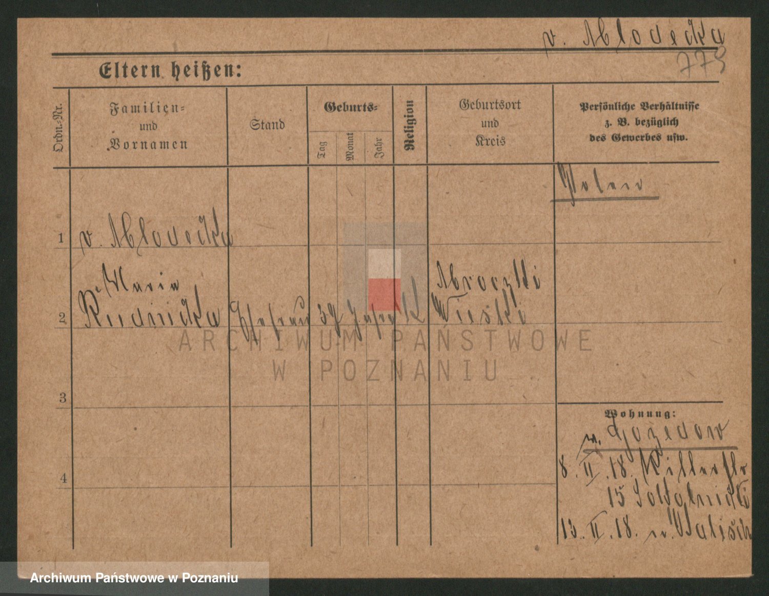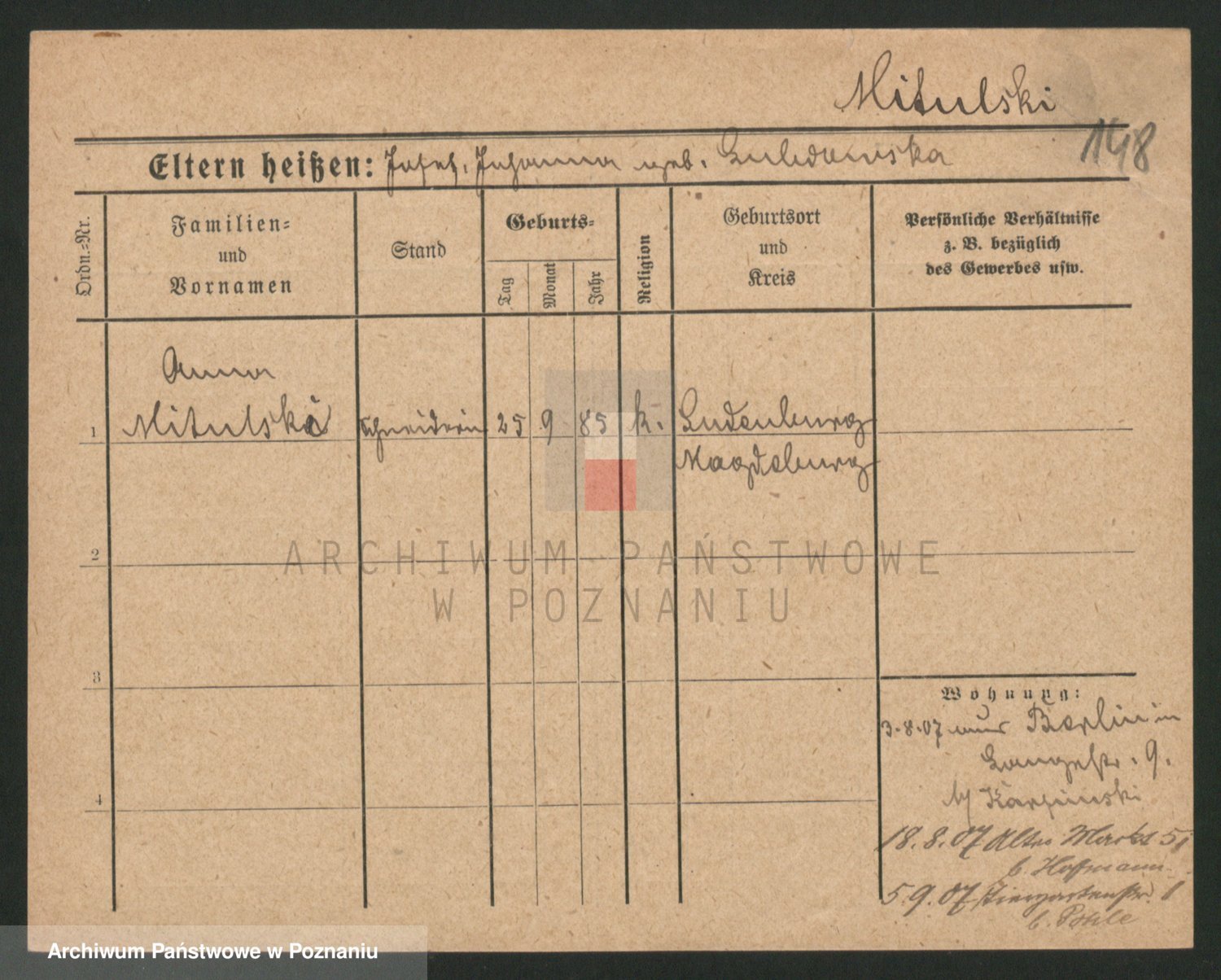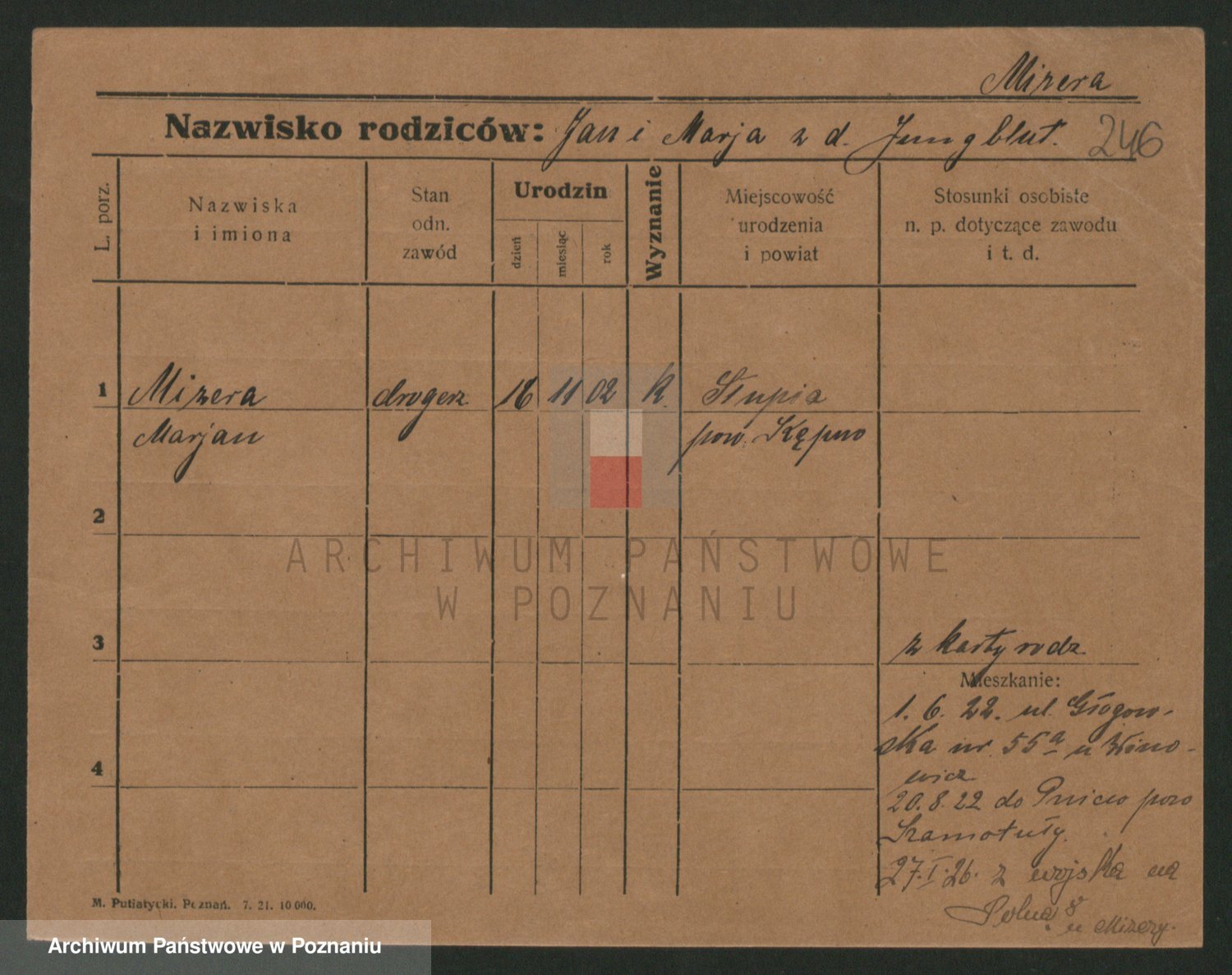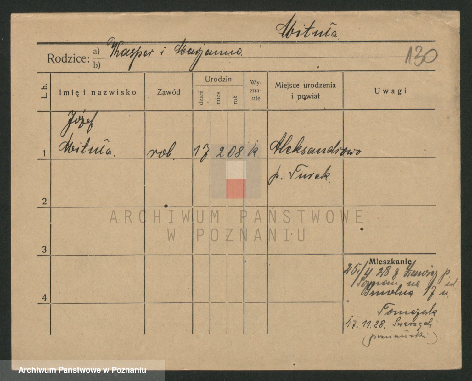 Podgląd karty osobowej dostępny jest po kliknięciu na nazwisko lub ikonkę karty. Można dokonywać powiększenia (ikony na górze) lub przechodzić między kolejnymi skanami (strzałki po bokach).