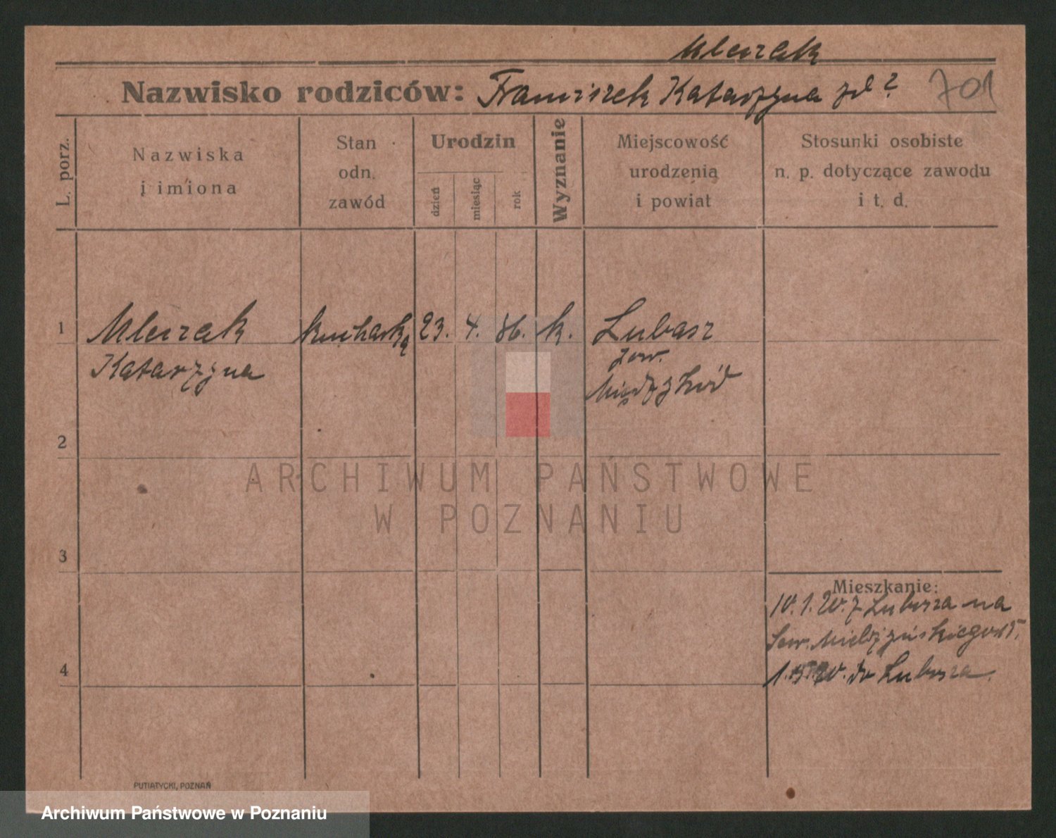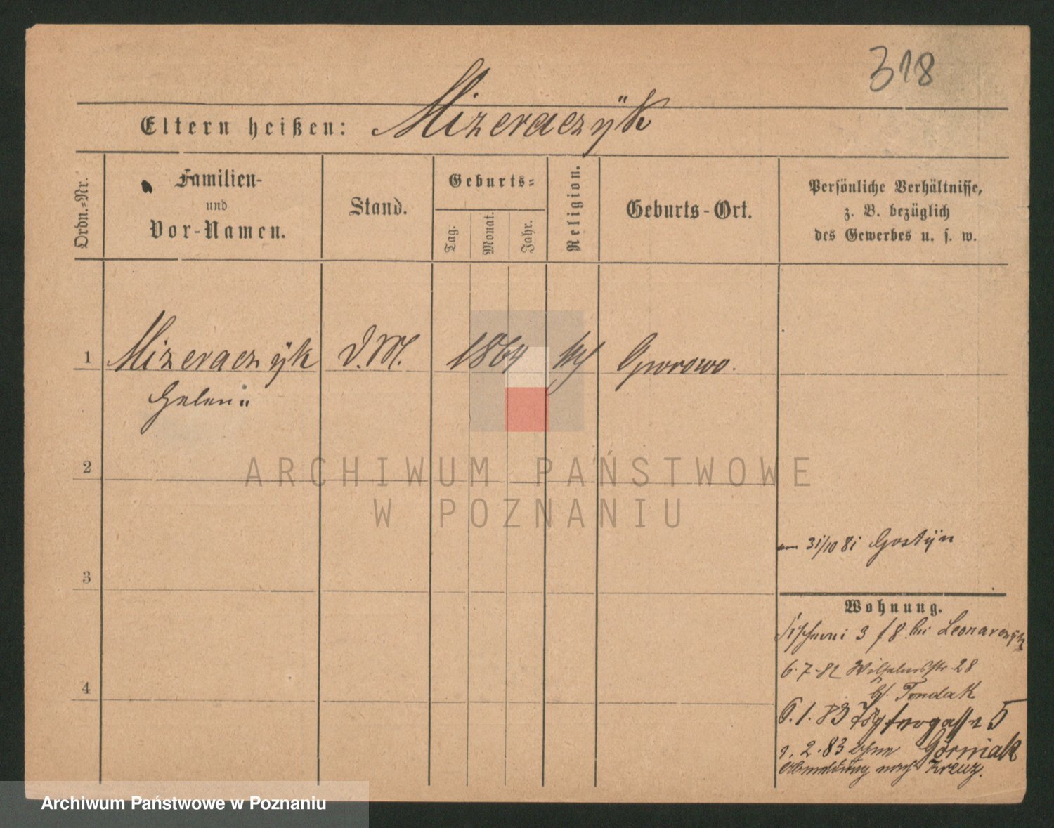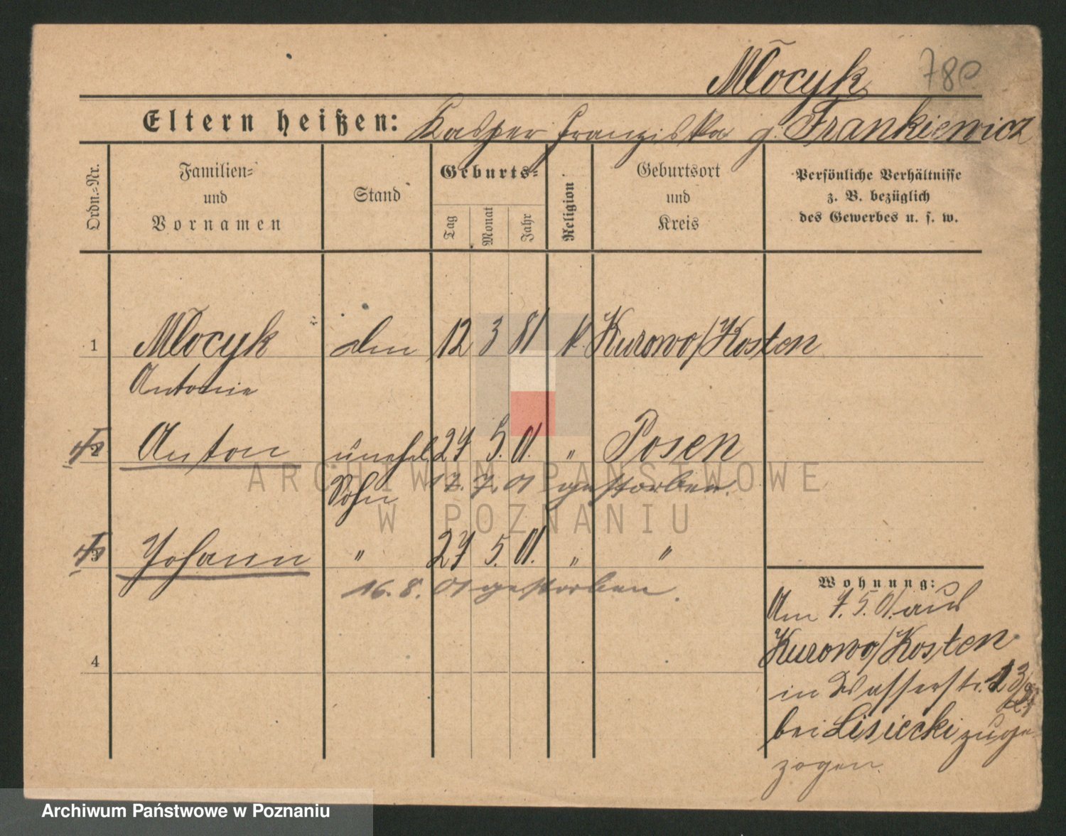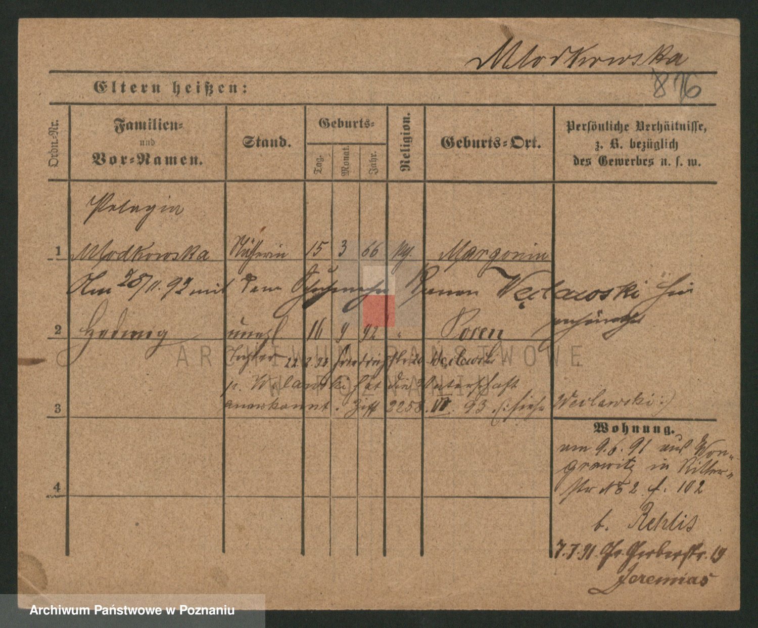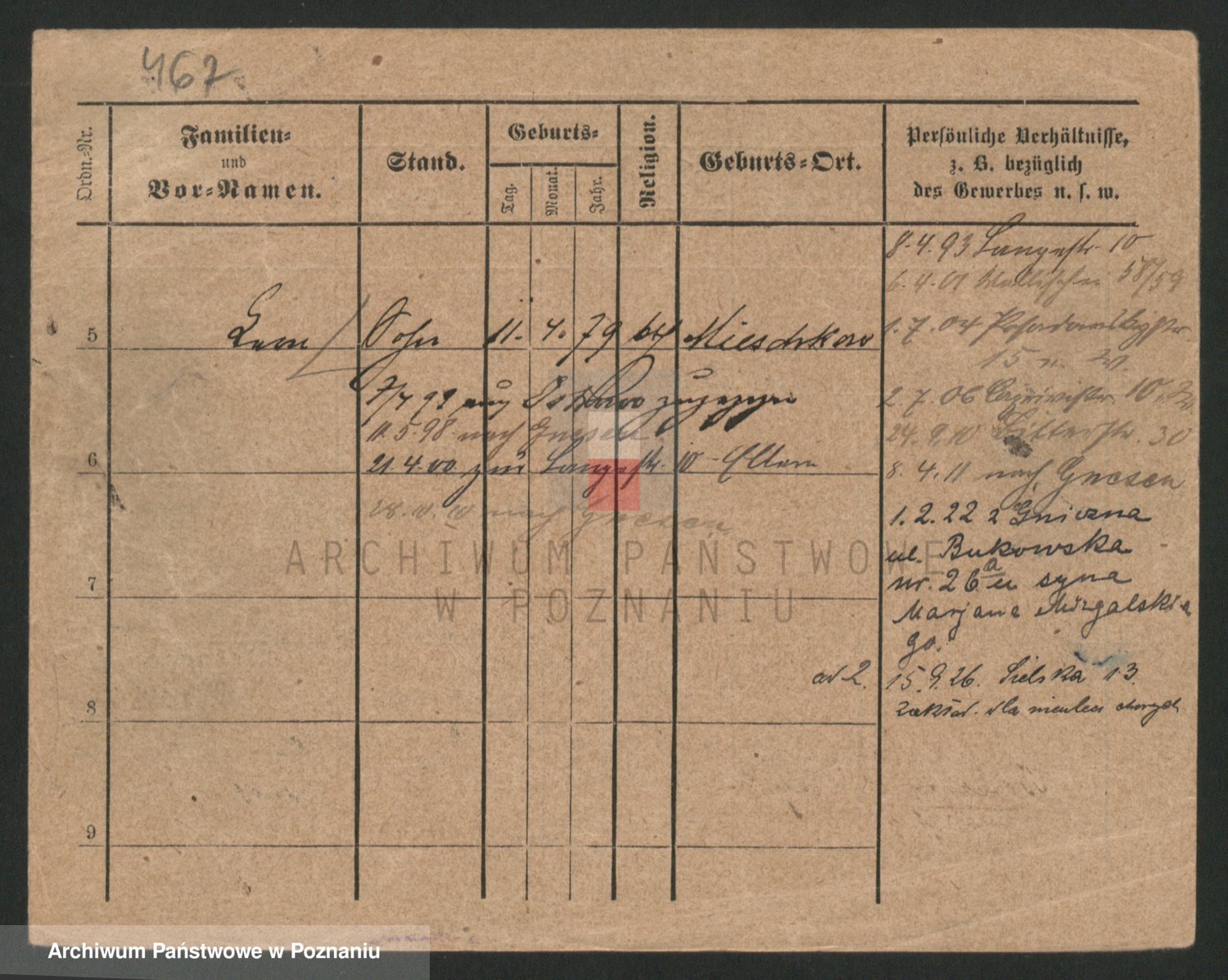 Podgląd karty osobowej dostępny jest po kliknięciu na nazwisko lub ikonkę karty. Można dokonywać powiększenia (ikony na górze) lub przechodzić między kolejnymi skanami (strzałki po bokach).