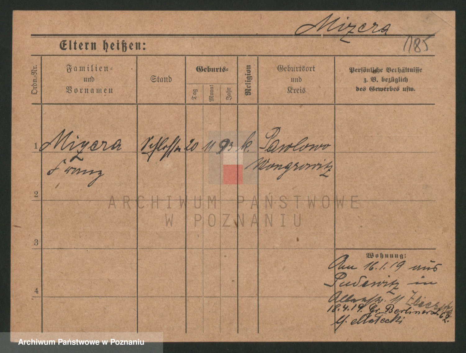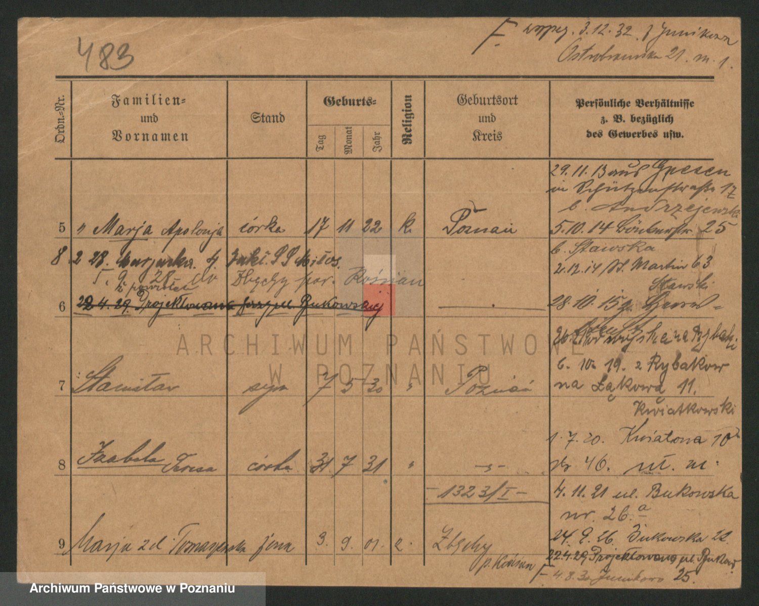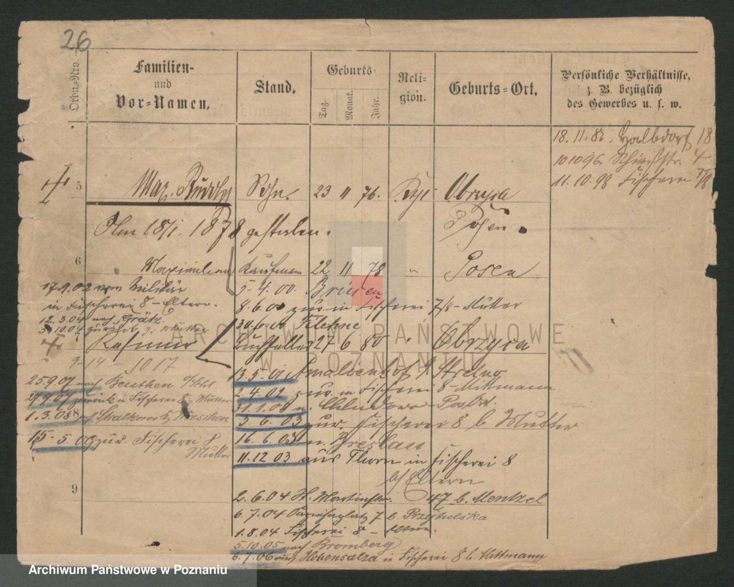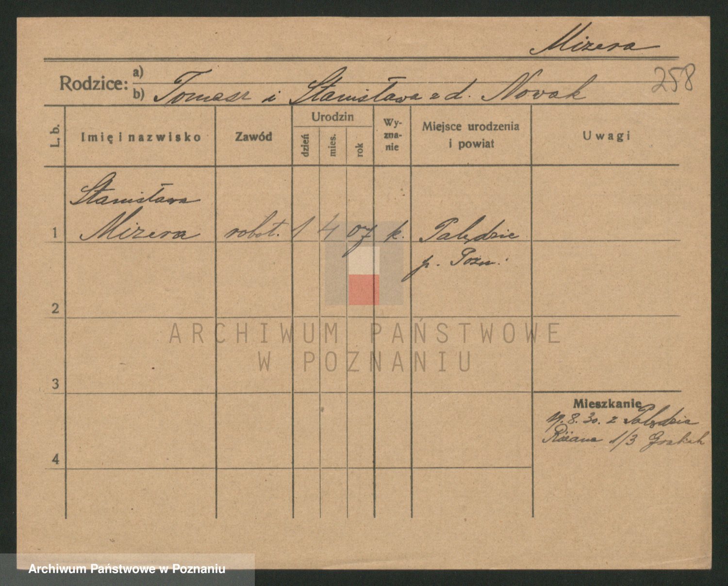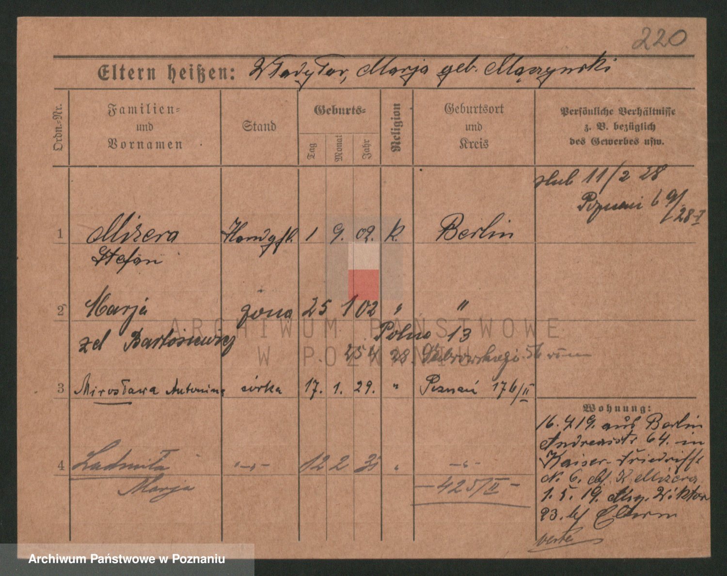 Podgląd karty osobowej dostępny jest po kliknięciu na nazwisko lub ikonkę karty. Można dokonywać powiększenia (ikony na górze) lub przechodzić między kolejnymi skanami (strzałki po bokach).