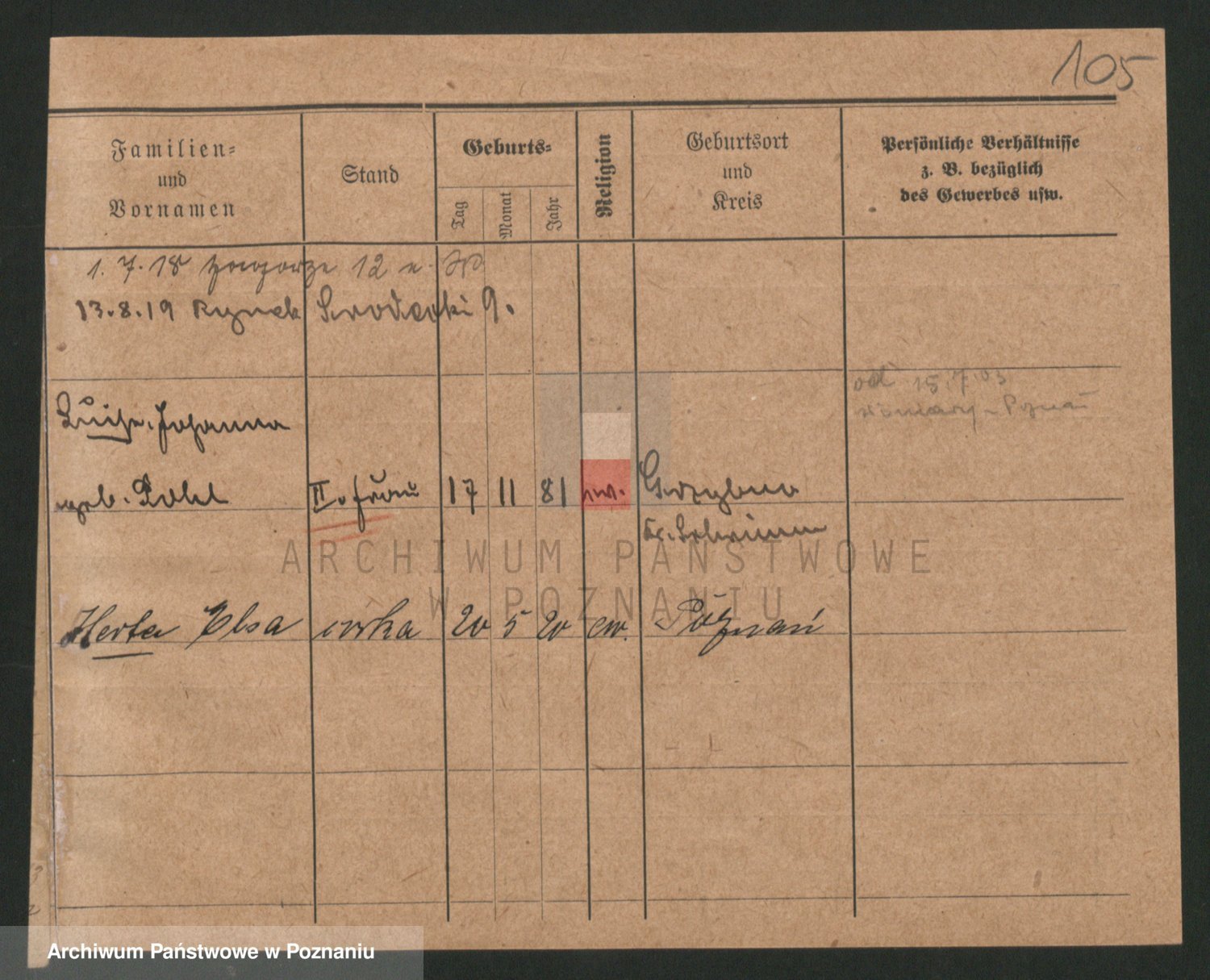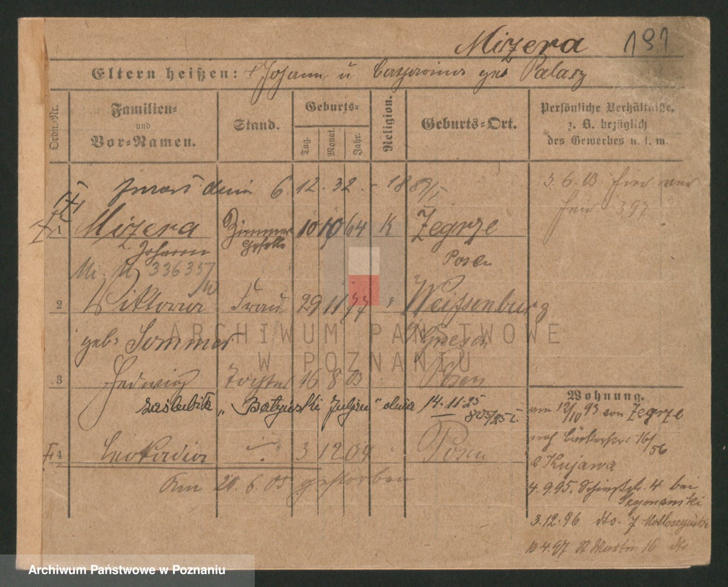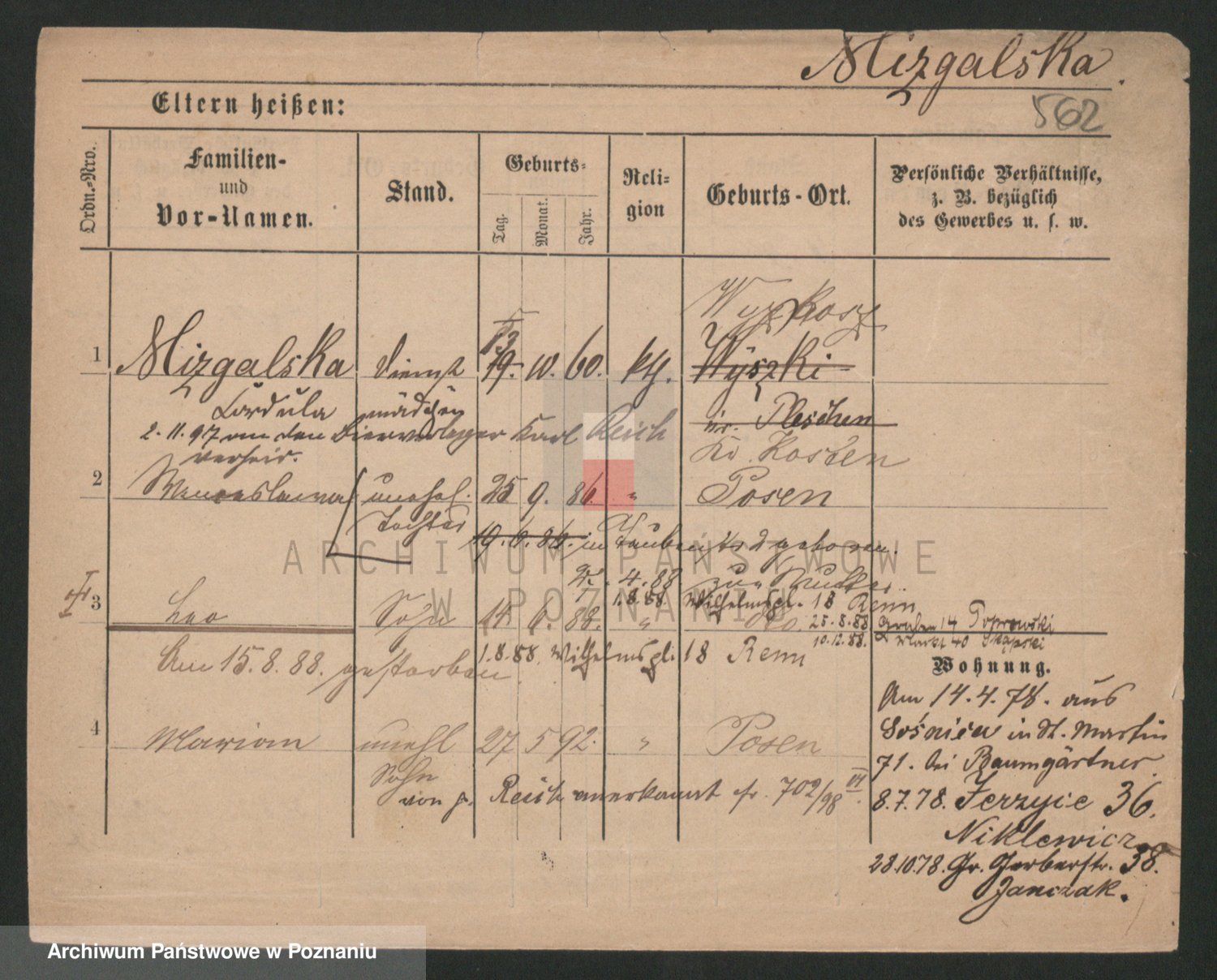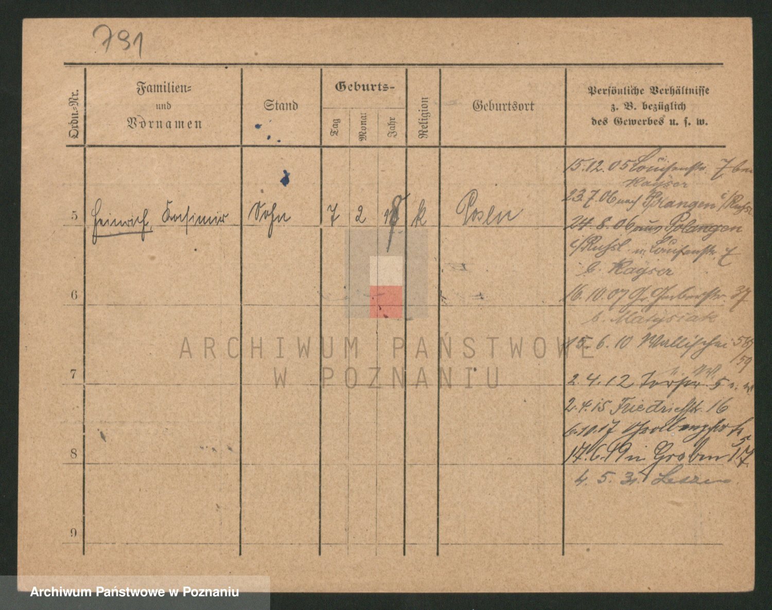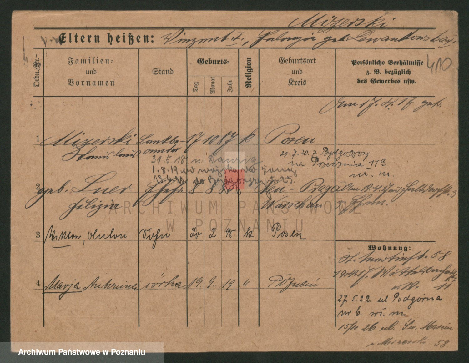 Podgląd karty osobowej dostępny jest po kliknięciu na nazwisko lub ikonkę karty. Można dokonywać powiększenia (ikony na górze) lub przechodzić między kolejnymi skanami (strzałki po bokach).