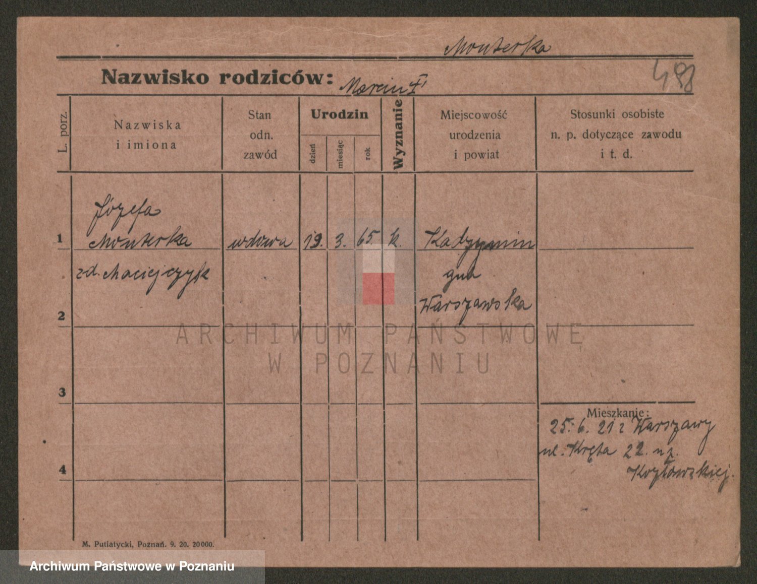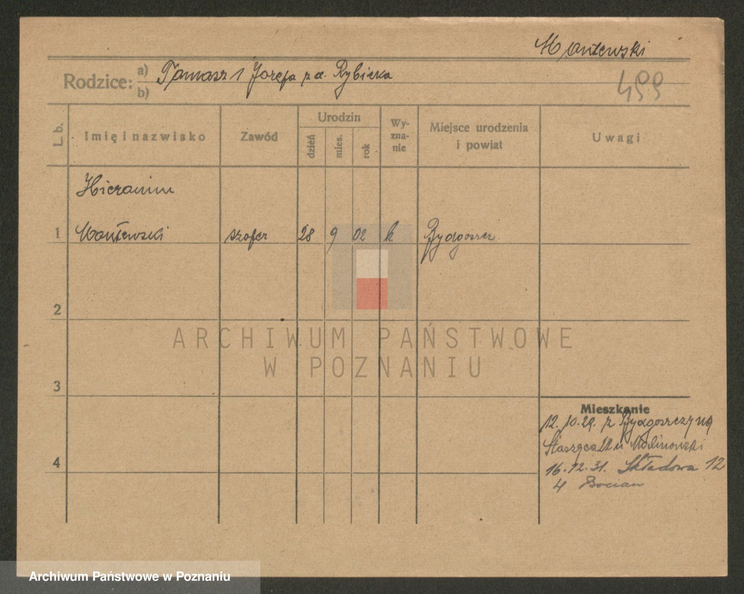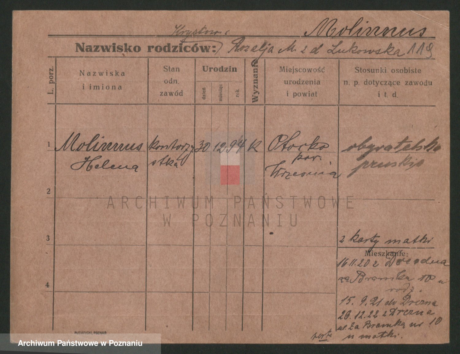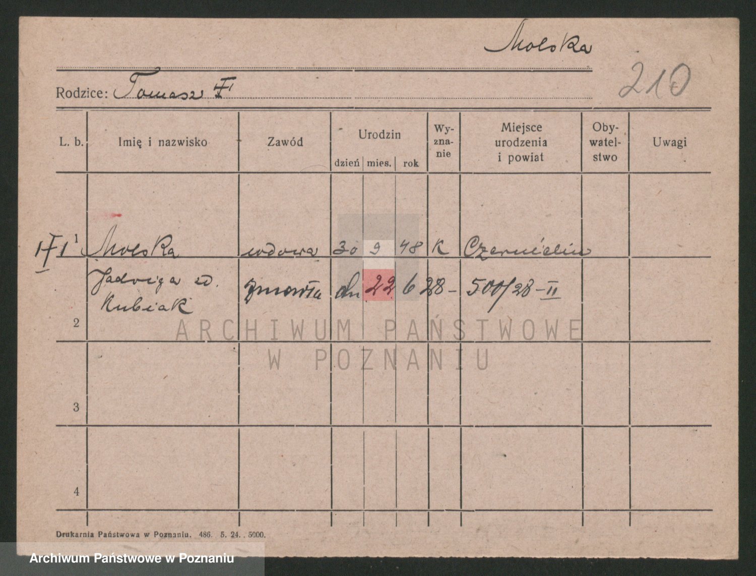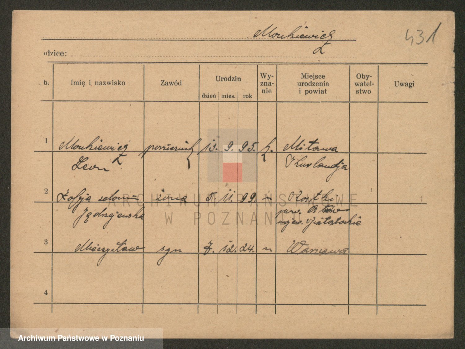 Podgląd karty osobowej dostępny jest po kliknięciu na nazwisko lub ikonkę karty. Można dokonywać powiększenia (ikony na górze) lub przechodzić między kolejnymi skanami (strzałki po bokach).