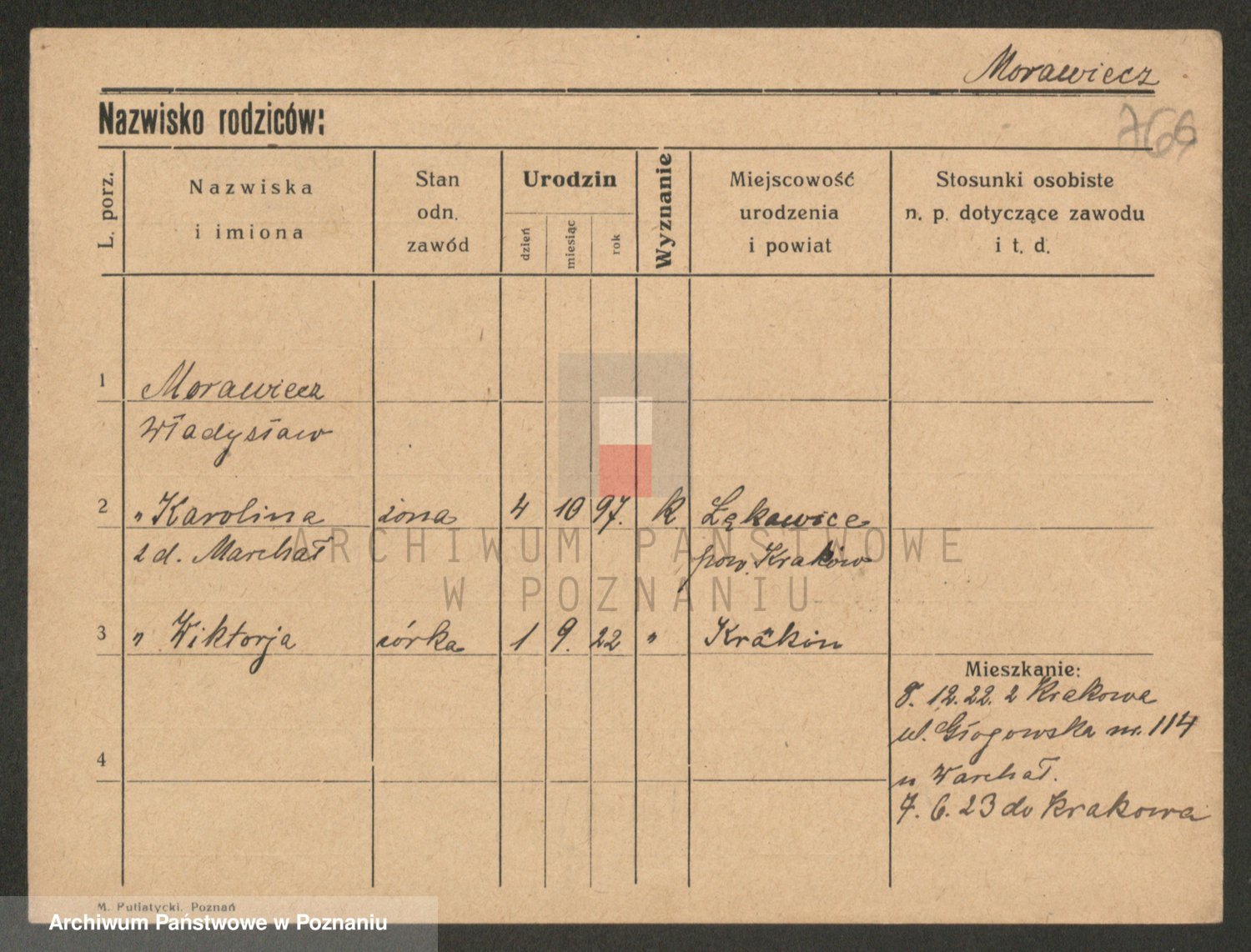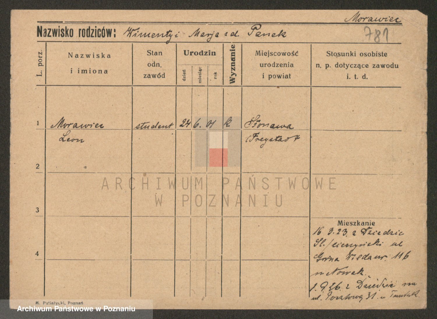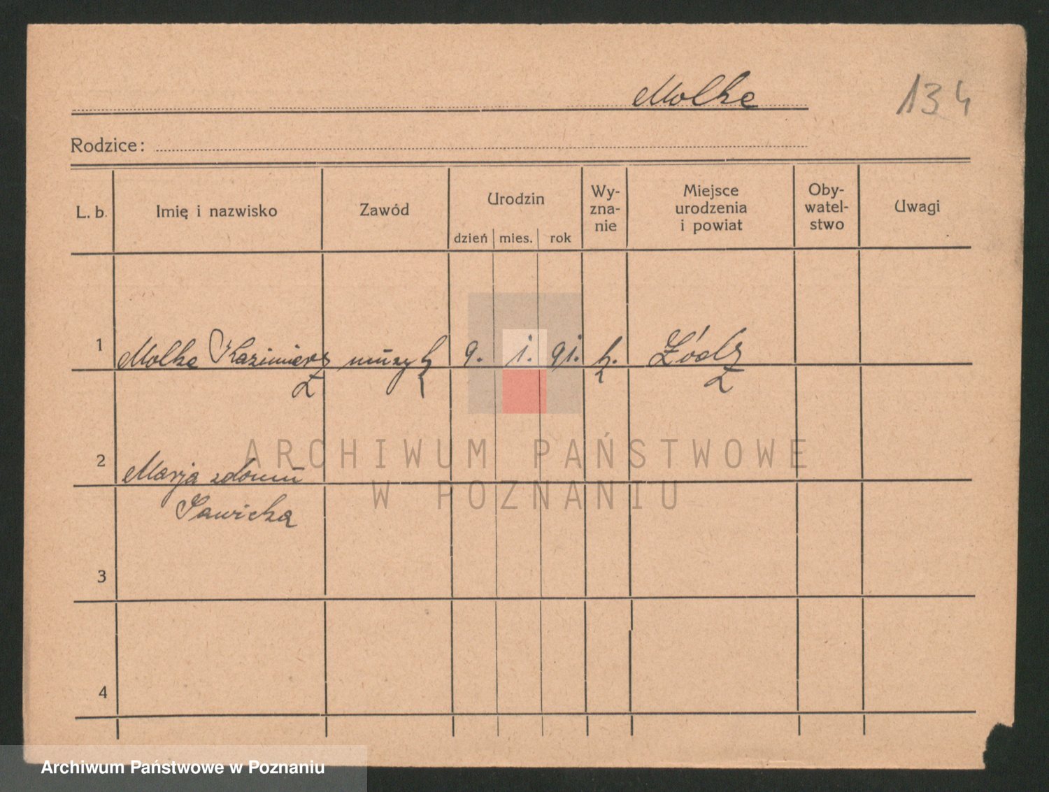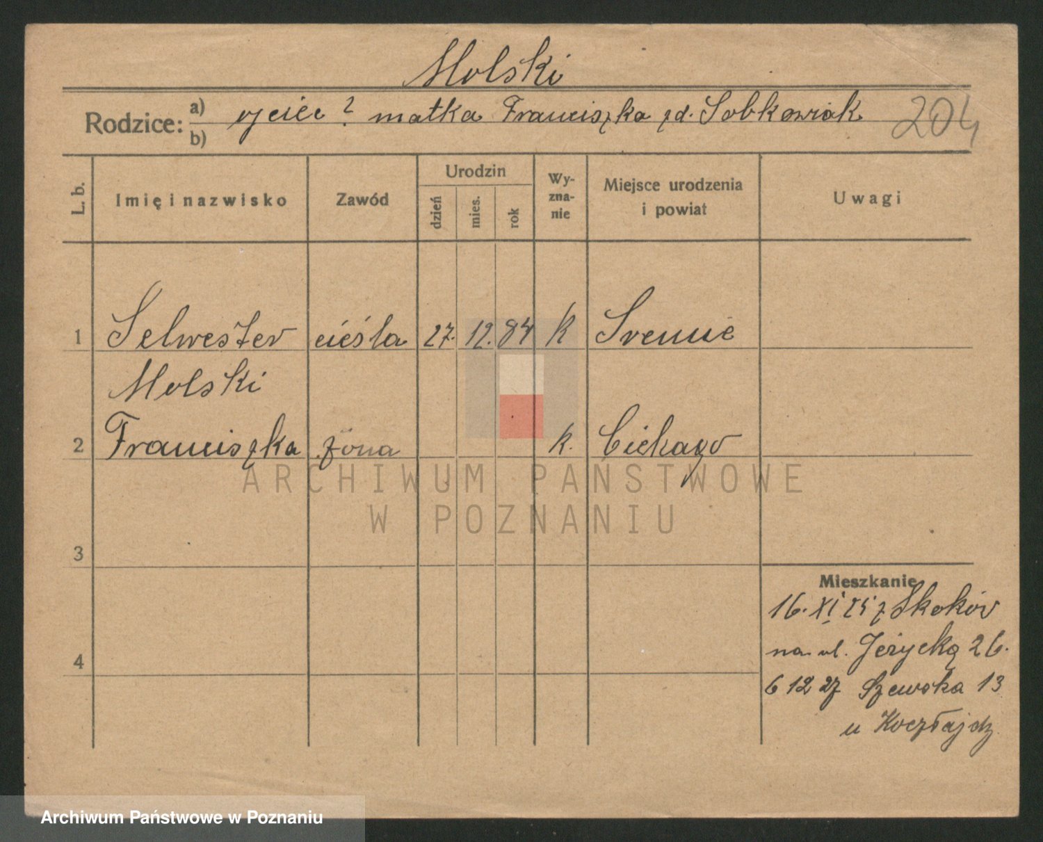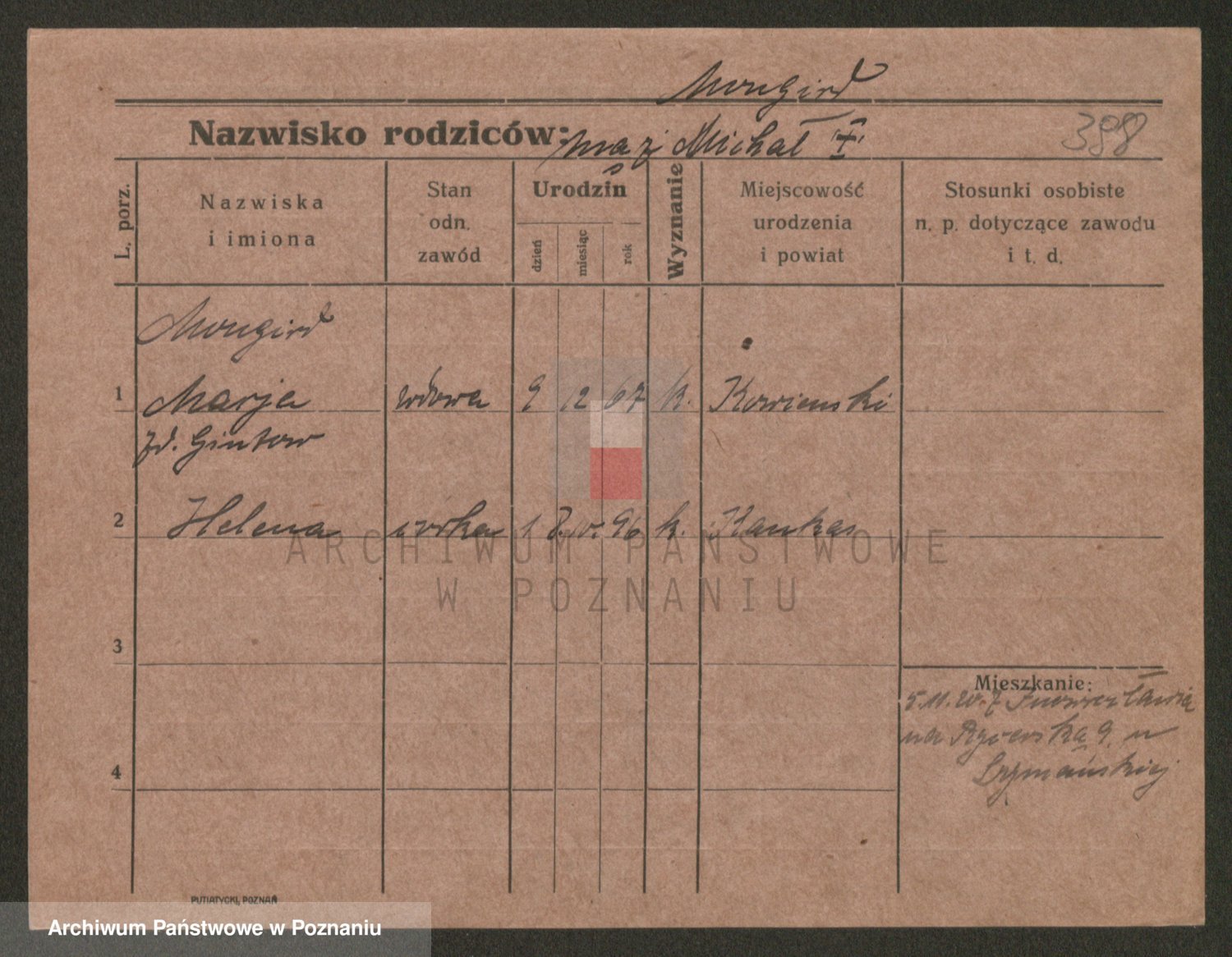 Podgląd karty osobowej dostępny jest po kliknięciu na nazwisko lub ikonkę karty. Można dokonywać powiększenia (ikony na górze) lub przechodzić między kolejnymi skanami (strzałki po bokach).
