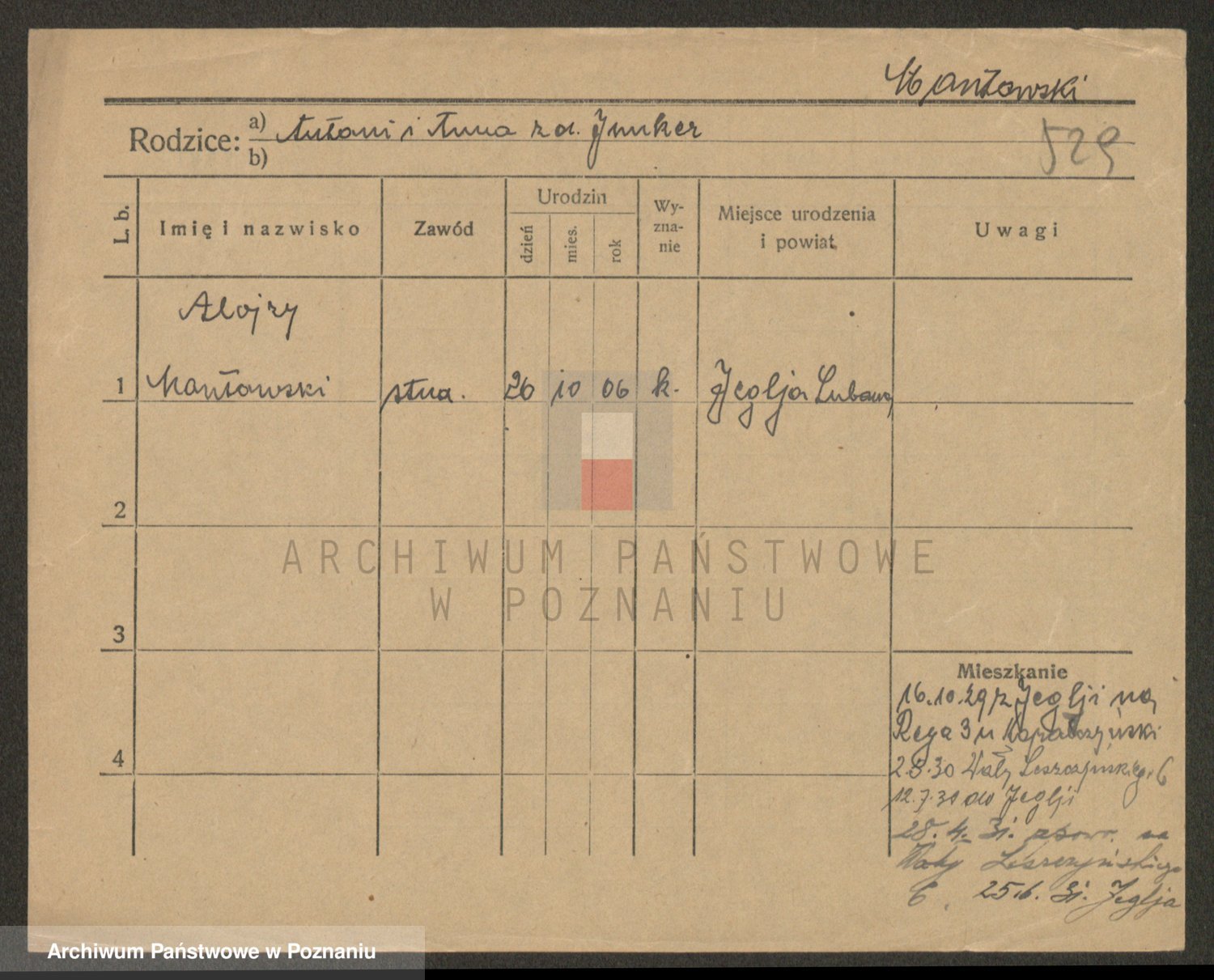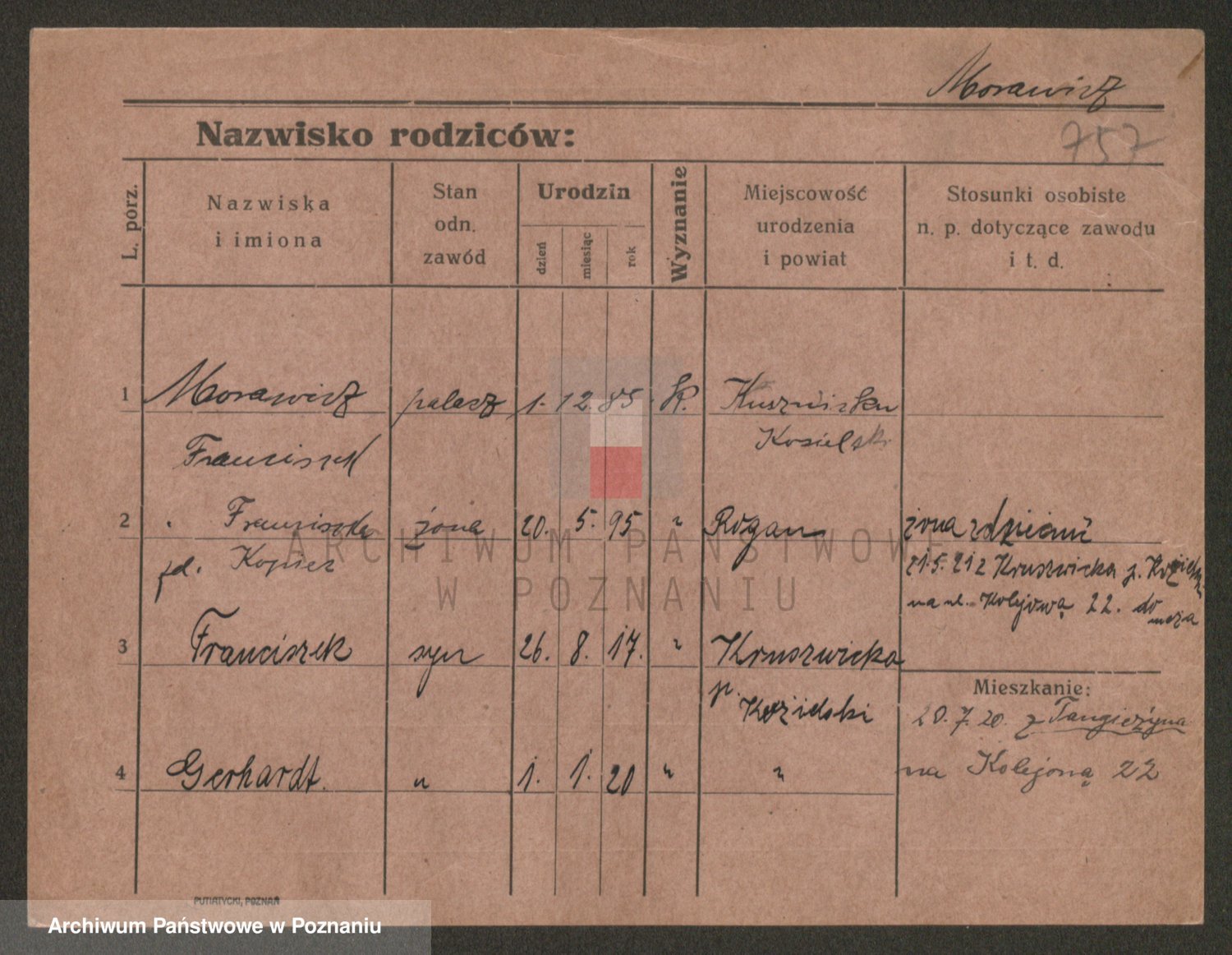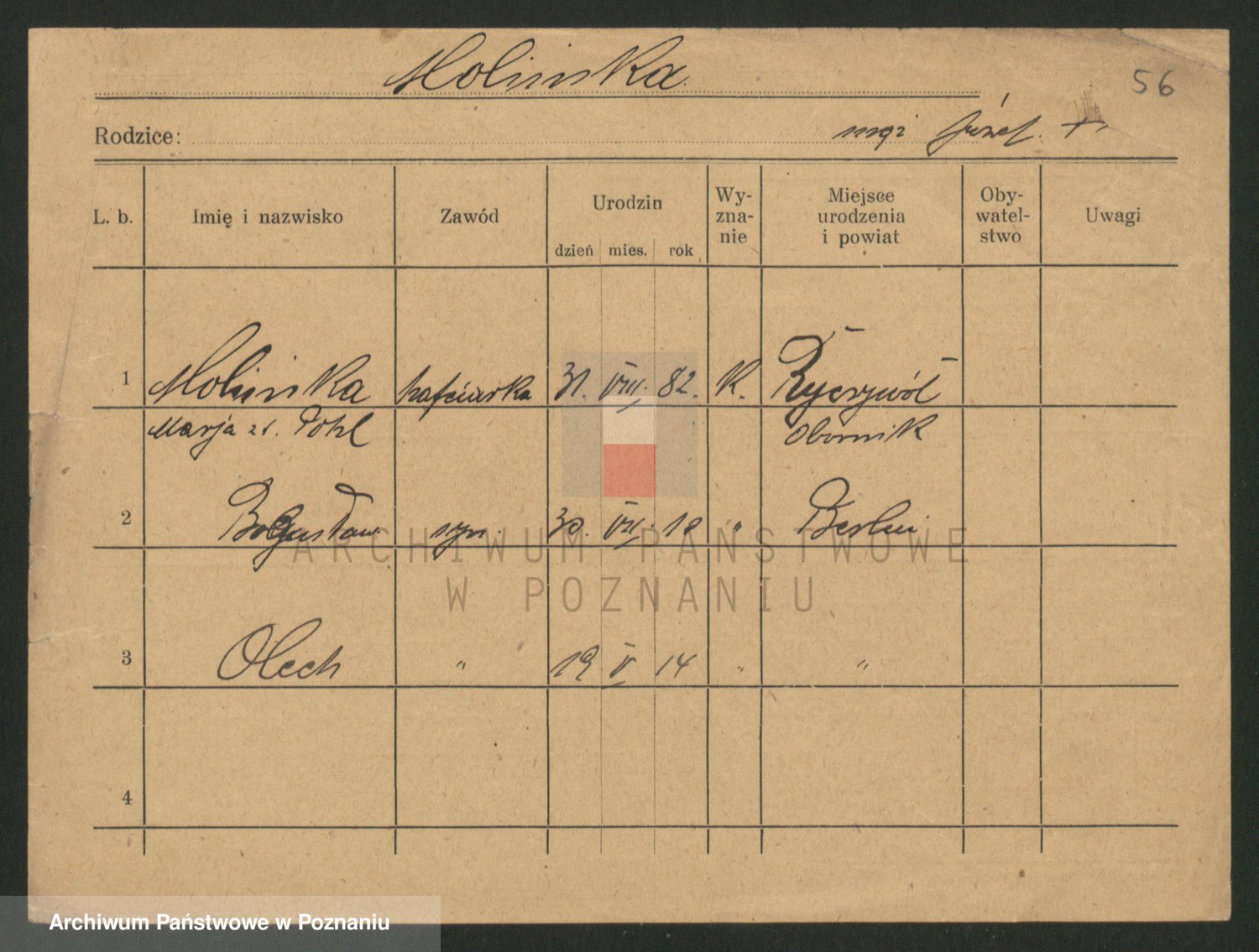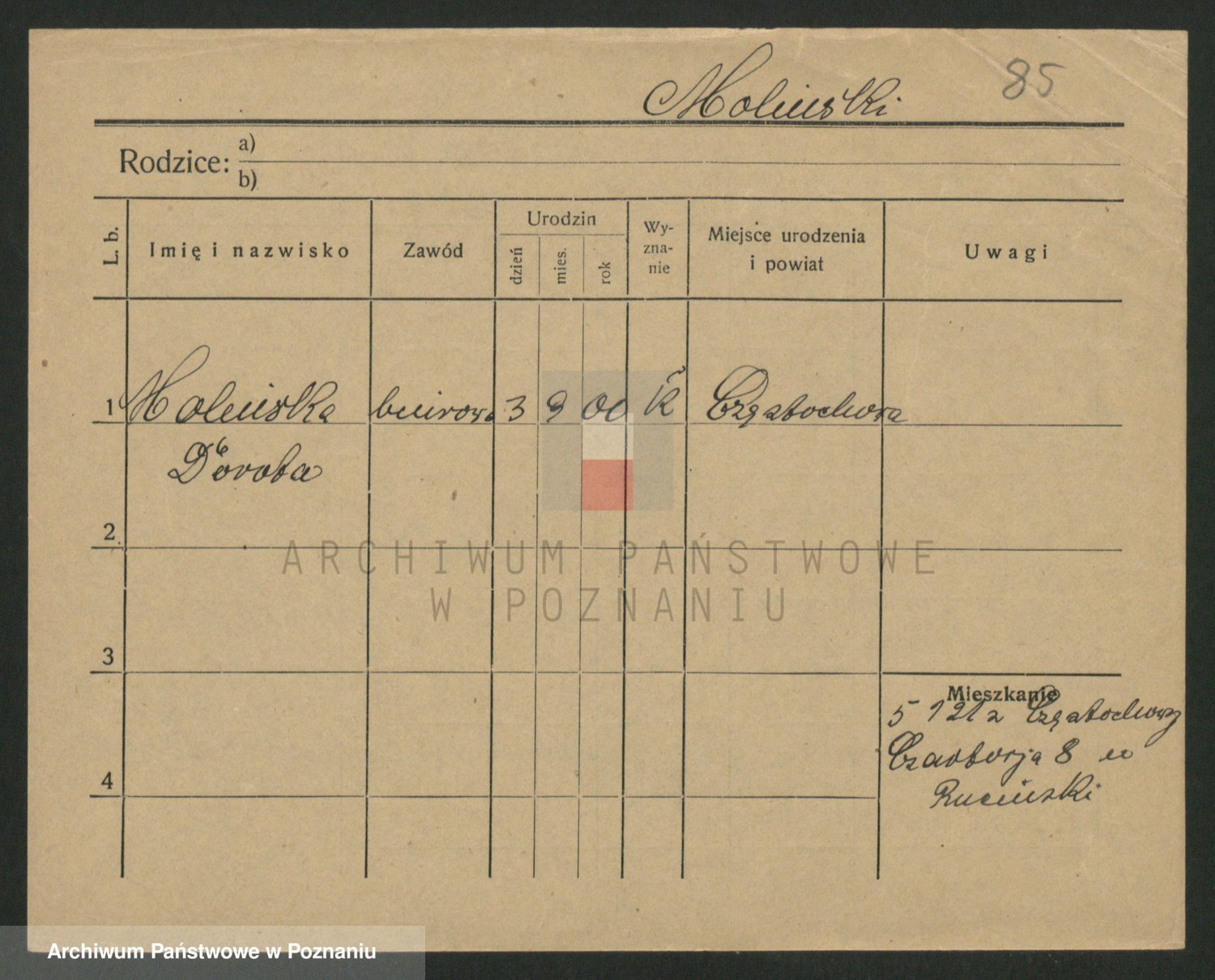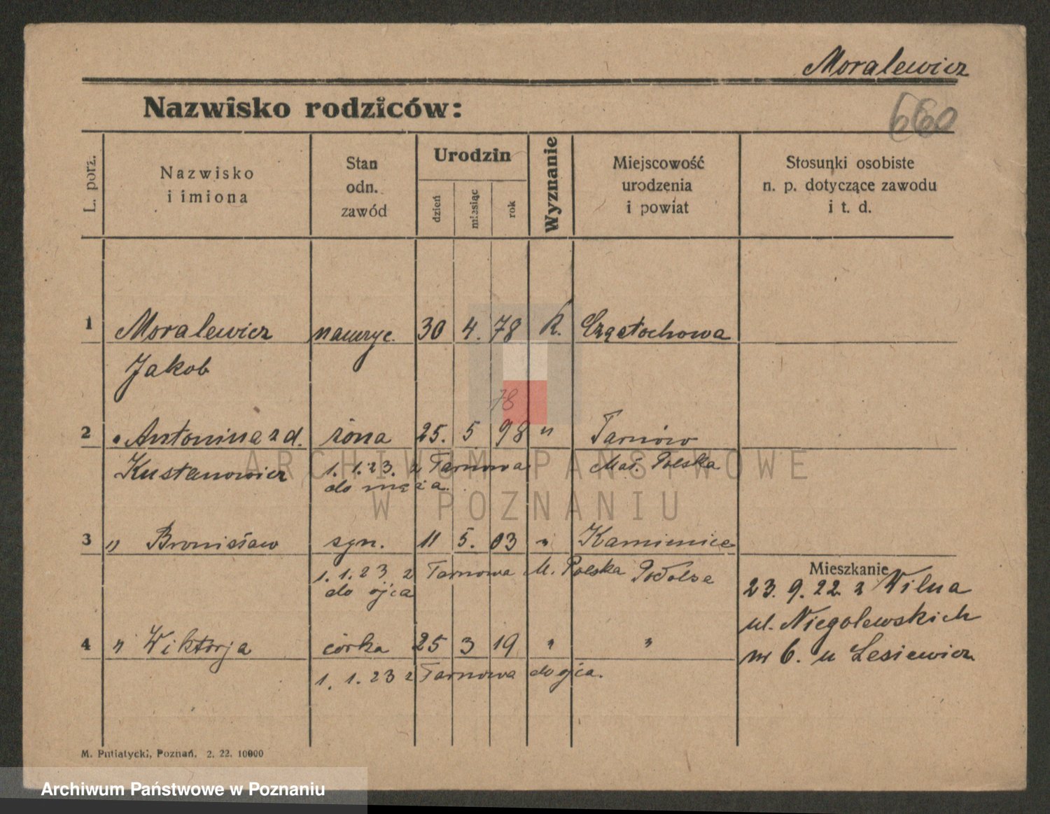 Podgląd karty osobowej dostępny jest po kliknięciu na nazwisko lub ikonkę karty. Można dokonywać powiększenia (ikony na górze) lub przechodzić między kolejnymi skanami (strzałki po bokach).