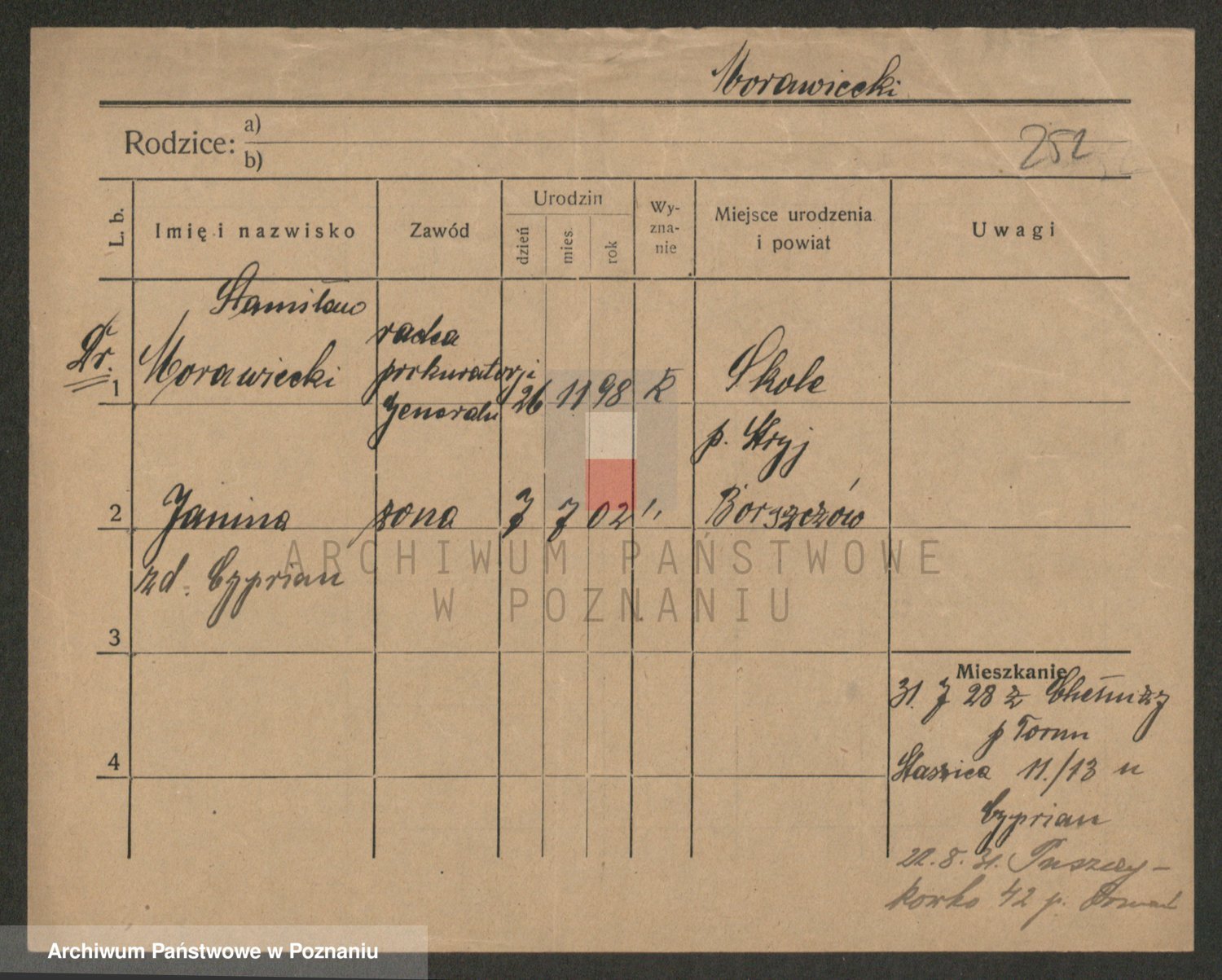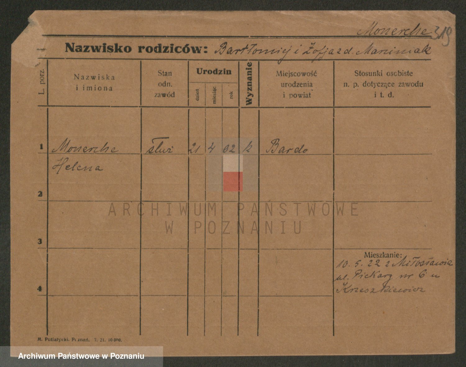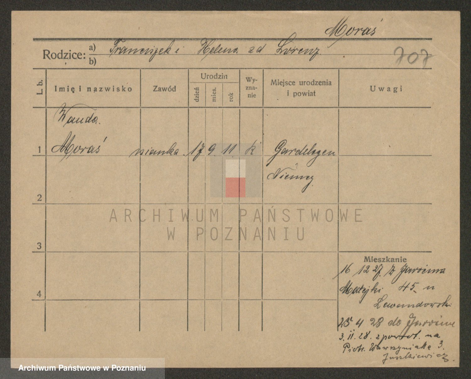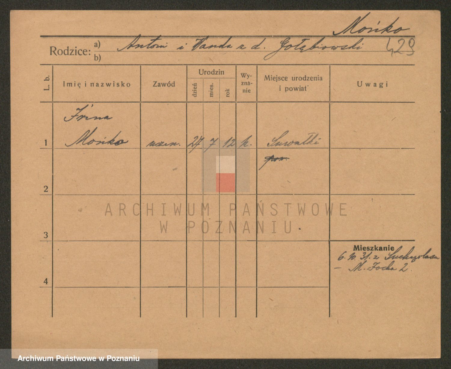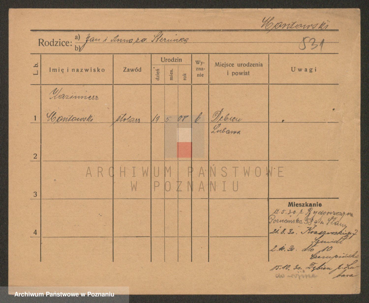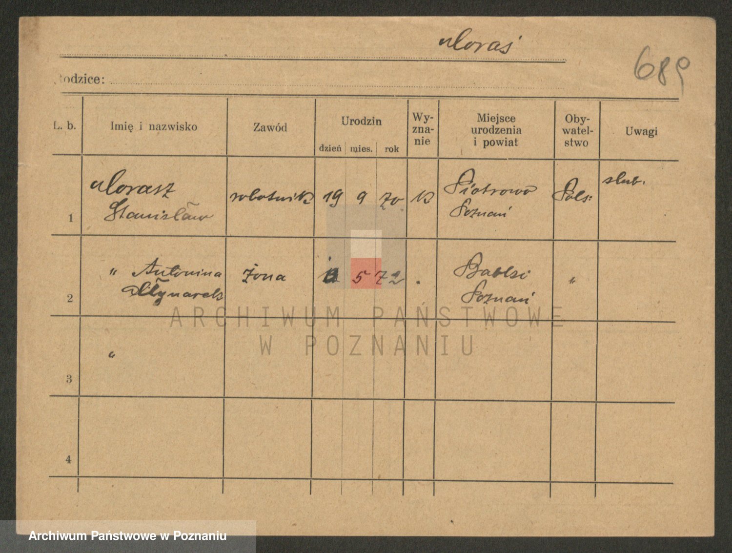 Podgląd karty osobowej dostępny jest po kliknięciu na nazwisko lub ikonkę karty. Można dokonywać powiększenia (ikony na górze) lub przechodzić między kolejnymi skanami (strzałki po bokach).