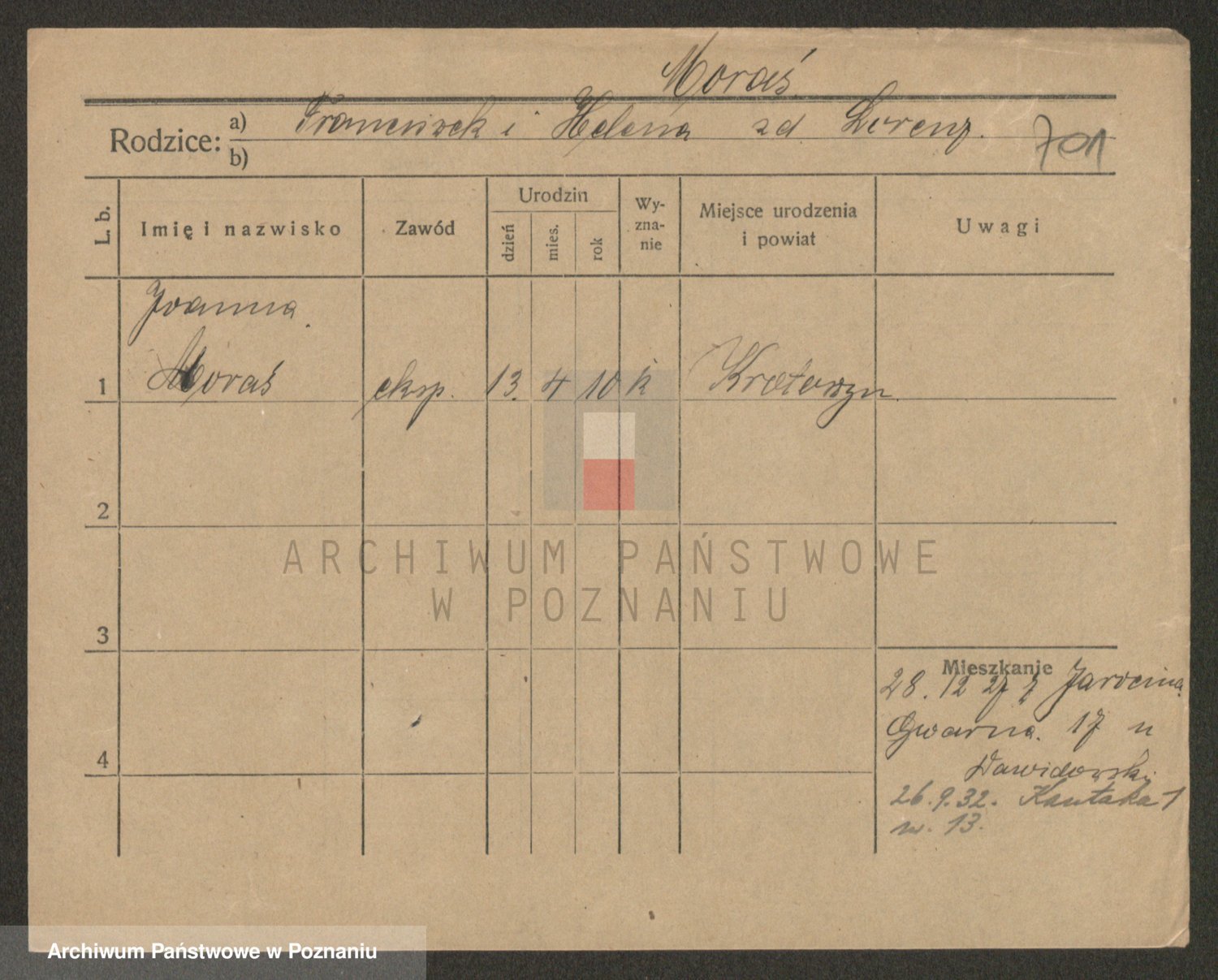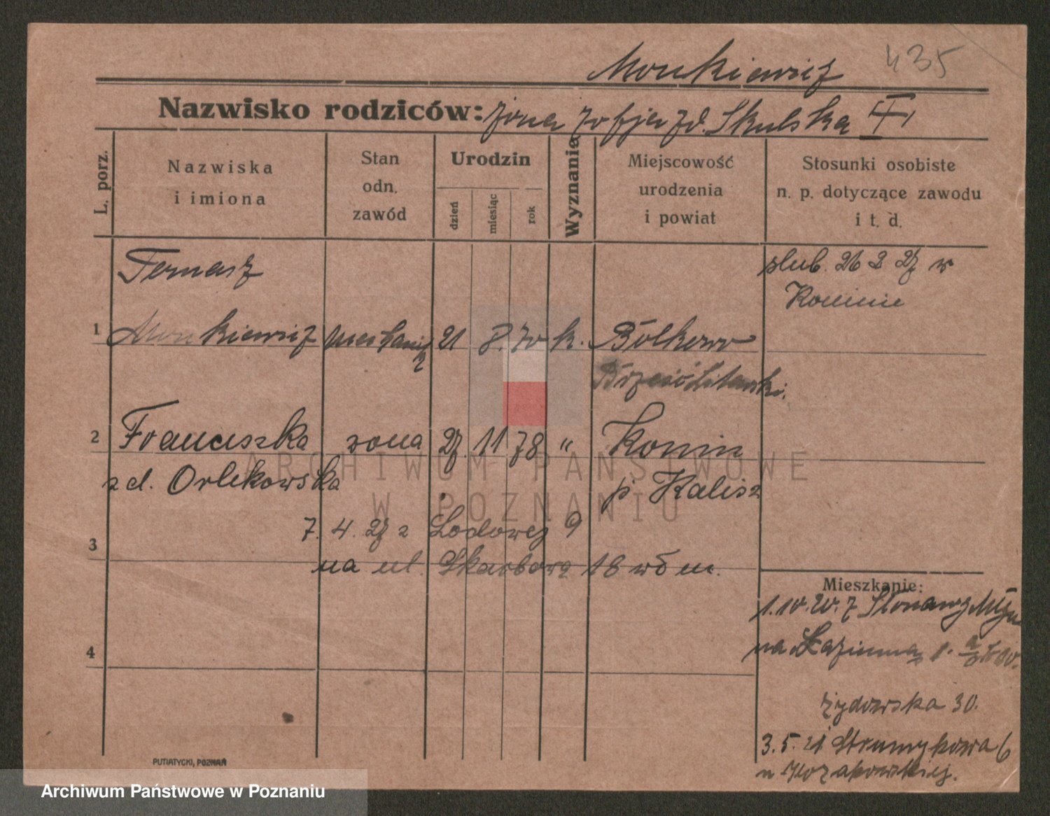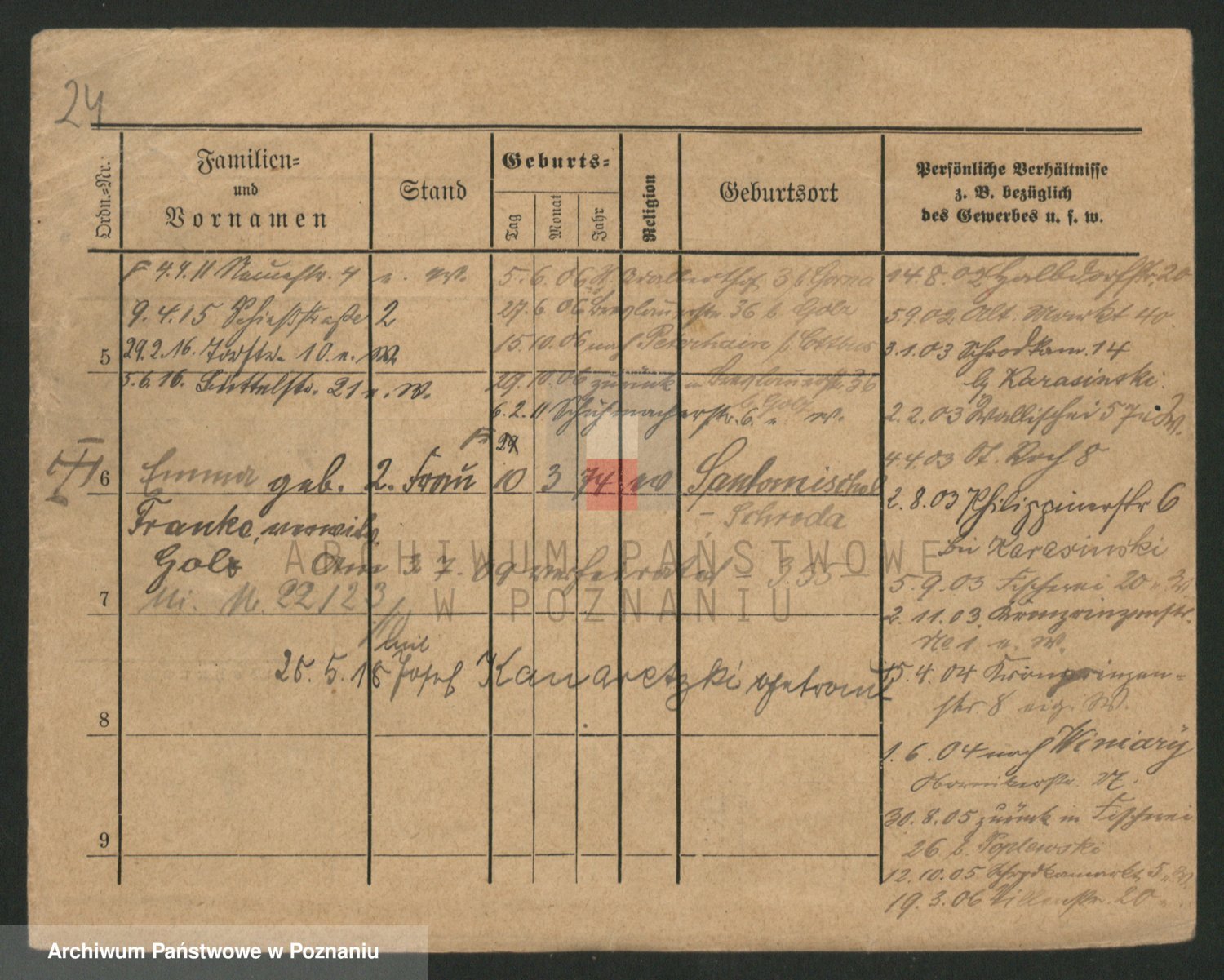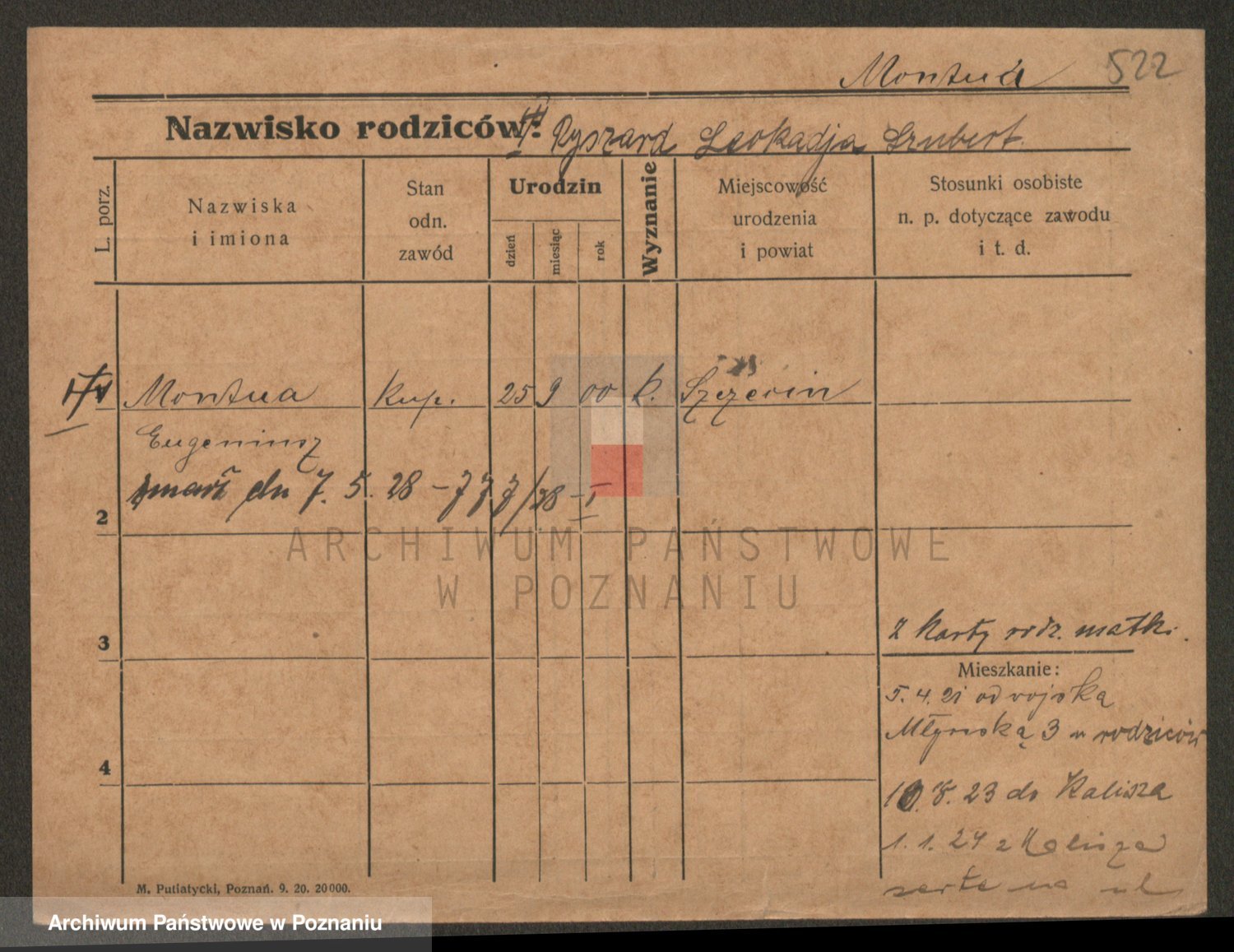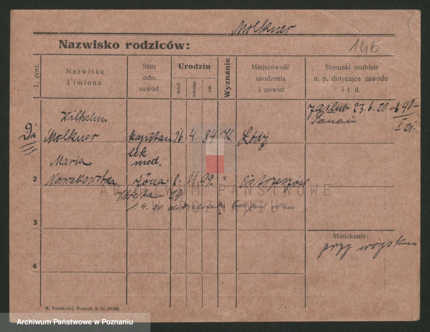 Podgląd karty osobowej dostępny jest po kliknięciu na nazwisko lub ikonkę karty. Można dokonywać powiększenia (ikony na górze) lub przechodzić między kolejnymi skanami (strzałki po bokach).