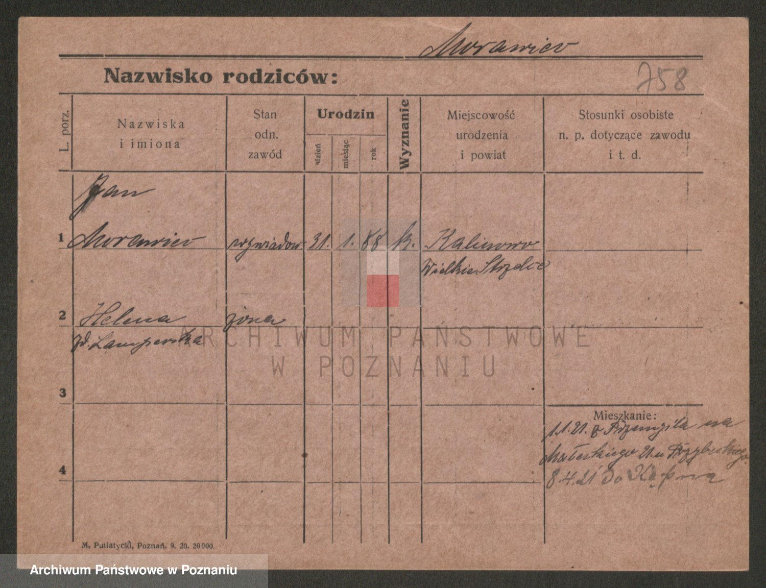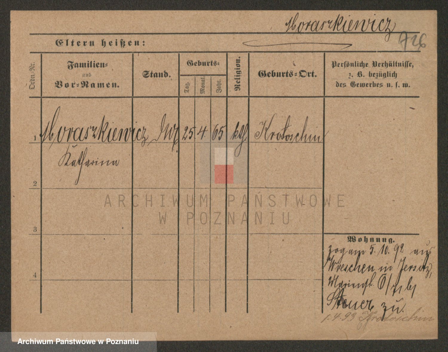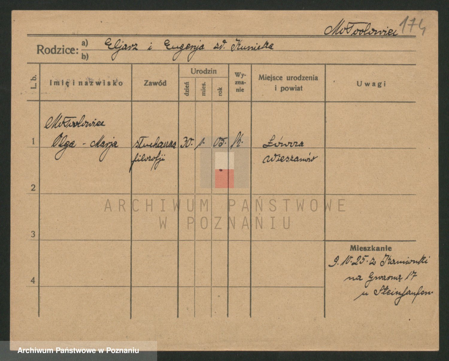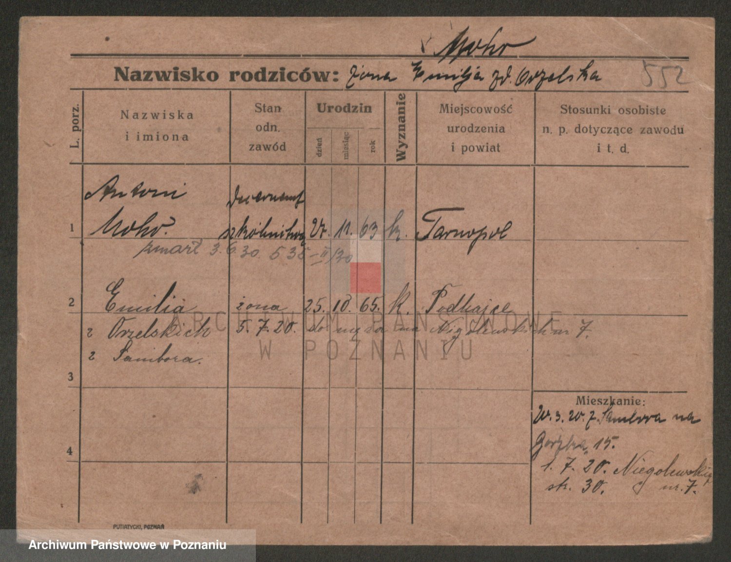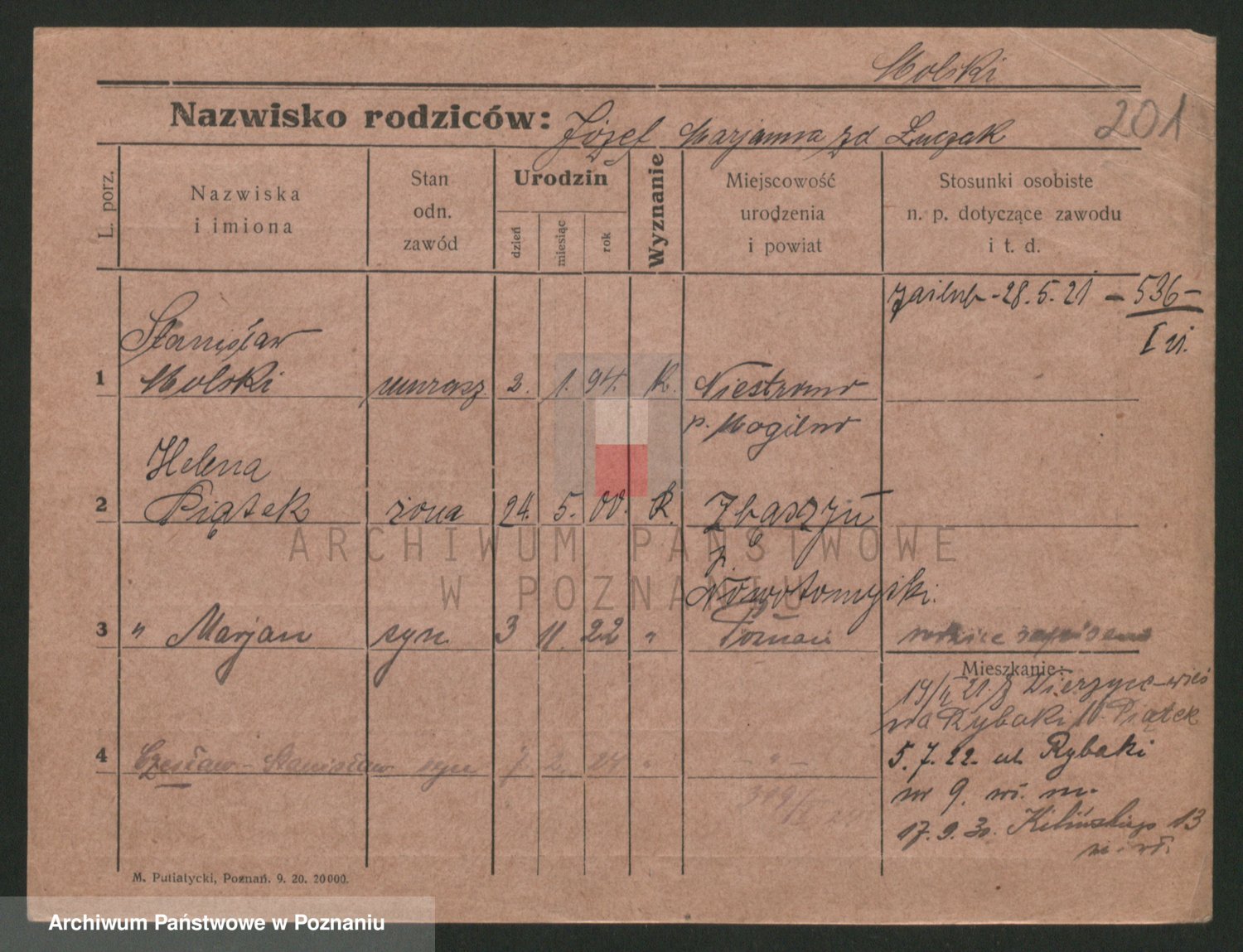 Podgląd karty osobowej dostępny jest po kliknięciu na nazwisko lub ikonkę karty. Można dokonywać powiększenia (ikony na górze) lub przechodzić między kolejnymi skanami (strzałki po bokach).
