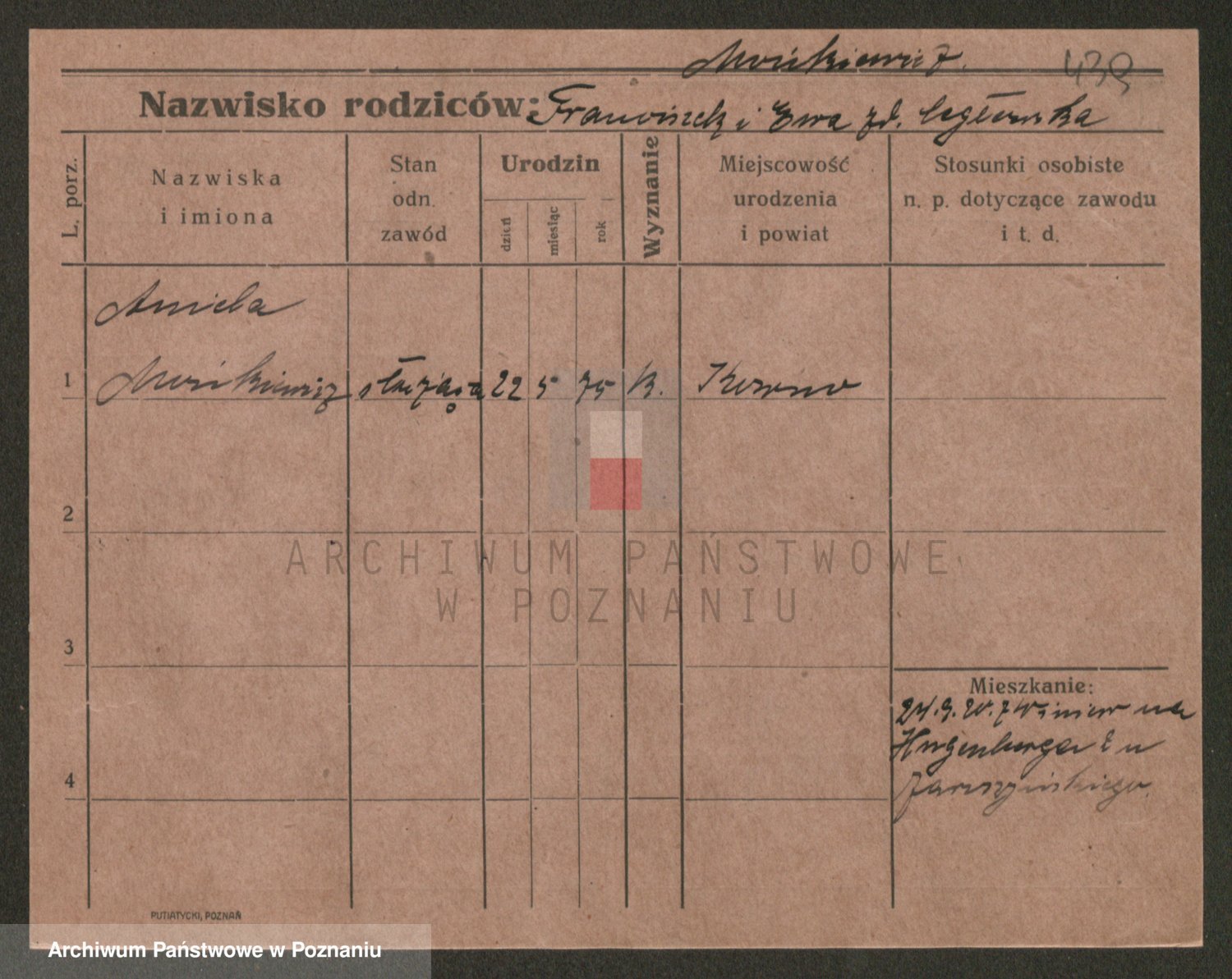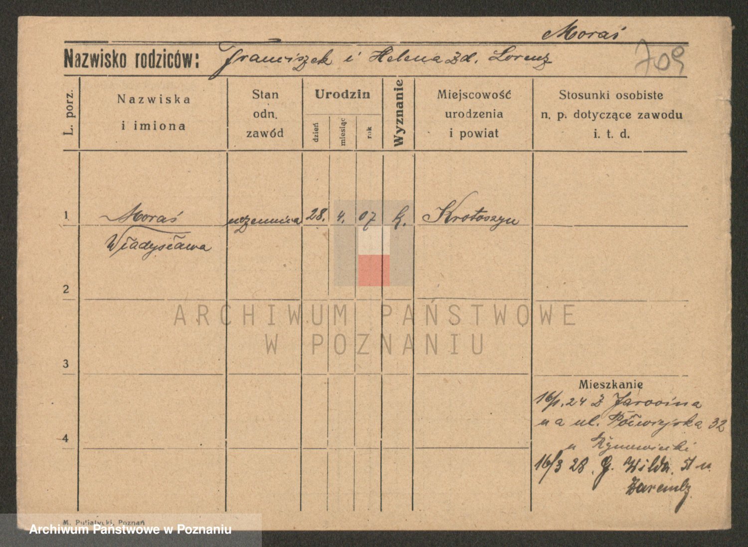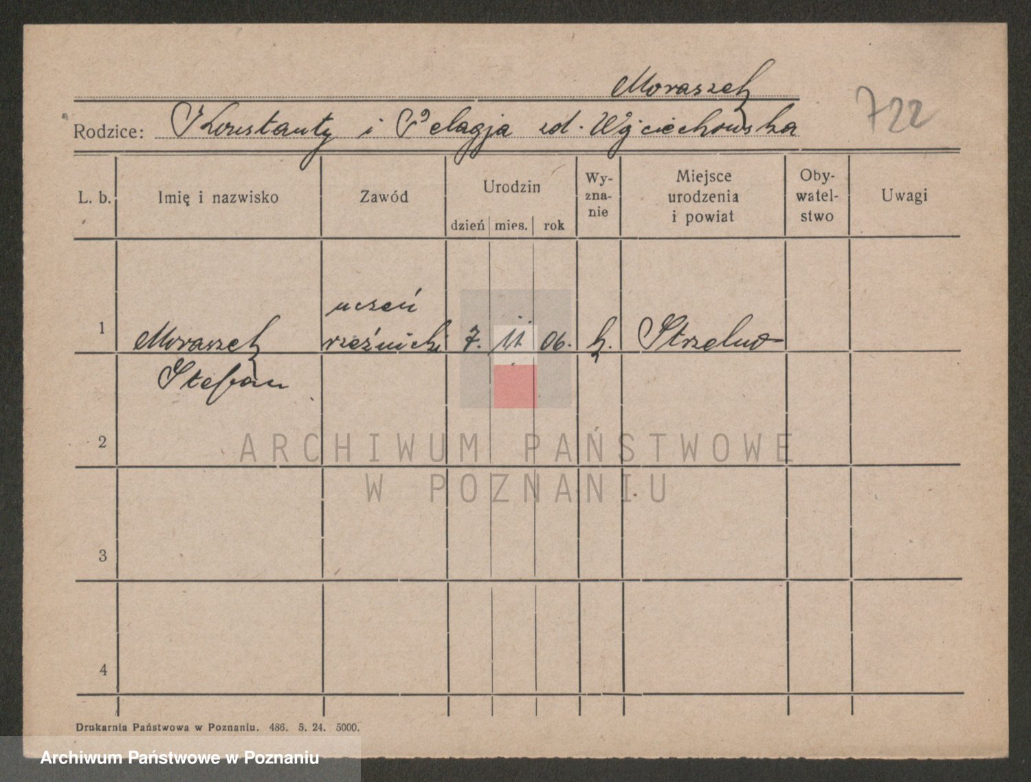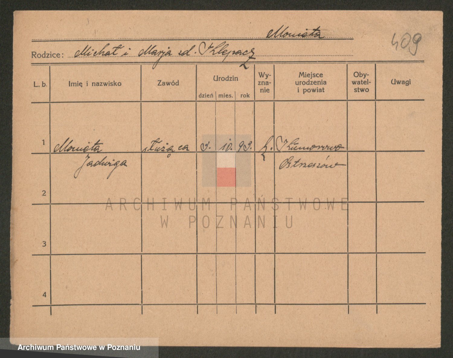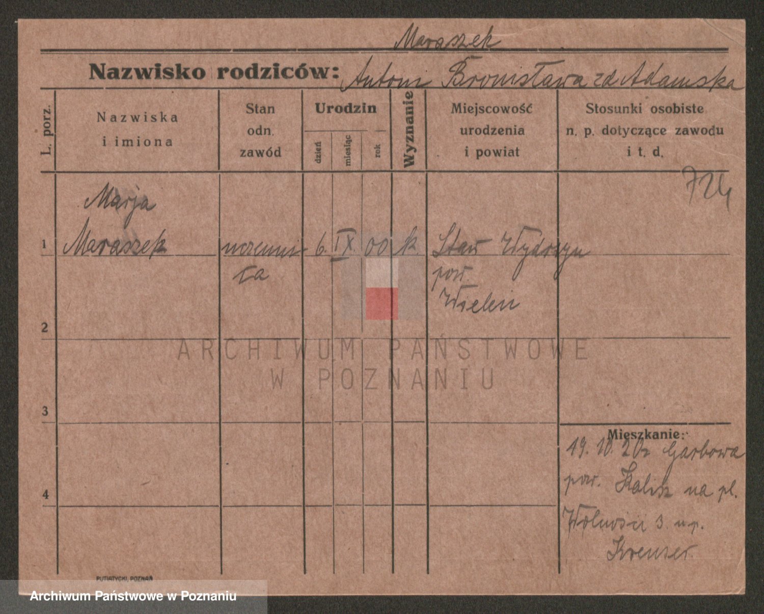 Podgląd karty osobowej dostępny jest po kliknięciu na nazwisko lub ikonkę karty. Można dokonywać powiększenia (ikony na górze) lub przechodzić między kolejnymi skanami (strzałki po bokach).