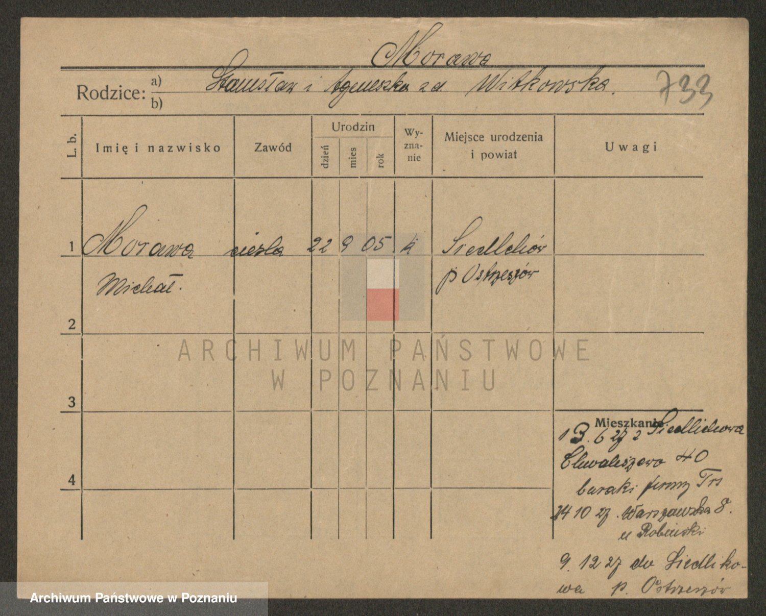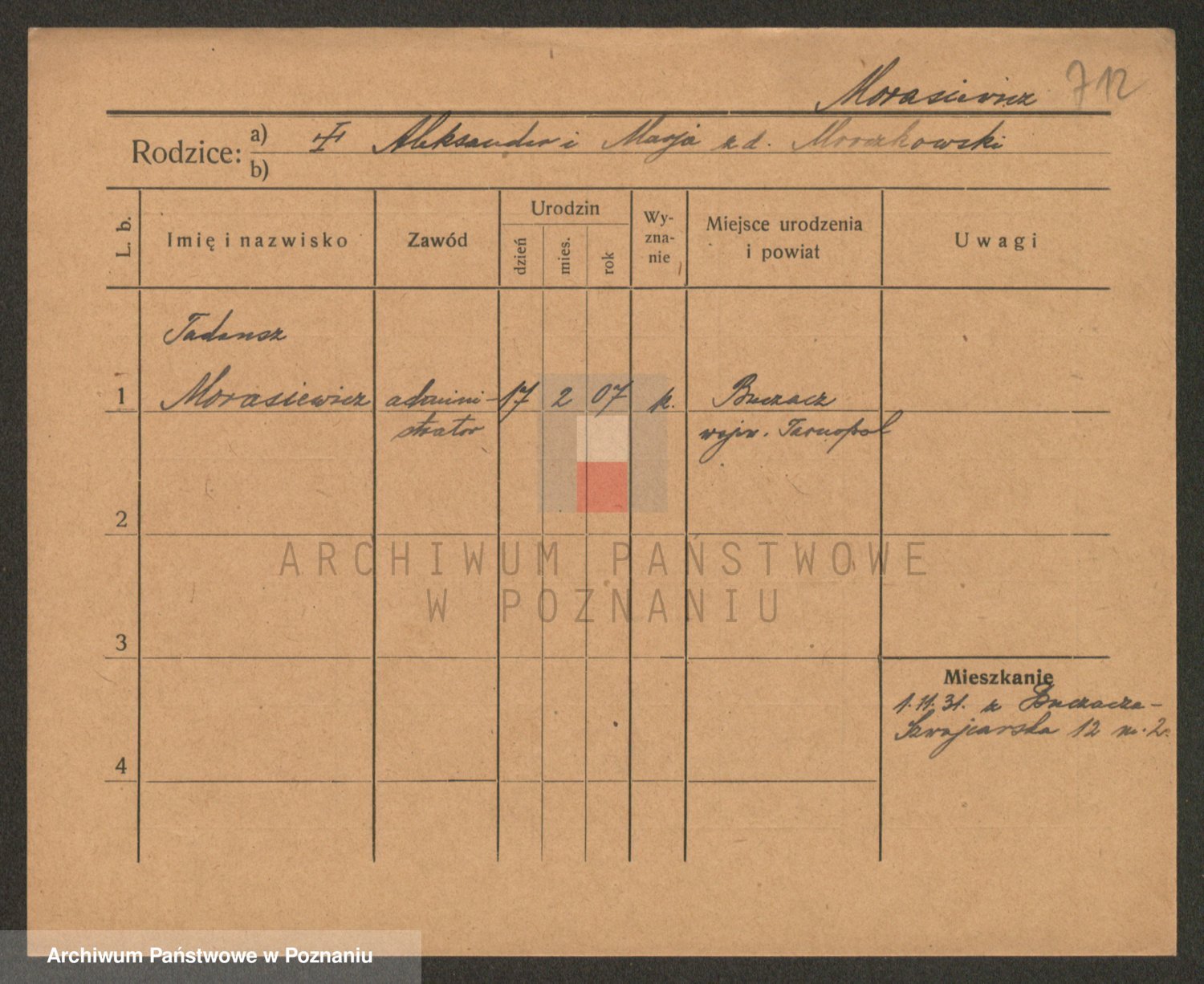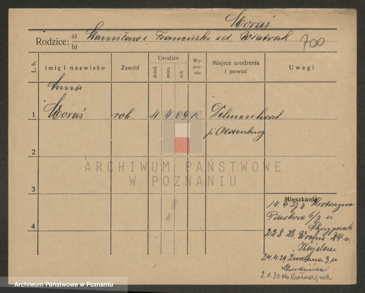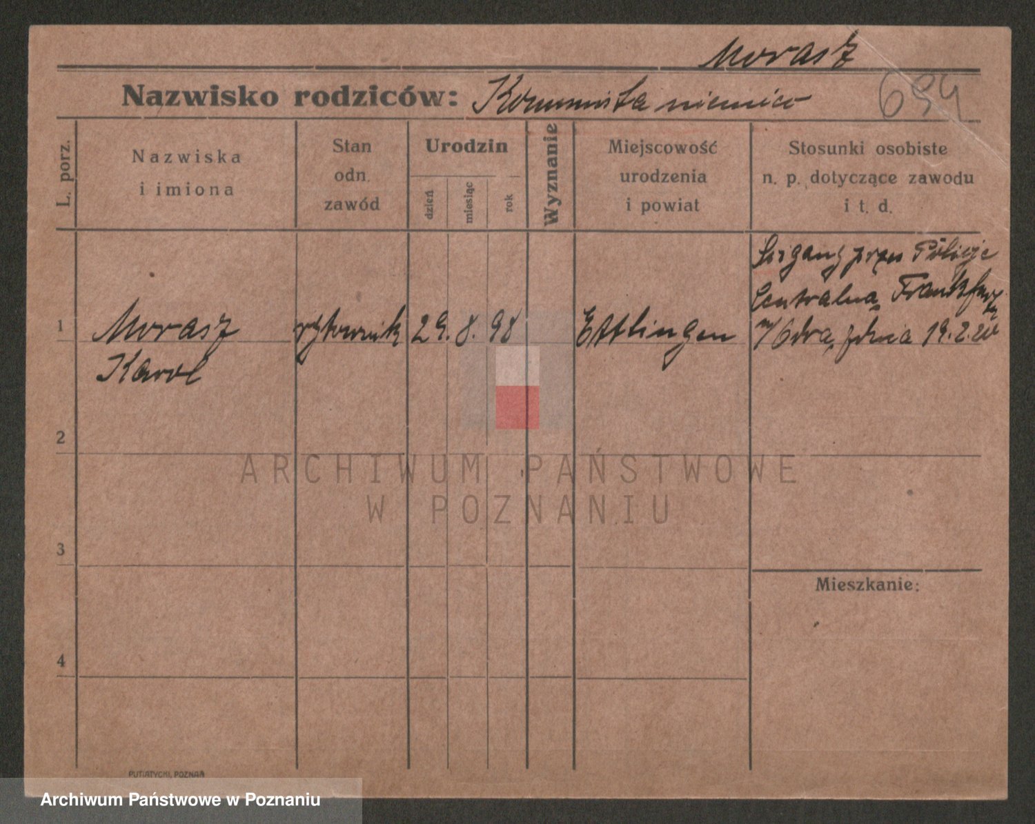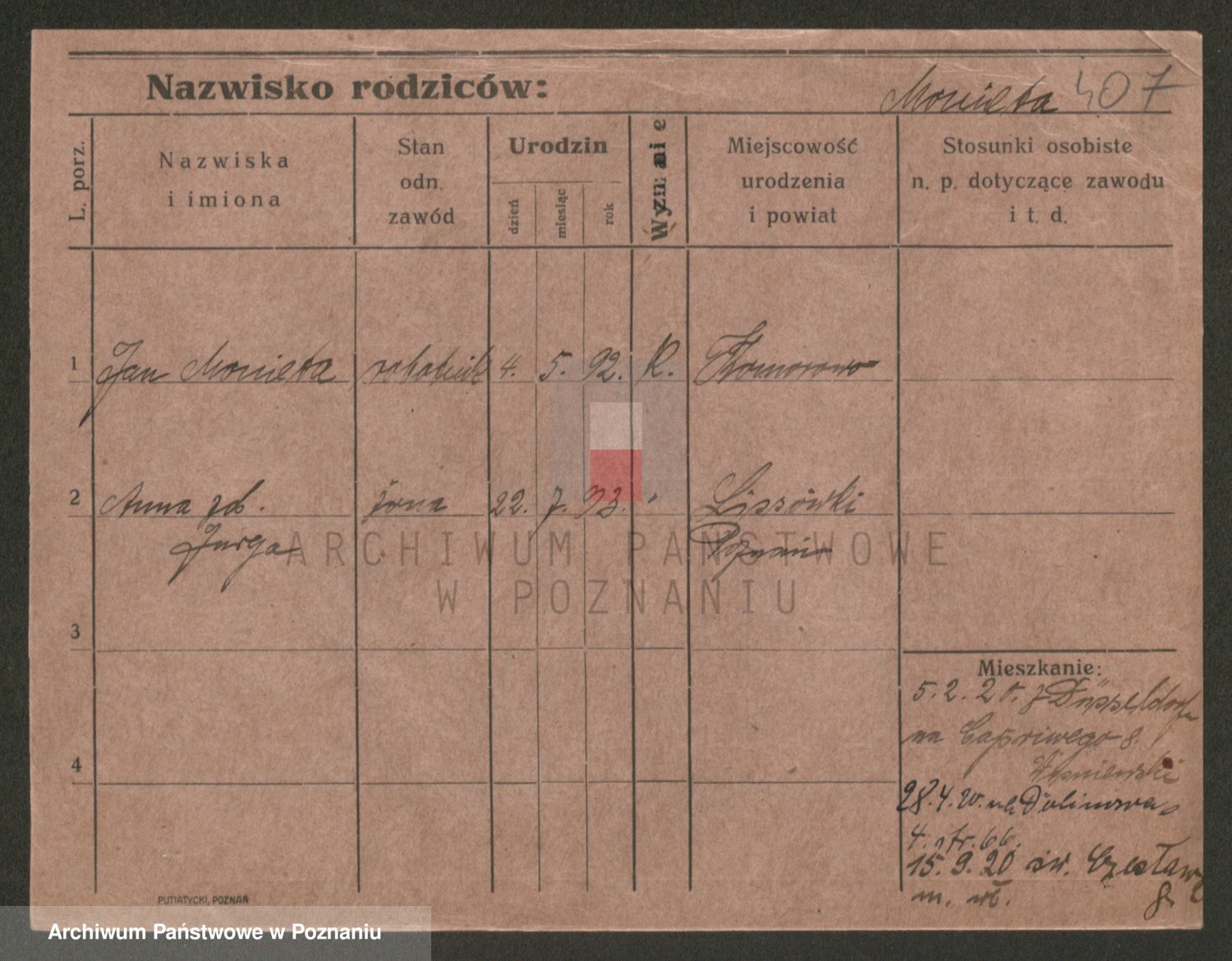 Podgląd karty osobowej dostępny jest po kliknięciu na nazwisko lub ikonkę karty. Można dokonywać powiększenia (ikony na górze) lub przechodzić między kolejnymi skanami (strzałki po bokach).
