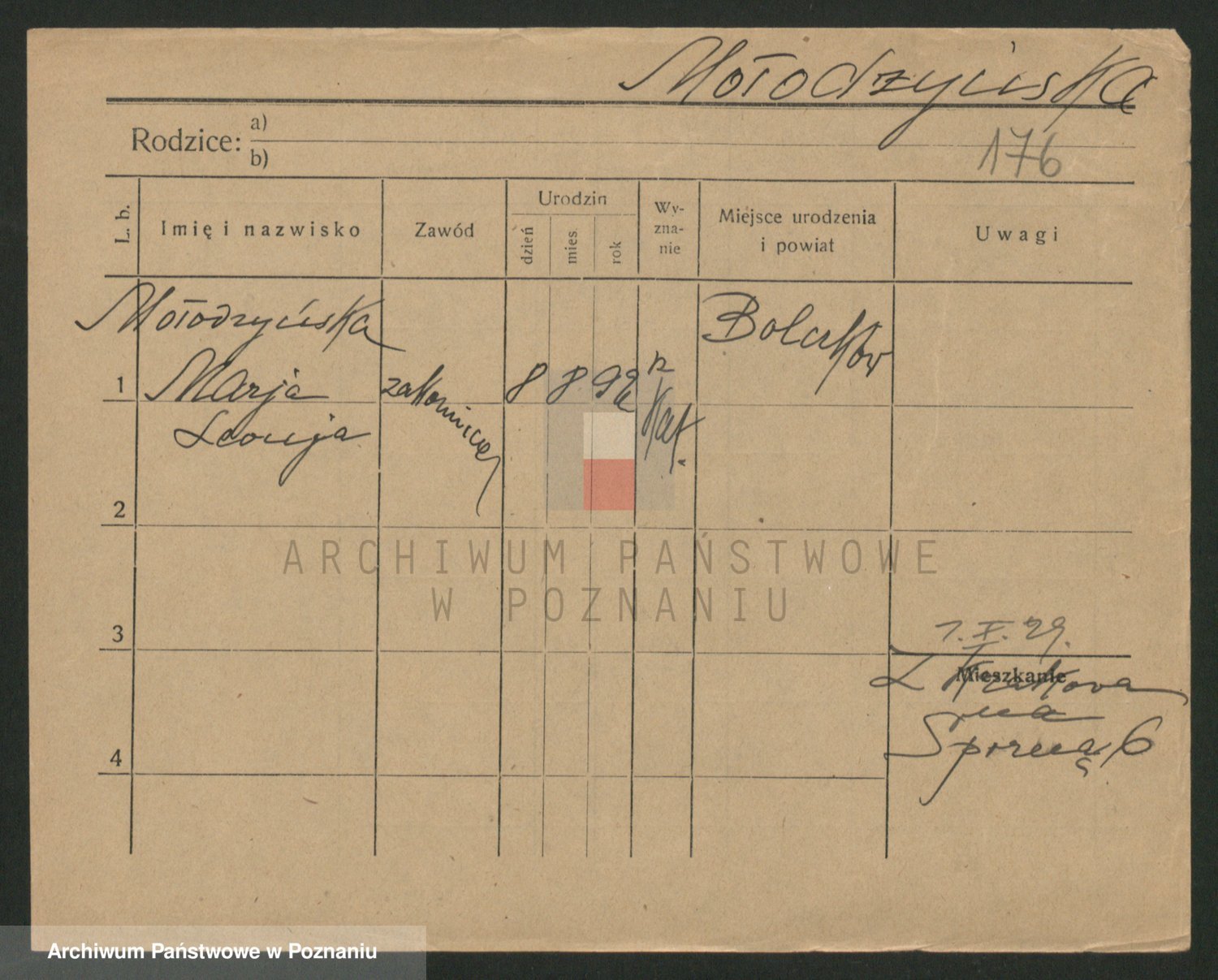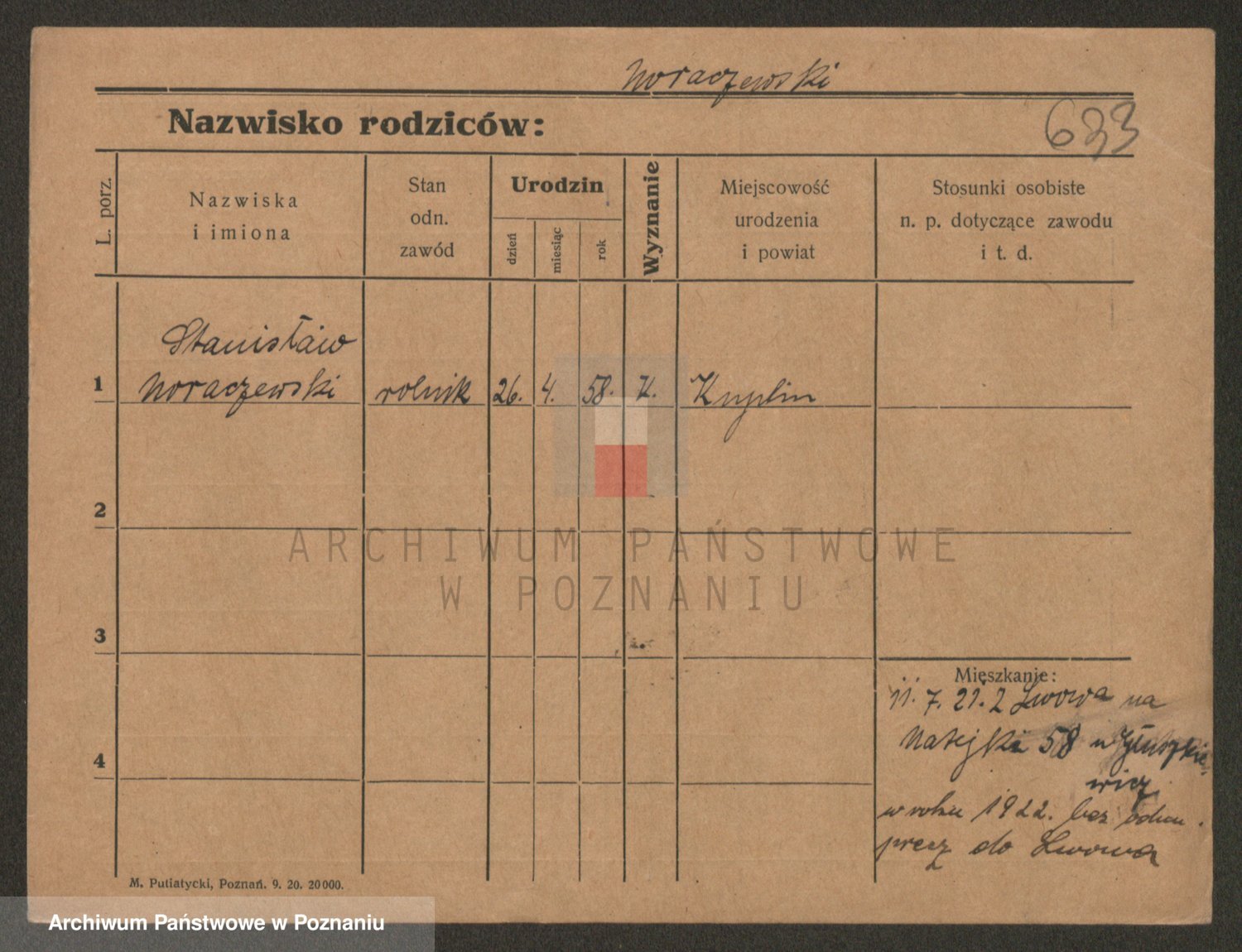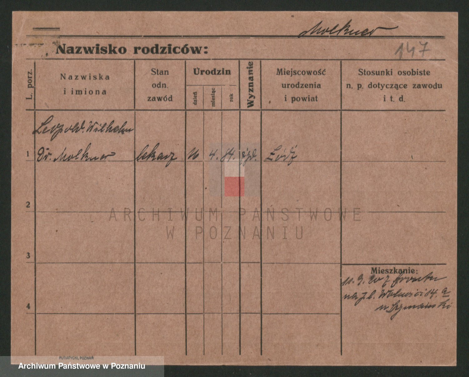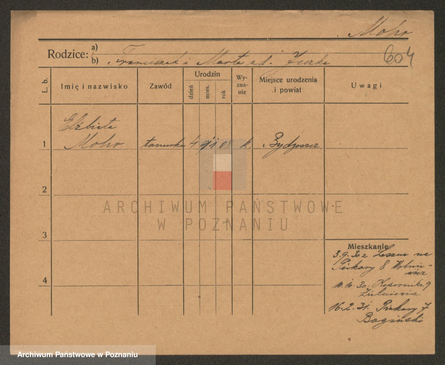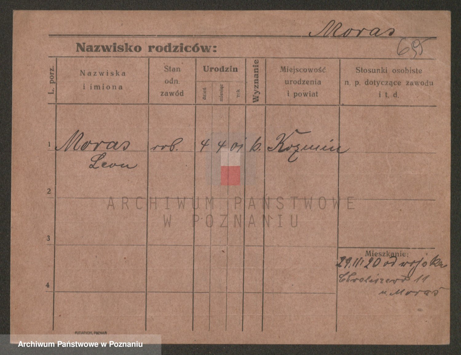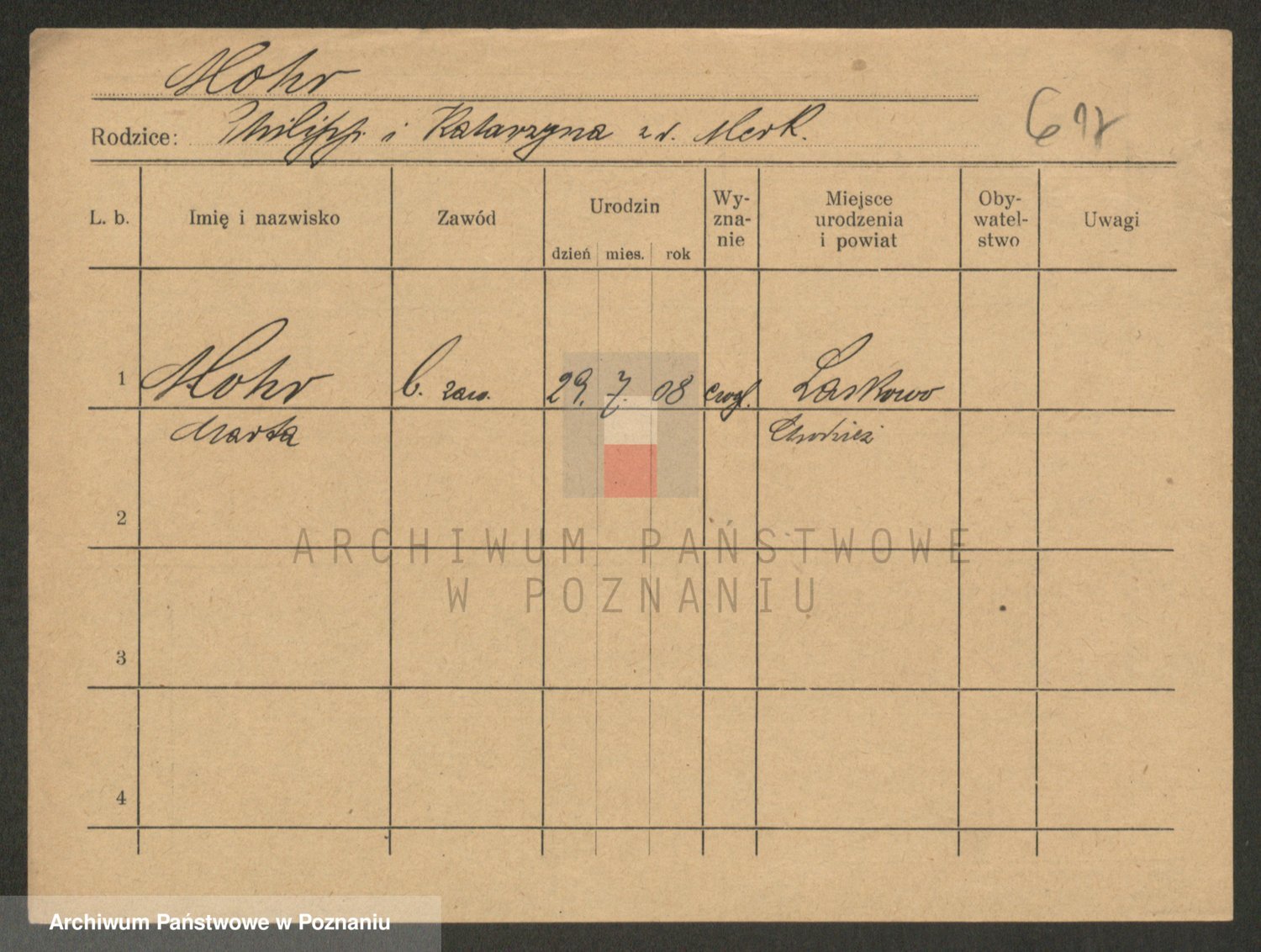 Podgląd karty osobowej dostępny jest po kliknięciu na nazwisko lub ikonkę karty. Można dokonywać powiększenia (ikony na górze) lub przechodzić między kolejnymi skanami (strzałki po bokach).