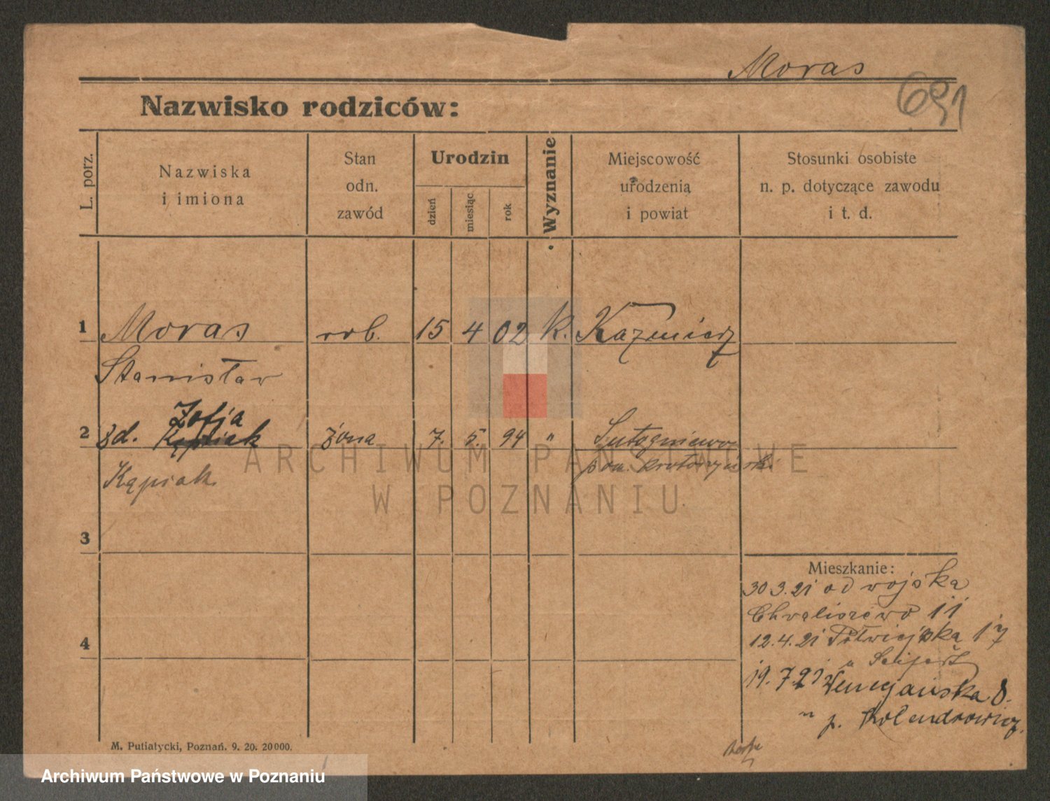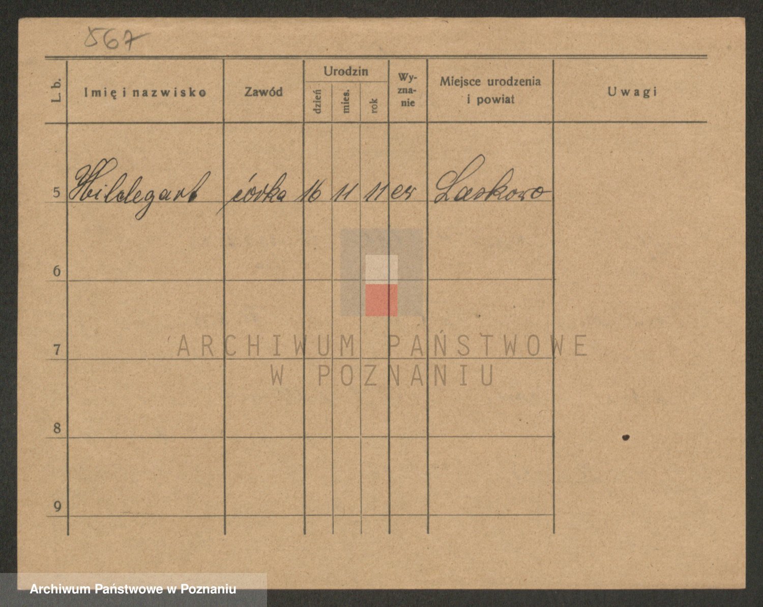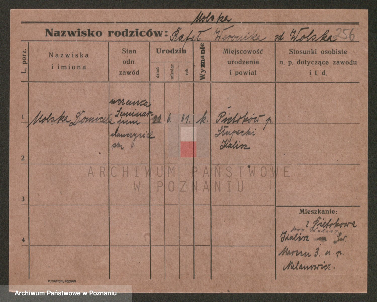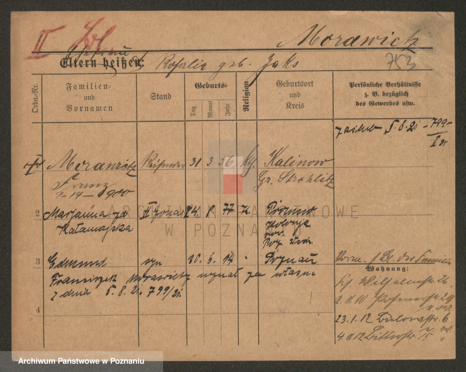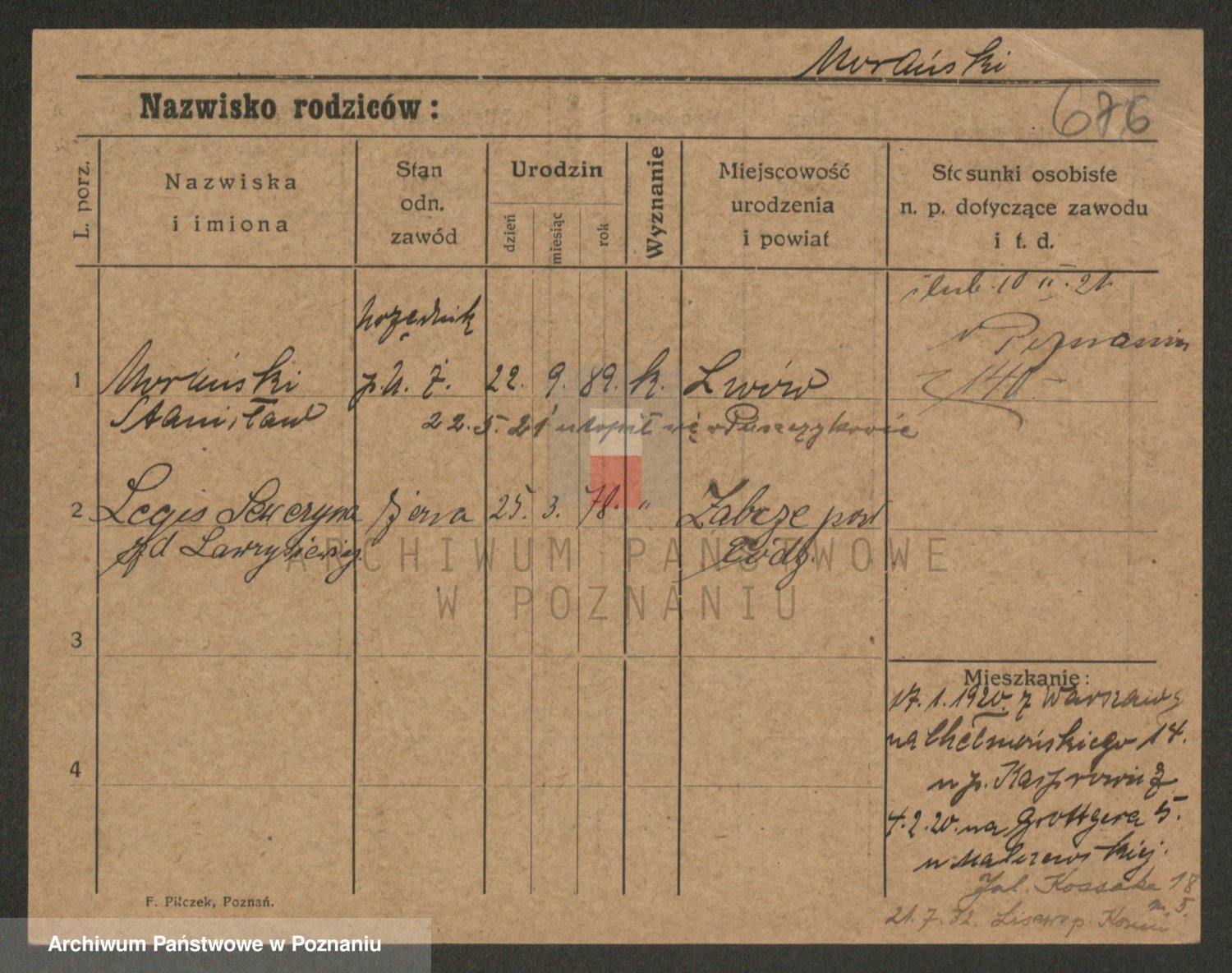 Podgląd karty osobowej dostępny jest po kliknięciu na nazwisko lub ikonkę karty. Można dokonywać powiększenia (ikony na górze) lub przechodzić między kolejnymi skanami (strzałki po bokach).