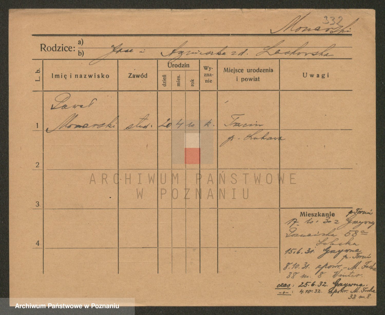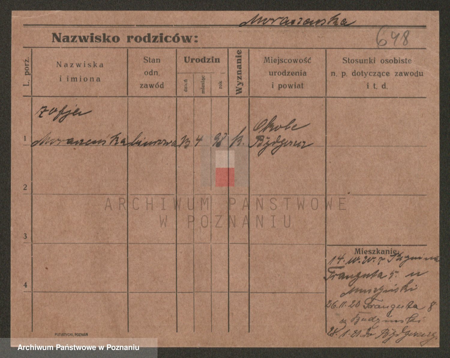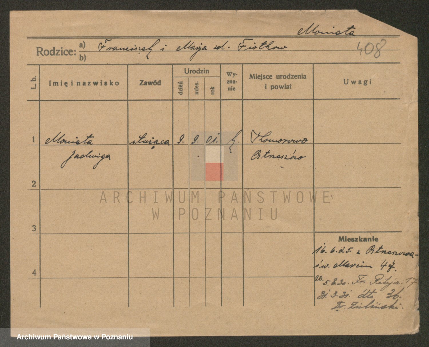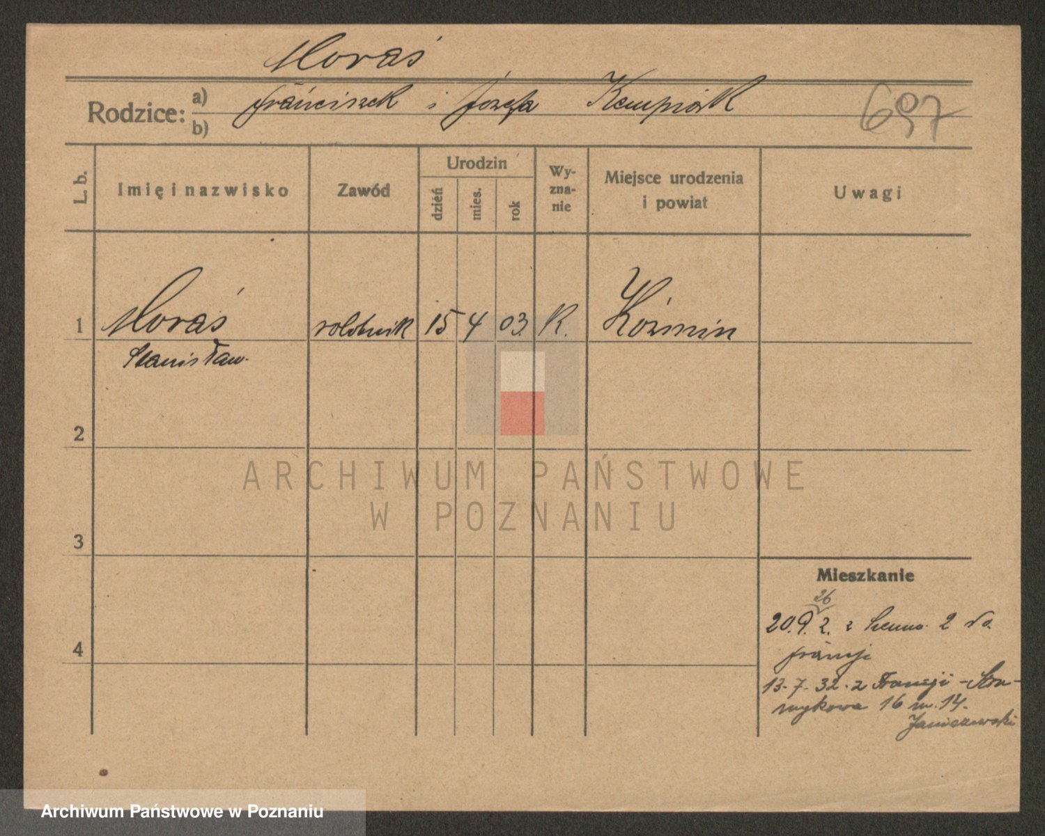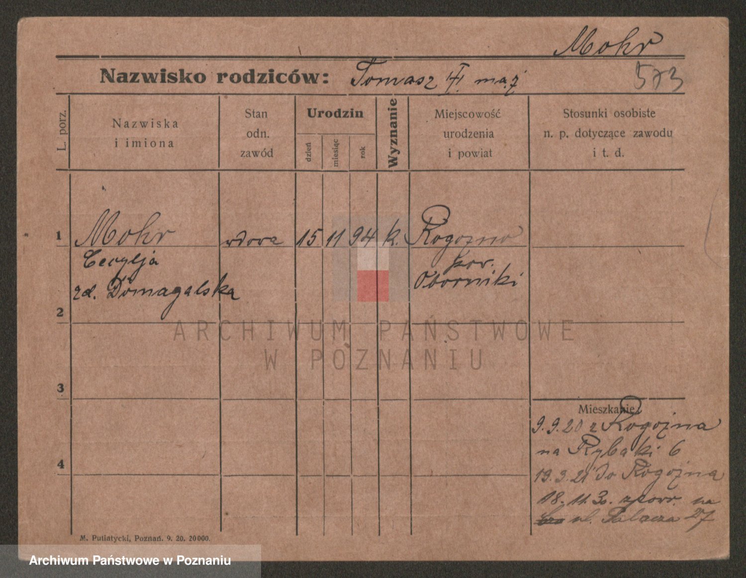 Podgląd karty osobowej dostępny jest po kliknięciu na nazwisko lub ikonkę karty. Można dokonywać powiększenia (ikony na górze) lub przechodzić między kolejnymi skanami (strzałki po bokach).