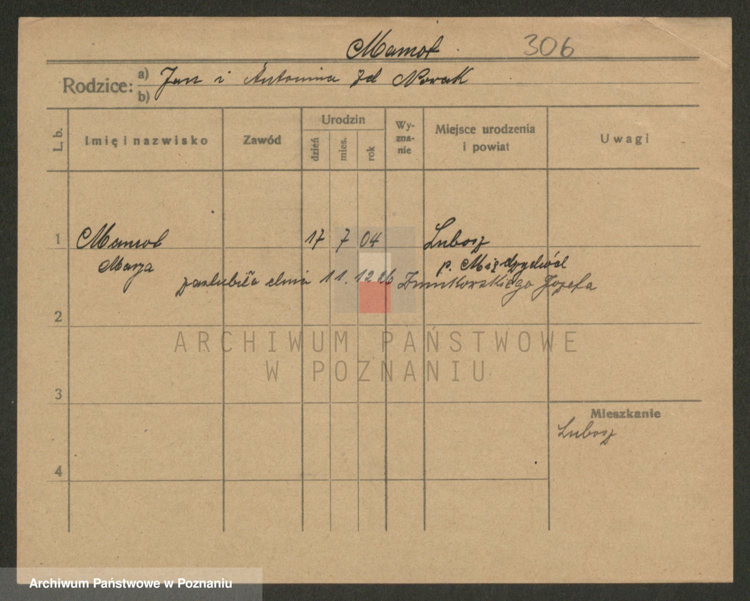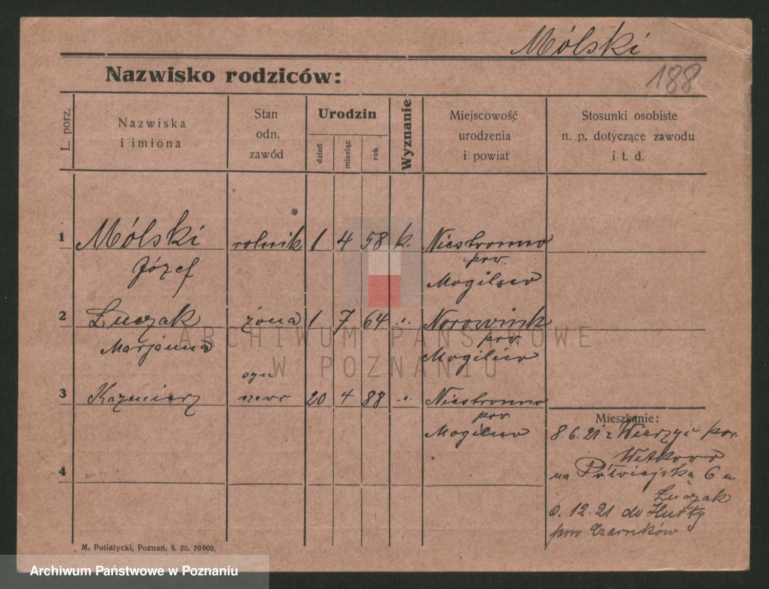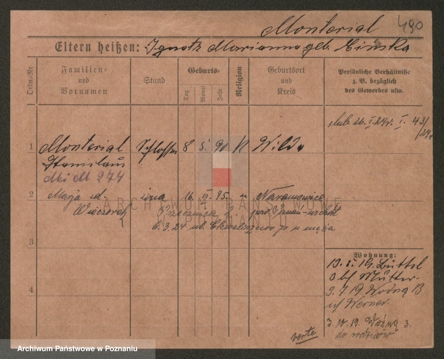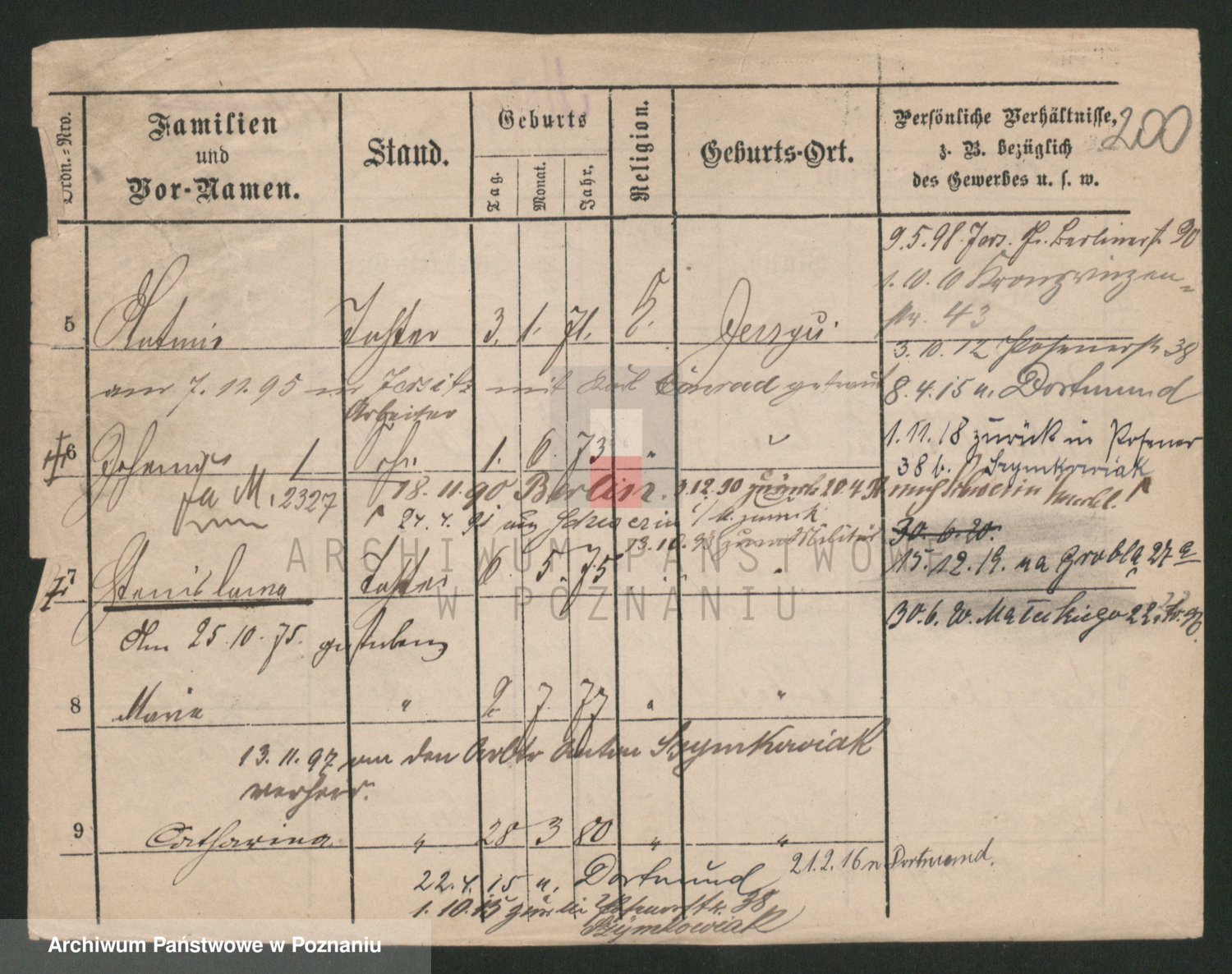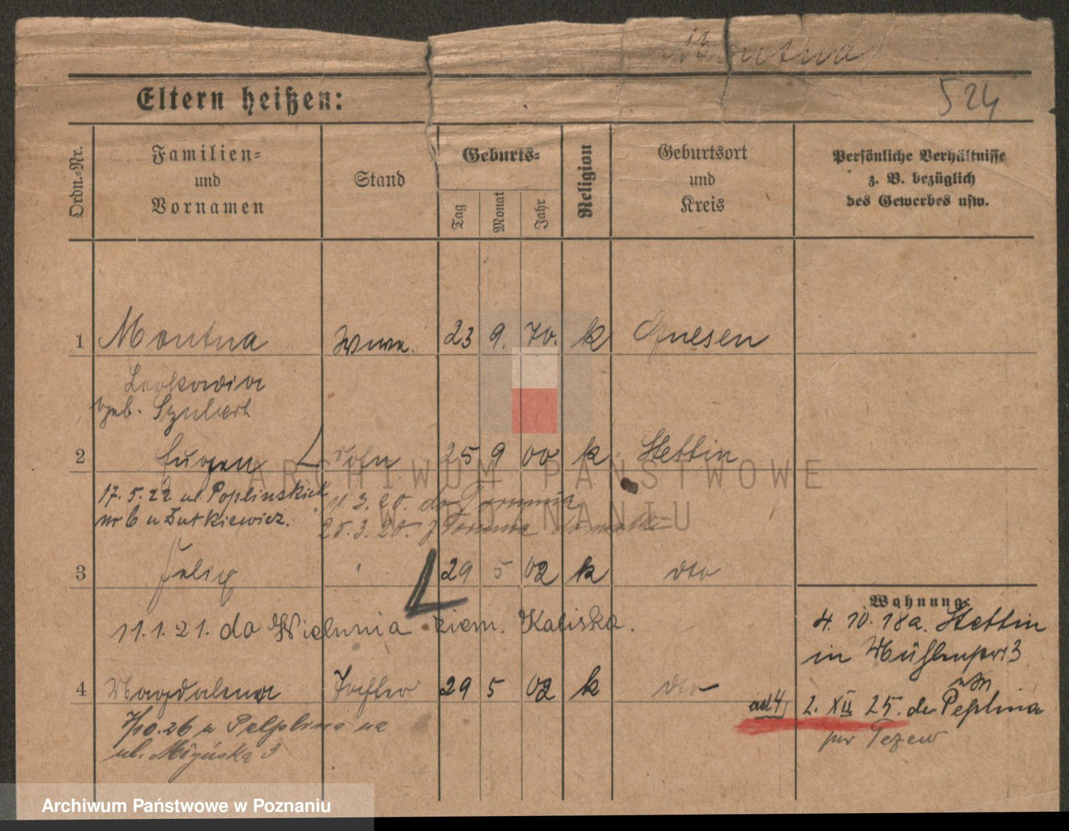 Podgląd karty osobowej dostępny jest po kliknięciu na nazwisko lub ikonkę karty. Można dokonywać powiększenia (ikony na górze) lub przechodzić między kolejnymi skanami (strzałki po bokach).
