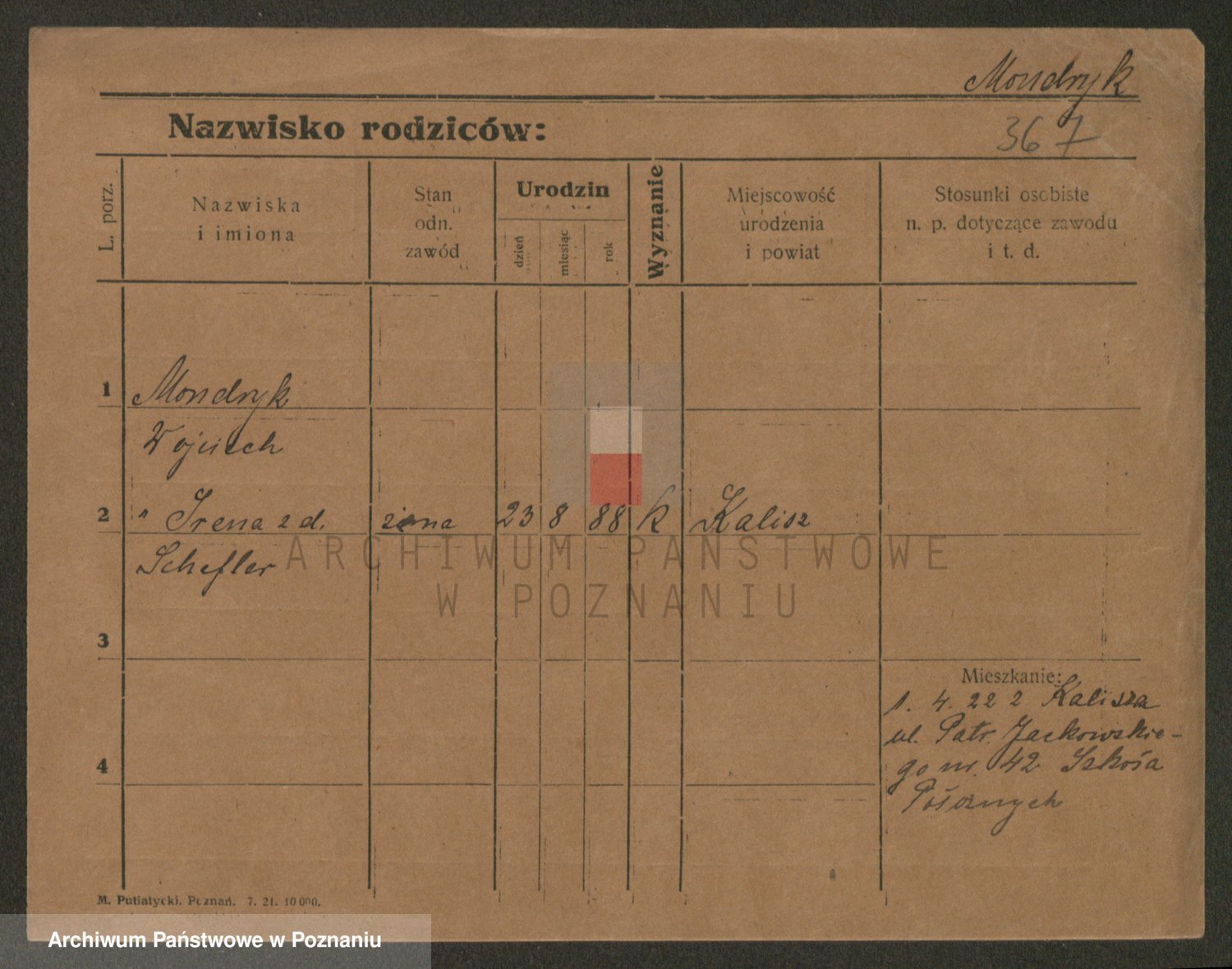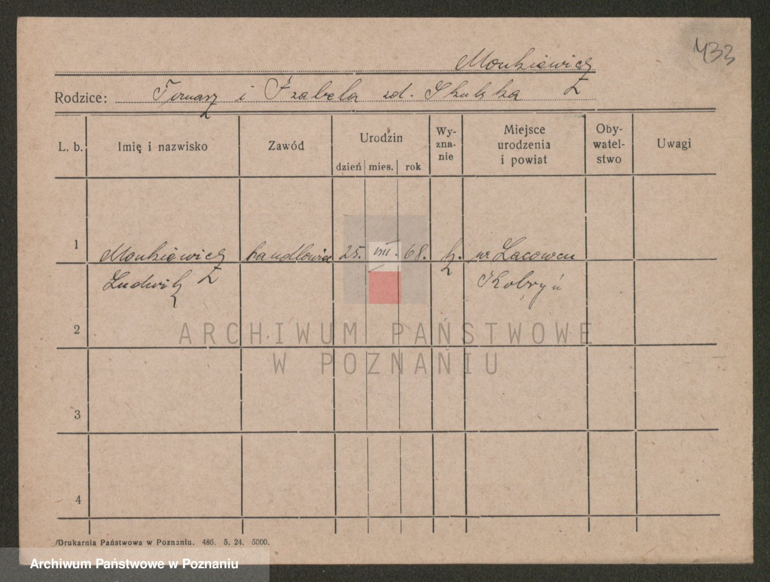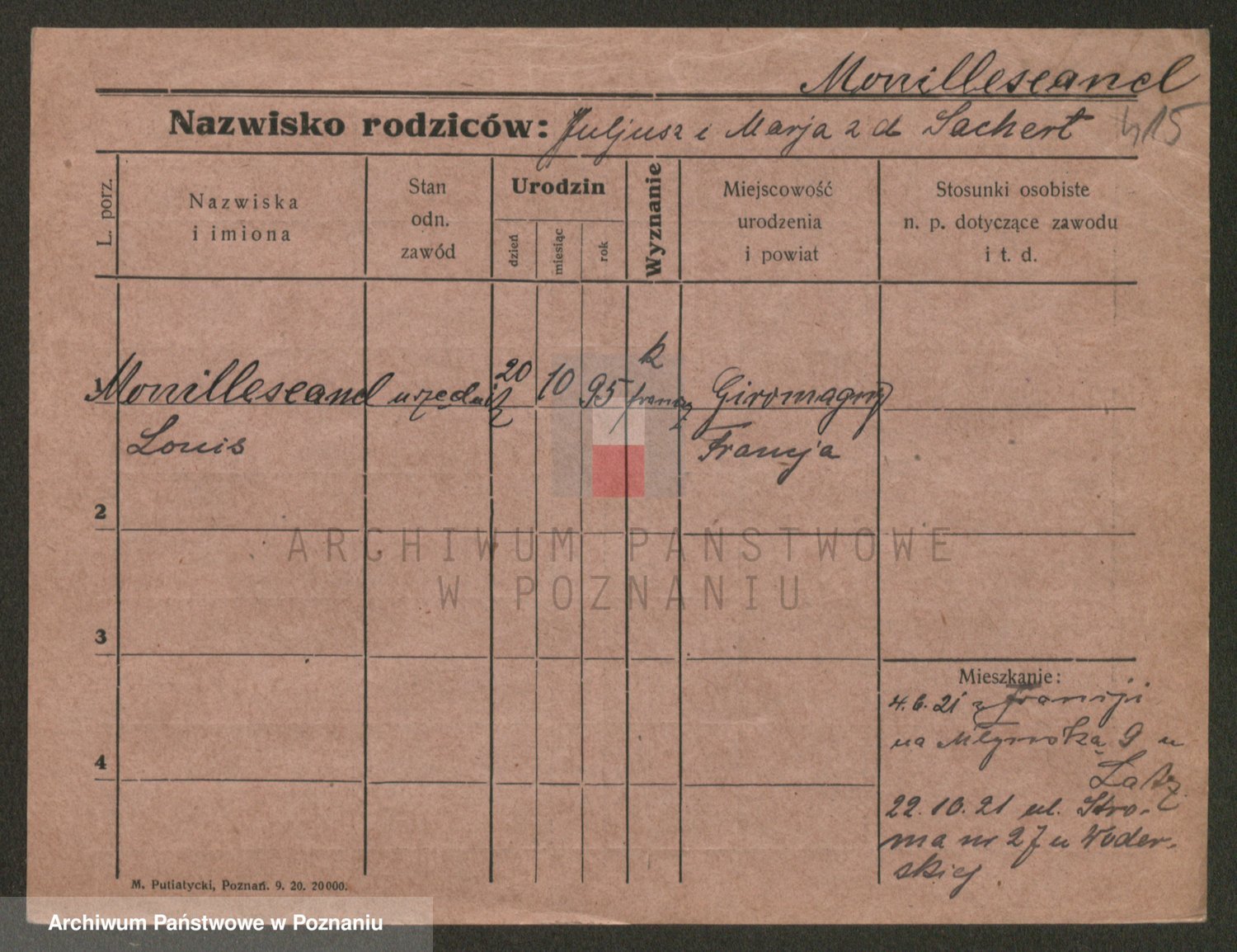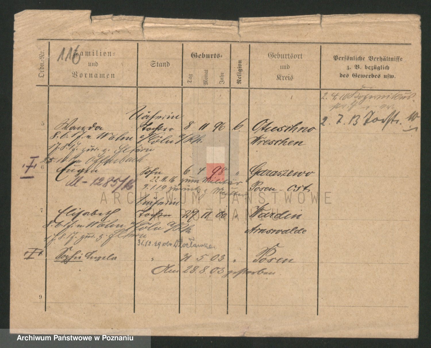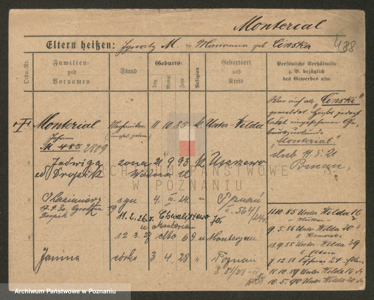 Podgląd karty osobowej dostępny jest po kliknięciu na nazwisko lub ikonkę karty. Można dokonywać powiększenia (ikony na górze) lub przechodzić między kolejnymi skanami (strzałki po bokach).