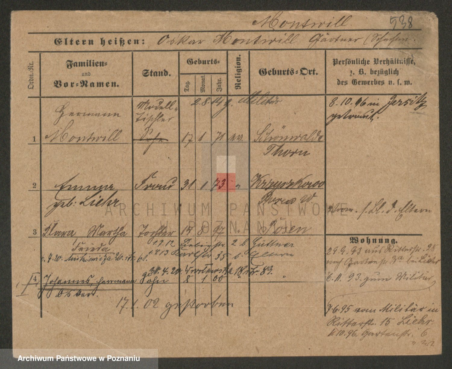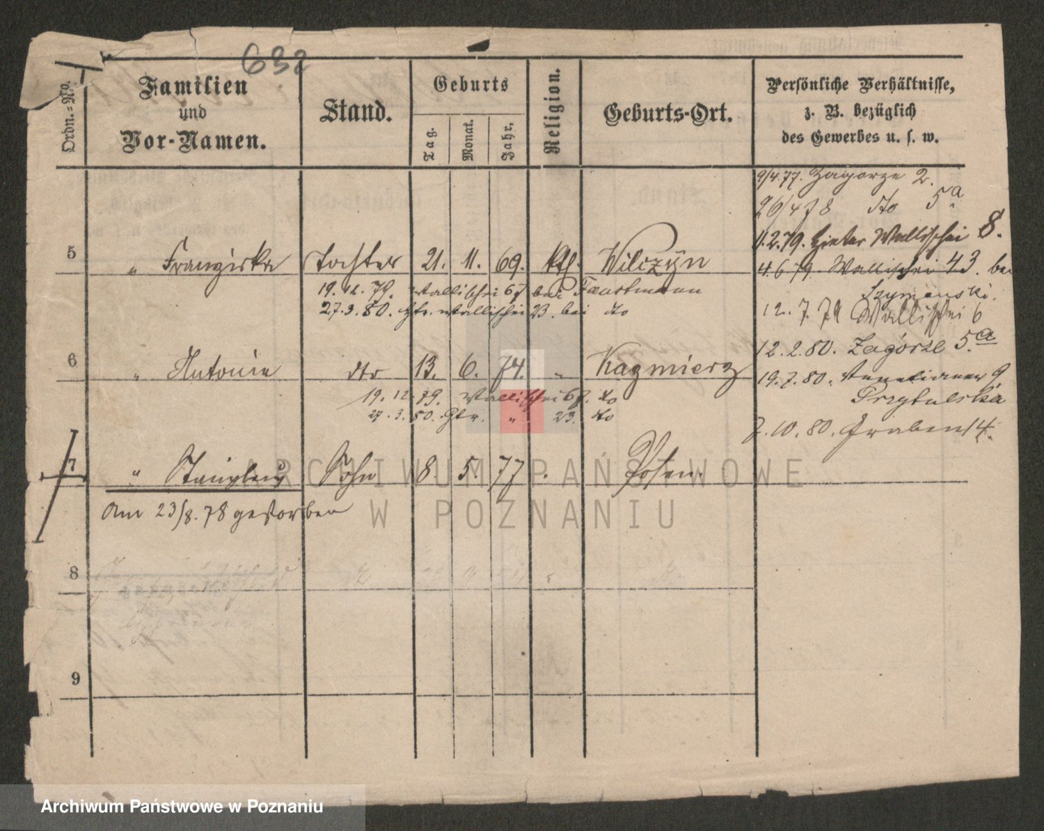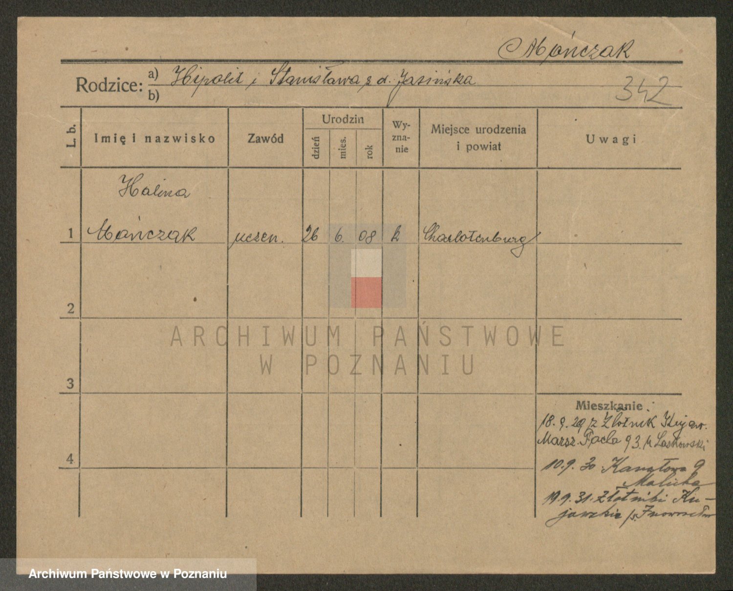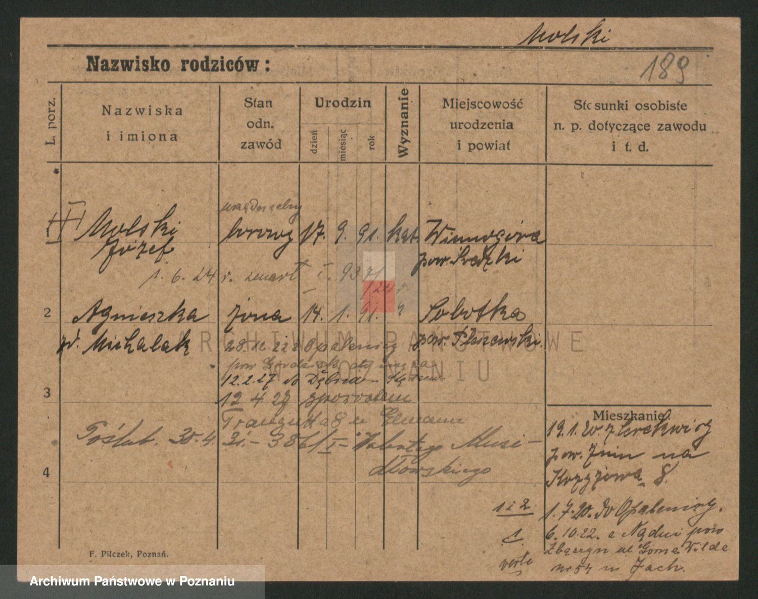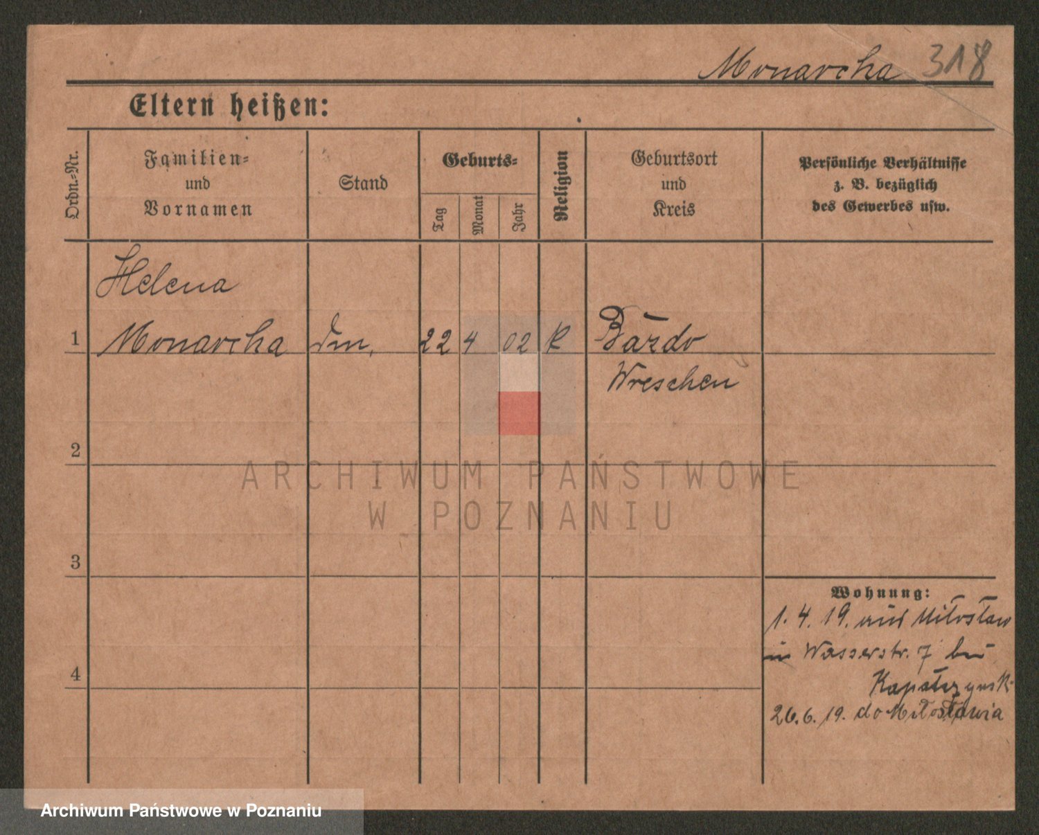 Podgląd karty osobowej dostępny jest po kliknięciu na nazwisko lub ikonkę karty. Można dokonywać powiększenia (ikony na górze) lub przechodzić między kolejnymi skanami (strzałki po bokach).