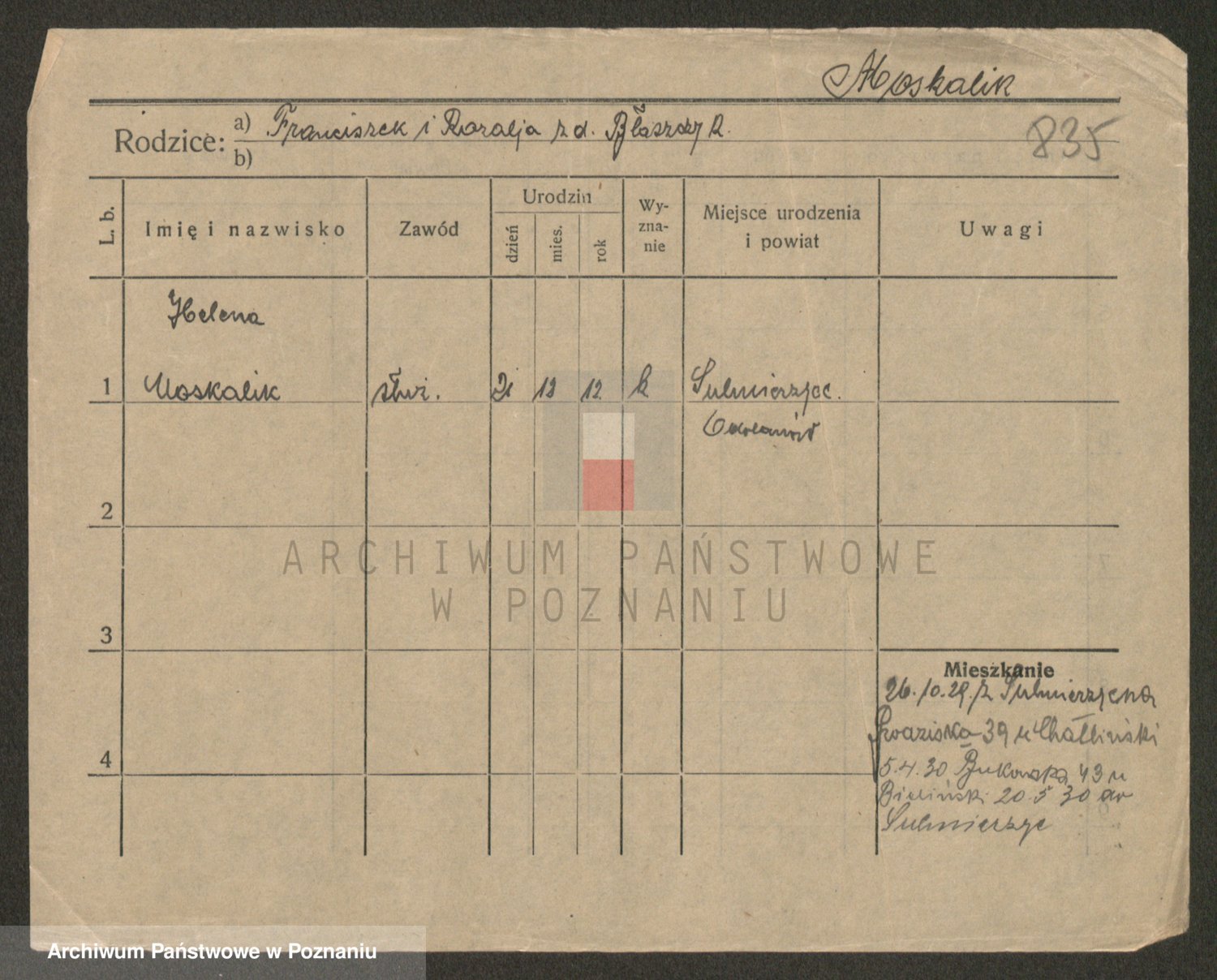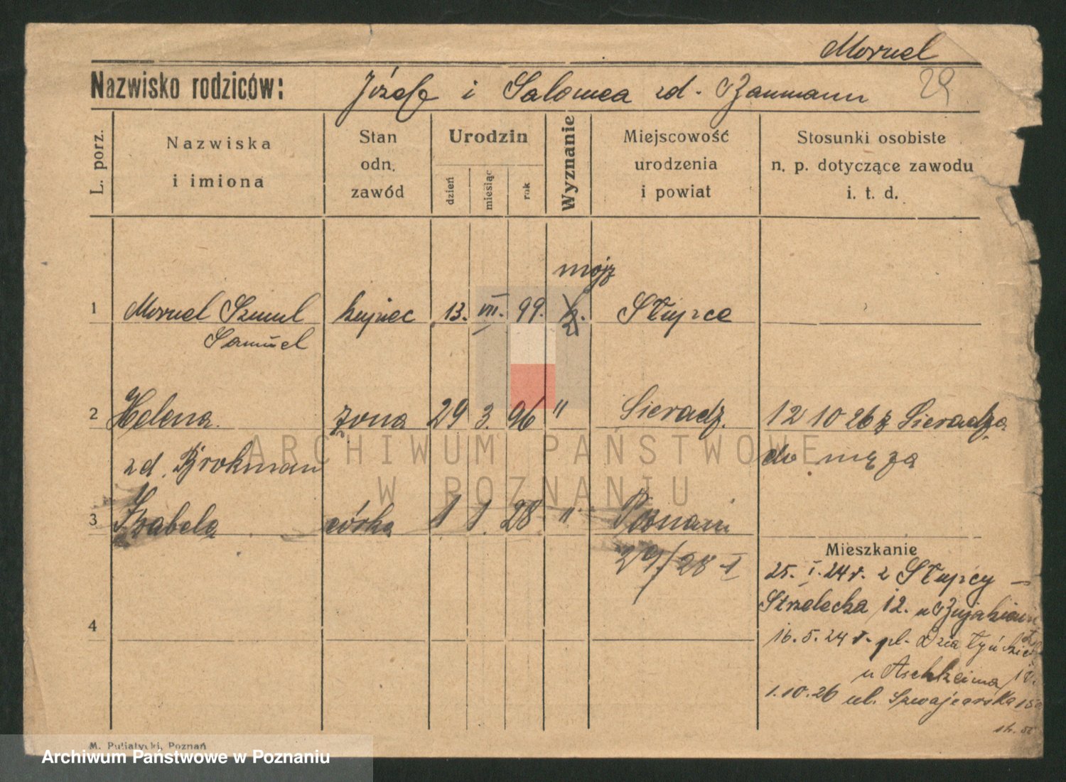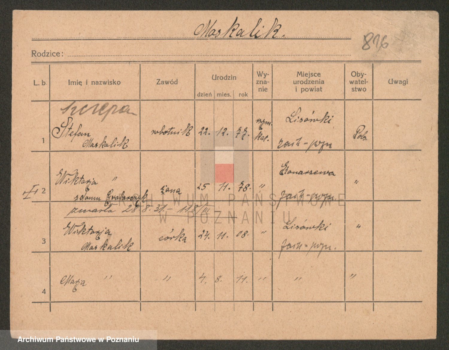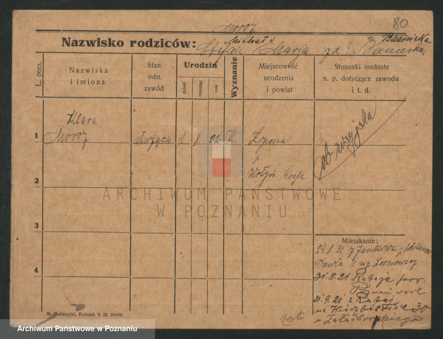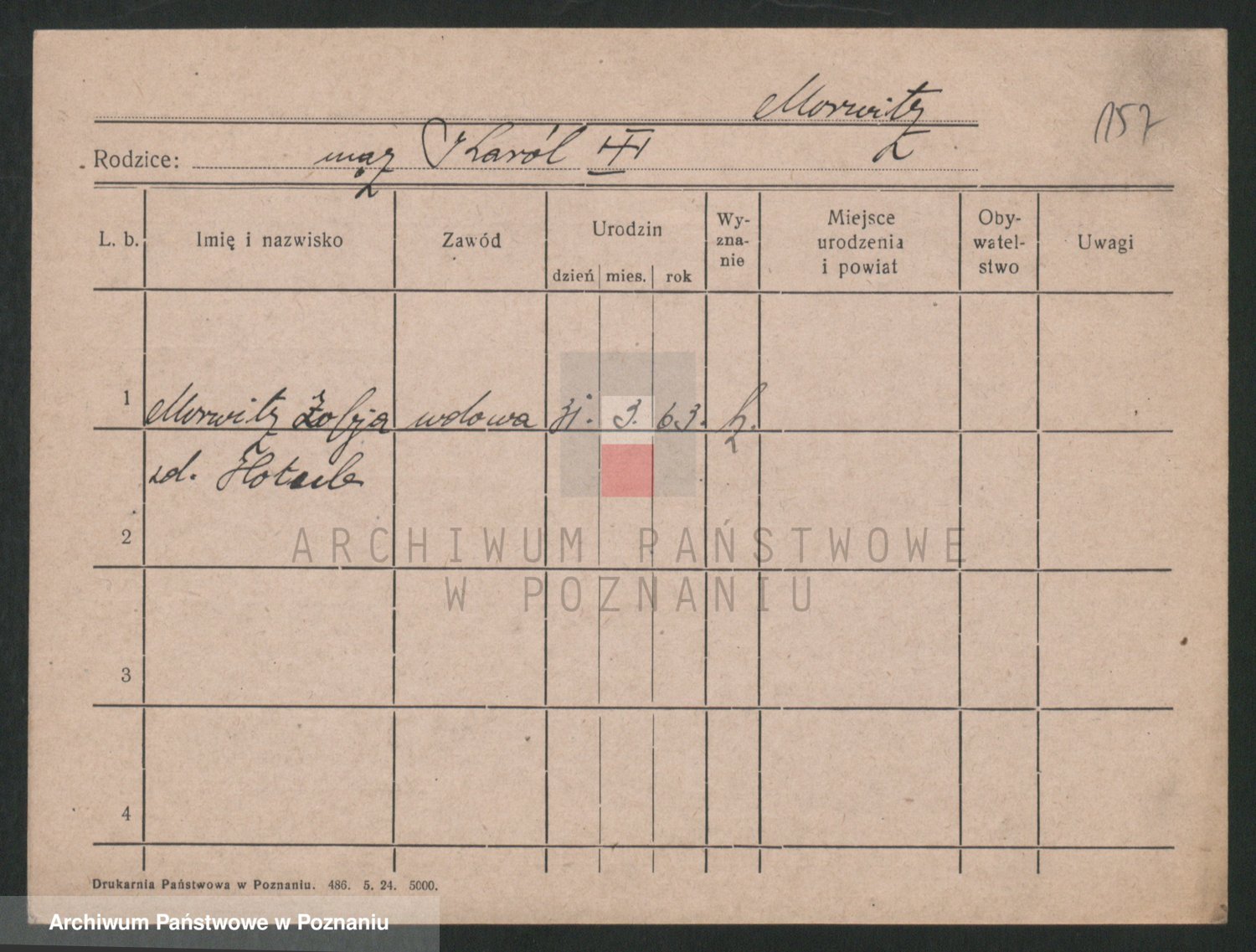 Podgląd karty osobowej dostępny jest po kliknięciu na nazwisko lub ikonkę karty. Można dokonywać powiększenia (ikony na górze) lub przechodzić między kolejnymi skanami (strzałki po bokach).