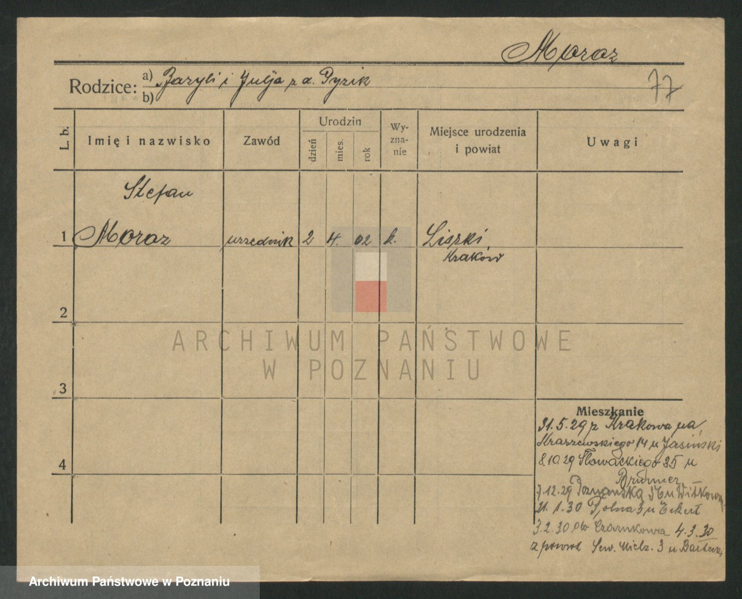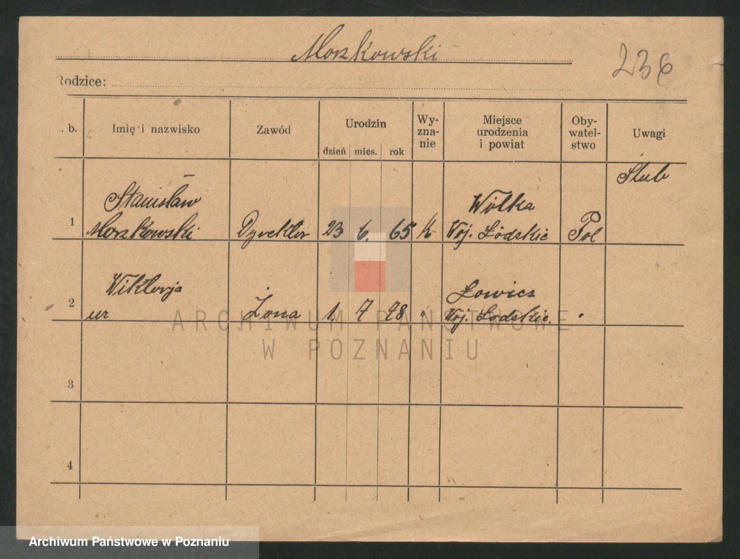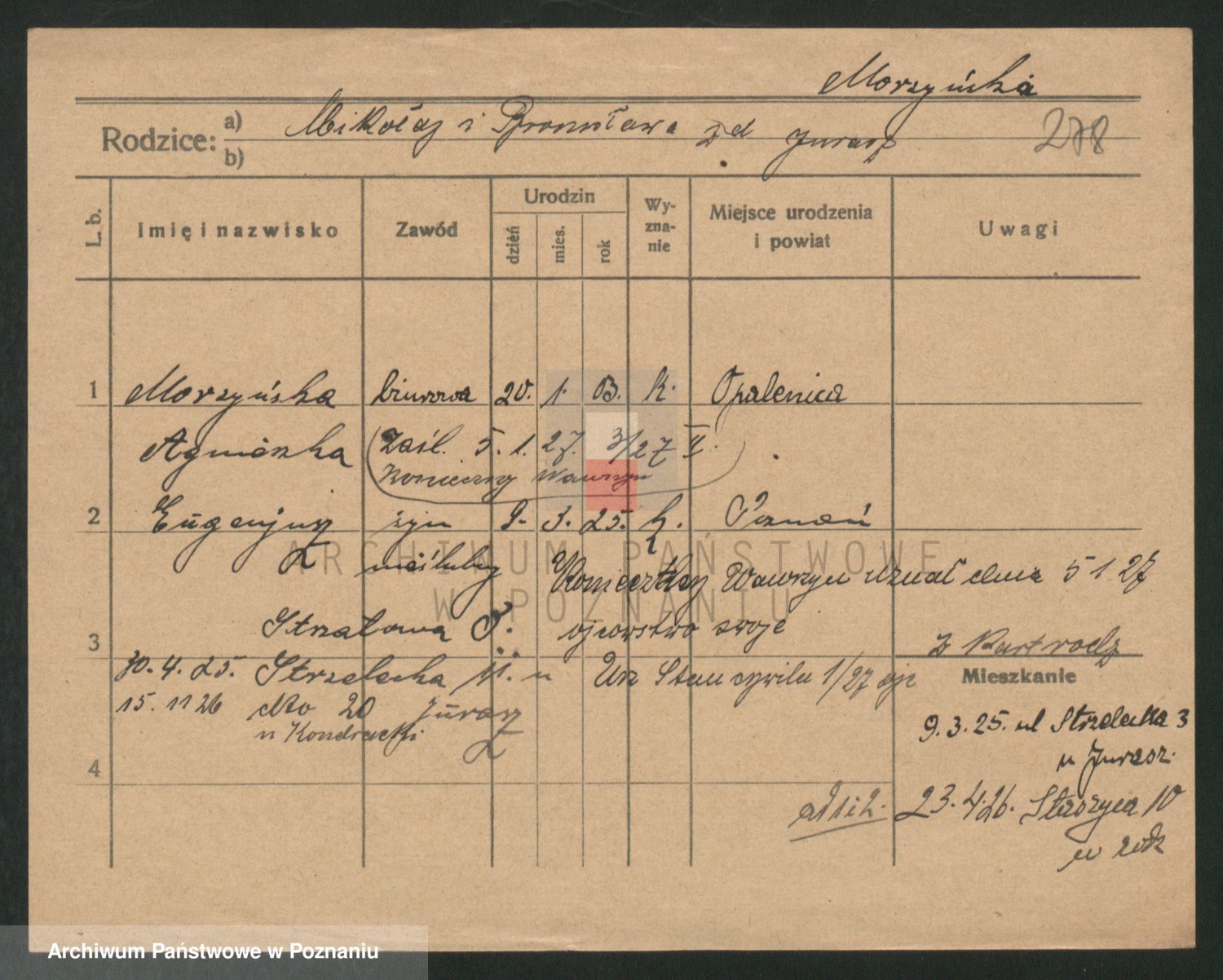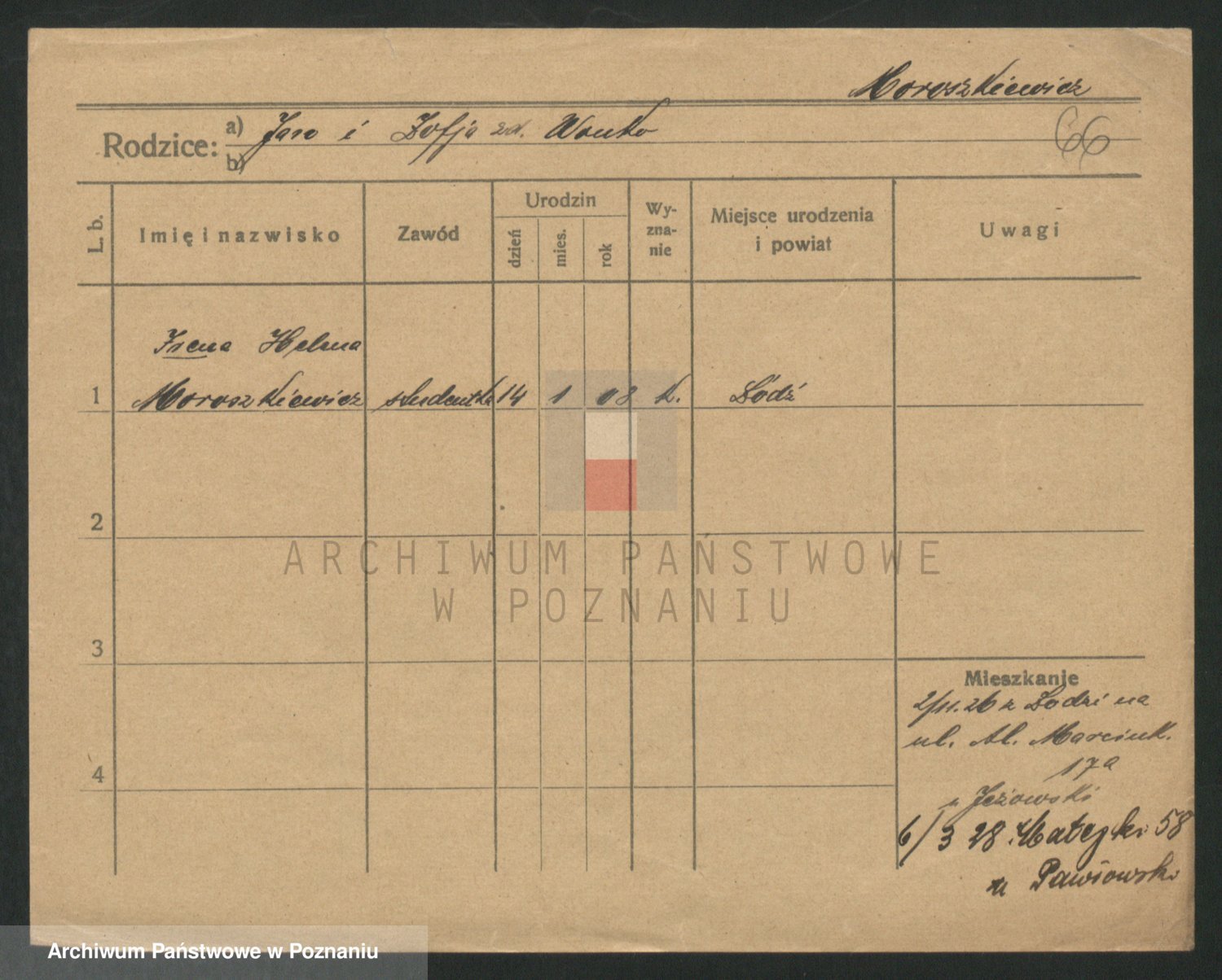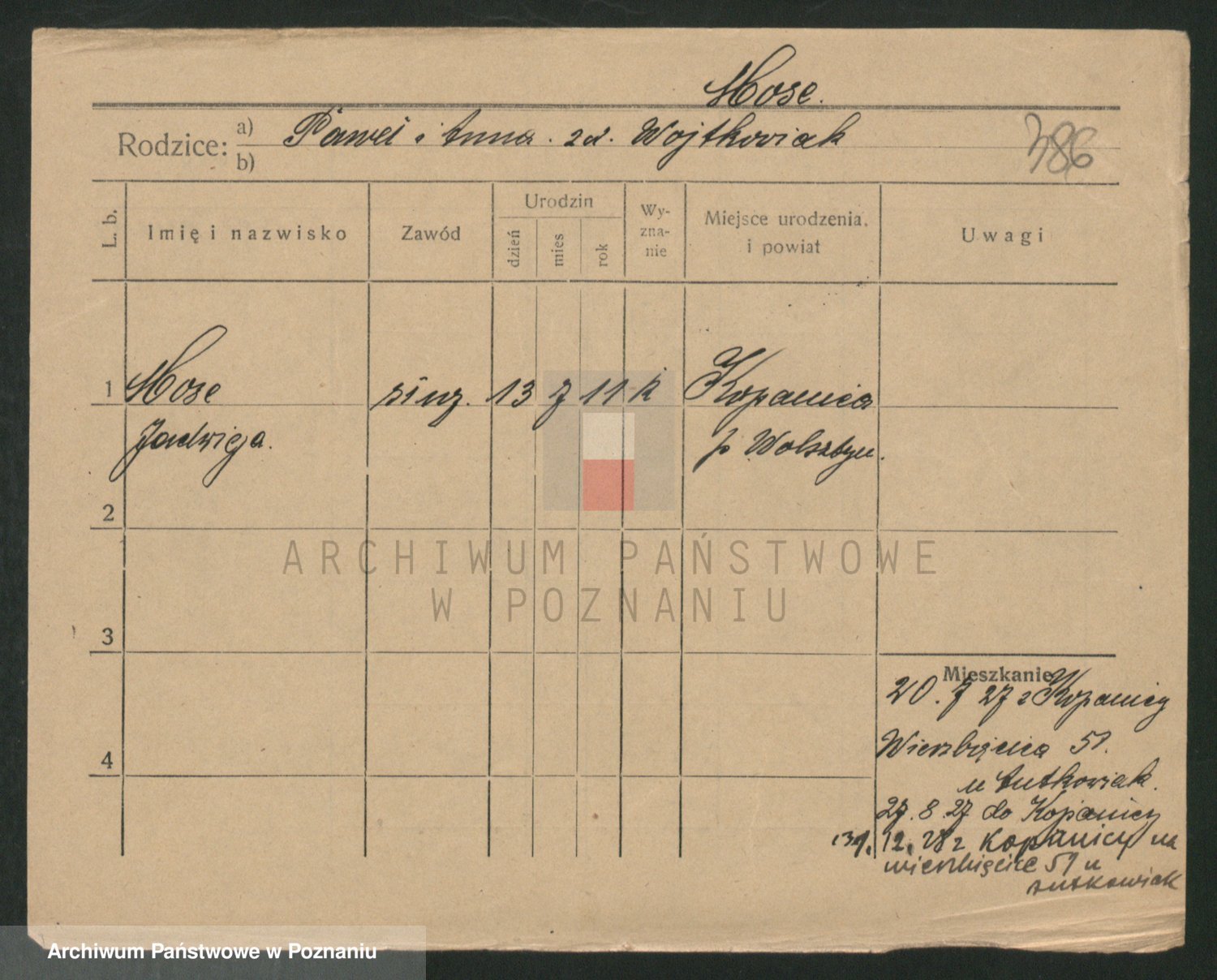 Podgląd karty osobowej dostępny jest po kliknięciu na nazwisko lub ikonkę karty. Można dokonywać powiększenia (ikony na górze) lub przechodzić między kolejnymi skanami (strzałki po bokach).