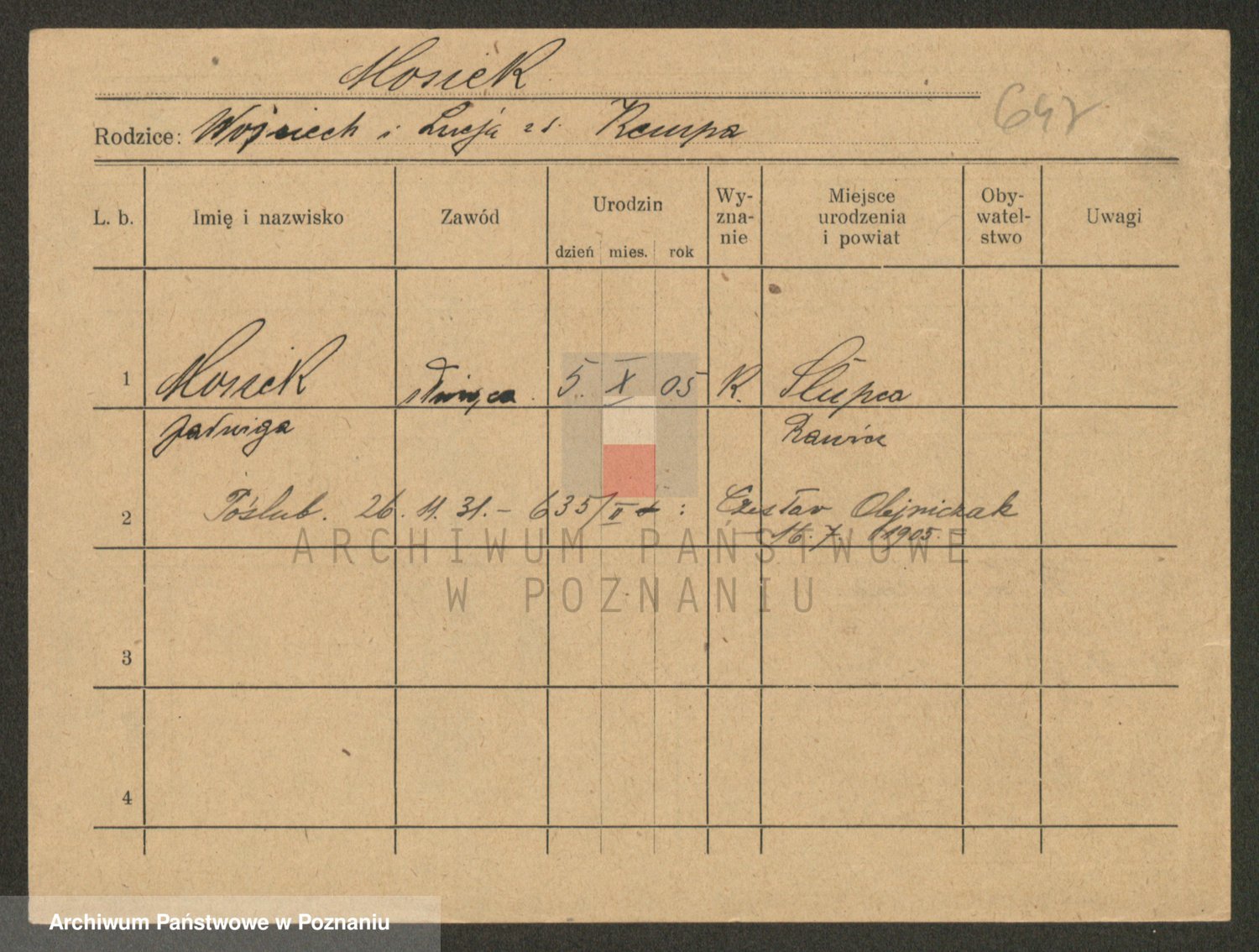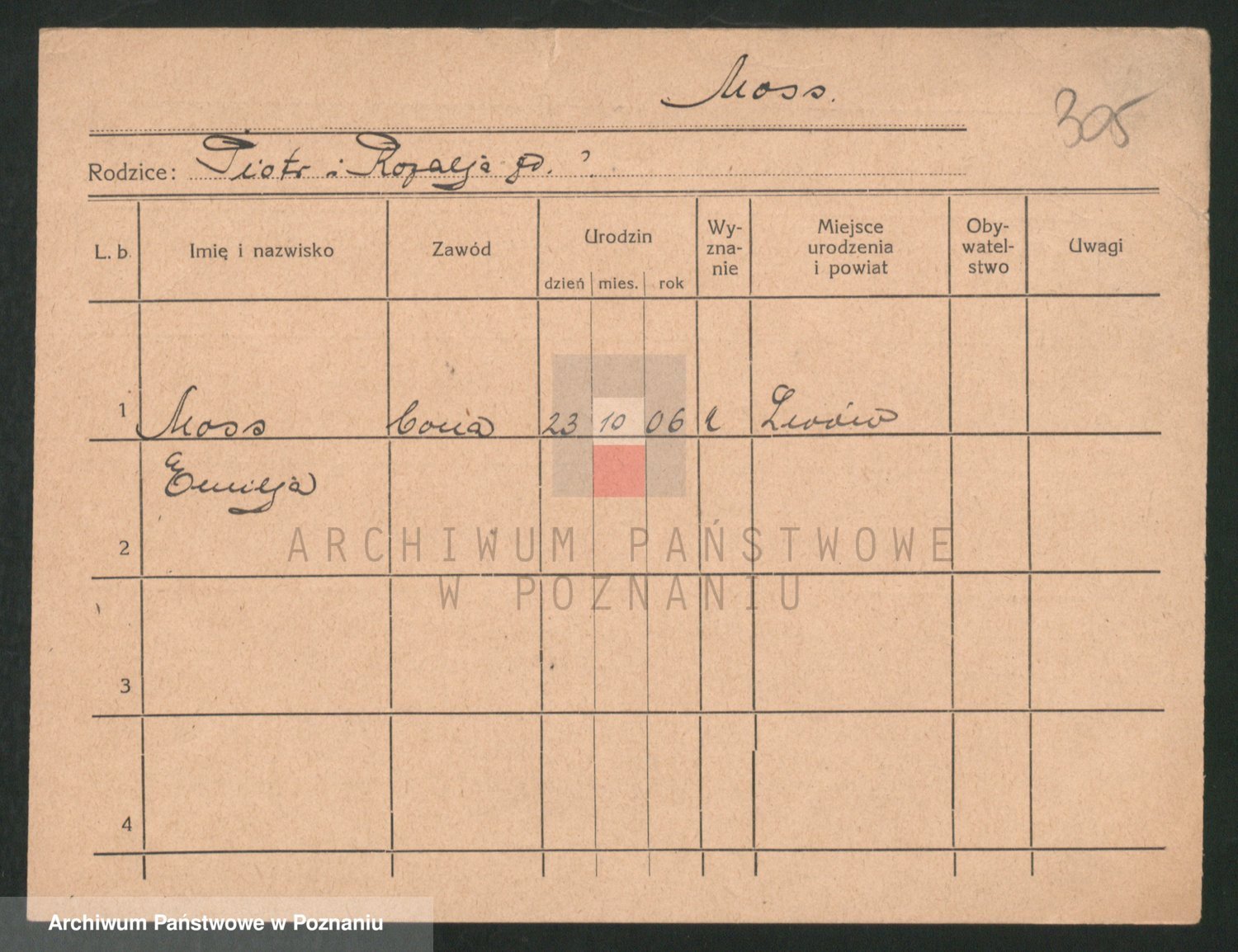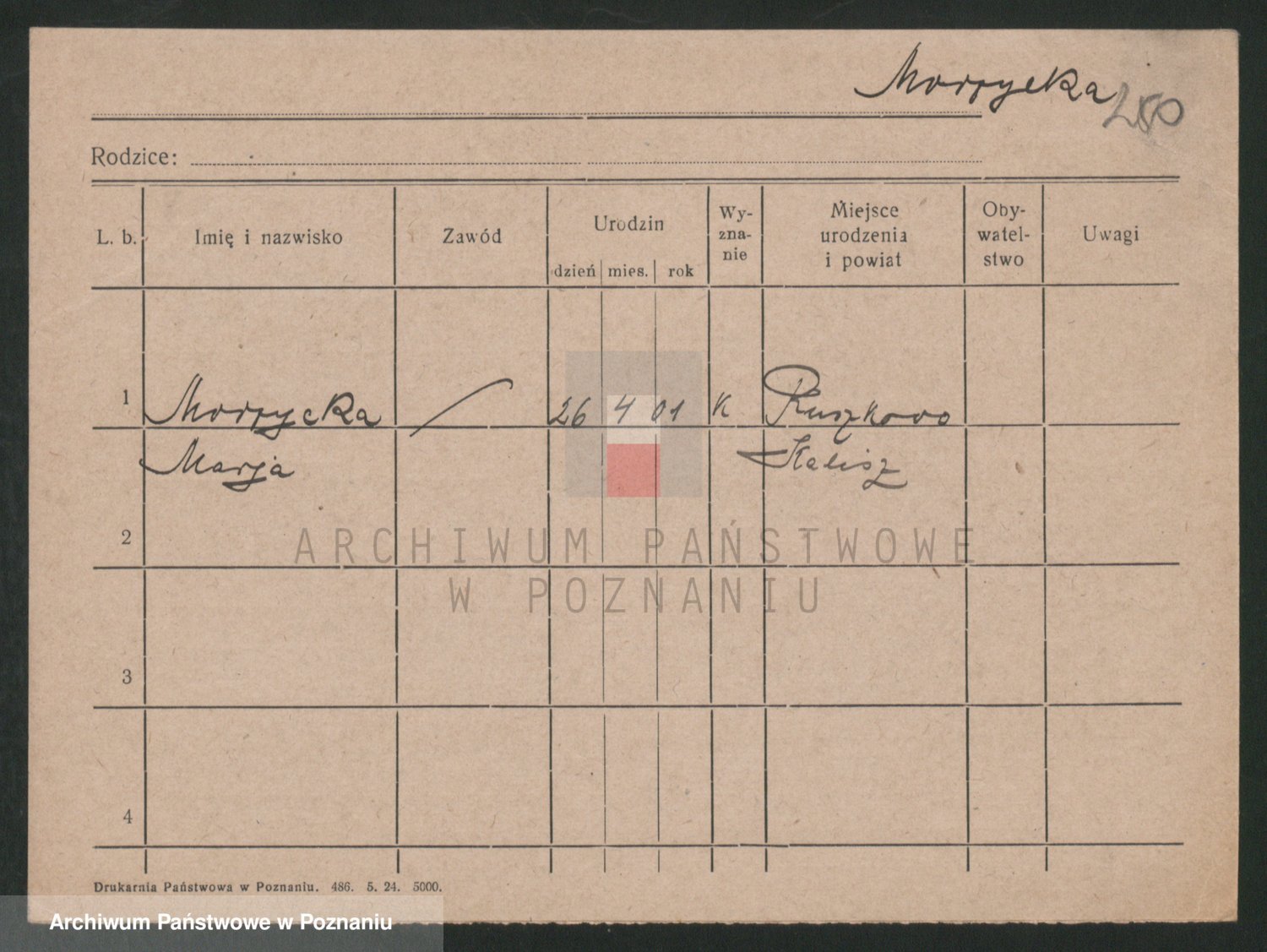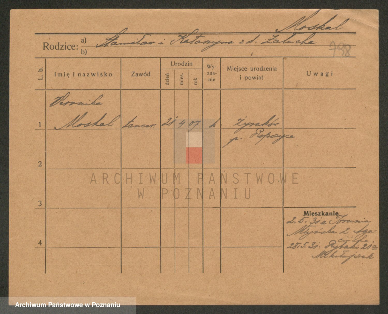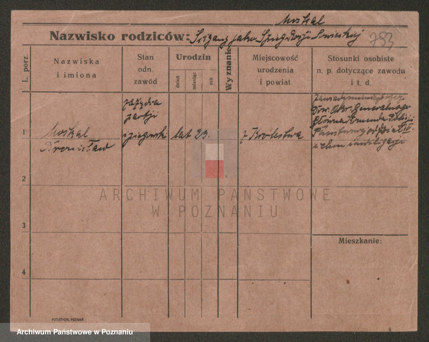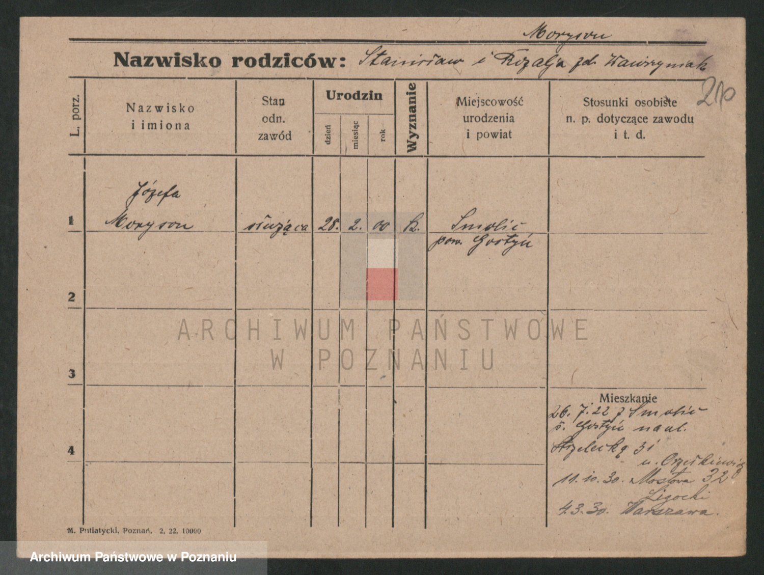 Podgląd karty osobowej dostępny jest po kliknięciu na nazwisko lub ikonkę karty. Można dokonywać powiększenia (ikony na górze) lub przechodzić między kolejnymi skanami (strzałki po bokach).