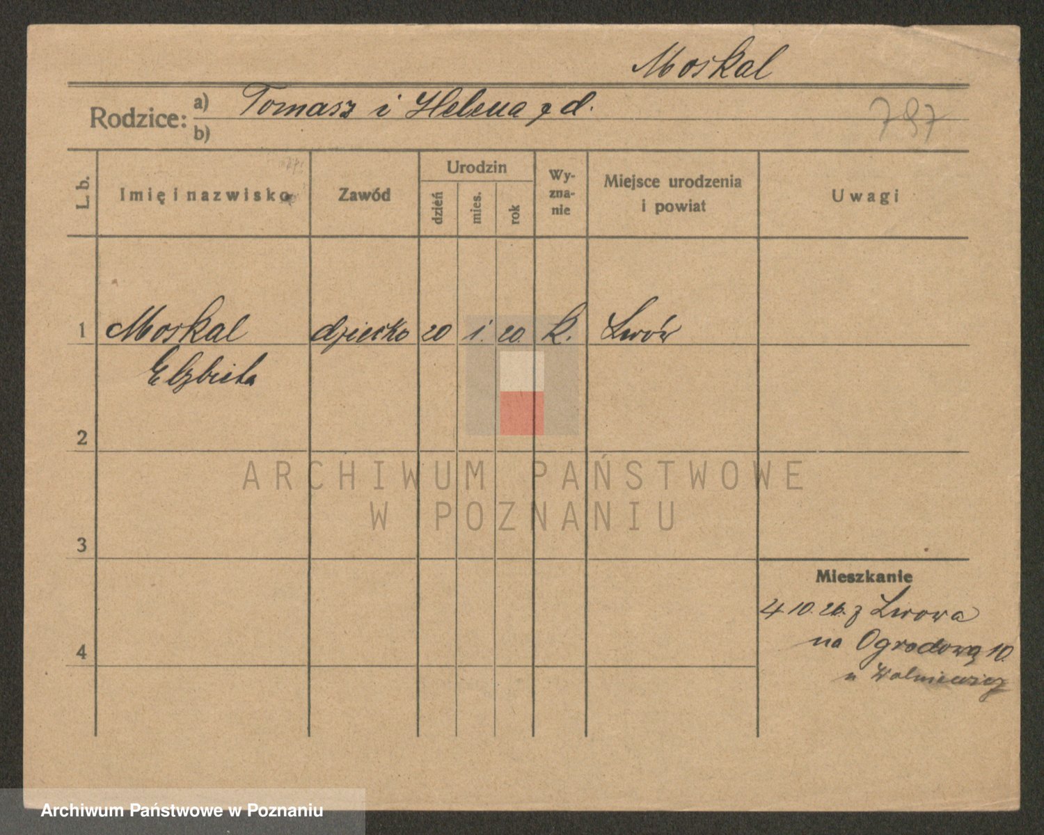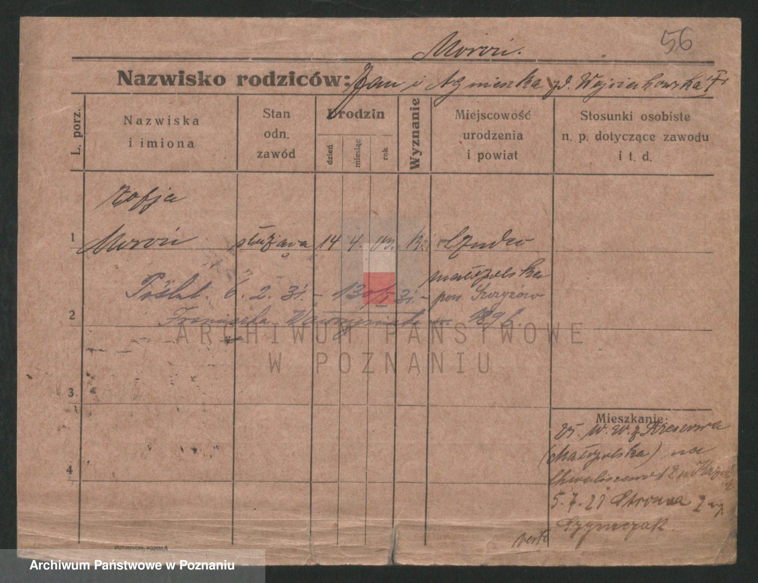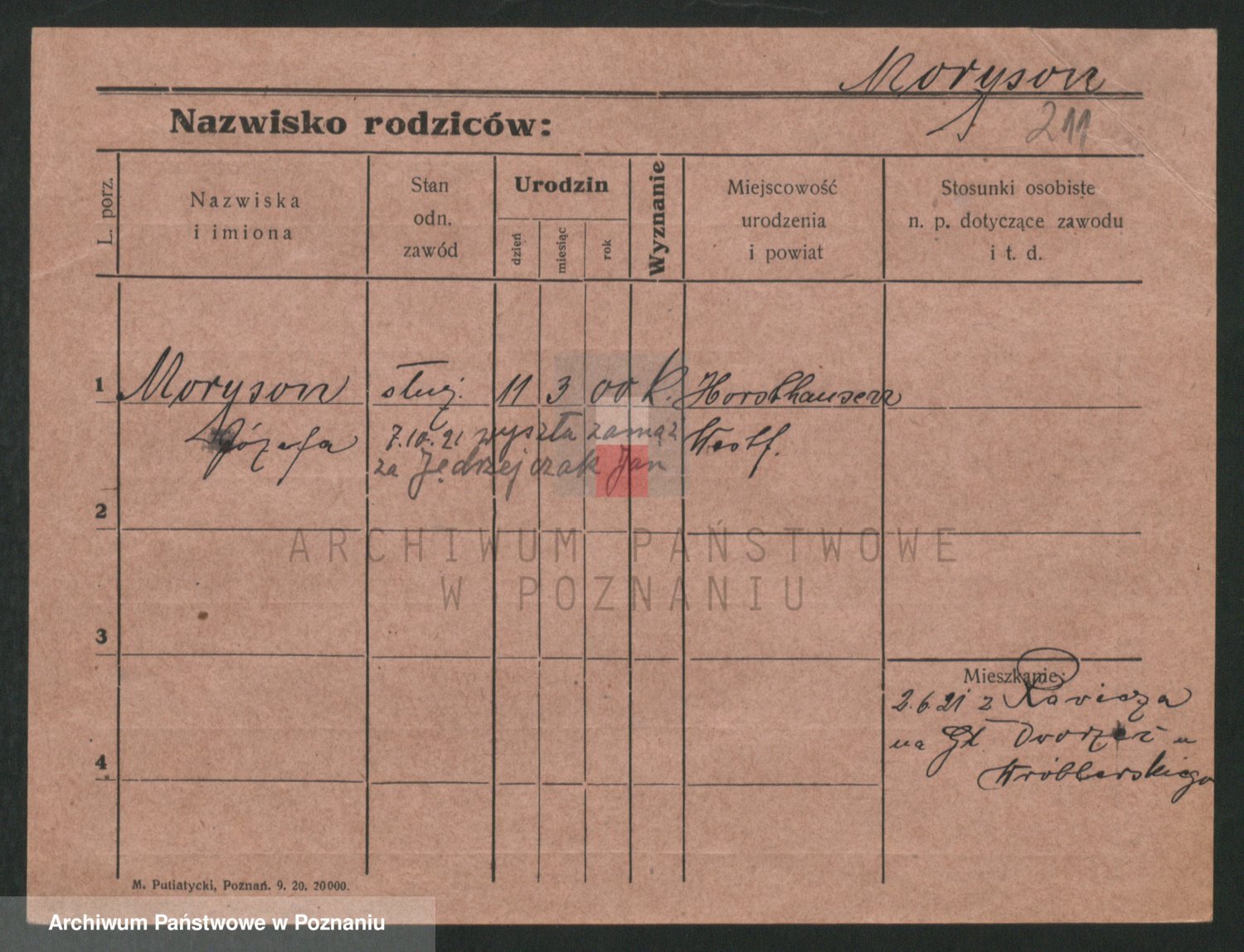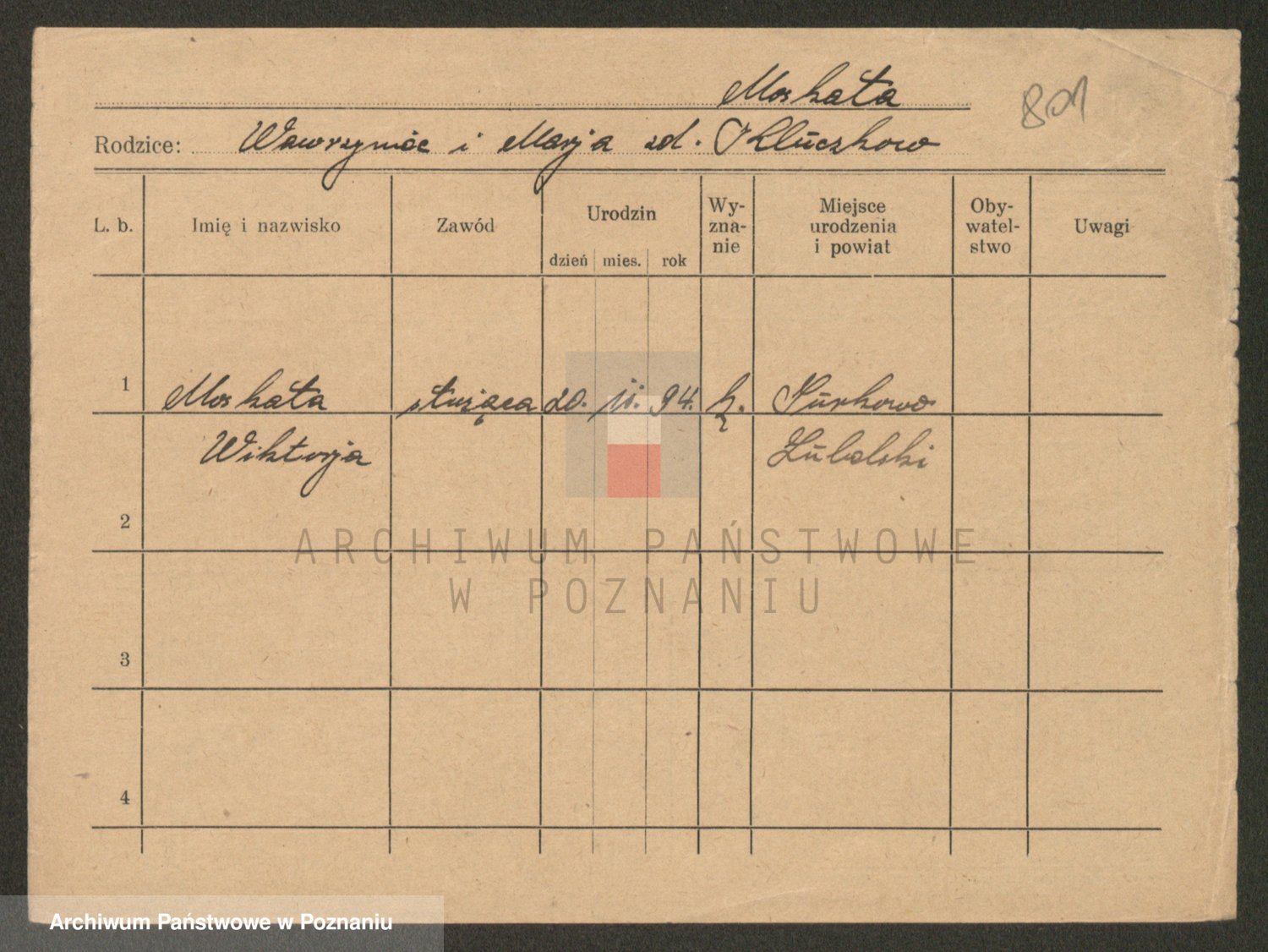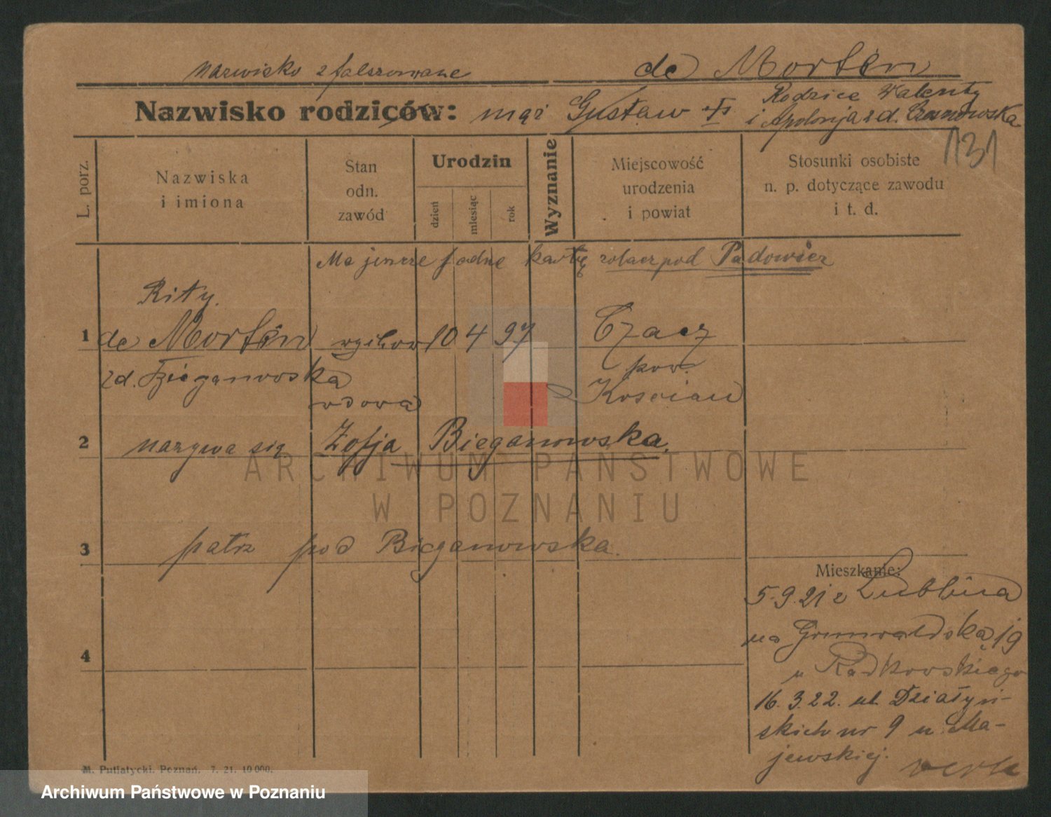 Podgląd karty osobowej dostępny jest po kliknięciu na nazwisko lub ikonkę karty. Można dokonywać powiększenia (ikony na górze) lub przechodzić między kolejnymi skanami (strzałki po bokach).