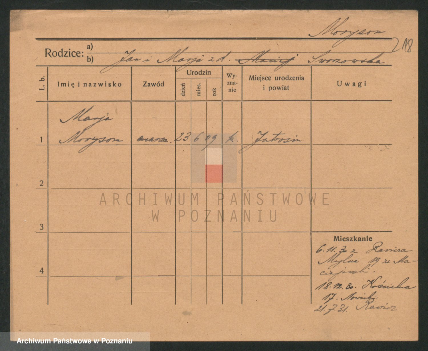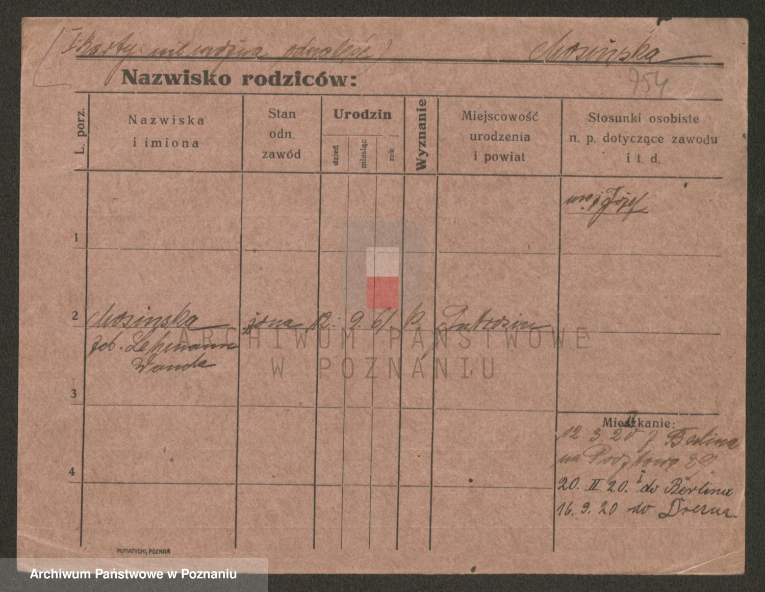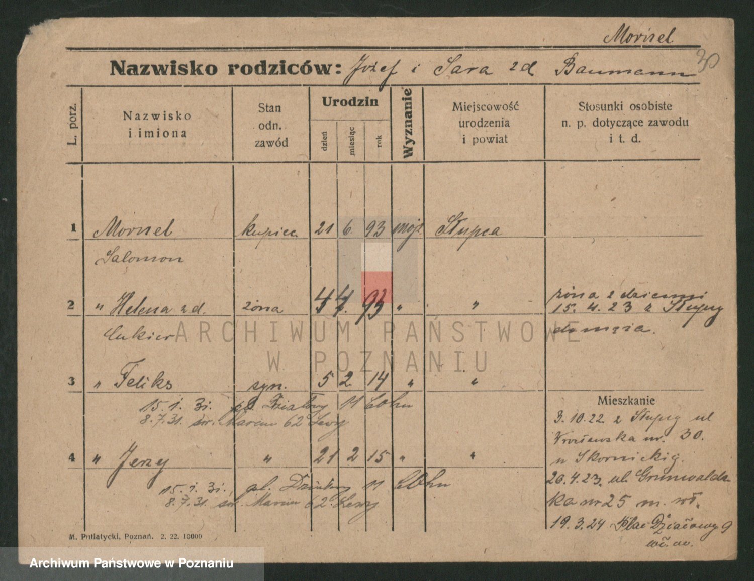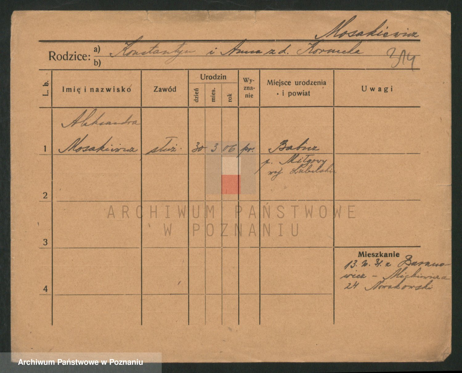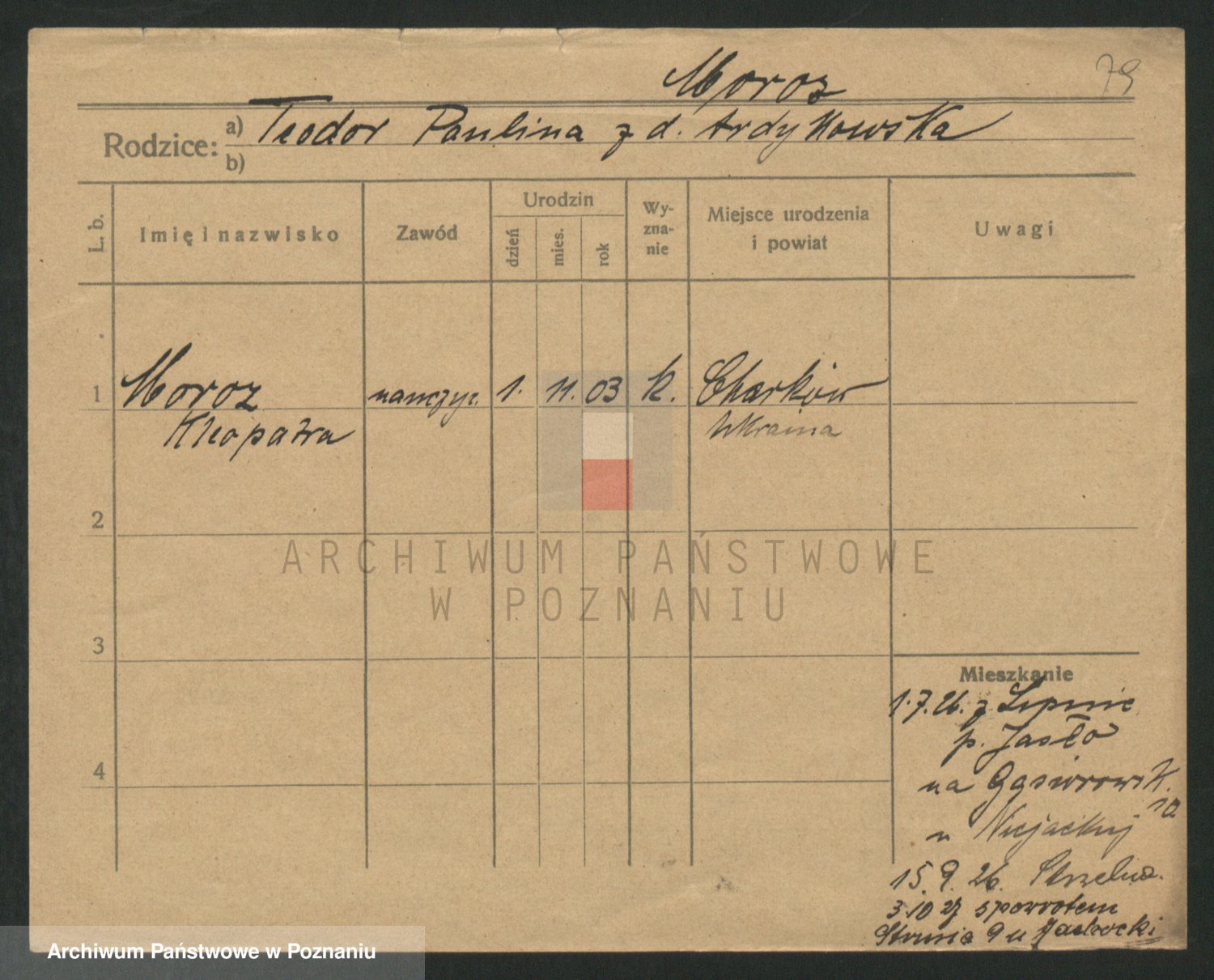 Podgląd karty osobowej dostępny jest po kliknięciu na nazwisko lub ikonkę karty. Można dokonywać powiększenia (ikony na górze) lub przechodzić między kolejnymi skanami (strzałki po bokach).