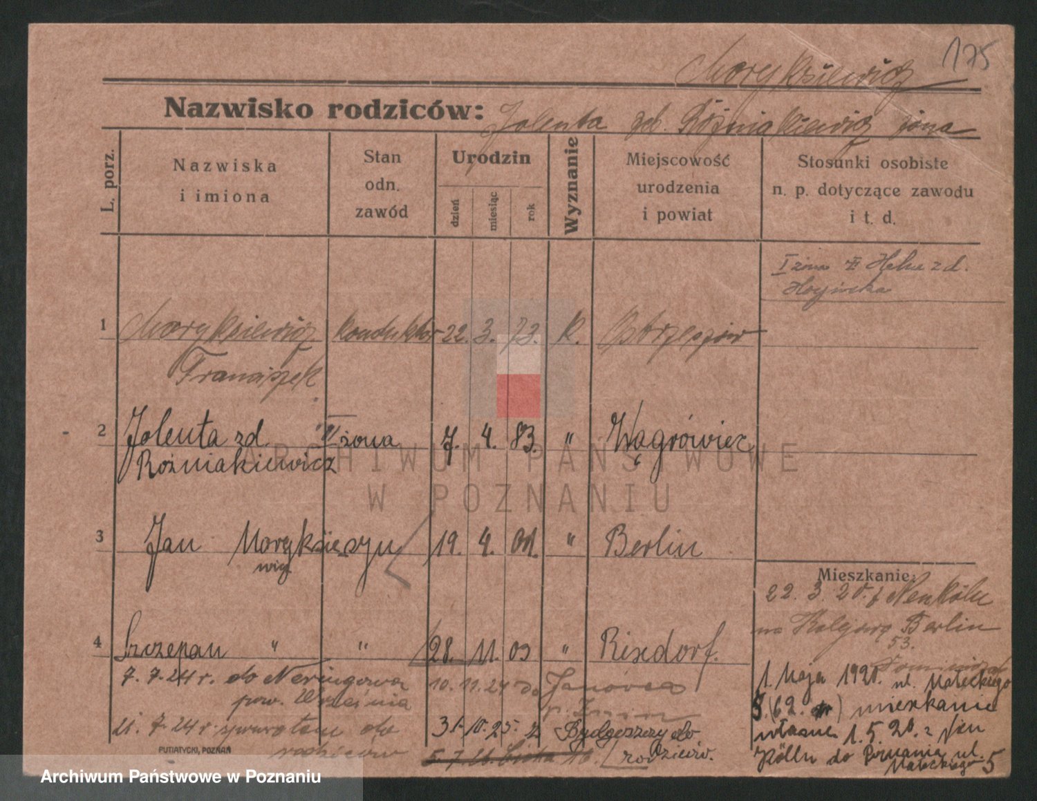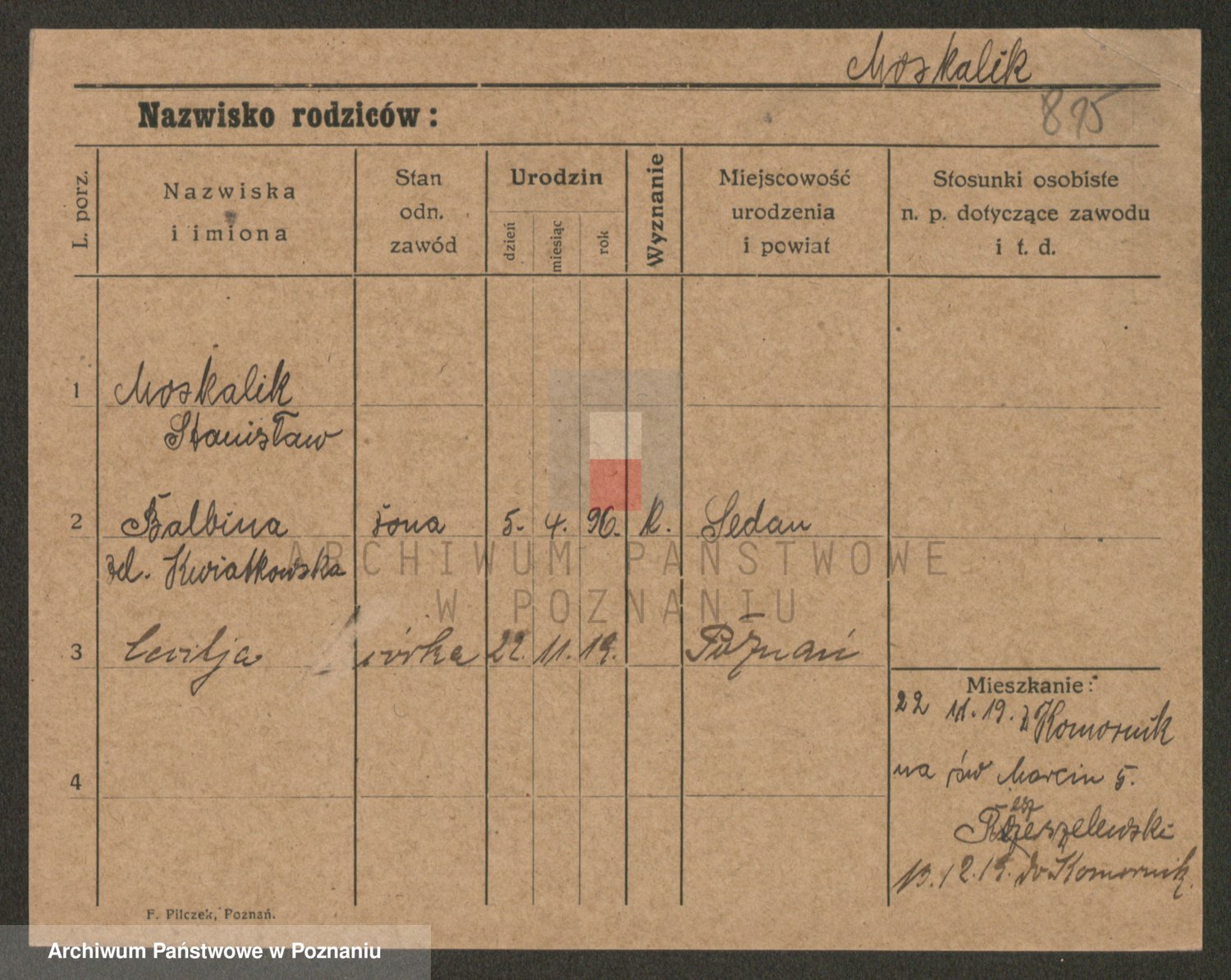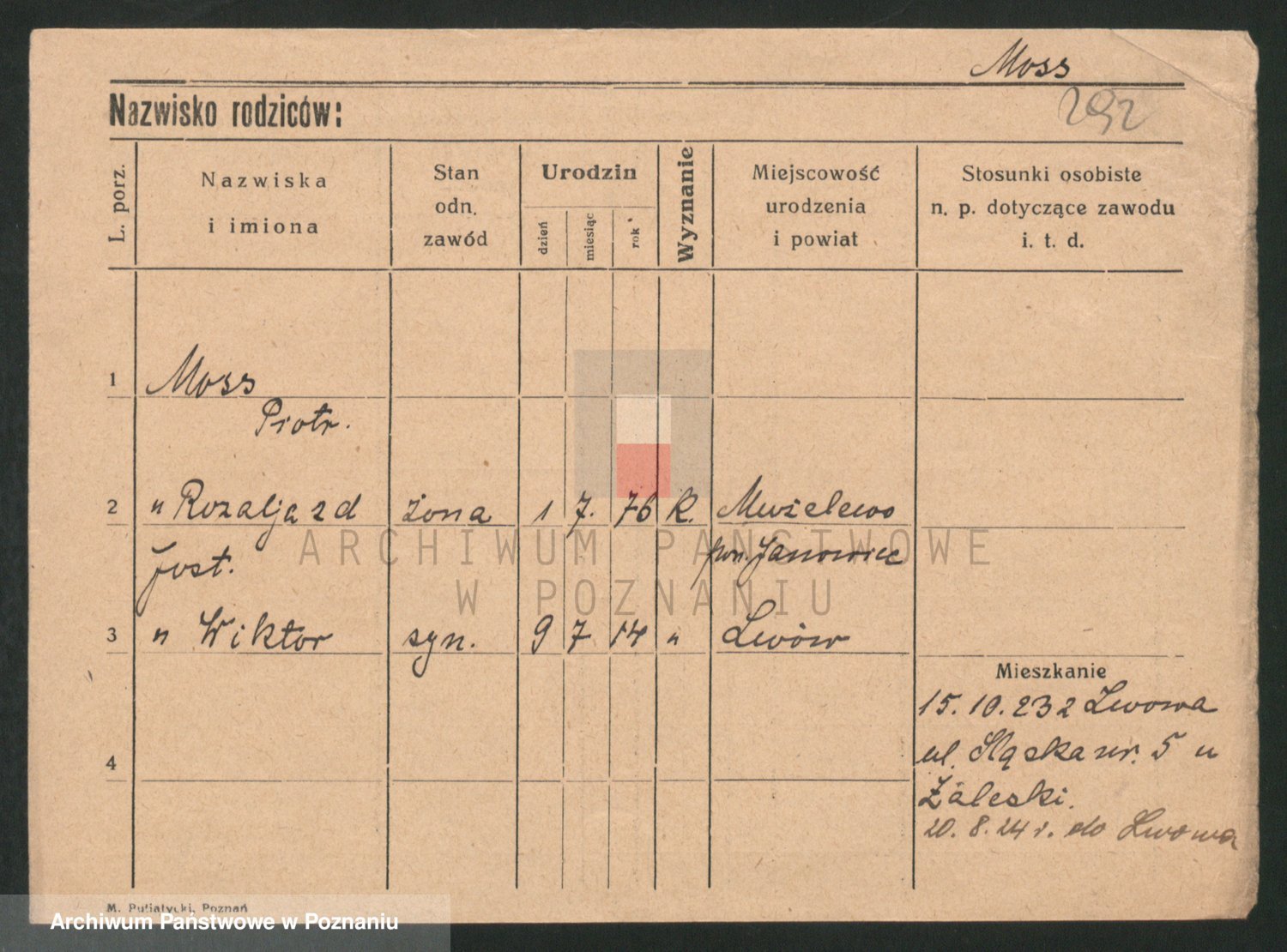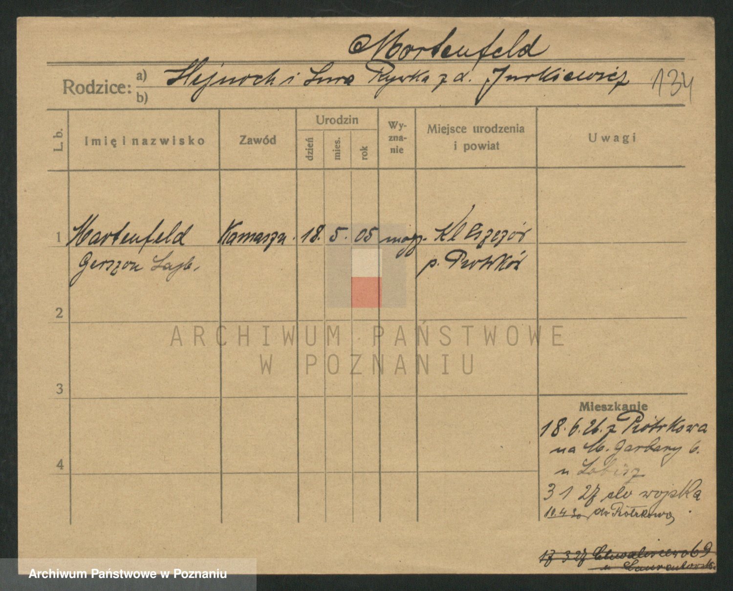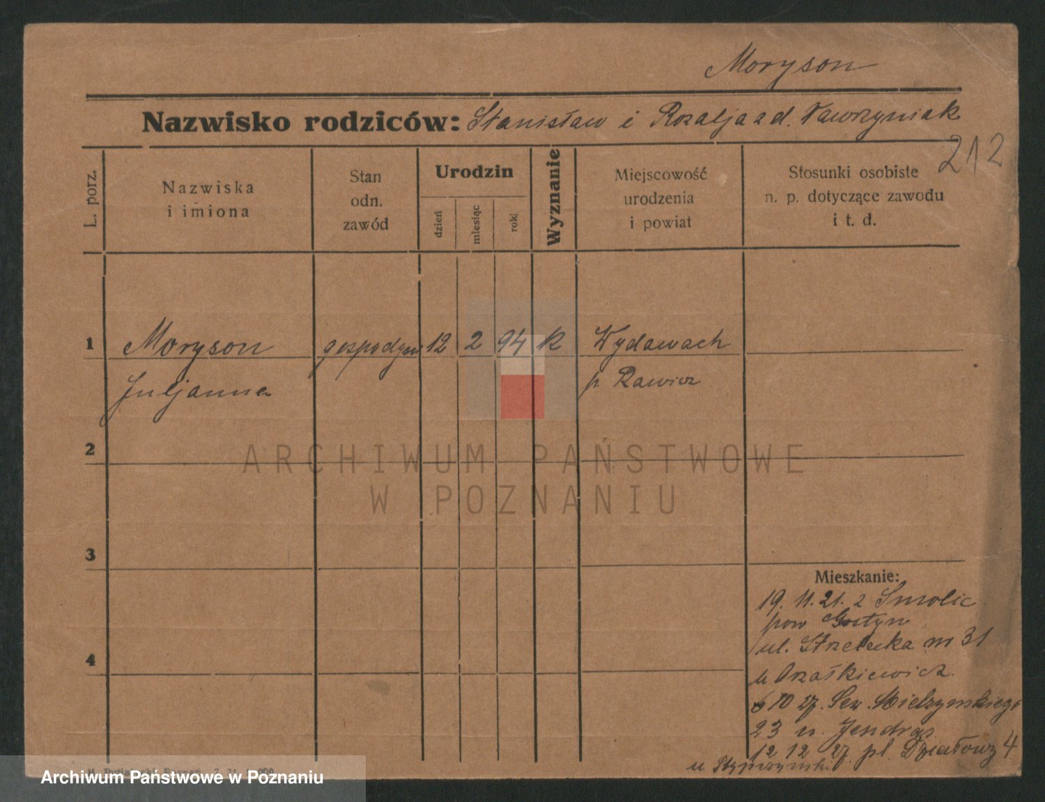 Podgląd karty osobowej dostępny jest po kliknięciu na nazwisko lub ikonkę karty. Można dokonywać powiększenia (ikony na górze) lub przechodzić między kolejnymi skanami (strzałki po bokach).