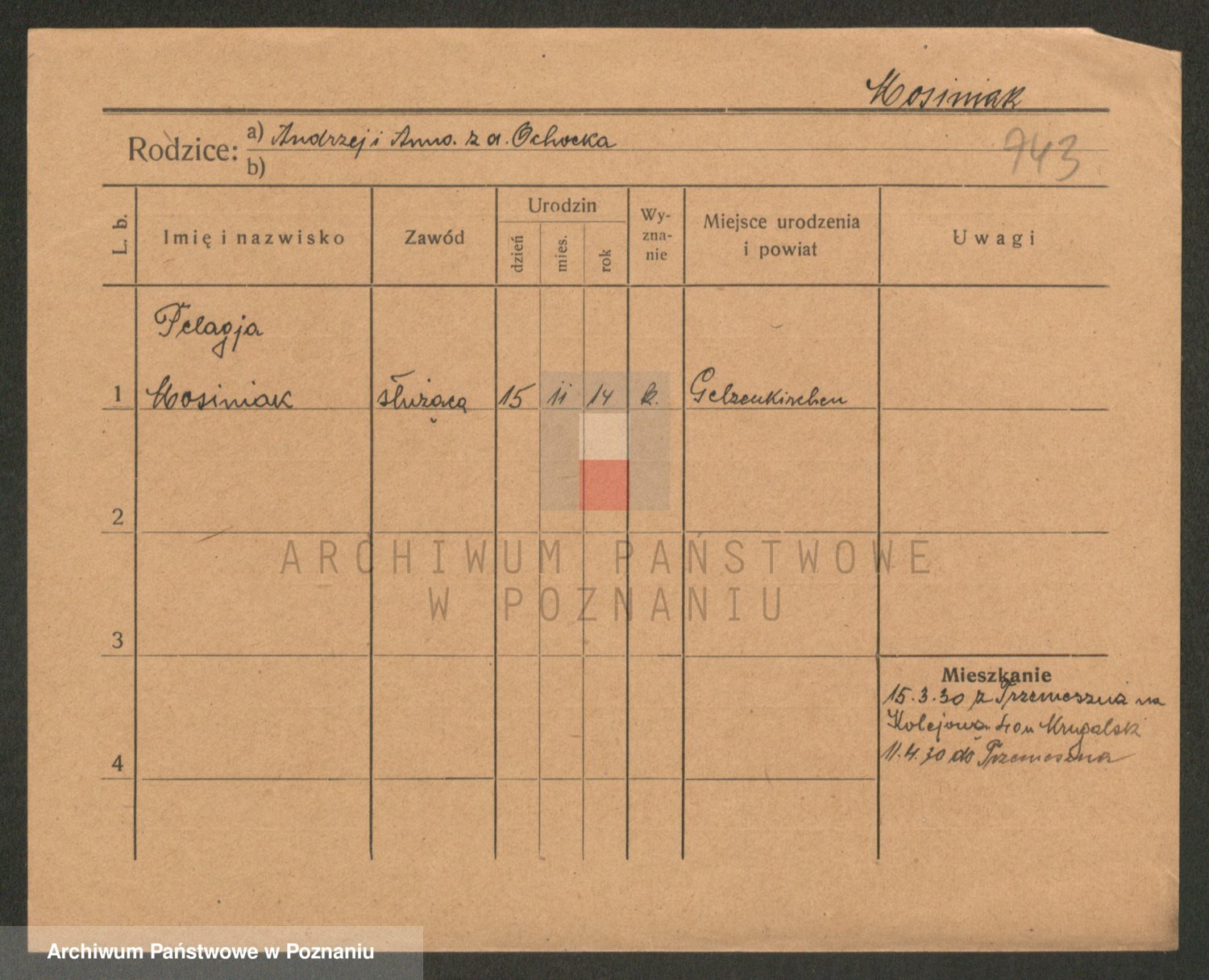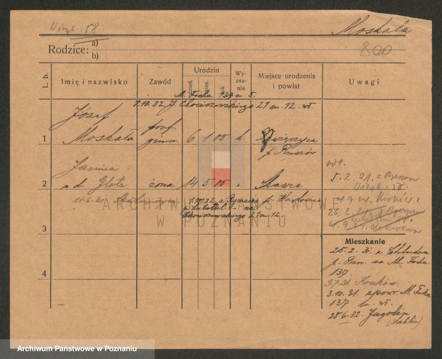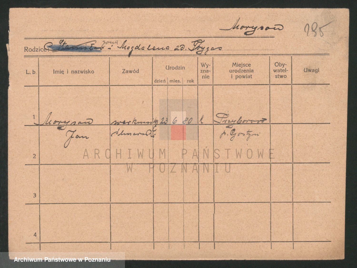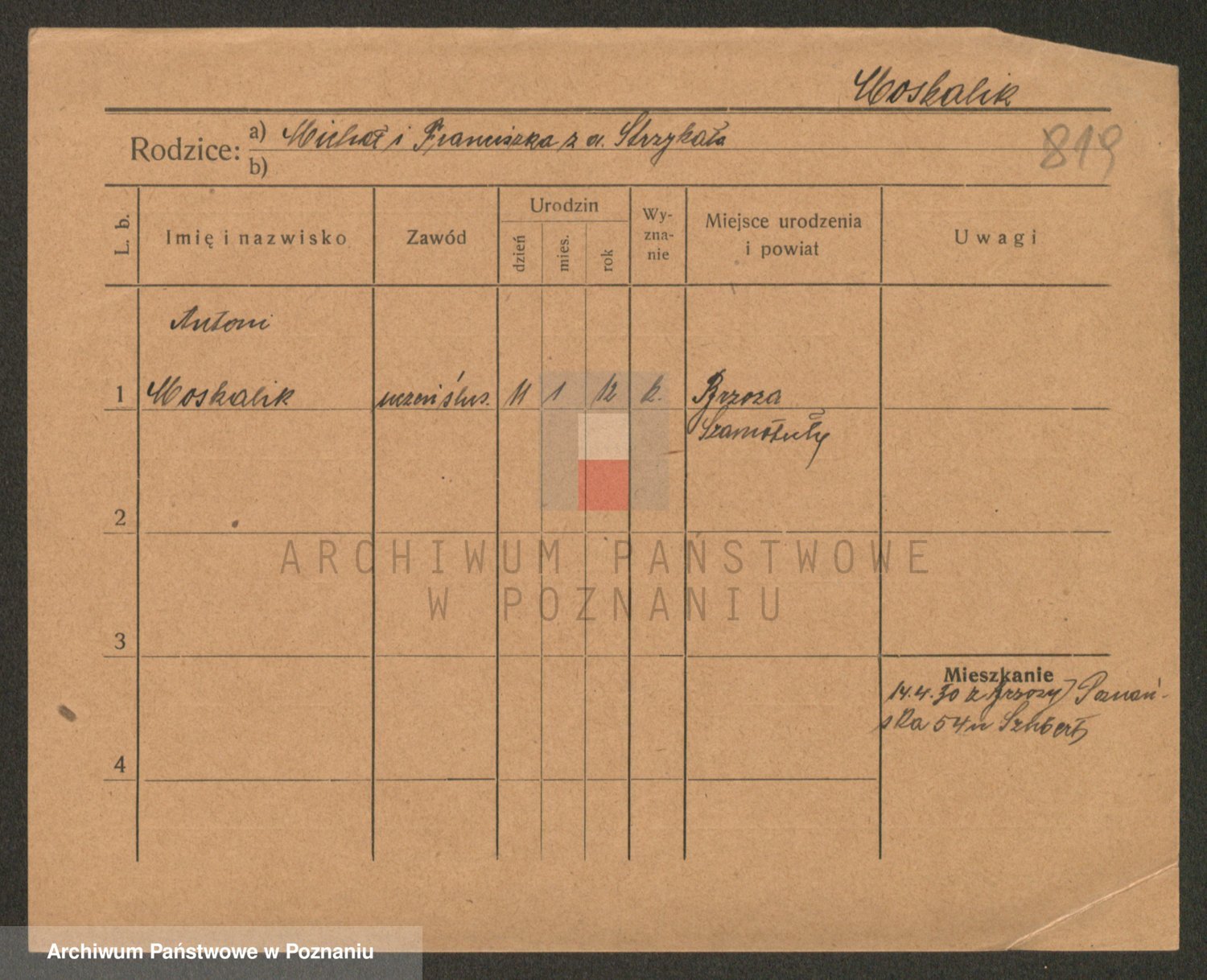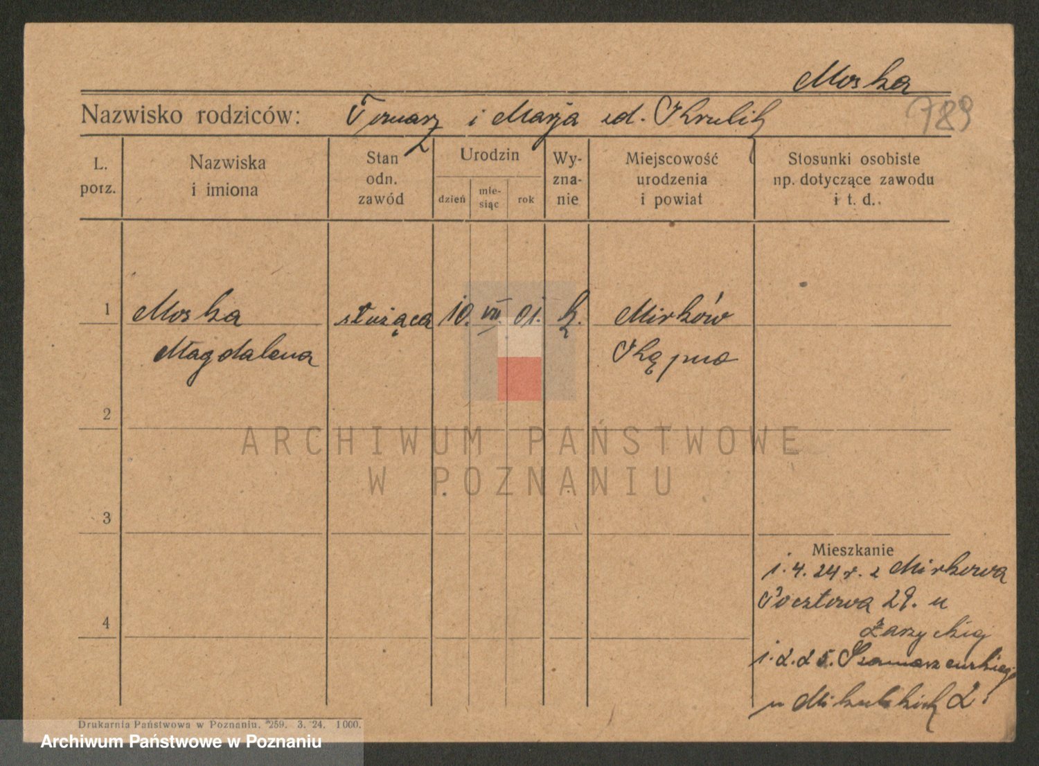 Podgląd karty osobowej dostępny jest po kliknięciu na nazwisko lub ikonkę karty. Można dokonywać powiększenia (ikony na górze) lub przechodzić między kolejnymi skanami (strzałki po bokach).