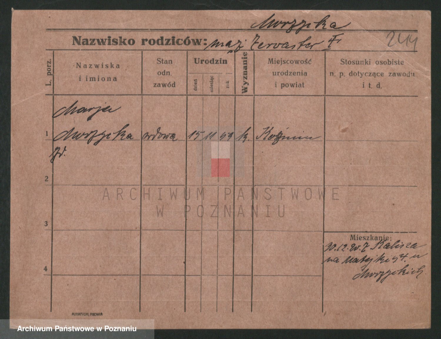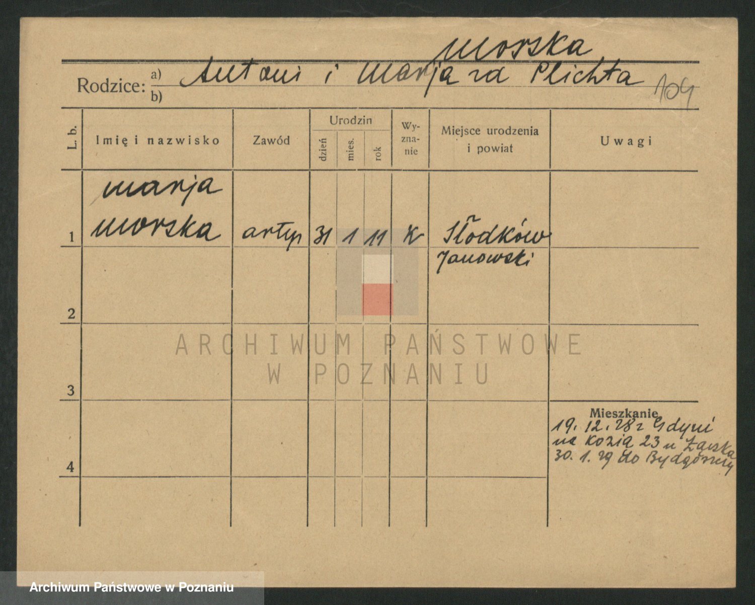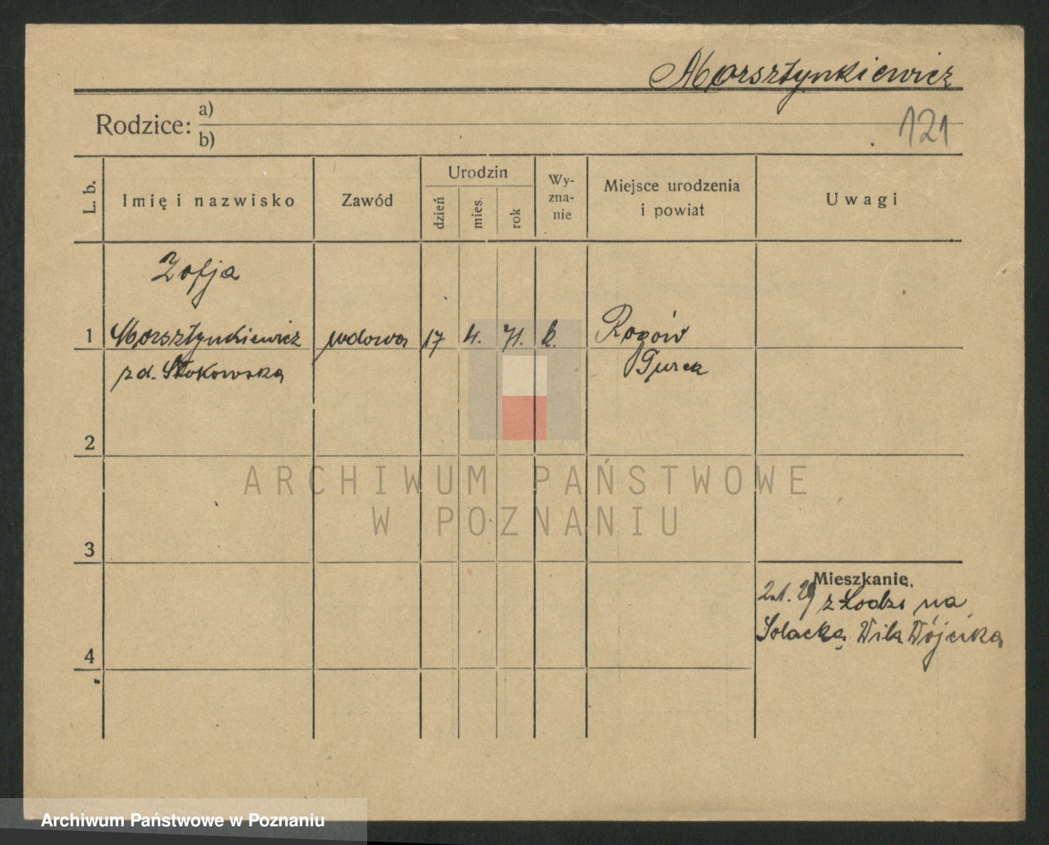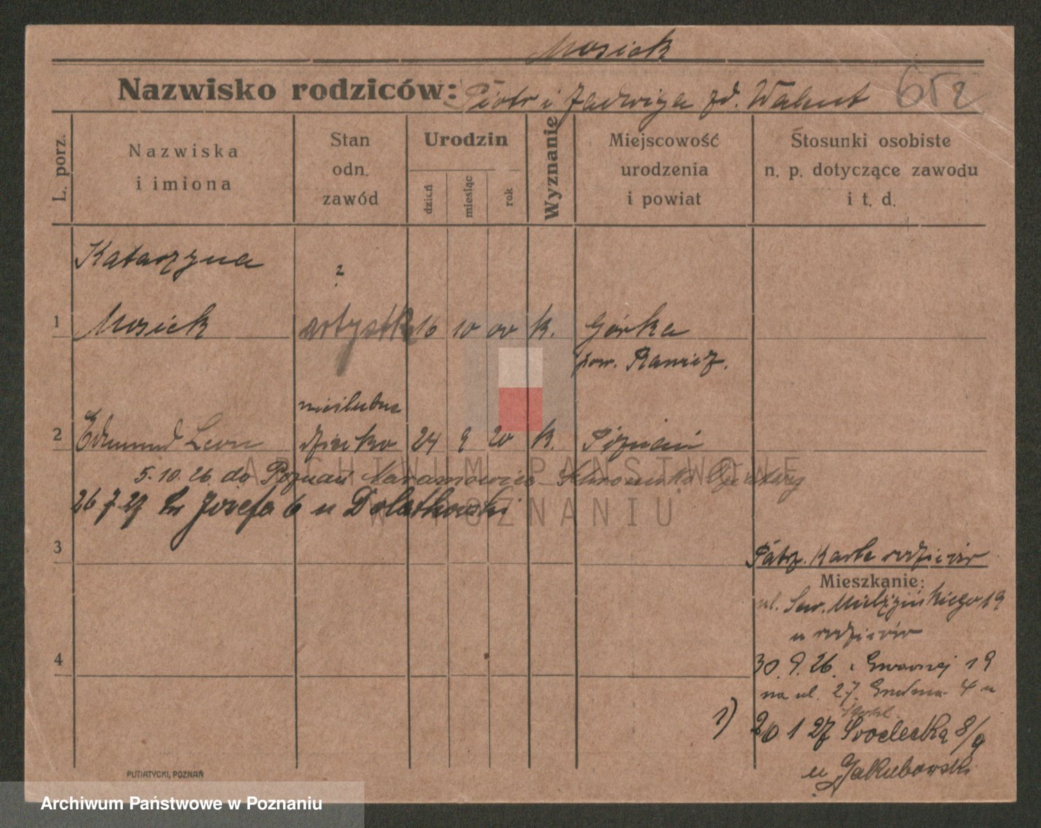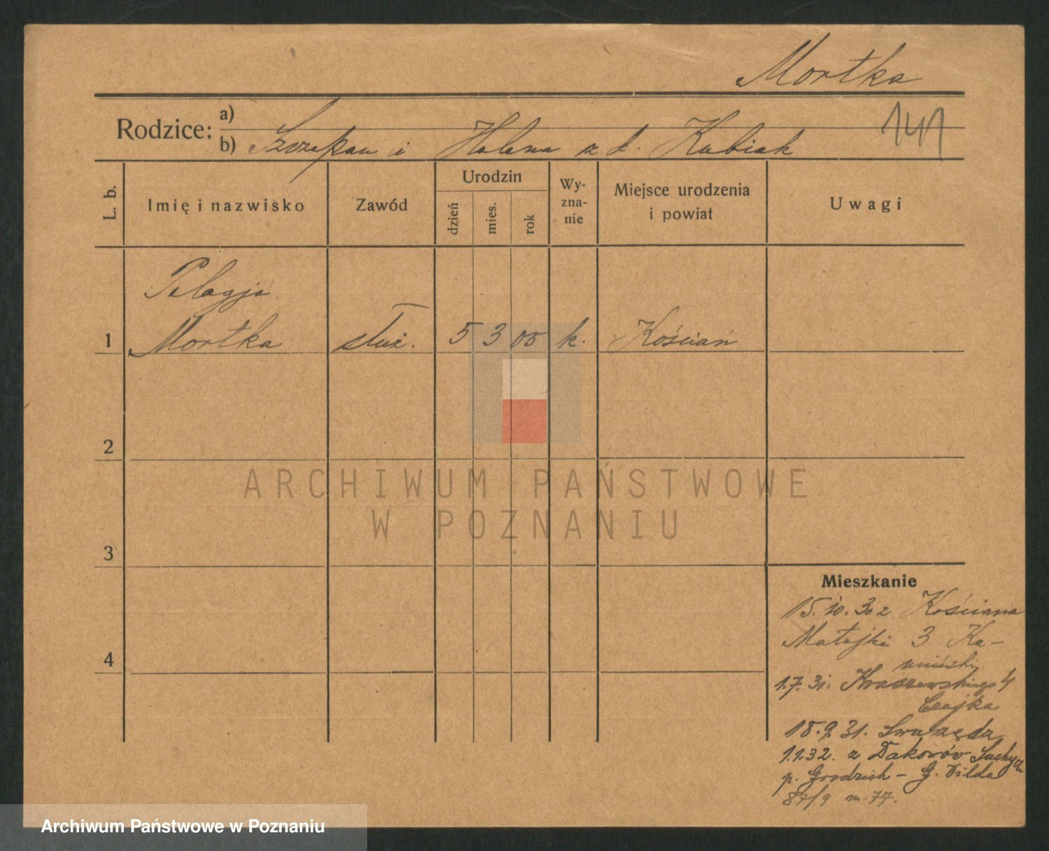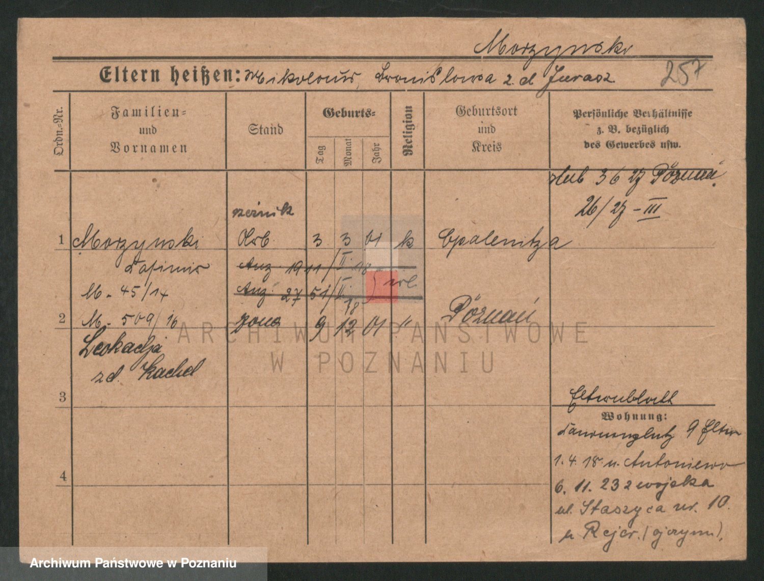 Podgląd karty osobowej dostępny jest po kliknięciu na nazwisko lub ikonkę karty. Można dokonywać powiększenia (ikony na górze) lub przechodzić między kolejnymi skanami (strzałki po bokach).