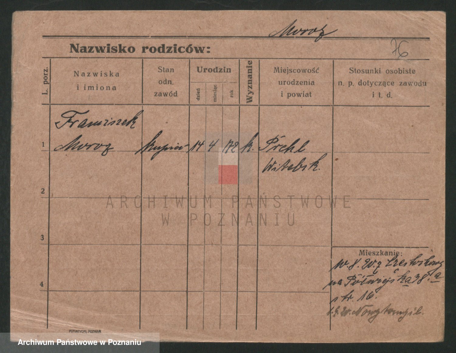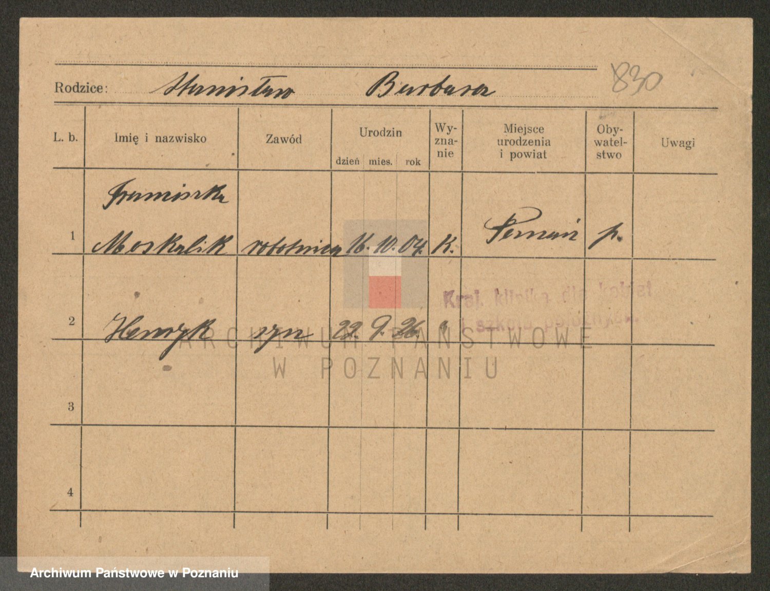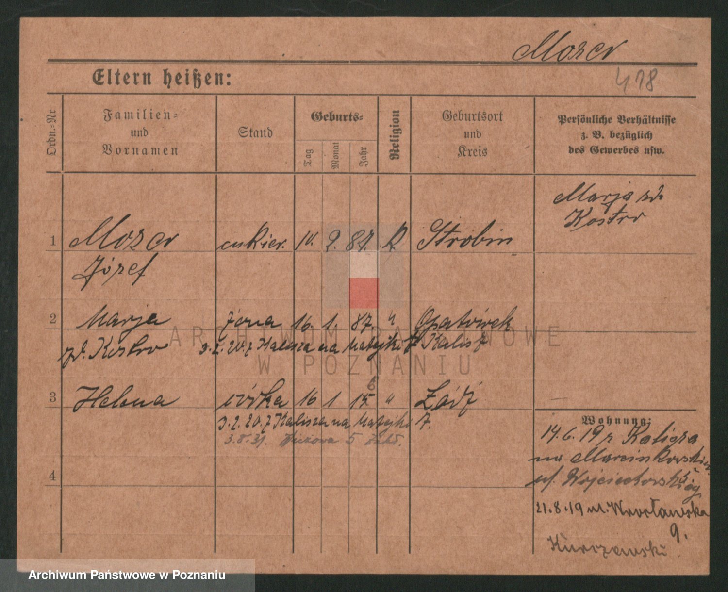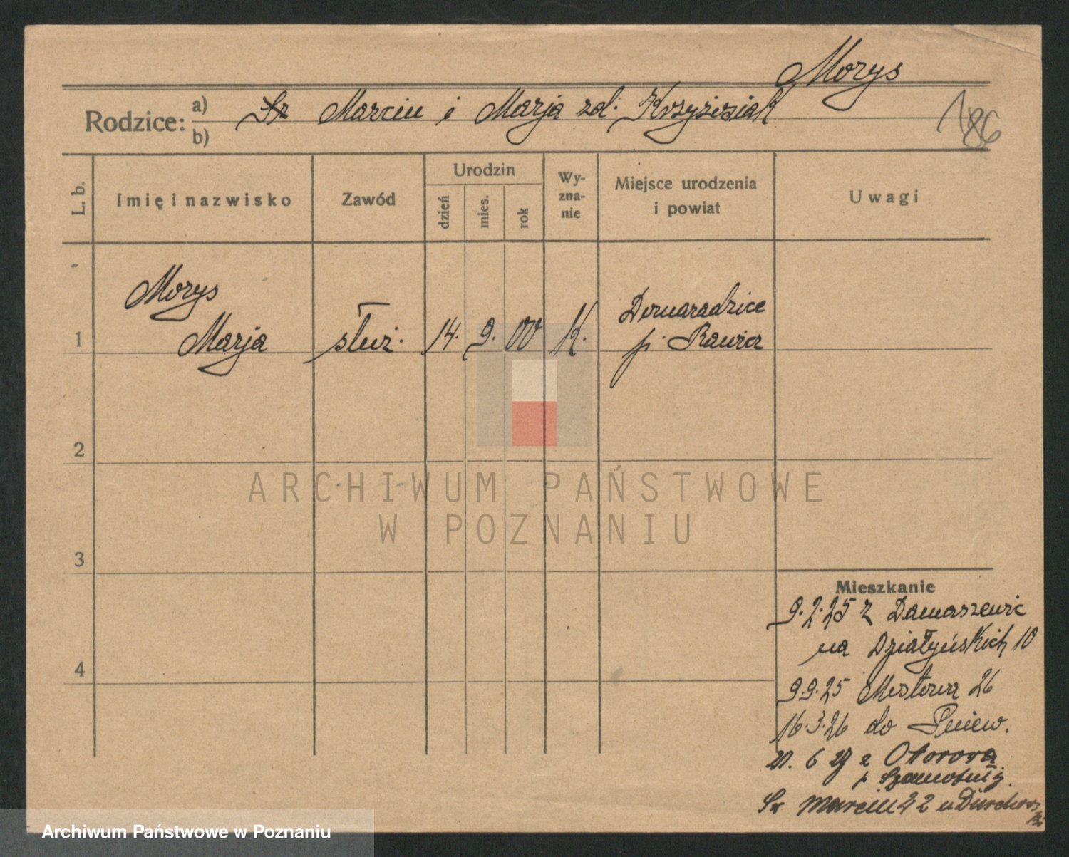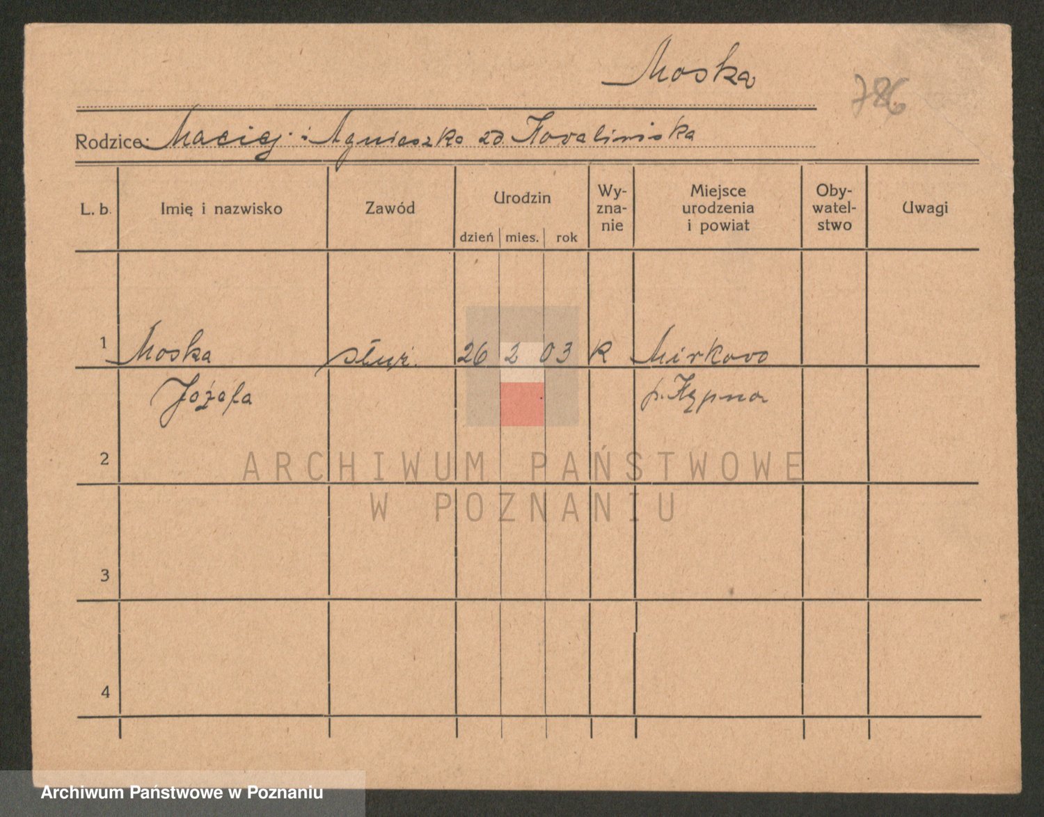 Podgląd karty osobowej dostępny jest po kliknięciu na nazwisko lub ikonkę karty. Można dokonywać powiększenia (ikony na górze) lub przechodzić między kolejnymi skanami (strzałki po bokach).