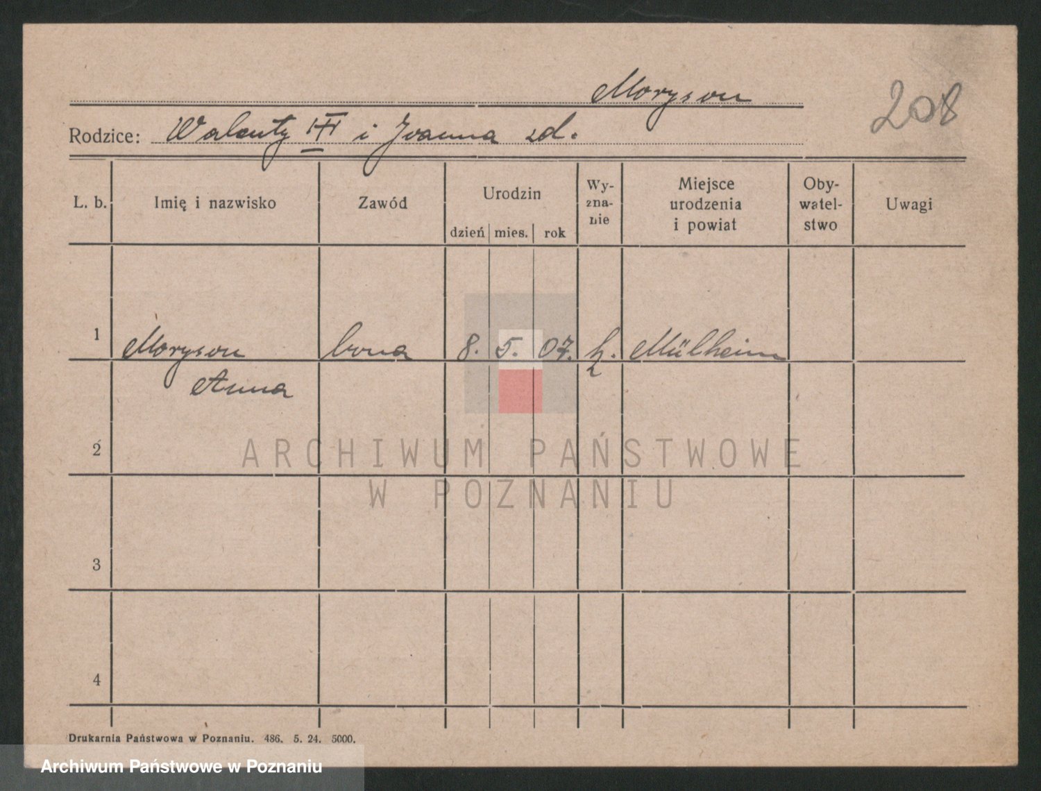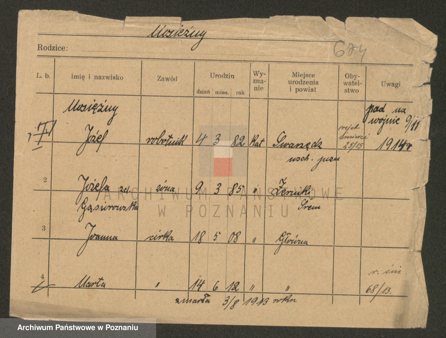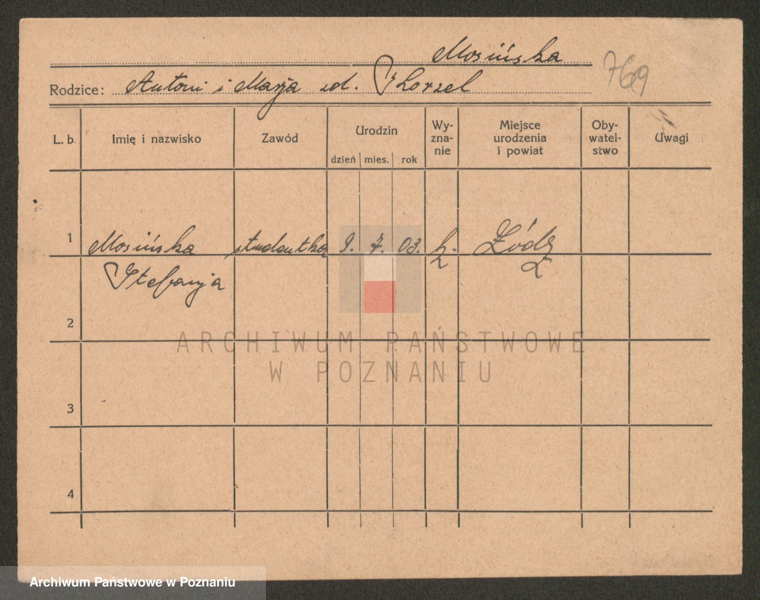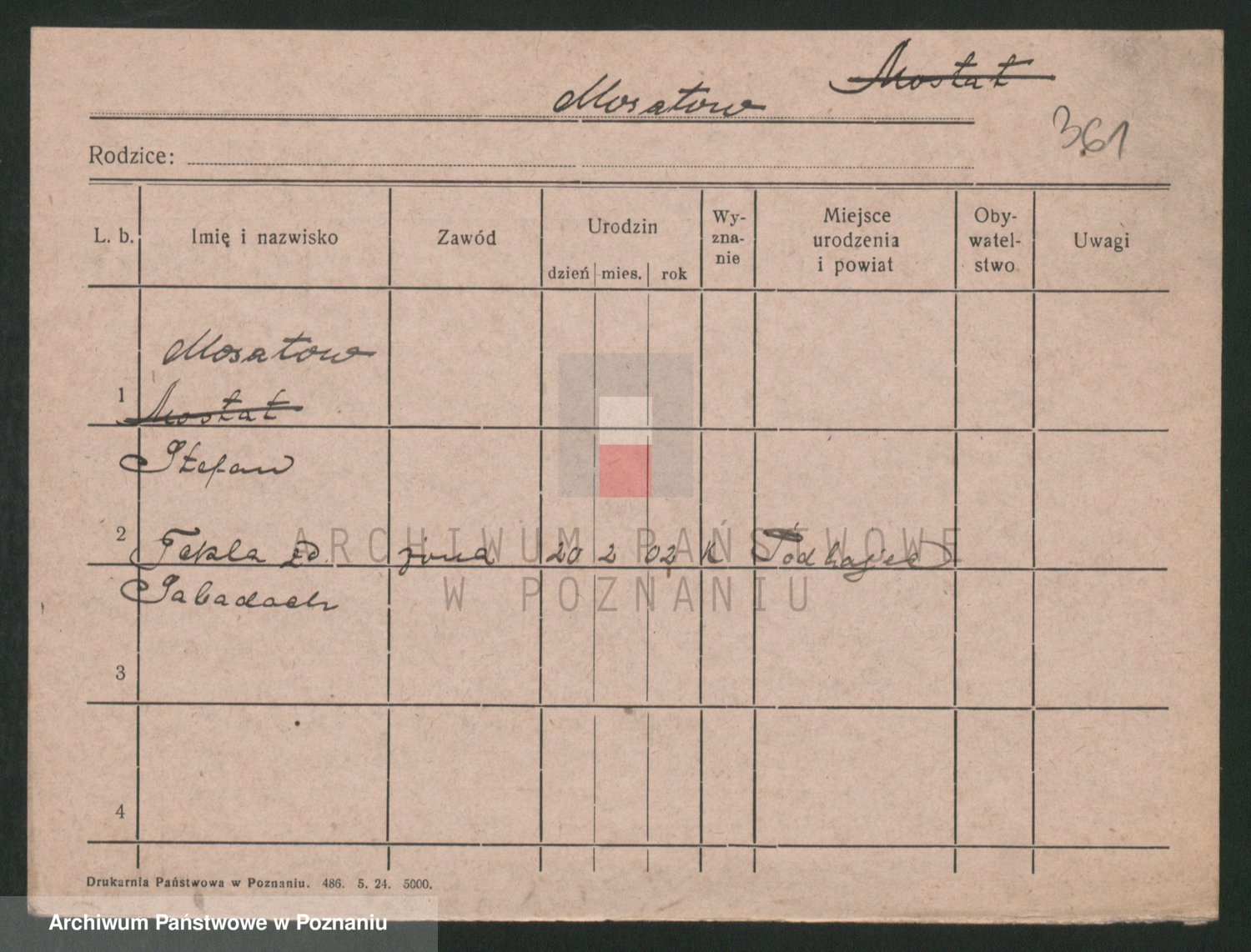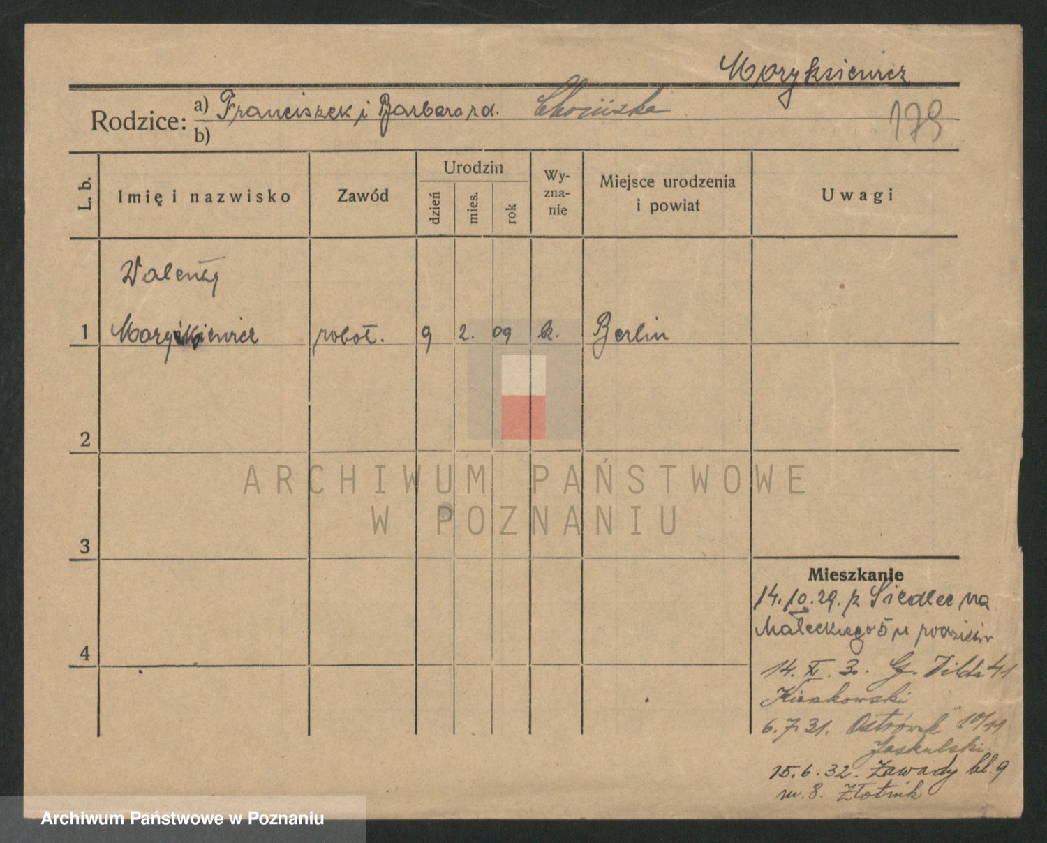 Podgląd karty osobowej dostępny jest po kliknięciu na nazwisko lub ikonkę karty. Można dokonywać powiększenia (ikony na górze) lub przechodzić między kolejnymi skanami (strzałki po bokach).