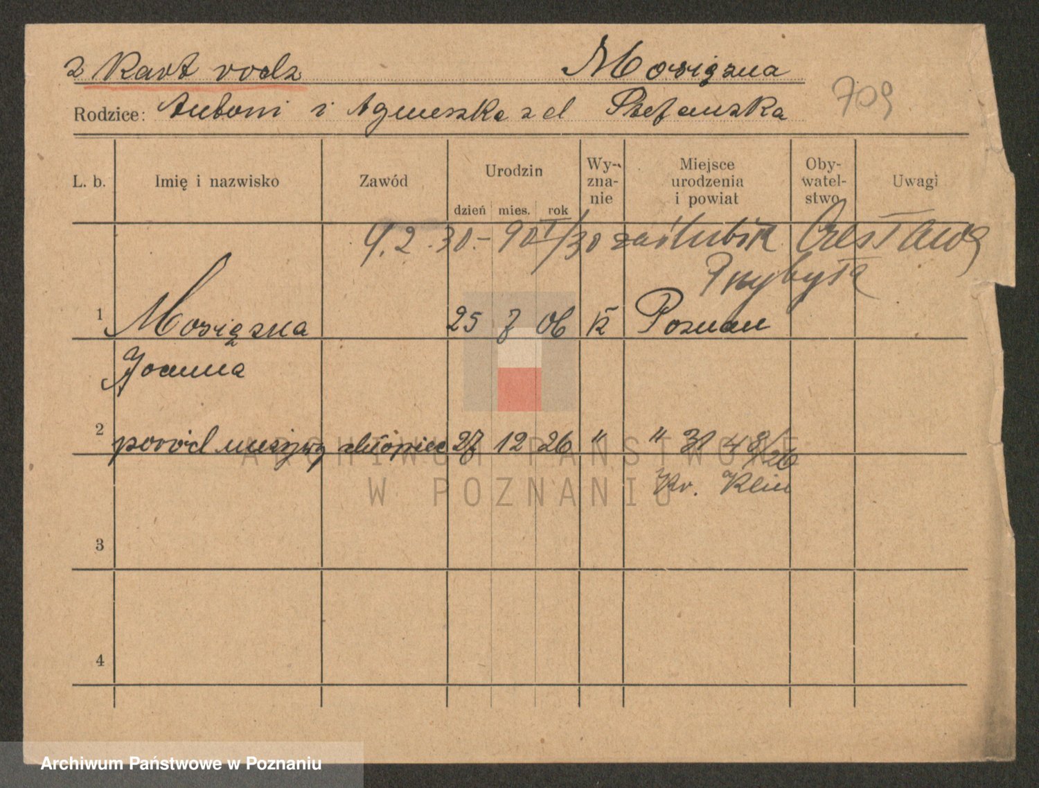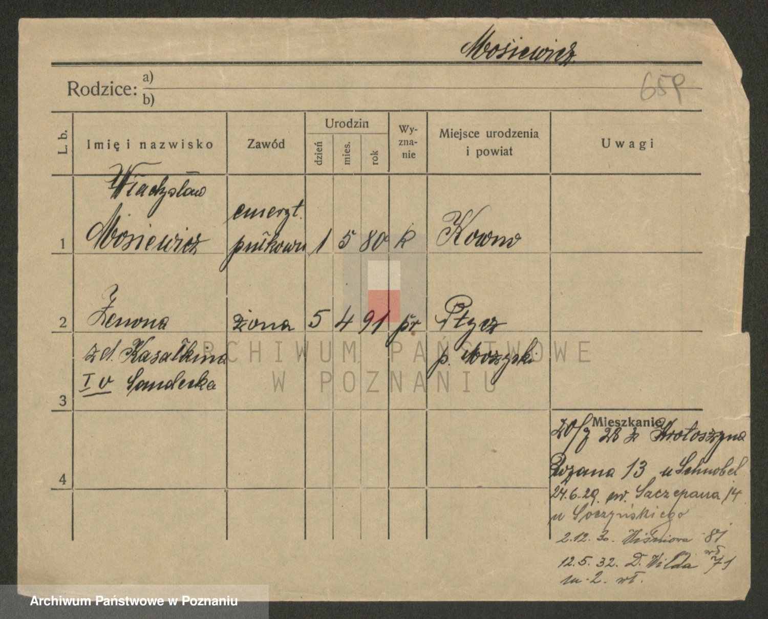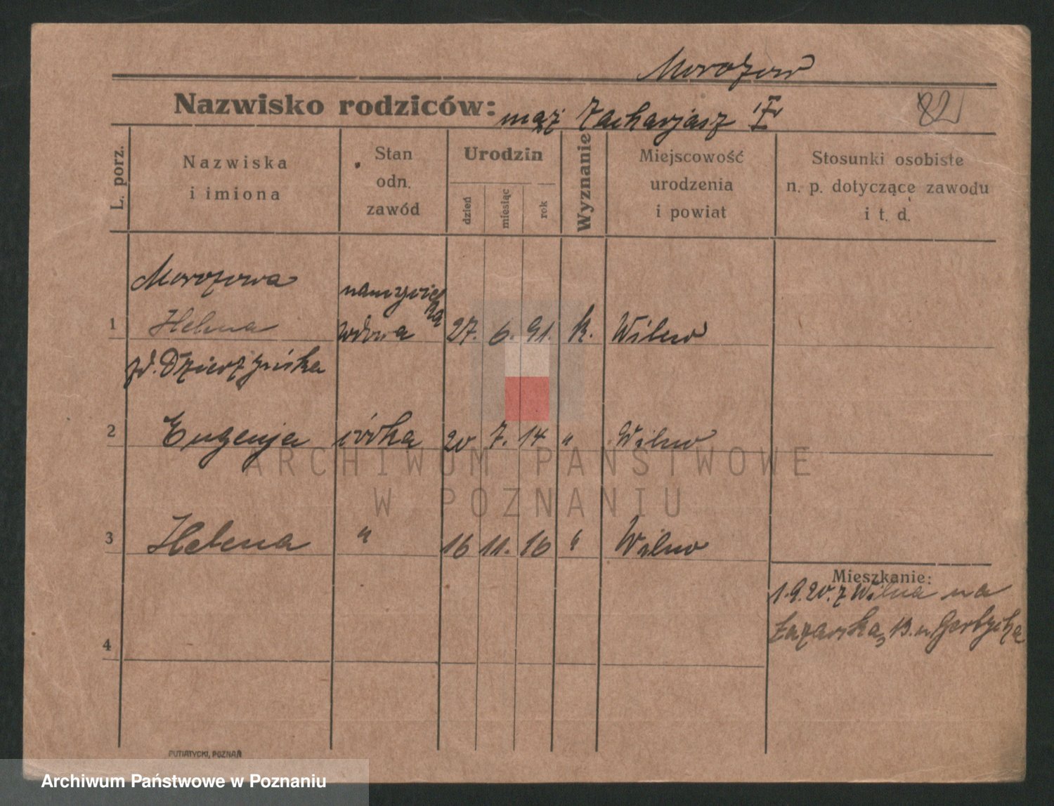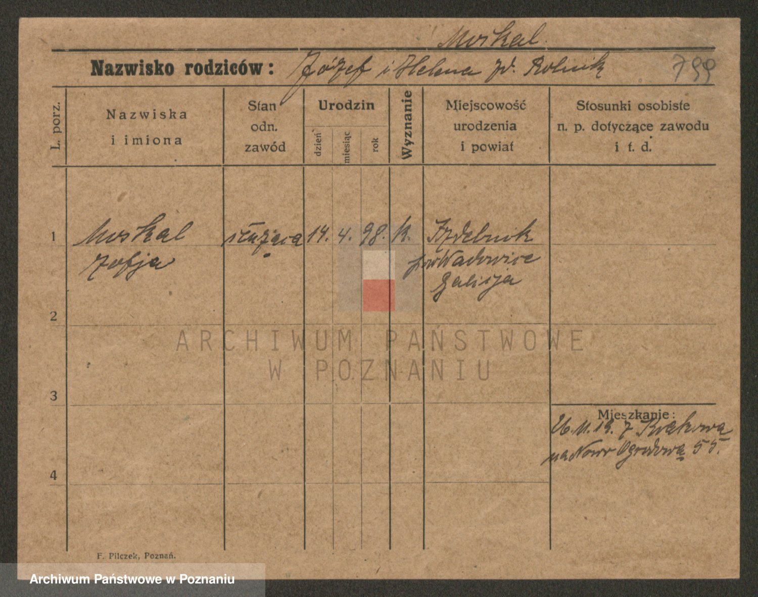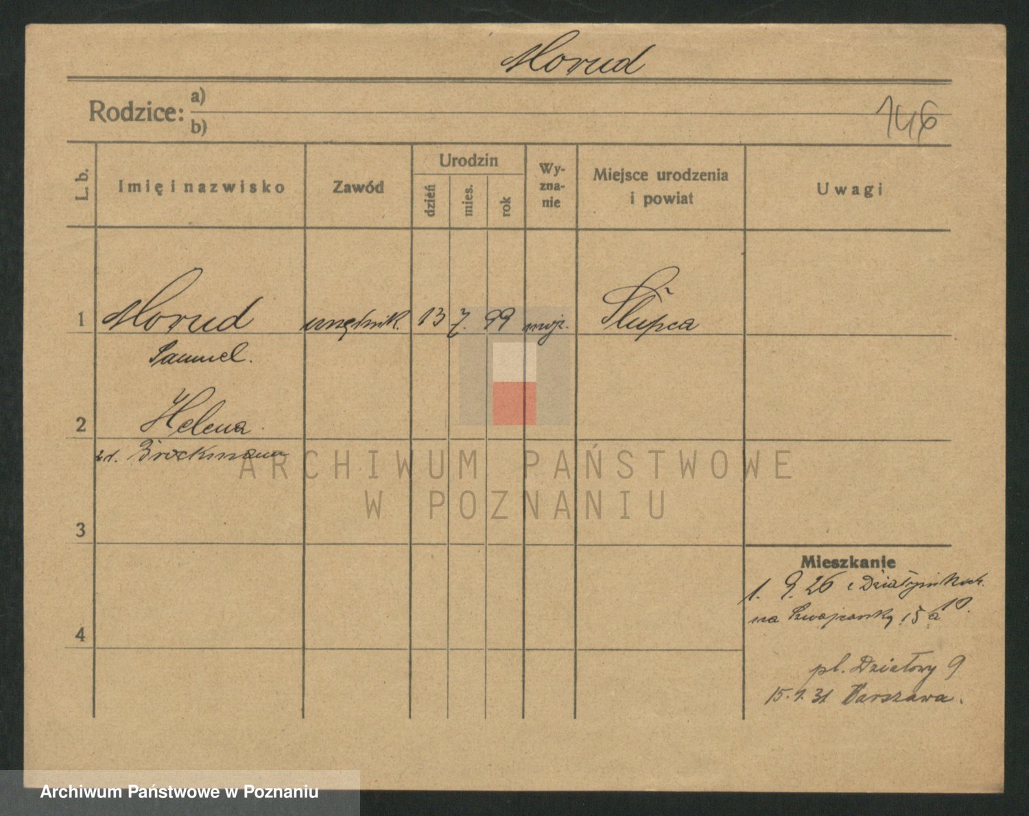 Podgląd karty osobowej dostępny jest po kliknięciu na nazwisko lub ikonkę karty. Można dokonywać powiększenia (ikony na górze) lub przechodzić między kolejnymi skanami (strzałki po bokach).
