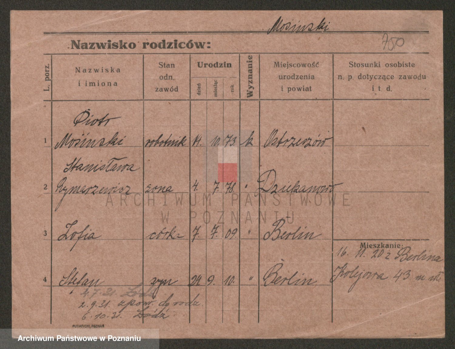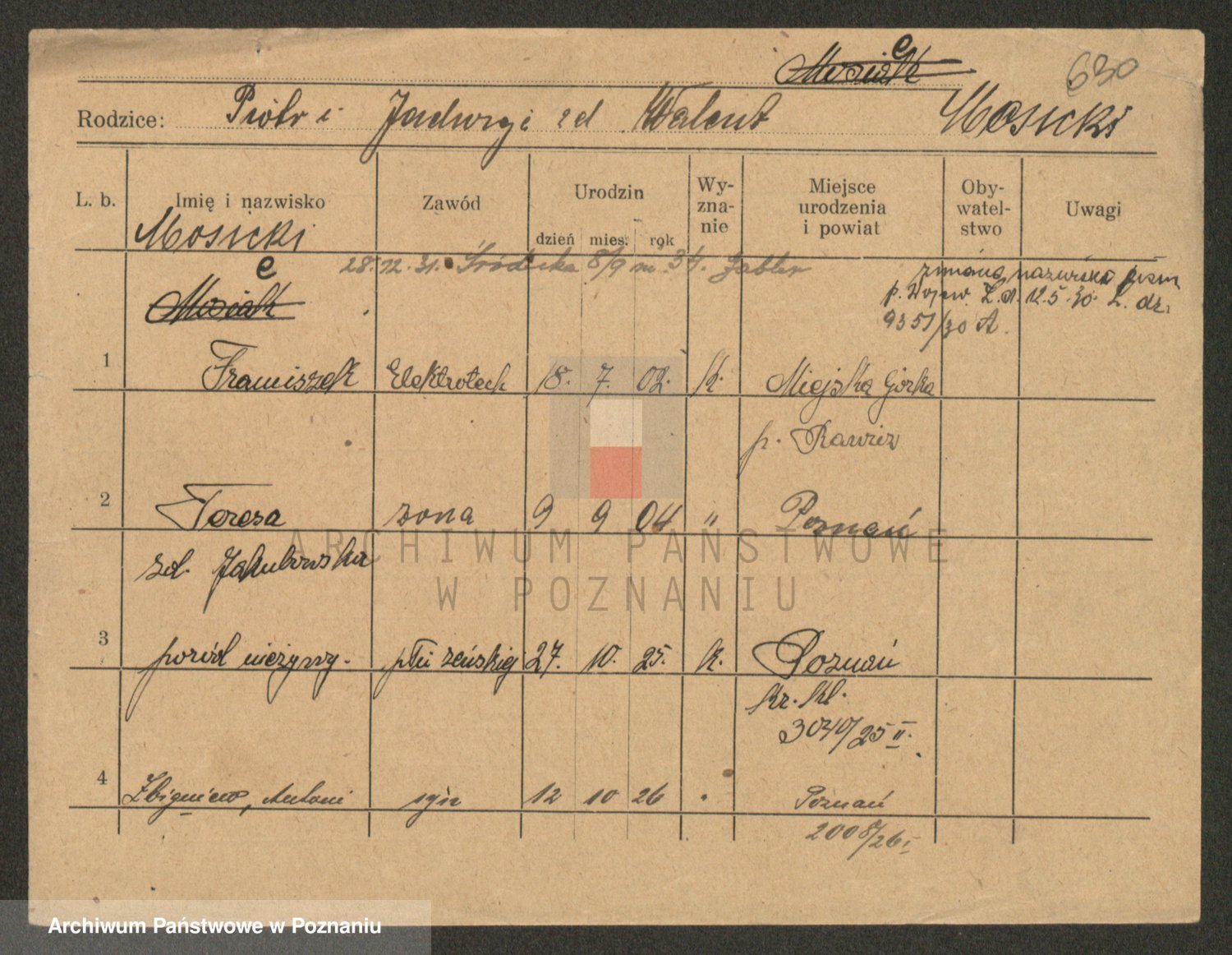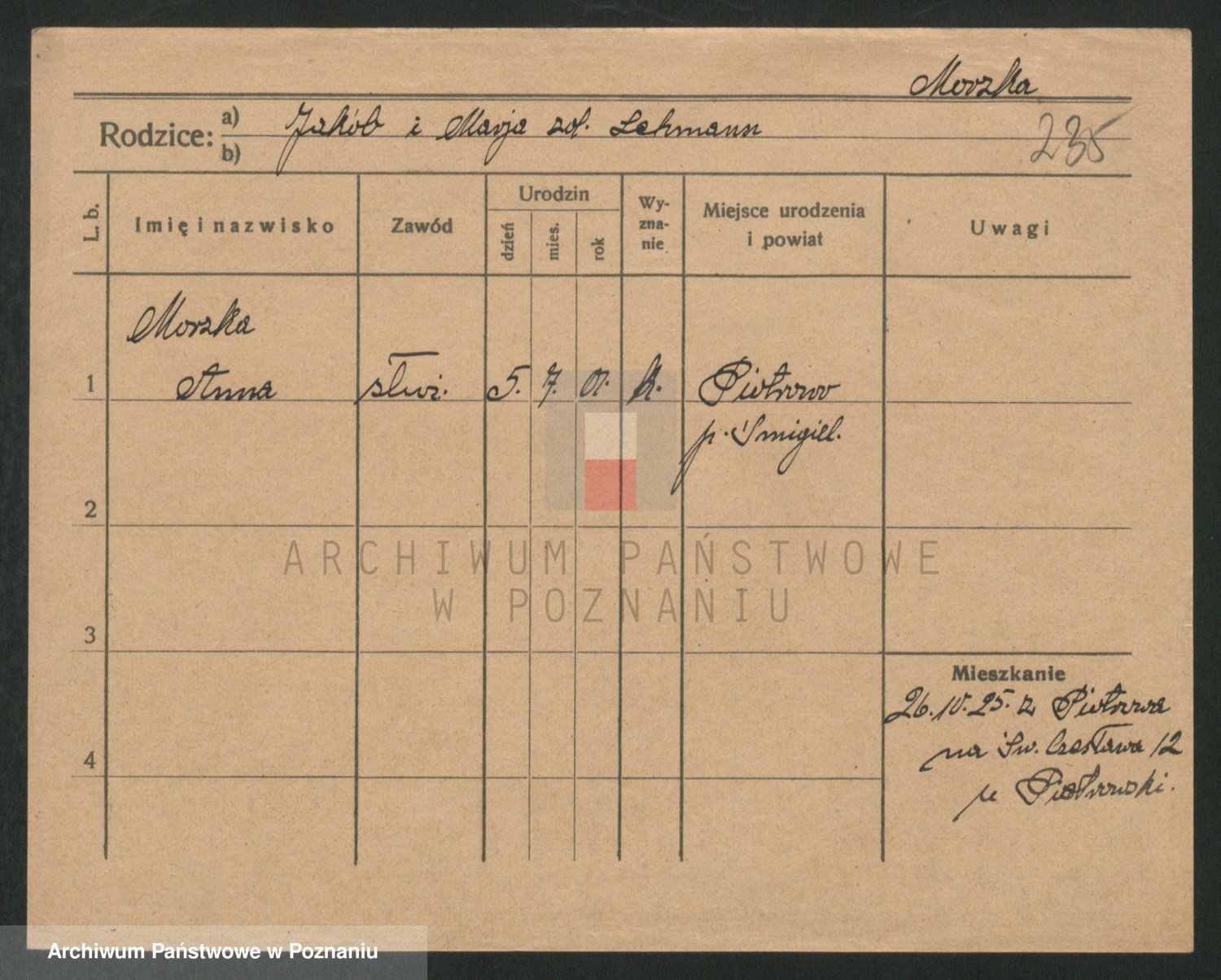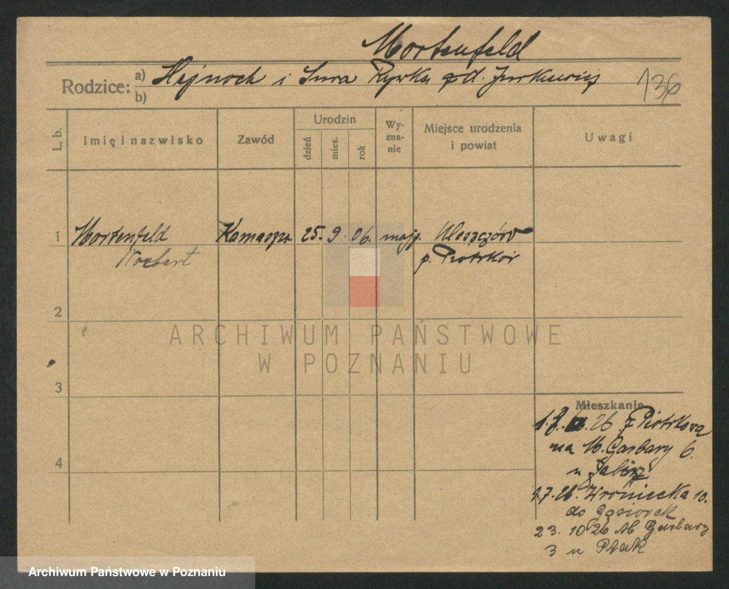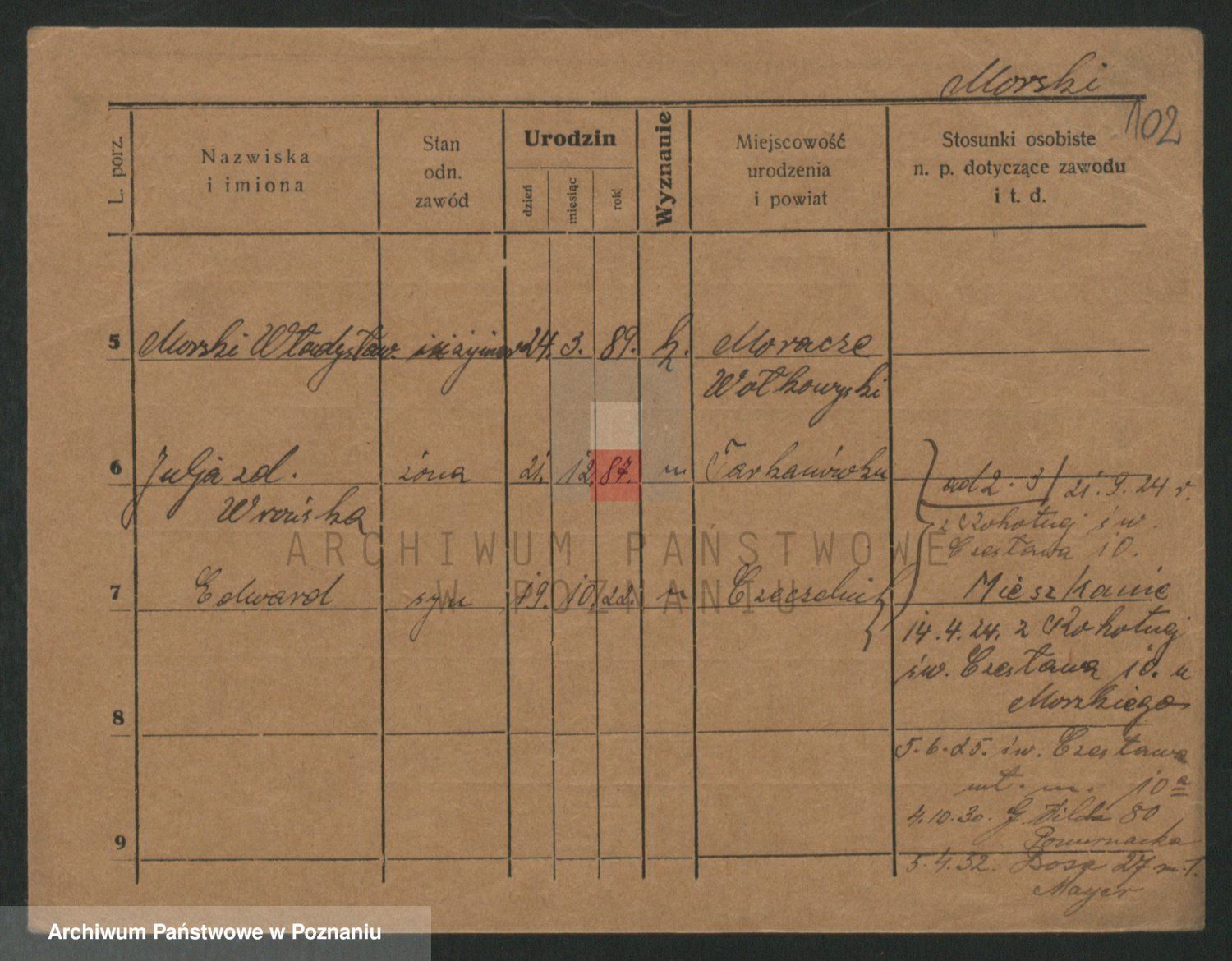 Podgląd karty osobowej dostępny jest po kliknięciu na nazwisko lub ikonkę karty. Można dokonywać powiększenia (ikony na górze) lub przechodzić między kolejnymi skanami (strzałki po bokach).