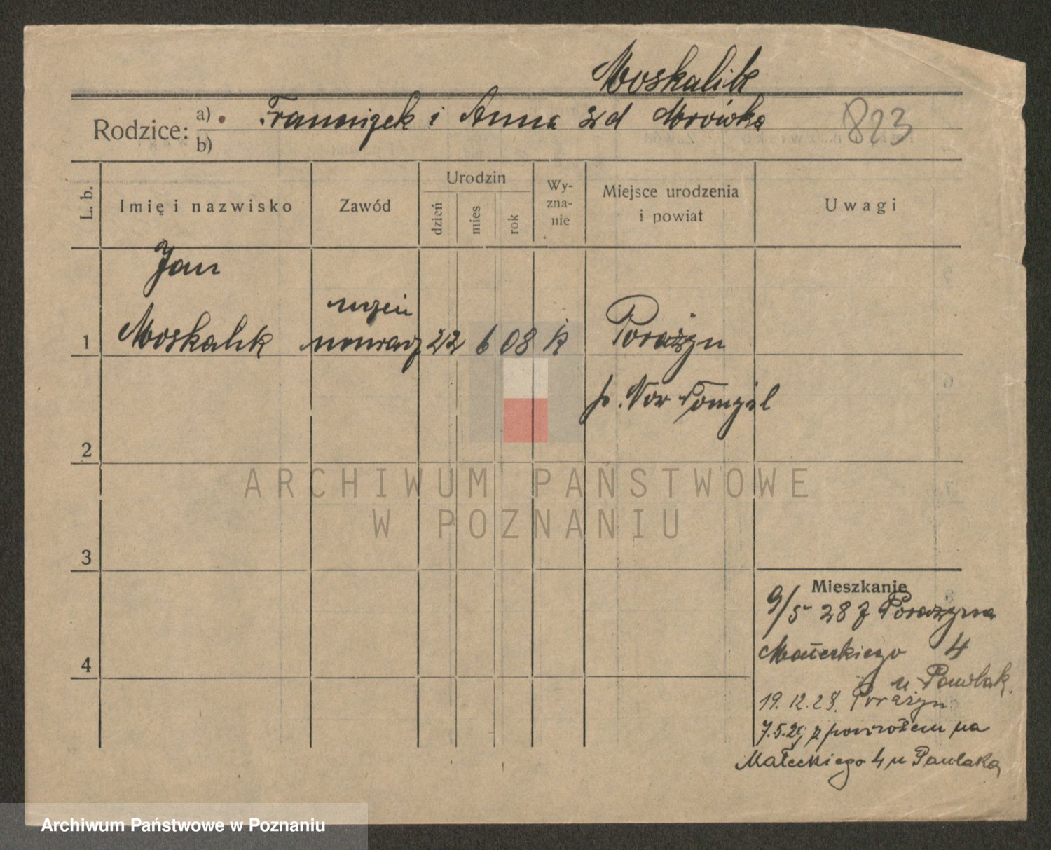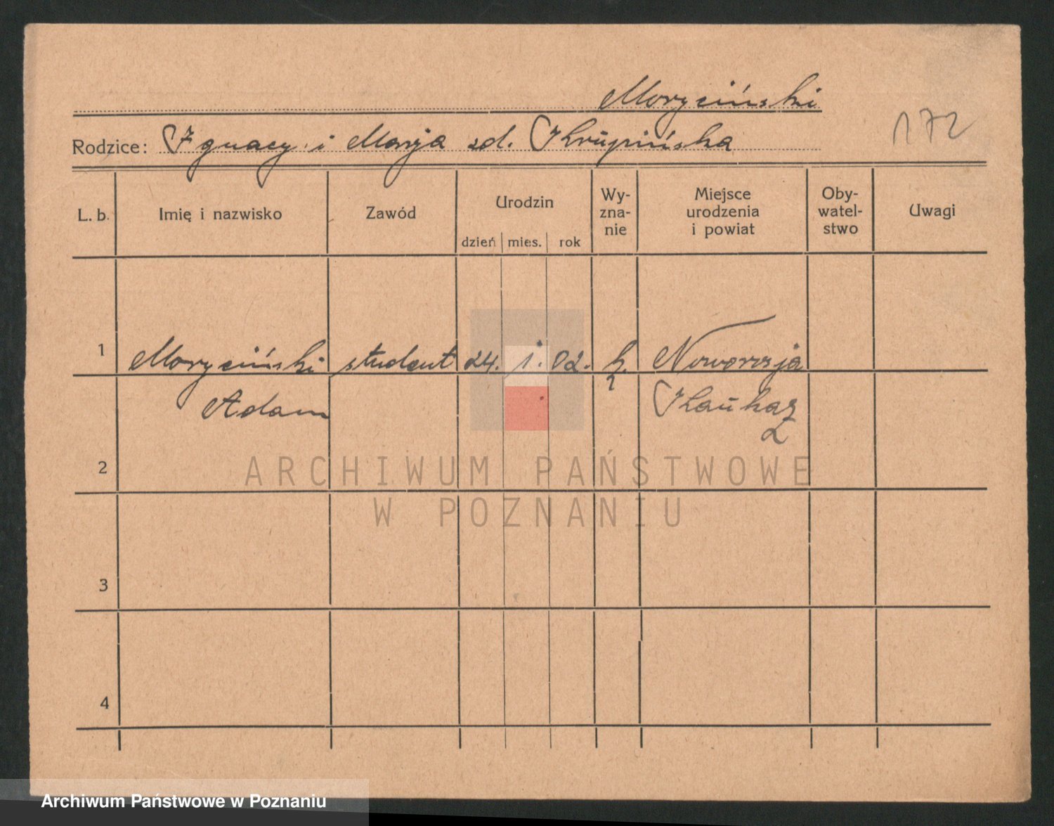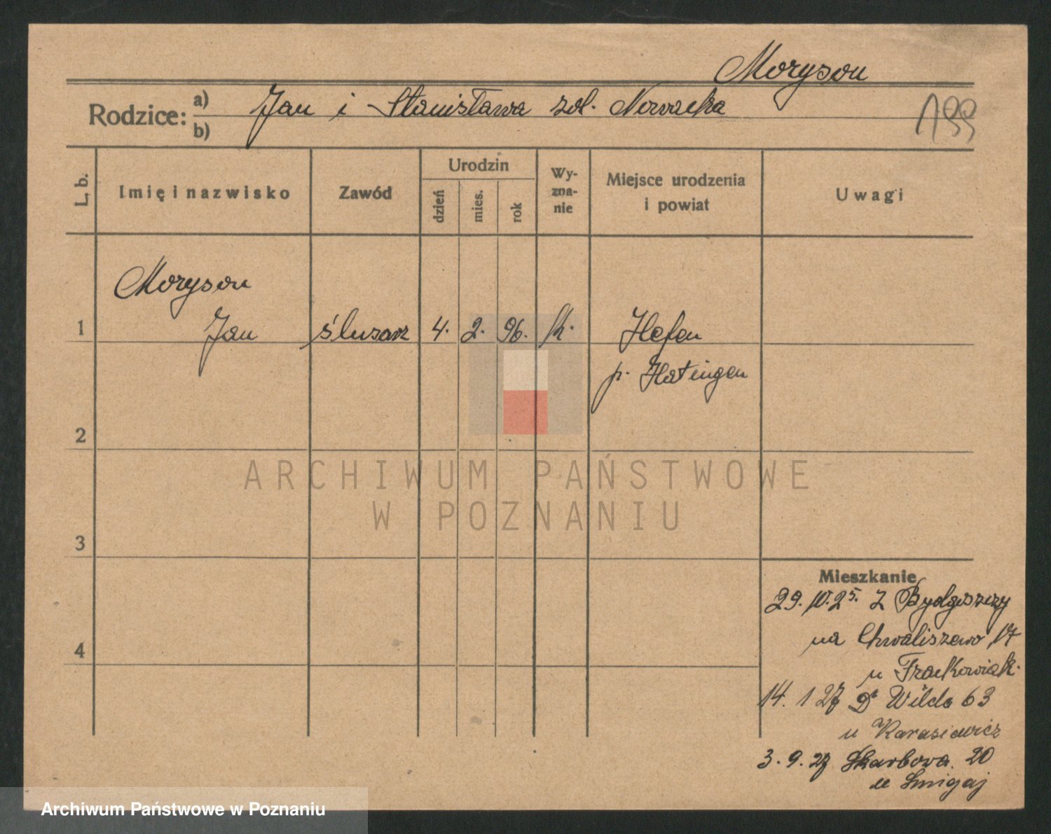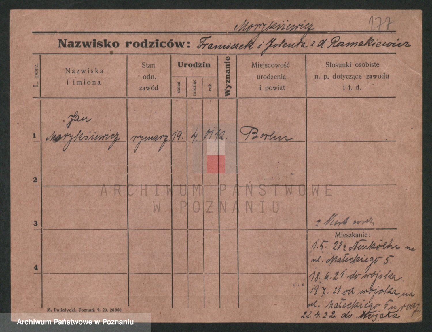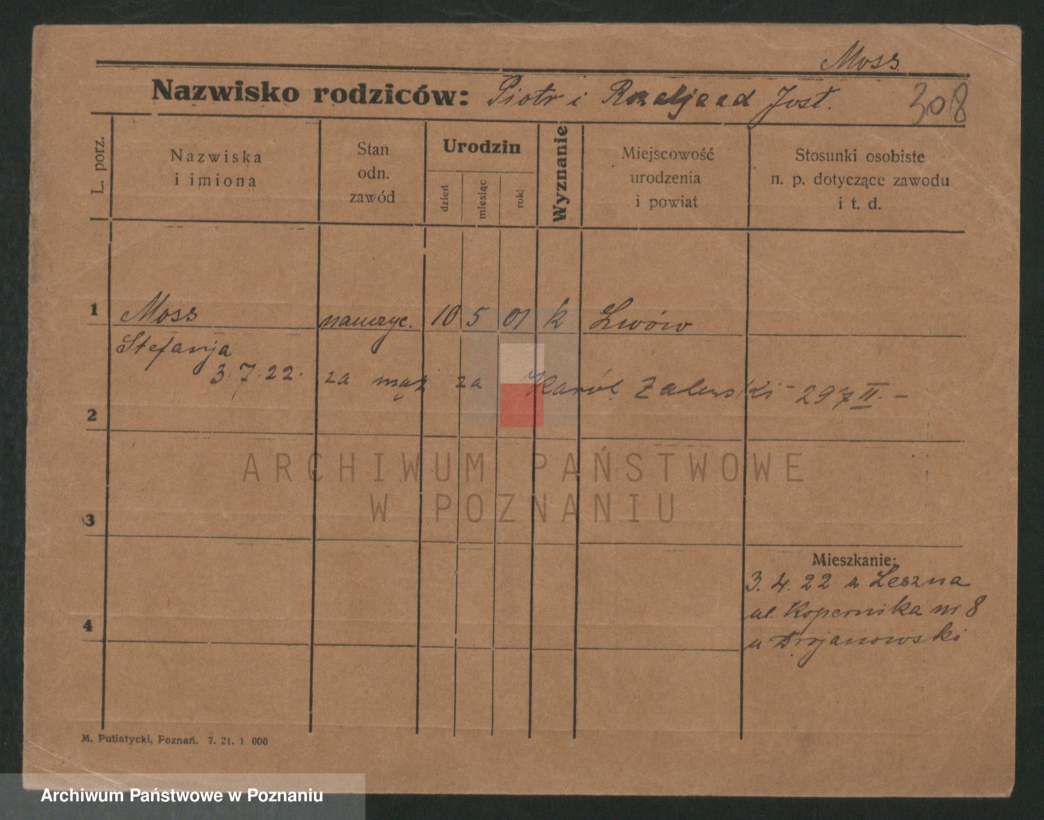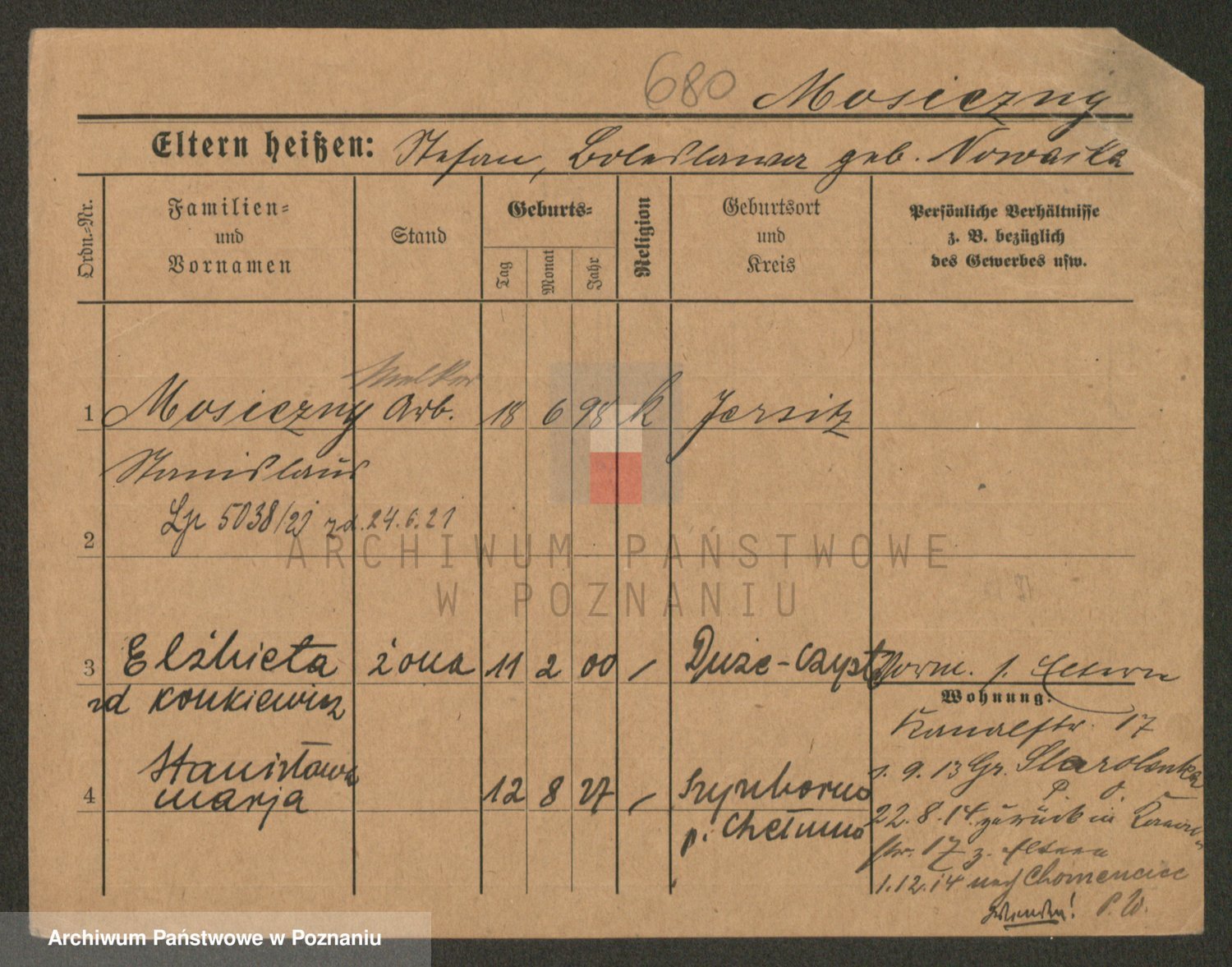 Podgląd karty osobowej dostępny jest po kliknięciu na nazwisko lub ikonkę karty. Można dokonywać powiększenia (ikony na górze) lub przechodzić między kolejnymi skanami (strzałki po bokach).