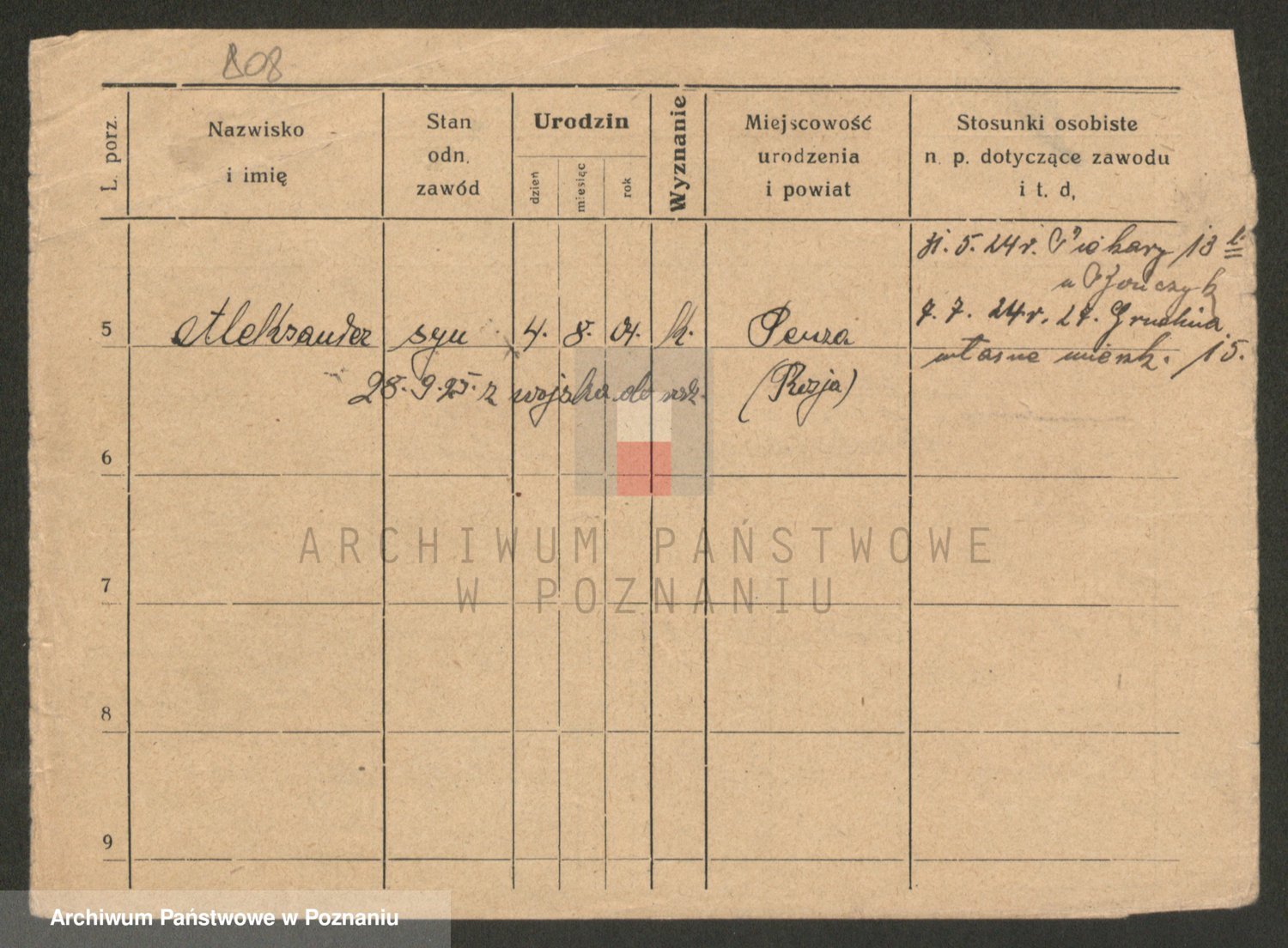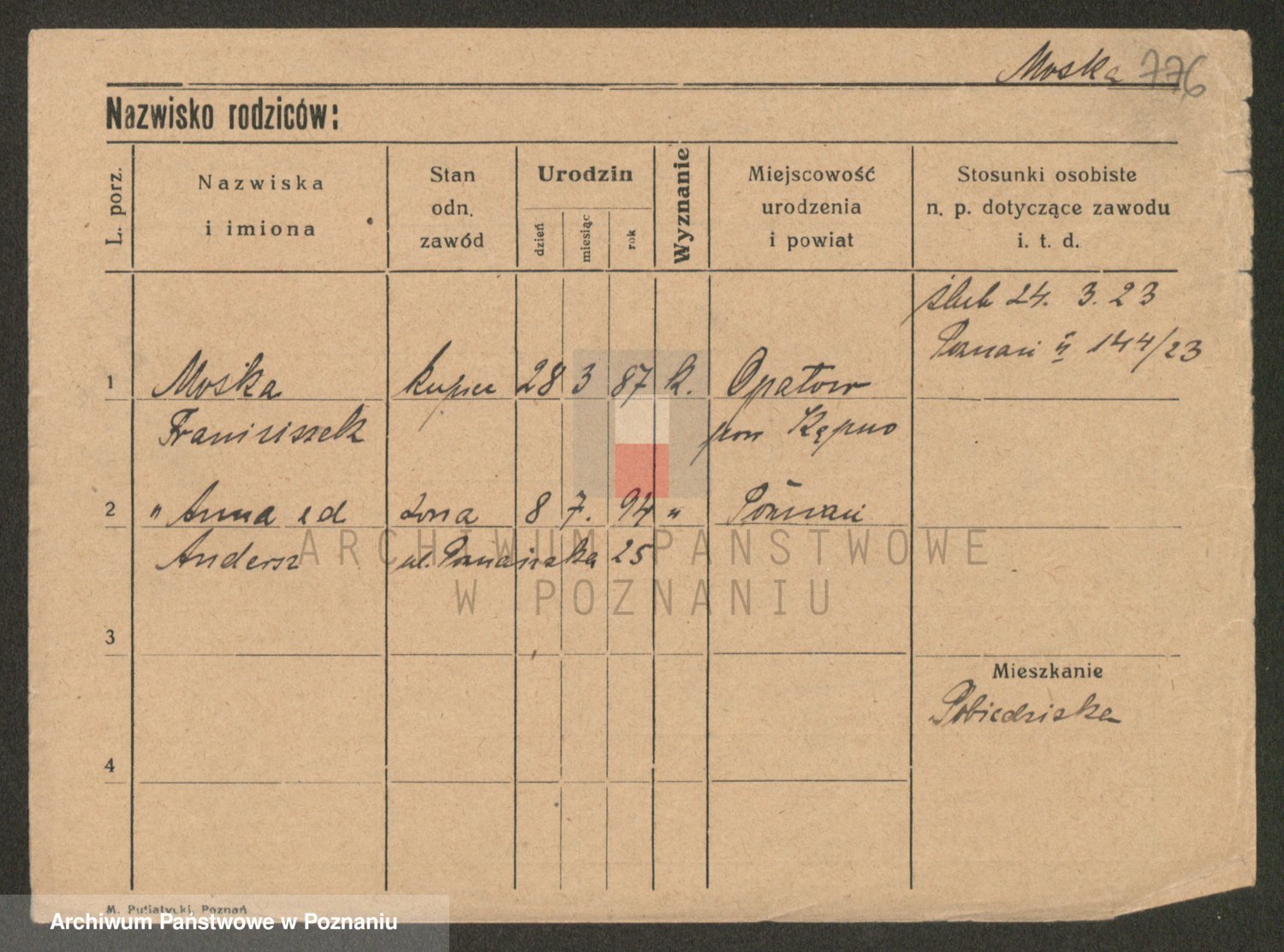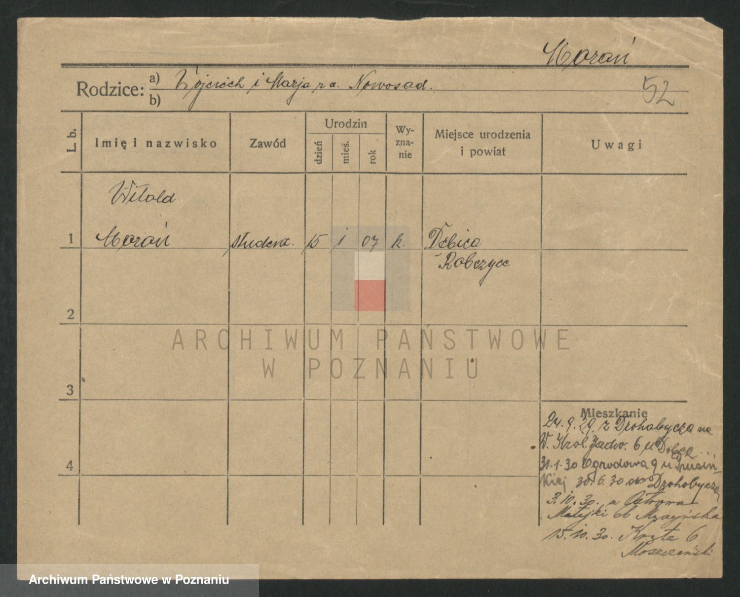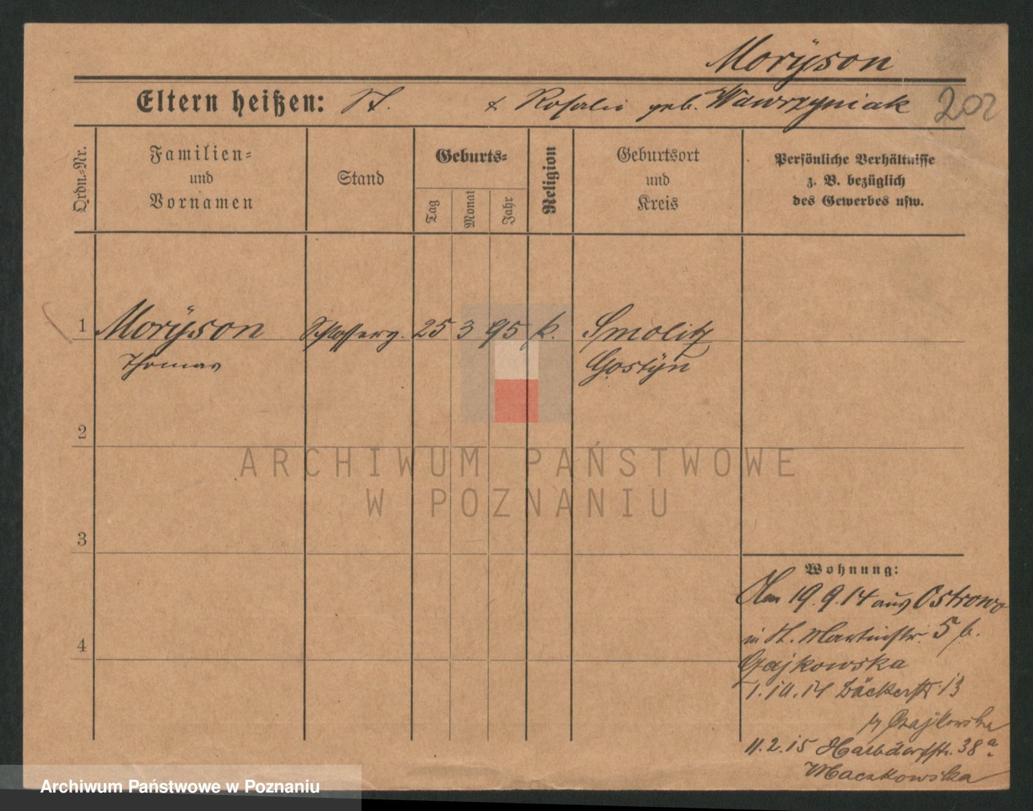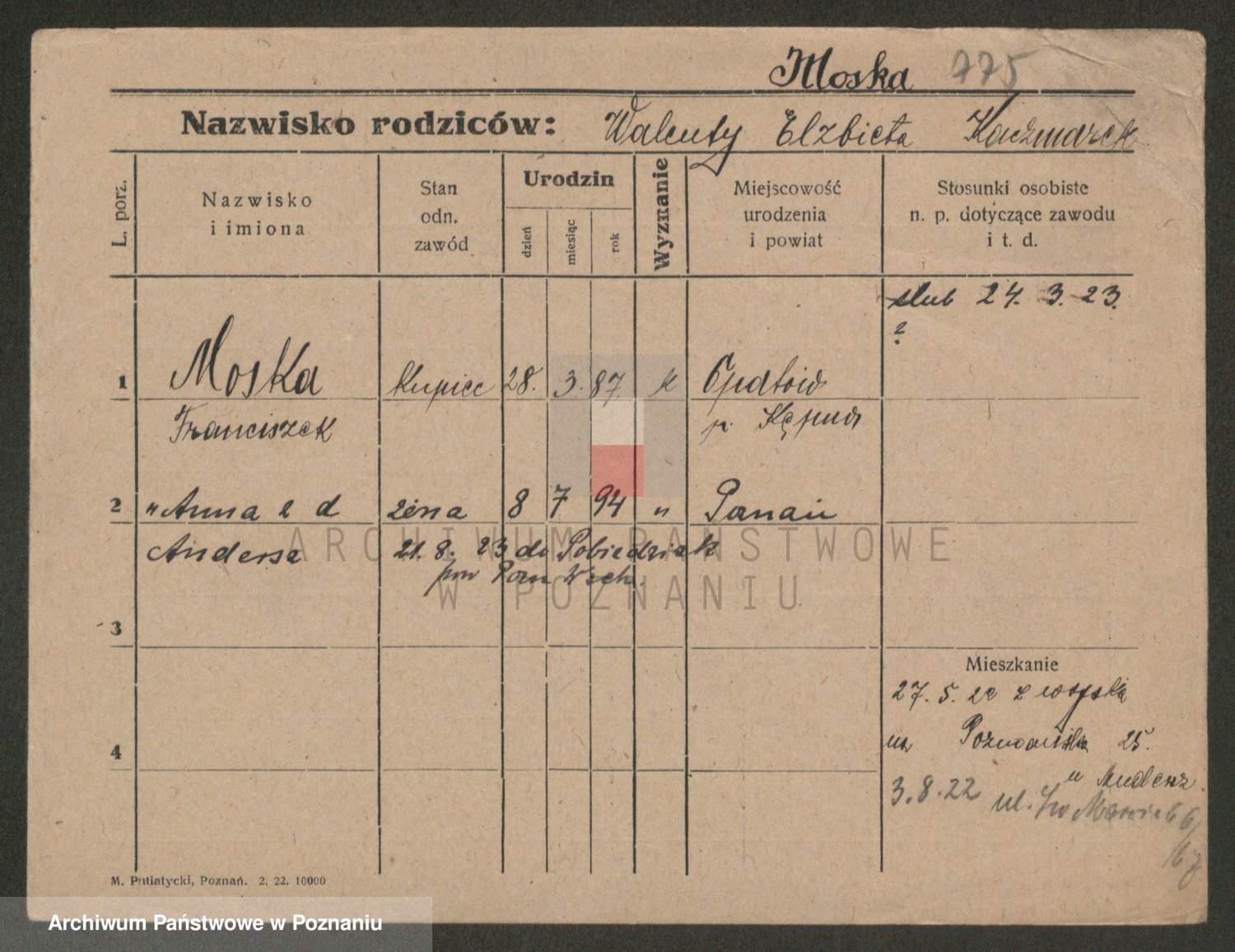 Podgląd karty osobowej dostępny jest po kliknięciu na nazwisko lub ikonkę karty. Można dokonywać powiększenia (ikony na górze) lub przechodzić między kolejnymi skanami (strzałki po bokach).
