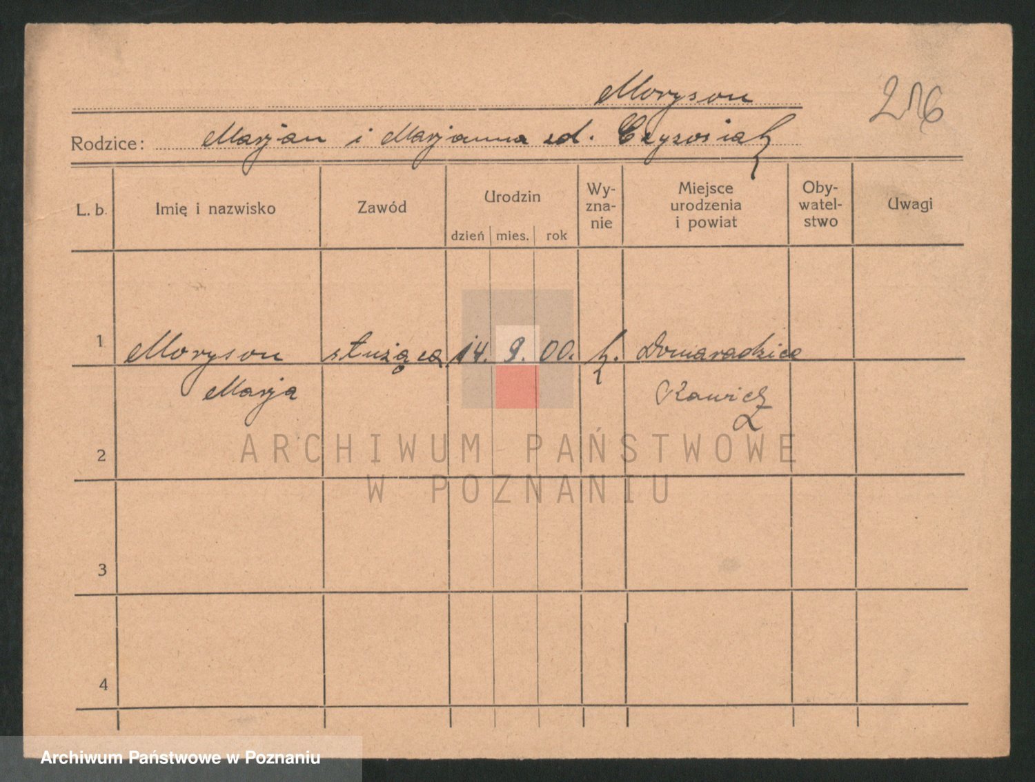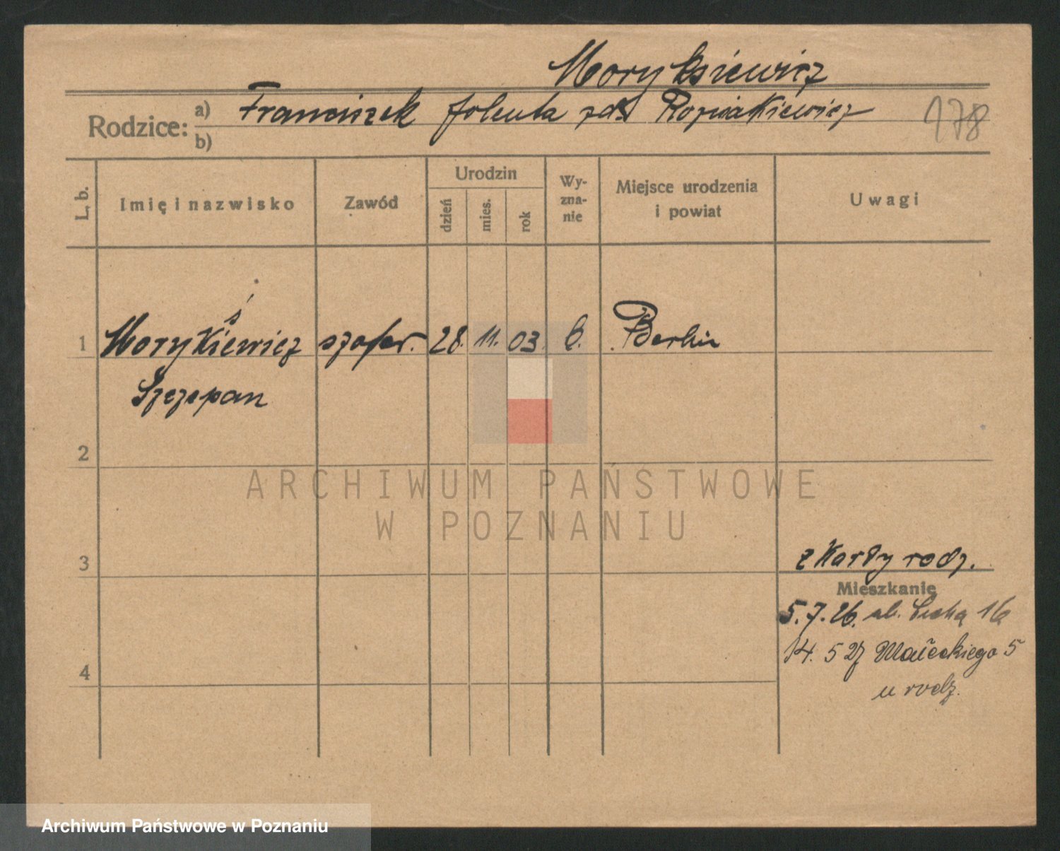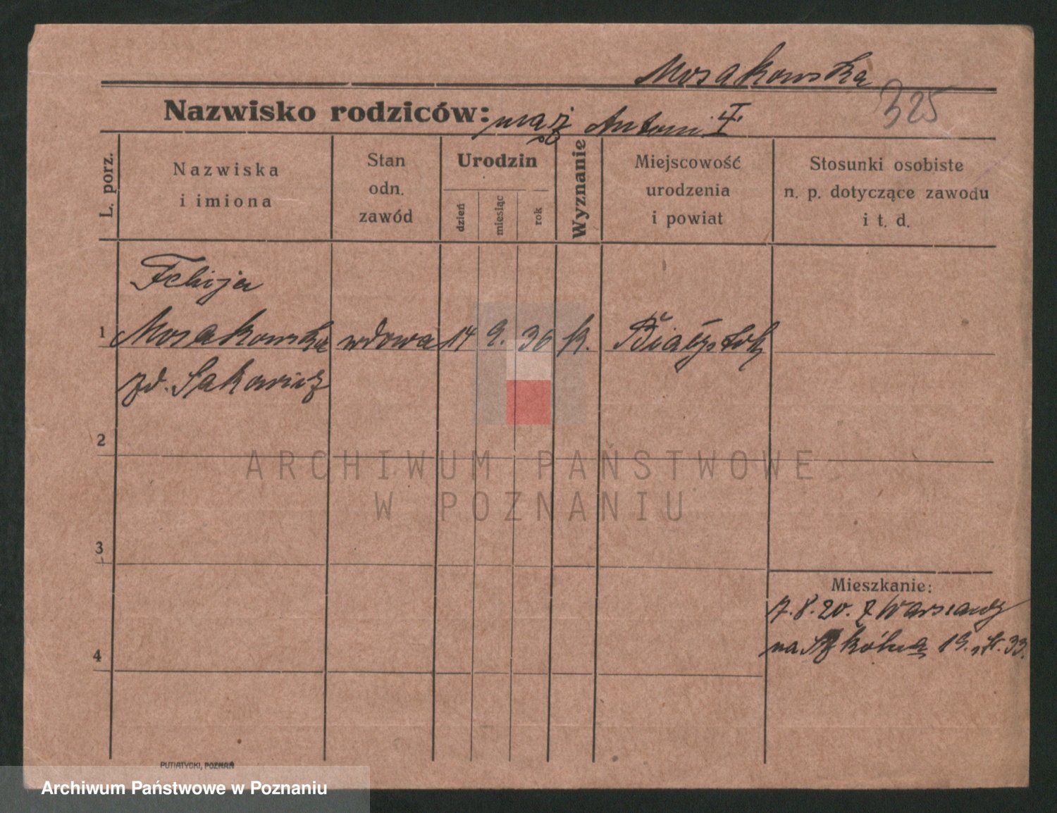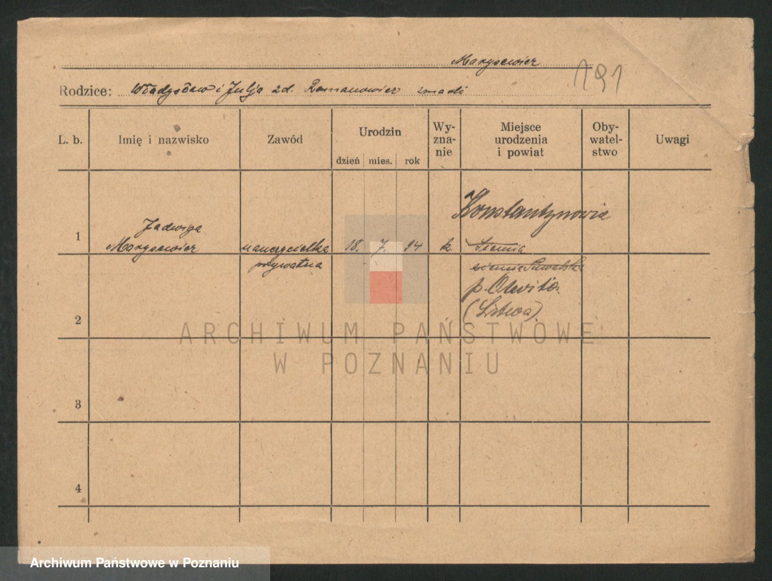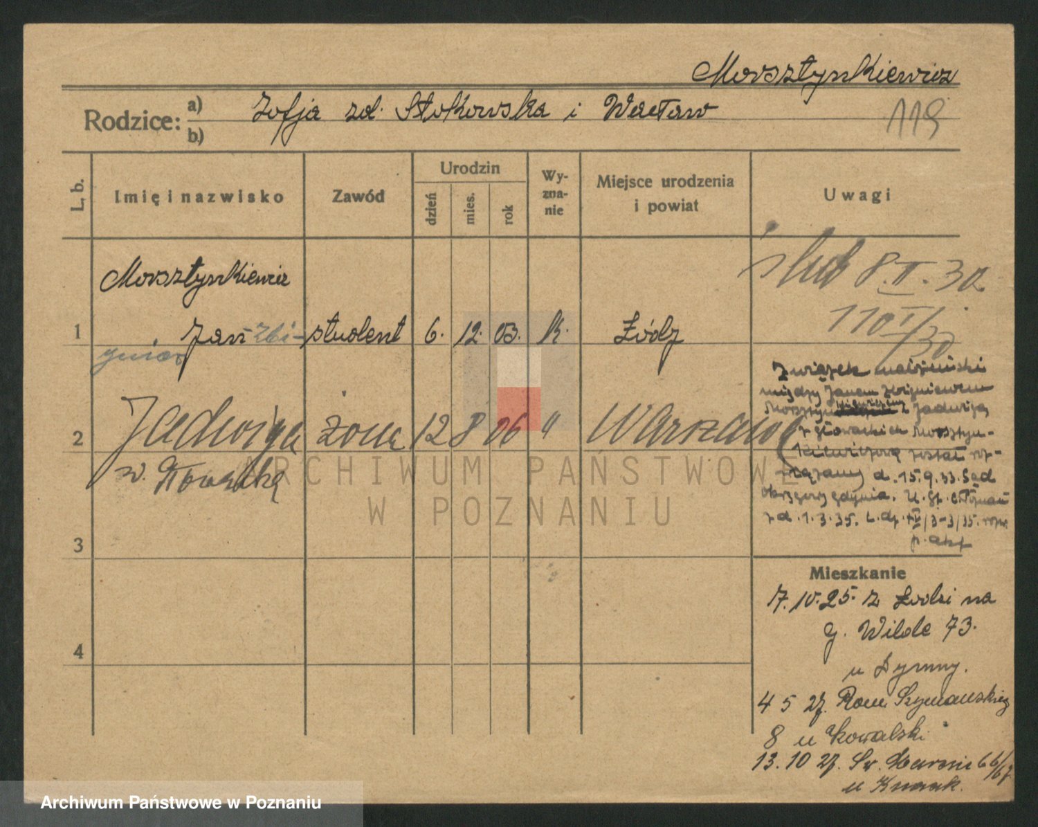 Podgląd karty osobowej dostępny jest po kliknięciu na nazwisko lub ikonkę karty. Można dokonywać powiększenia (ikony na górze) lub przechodzić między kolejnymi skanami (strzałki po bokach).