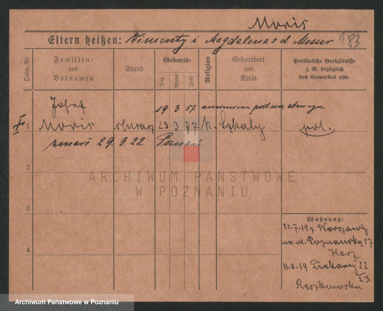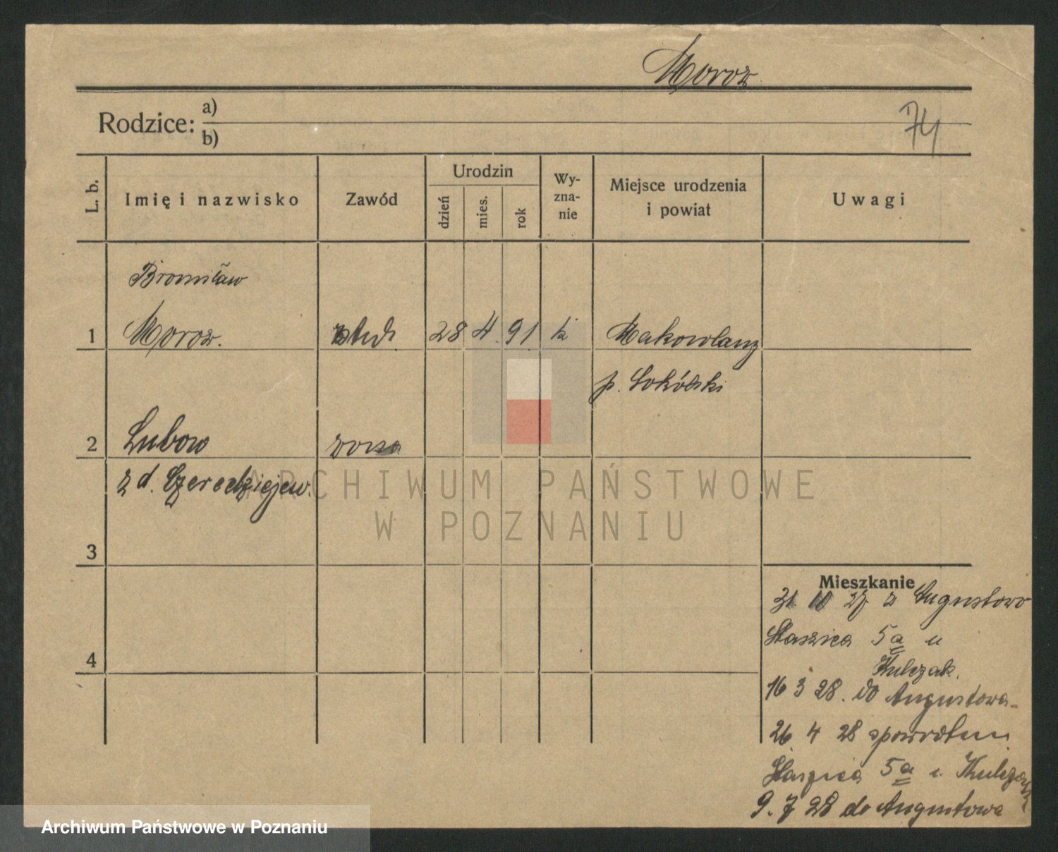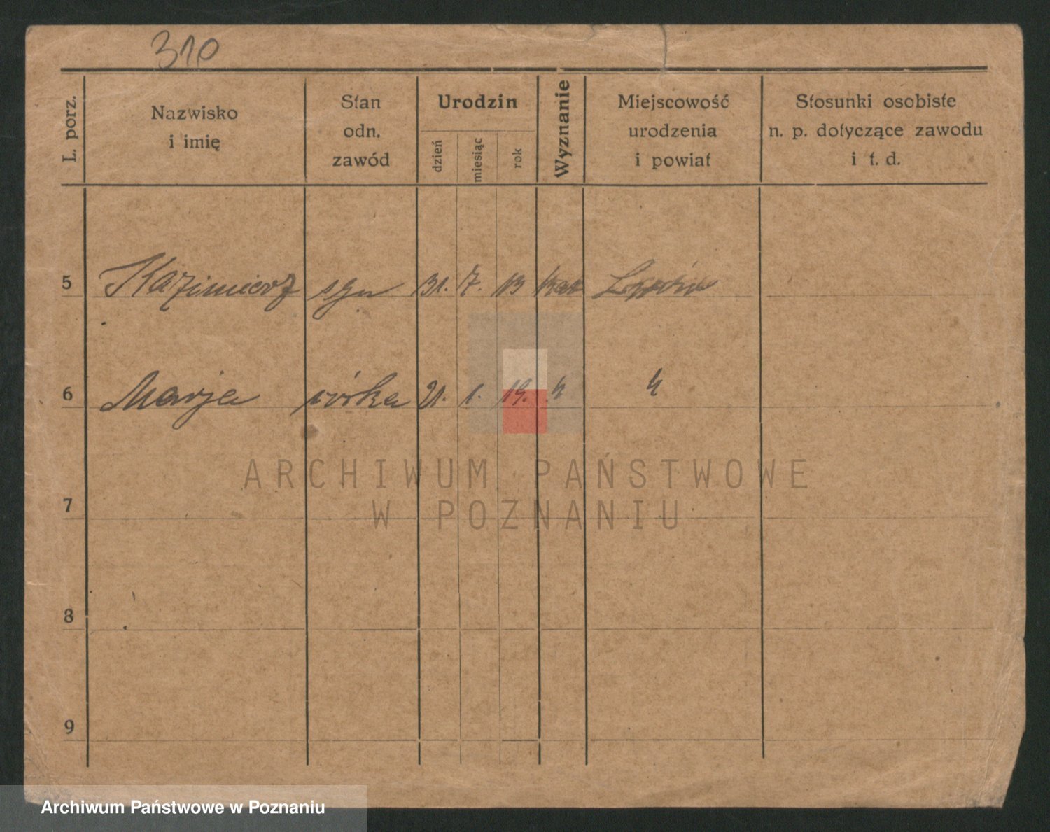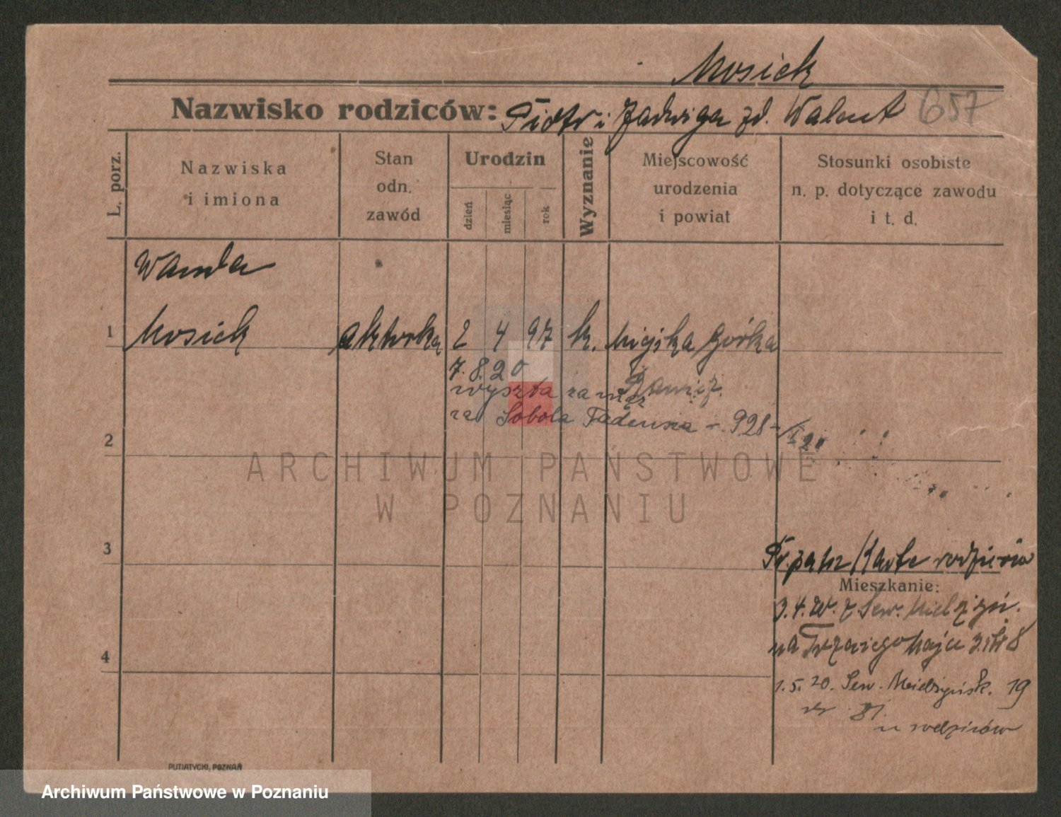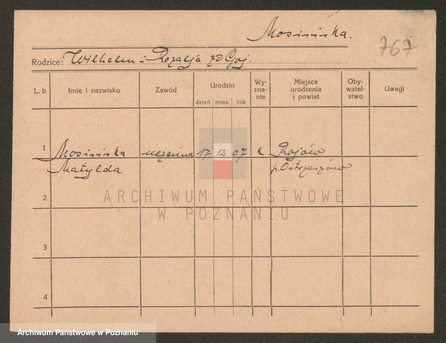 Podgląd karty osobowej dostępny jest po kliknięciu na nazwisko lub ikonkę karty. Można dokonywać powiększenia (ikony na górze) lub przechodzić między kolejnymi skanami (strzałki po bokach).