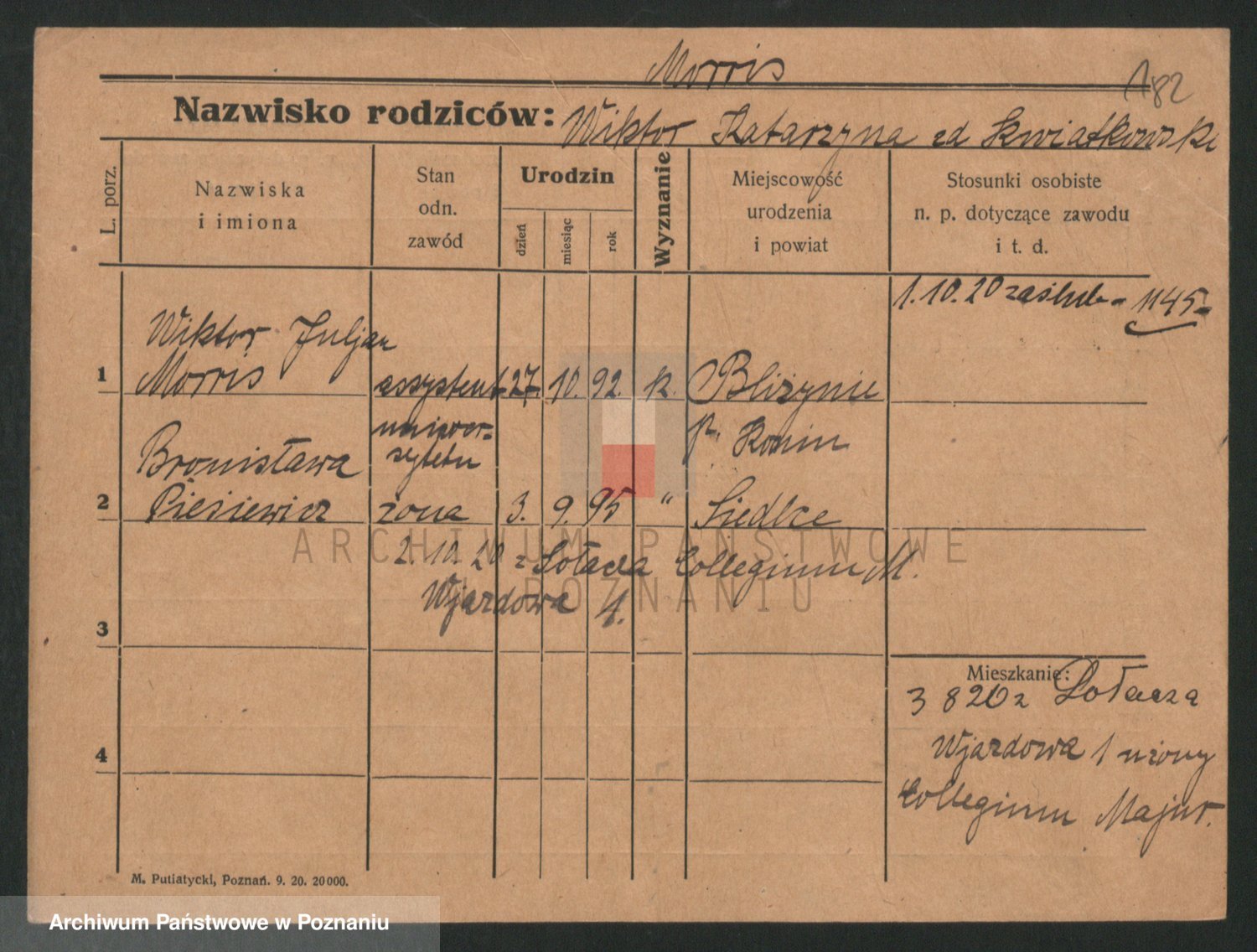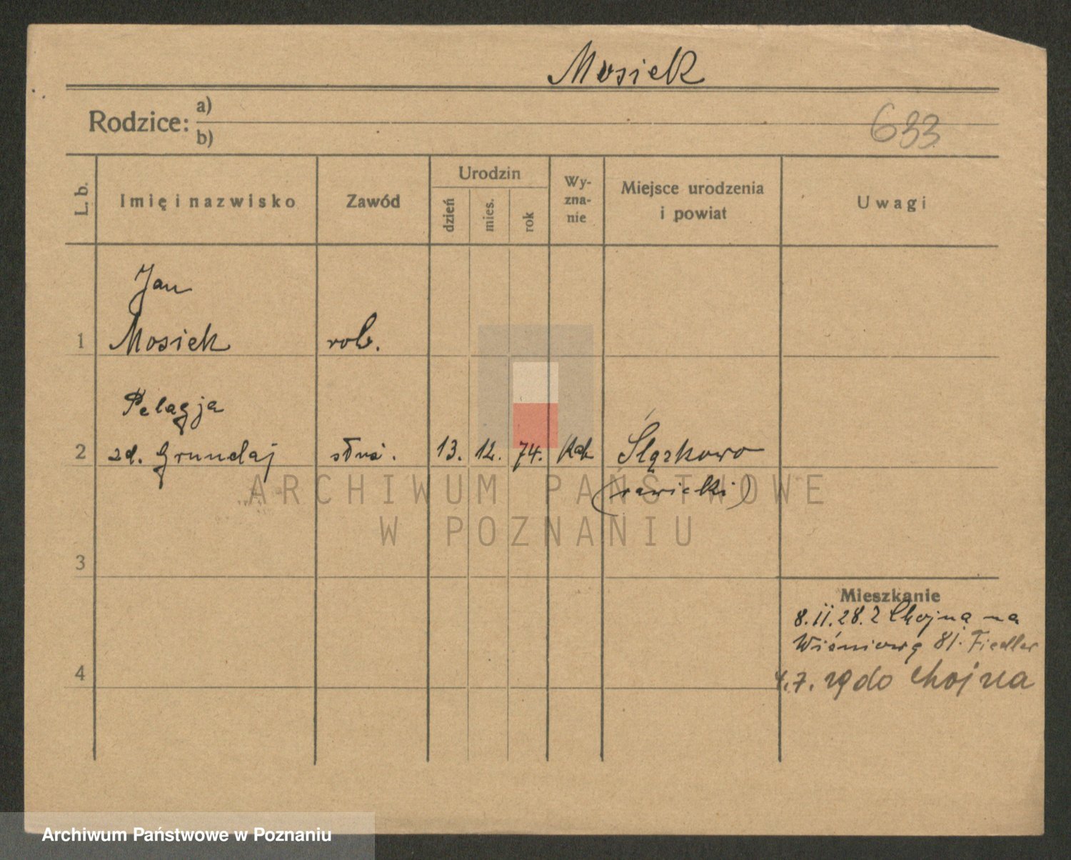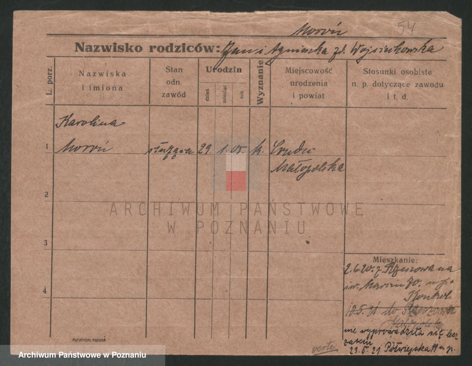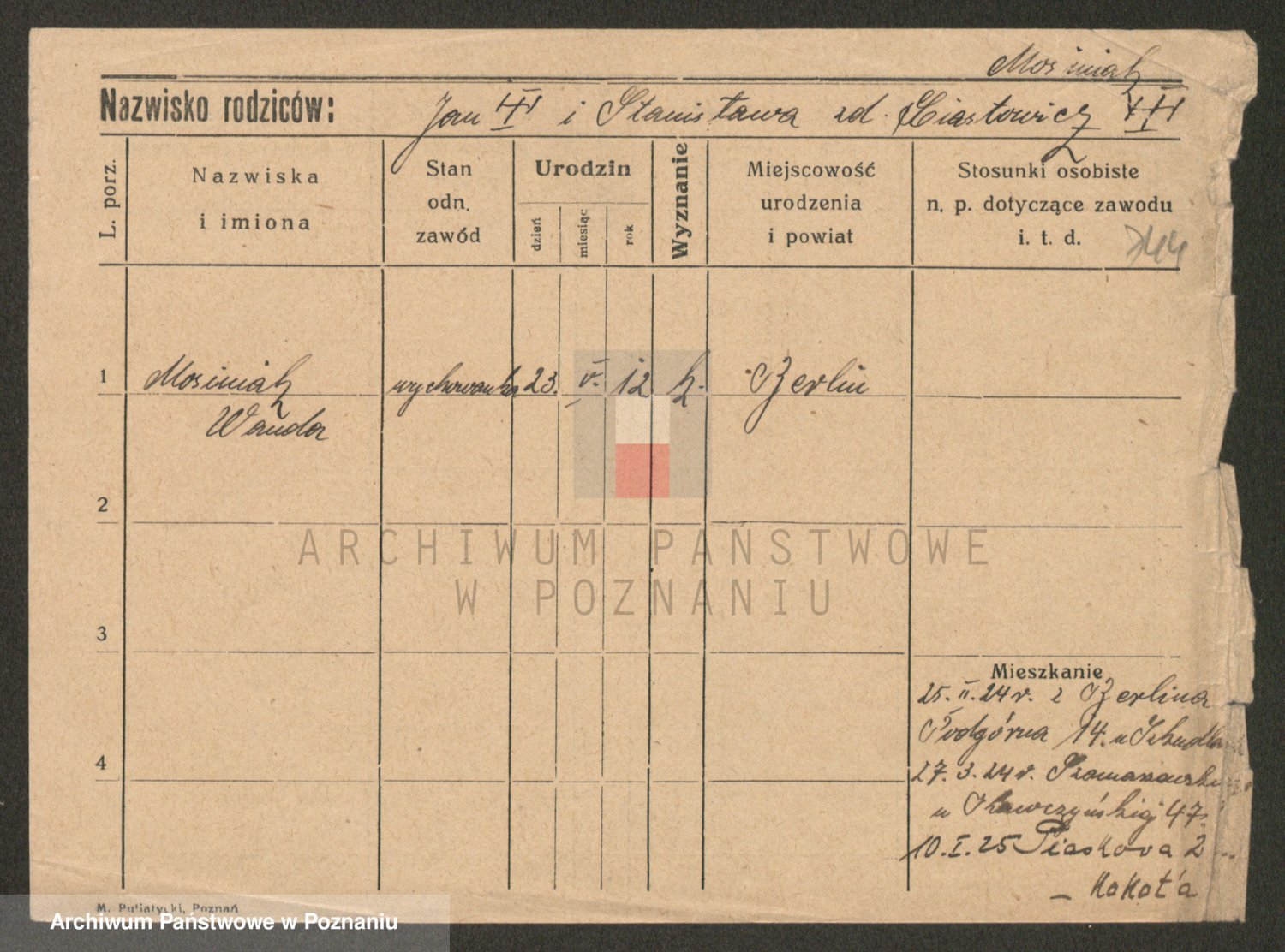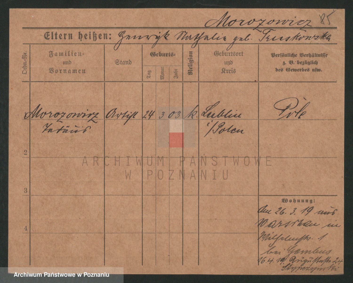 Podgląd karty osobowej dostępny jest po kliknięciu na nazwisko lub ikonkę karty. Można dokonywać powiększenia (ikony na górze) lub przechodzić między kolejnymi skanami (strzałki po bokach).