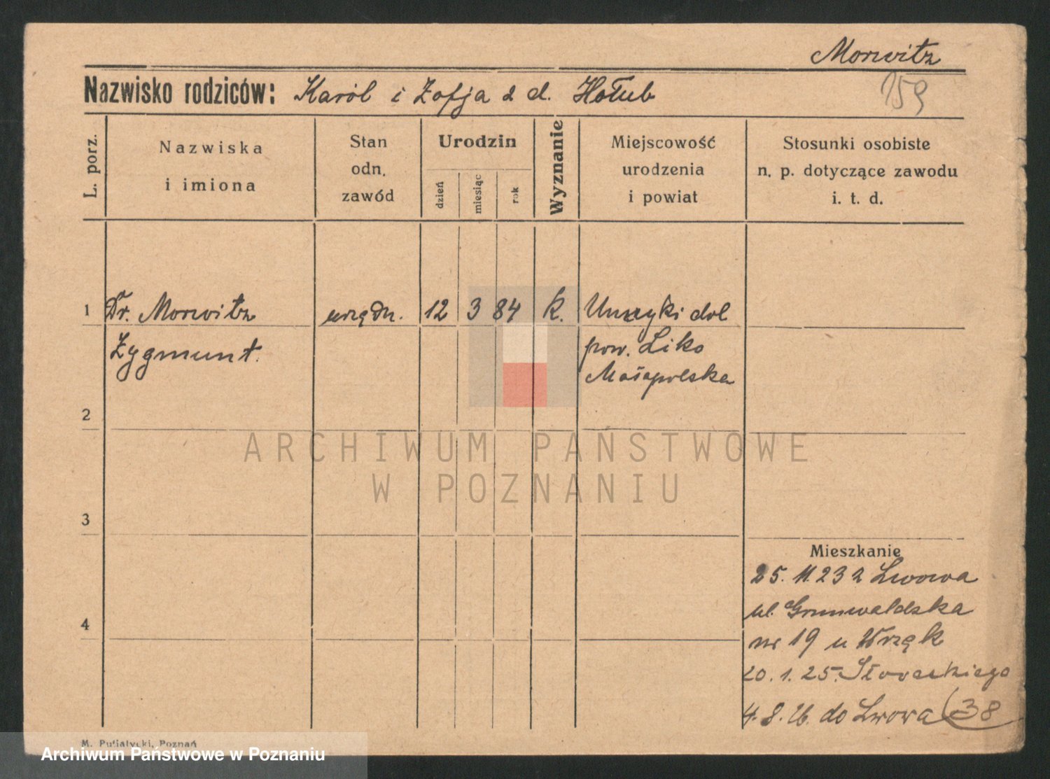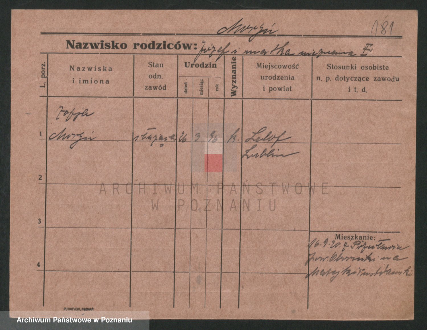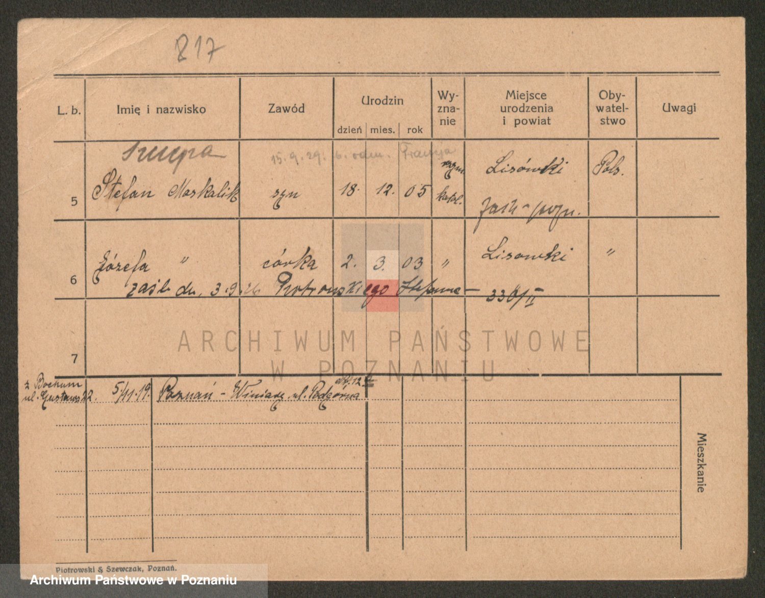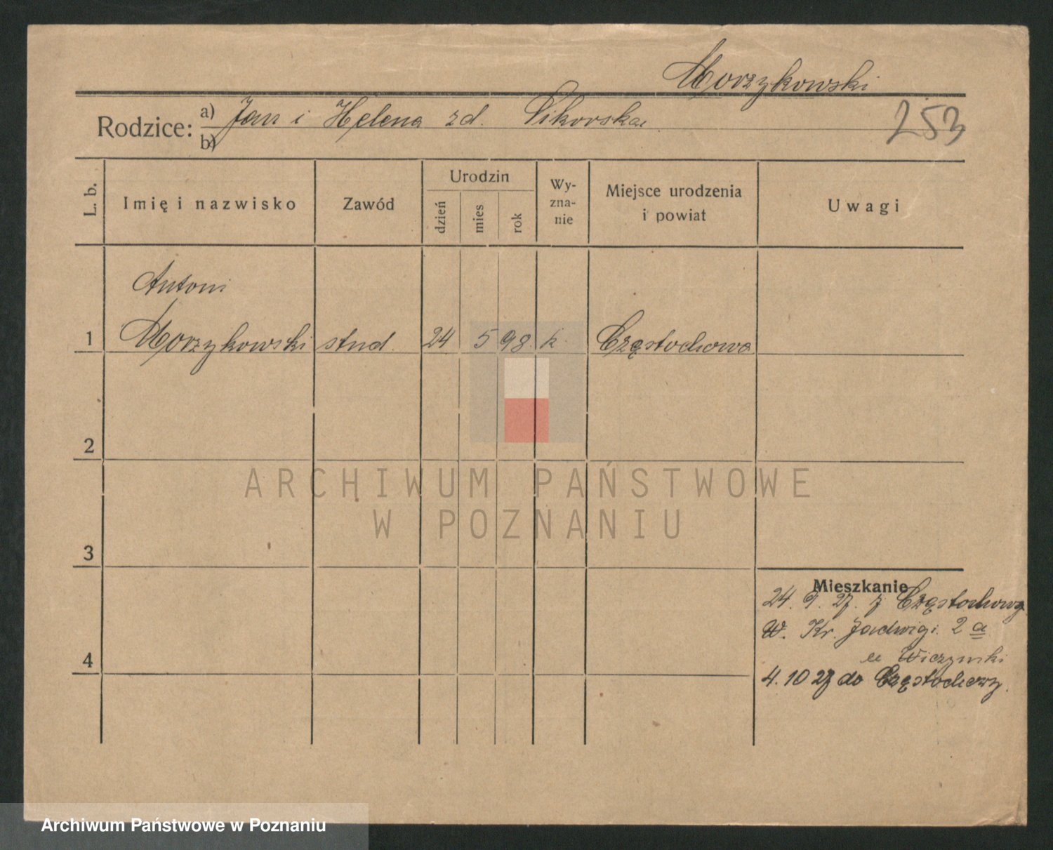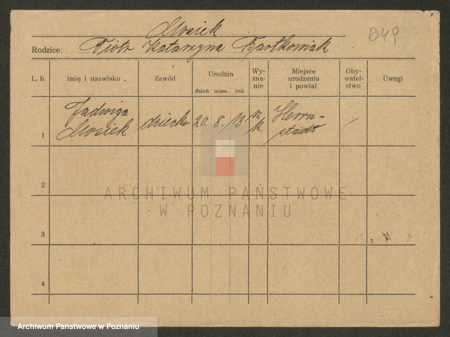 Podgląd karty osobowej dostępny jest po kliknięciu na nazwisko lub ikonkę karty. Można dokonywać powiększenia (ikony na górze) lub przechodzić między kolejnymi skanami (strzałki po bokach).