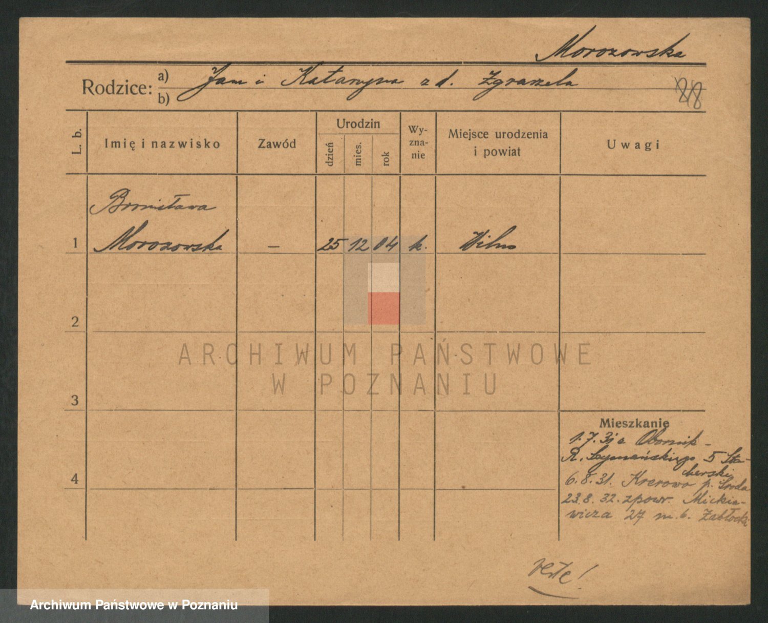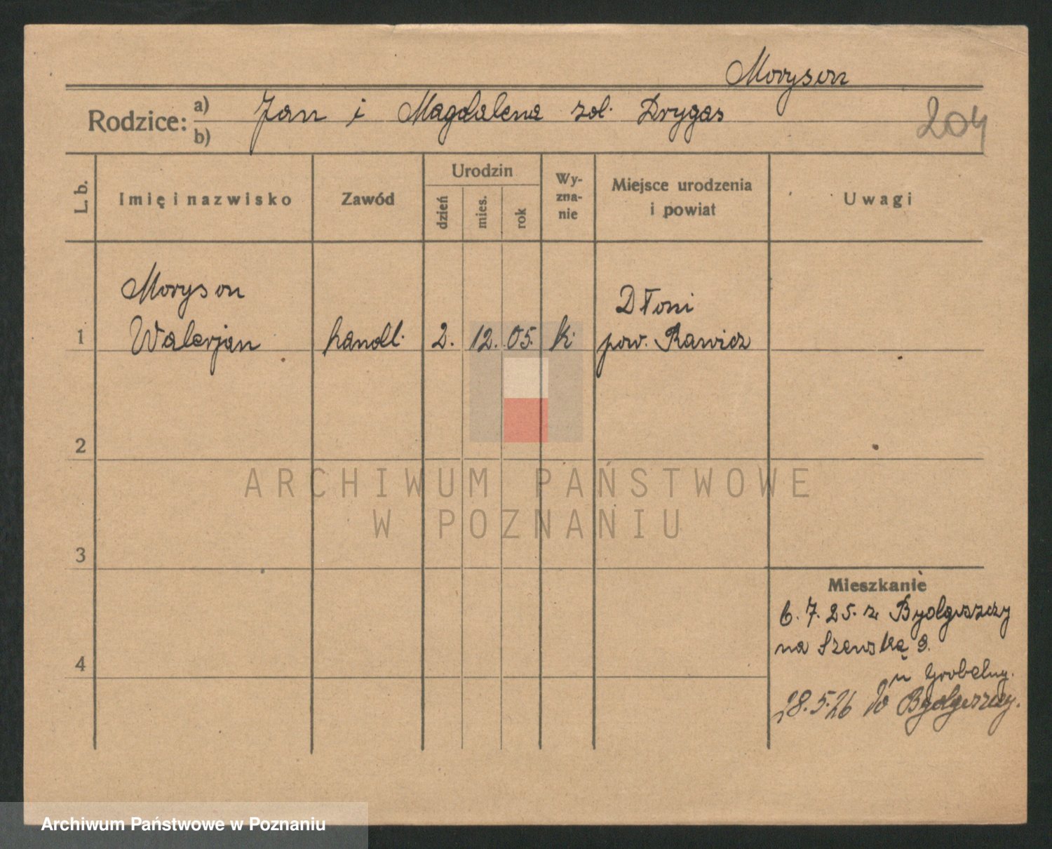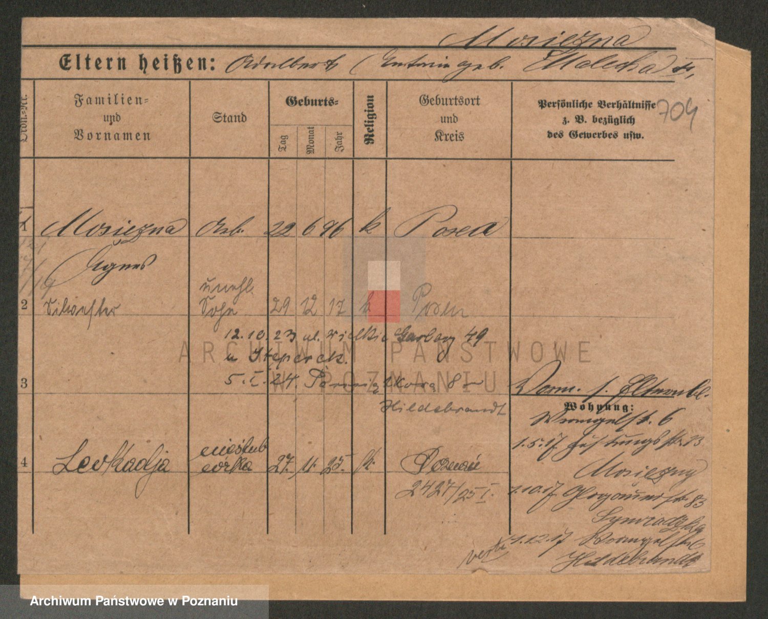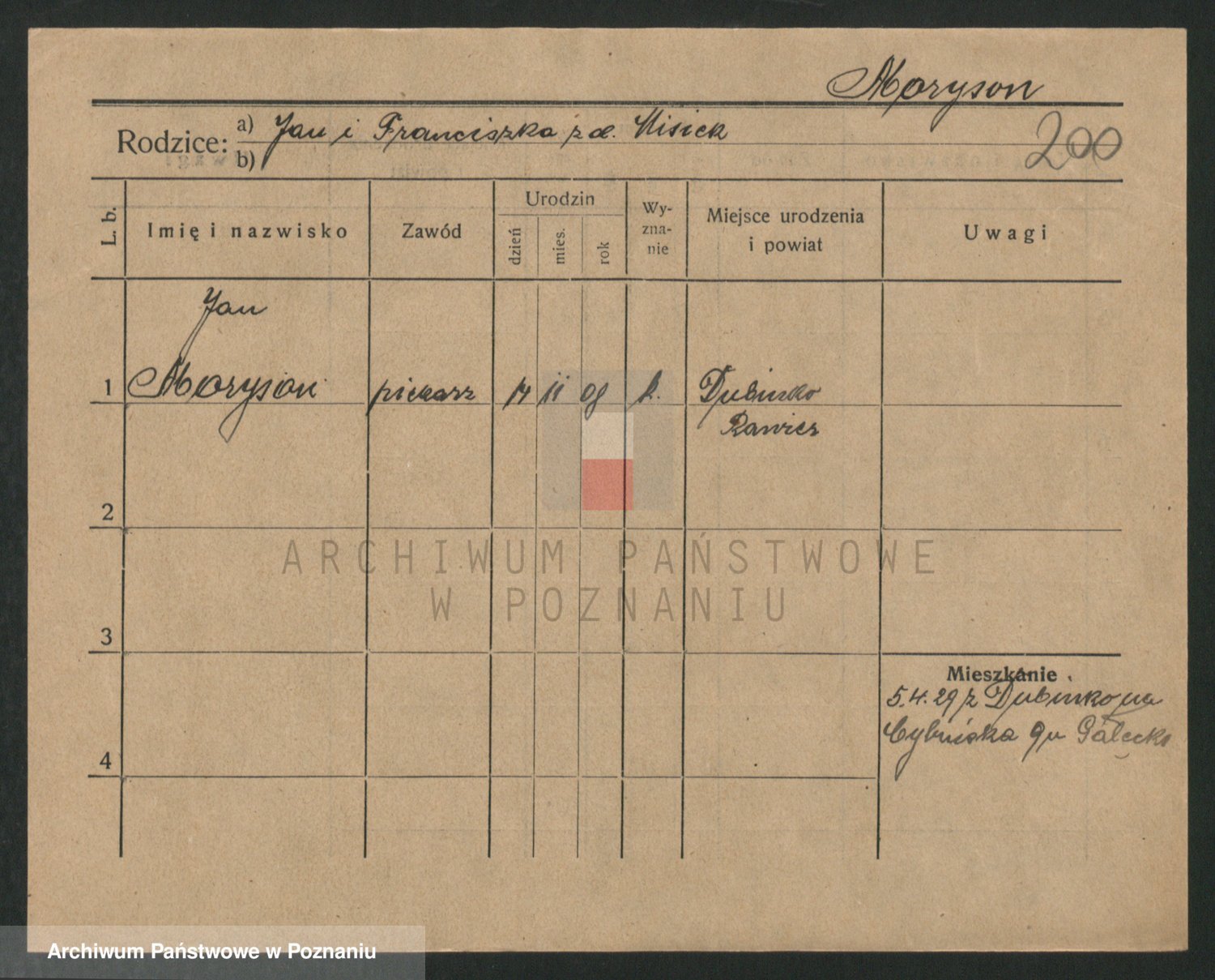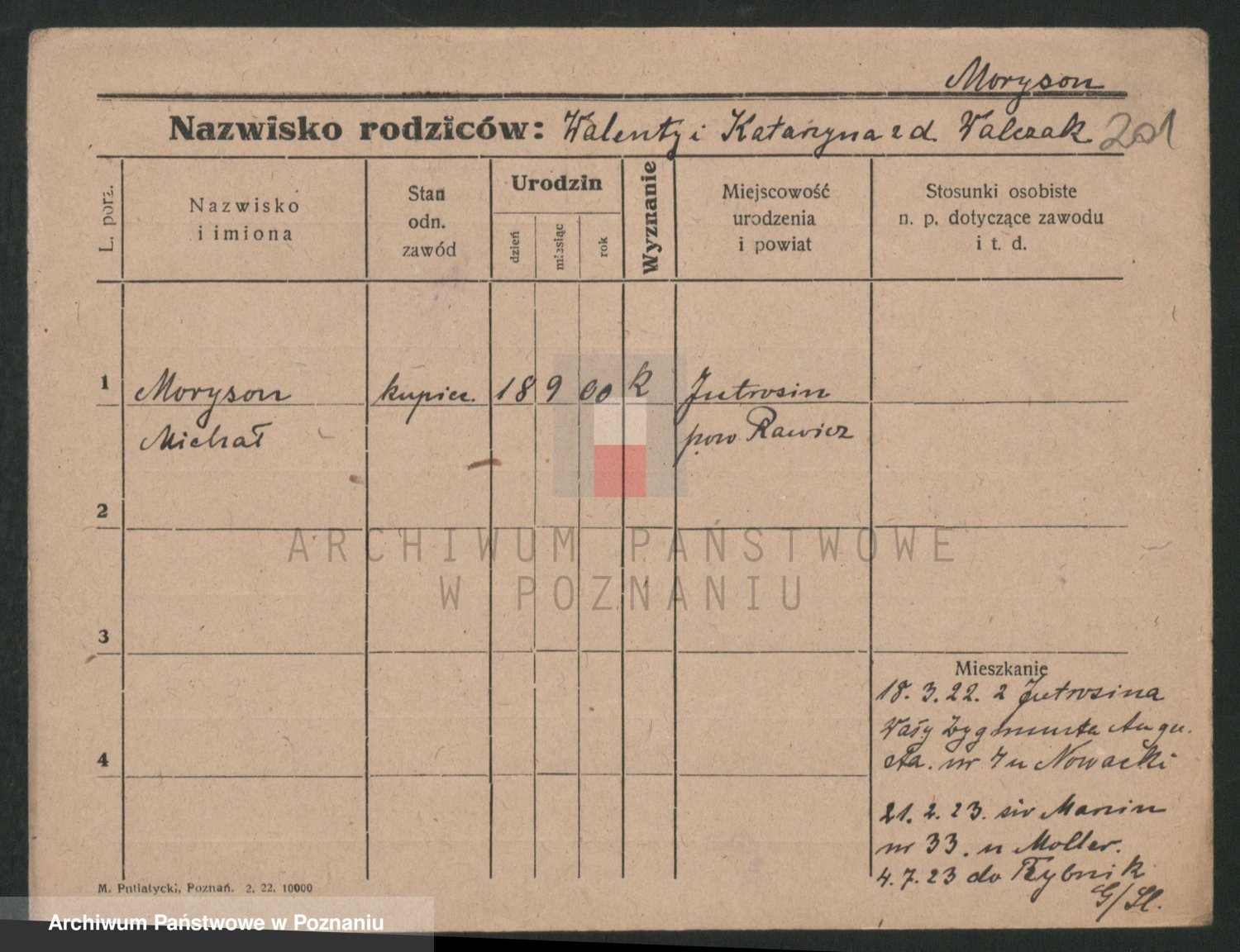 Podgląd karty osobowej dostępny jest po kliknięciu na nazwisko lub ikonkę karty. Można dokonywać powiększenia (ikony na górze) lub przechodzić między kolejnymi skanami (strzałki po bokach).