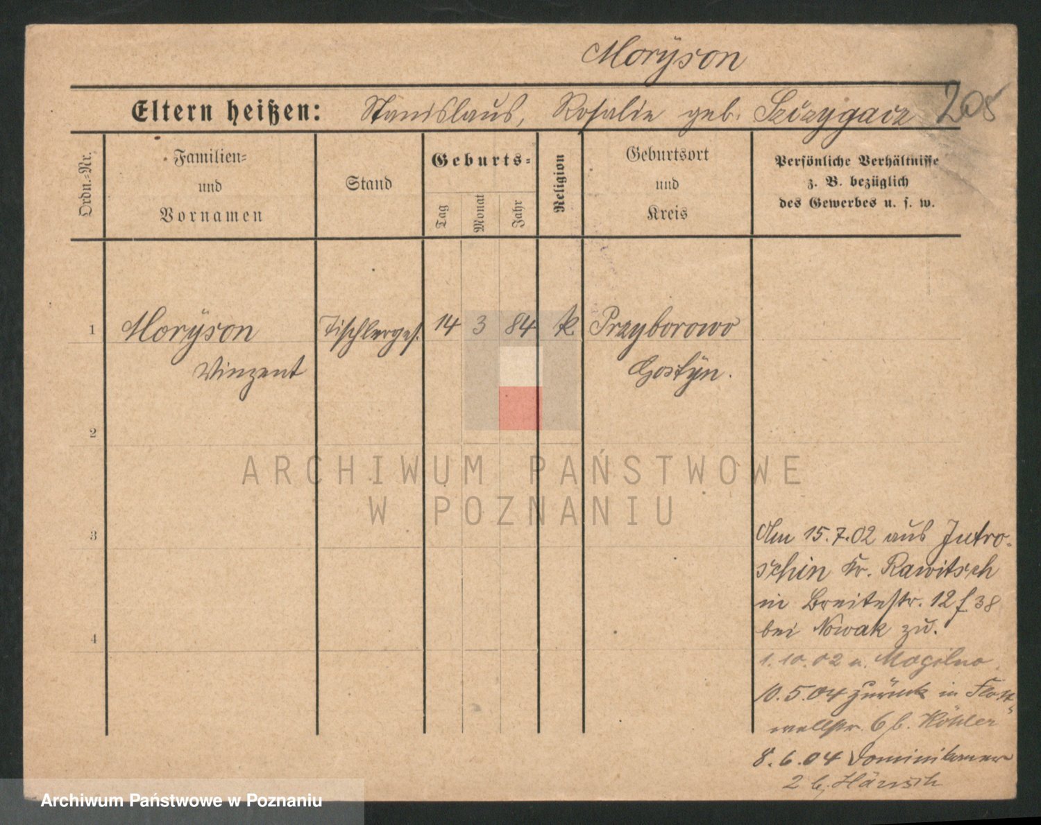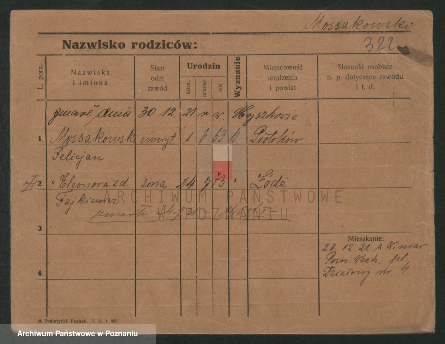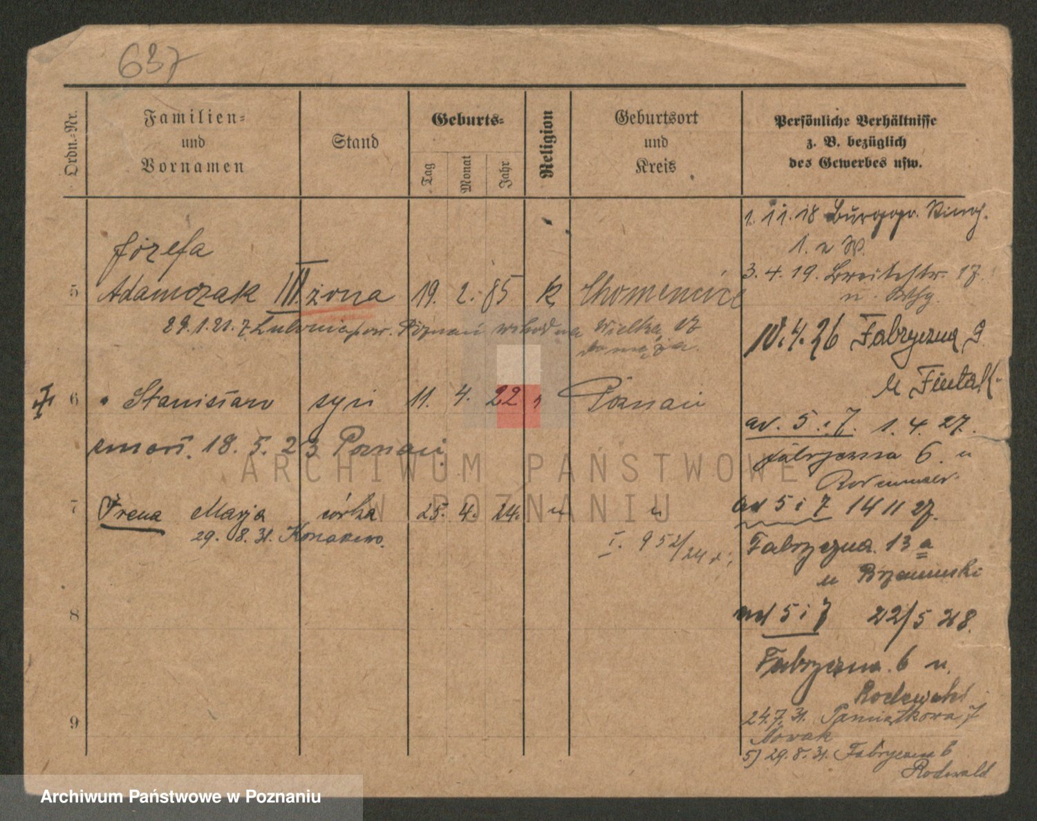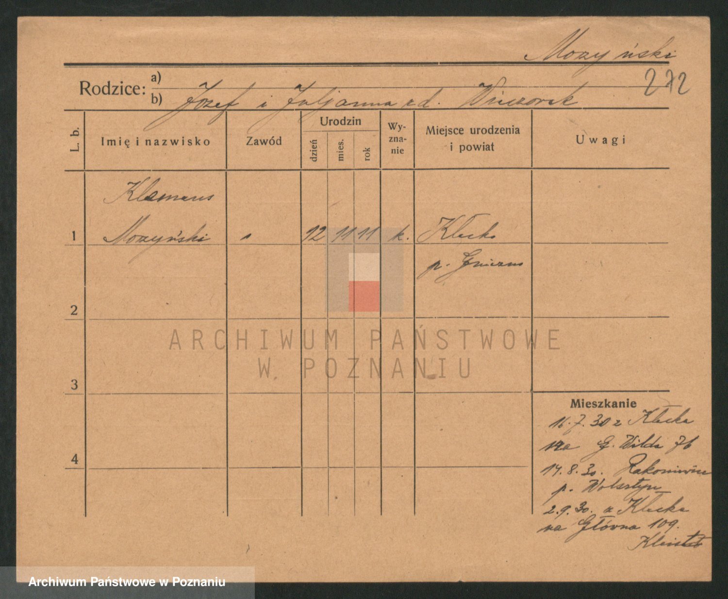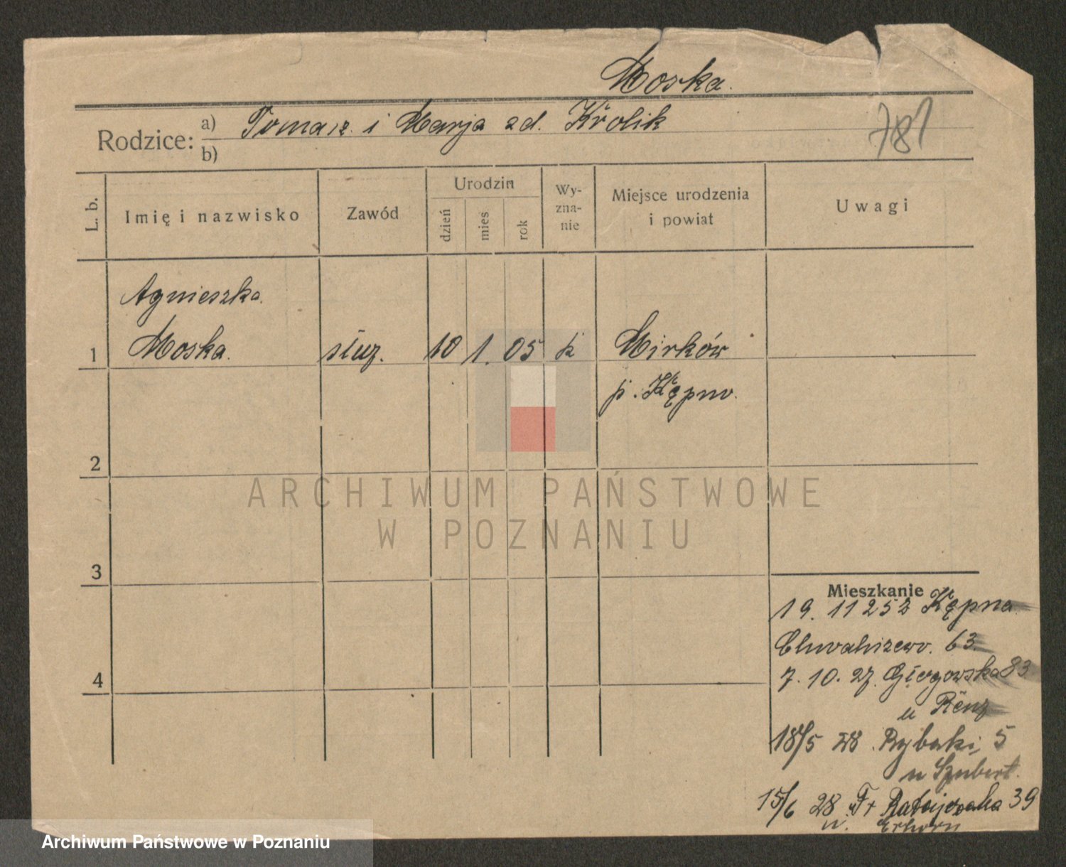 Podgląd karty osobowej dostępny jest po kliknięciu na nazwisko lub ikonkę karty. Można dokonywać powiększenia (ikony na górze) lub przechodzić między kolejnymi skanami (strzałki po bokach).