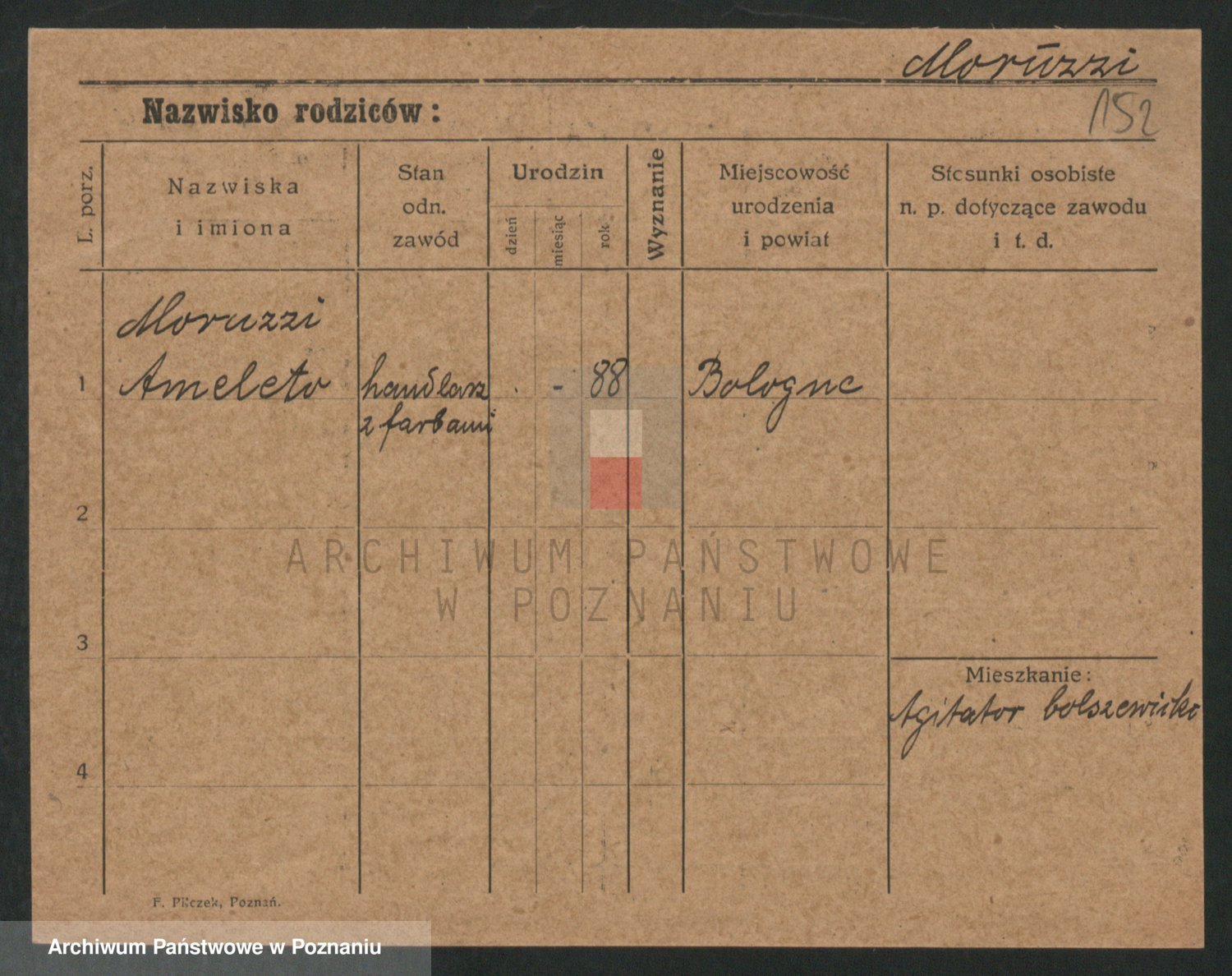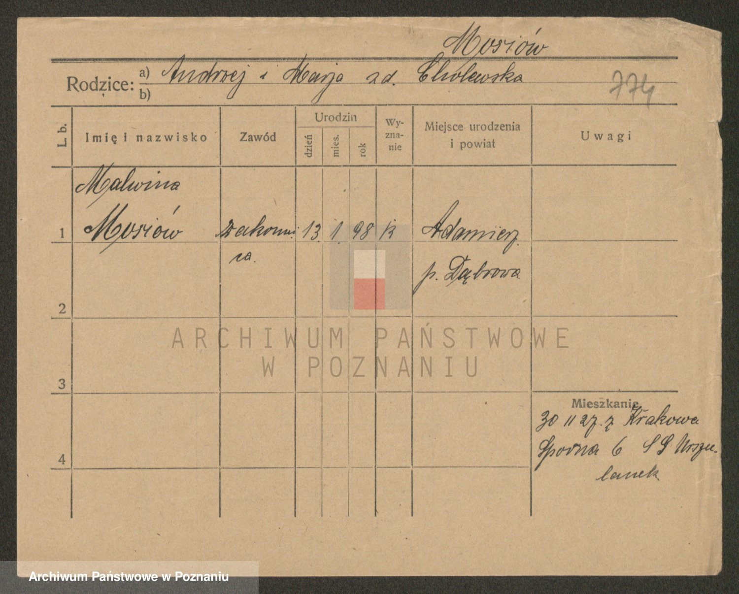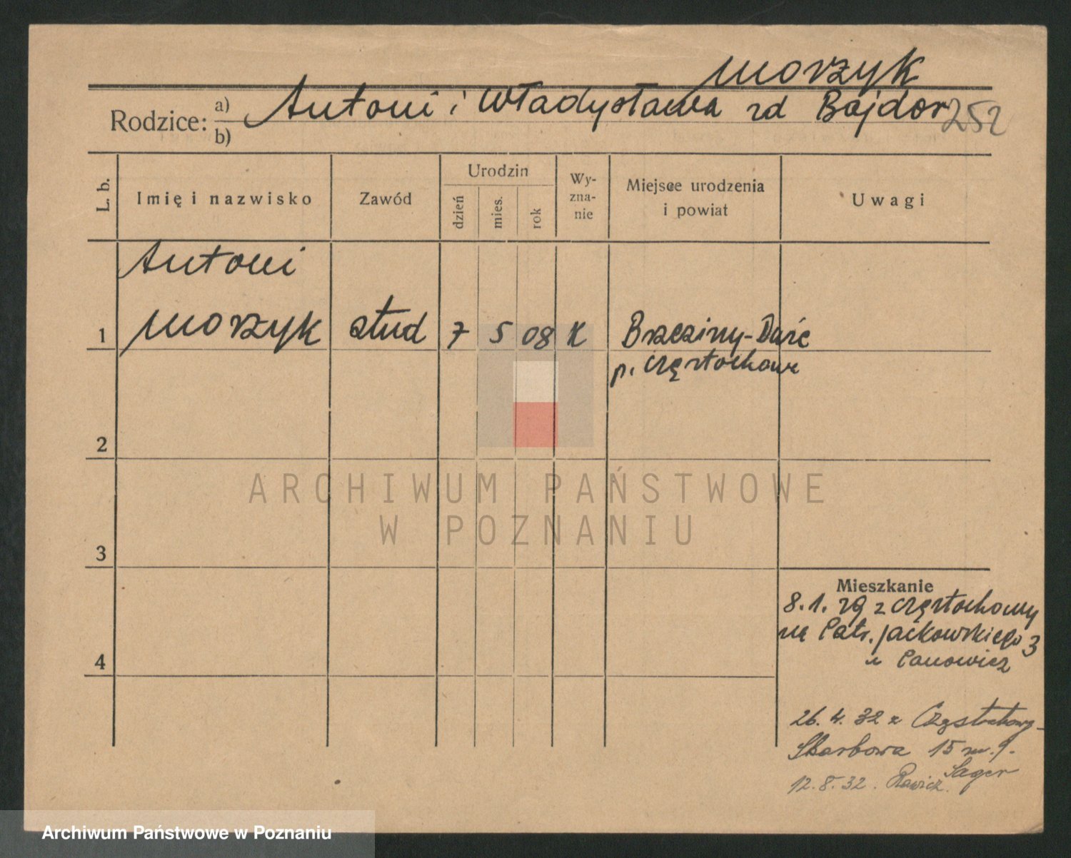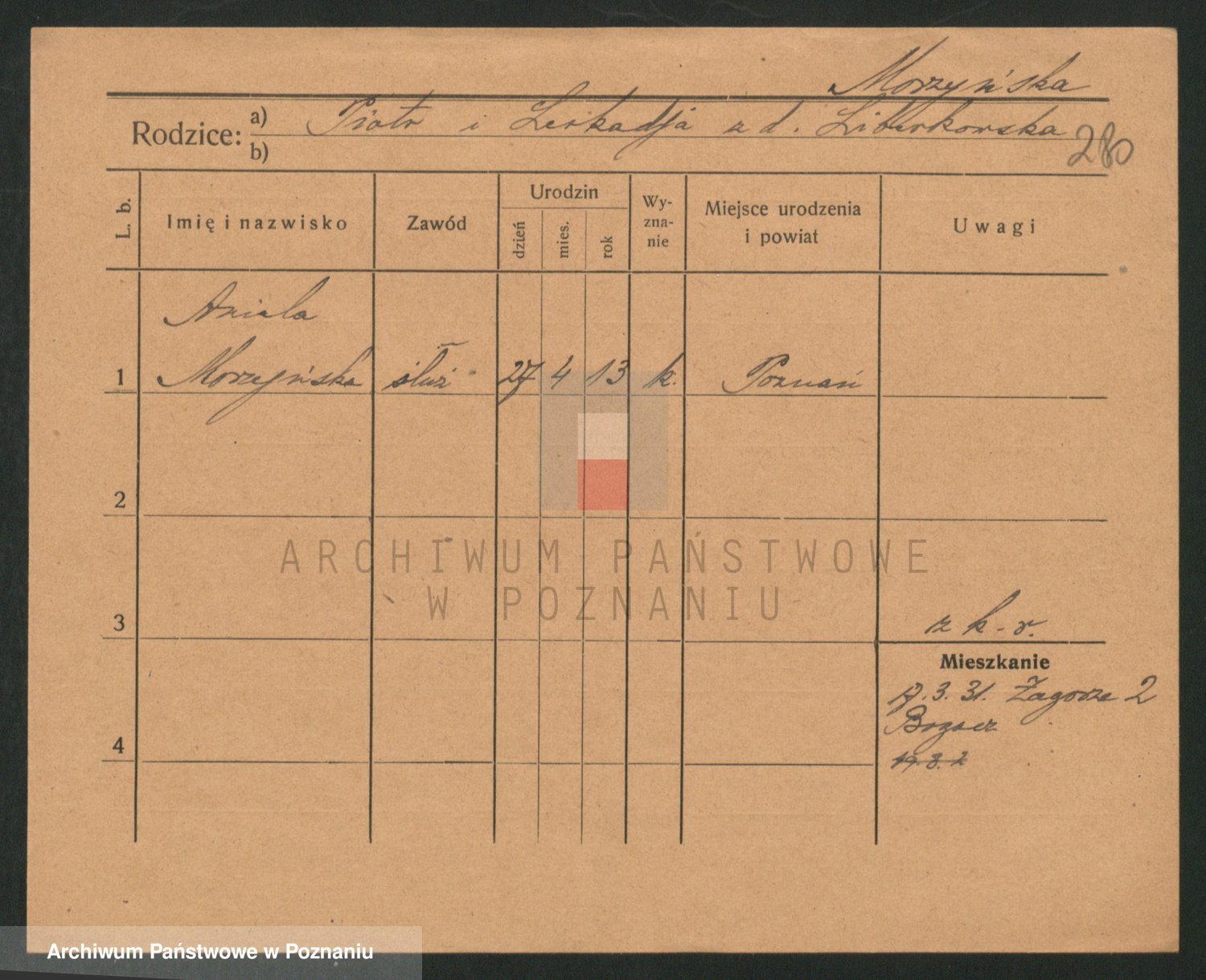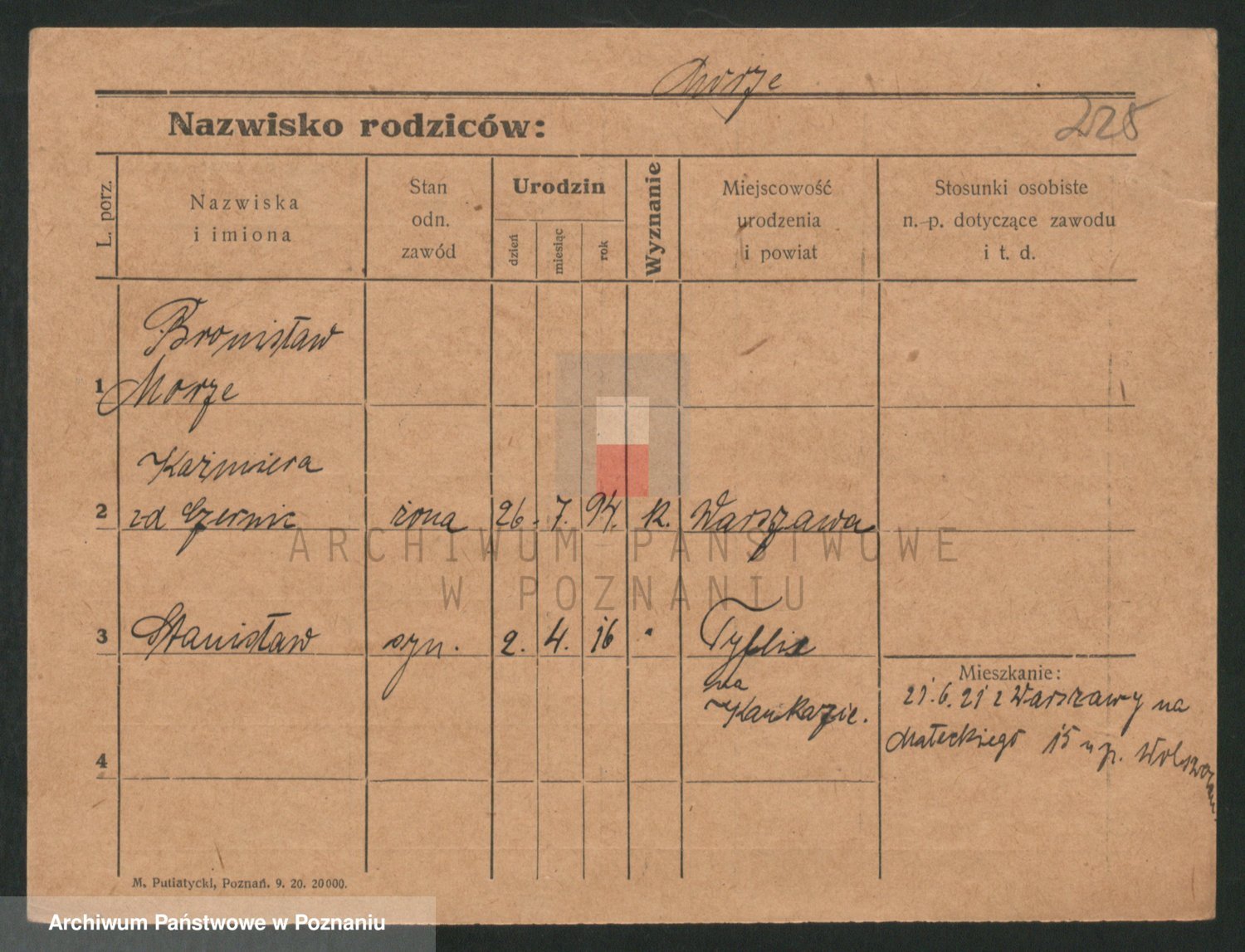 Podgląd karty osobowej dostępny jest po kliknięciu na nazwisko lub ikonkę karty. Można dokonywać powiększenia (ikony na górze) lub przechodzić między kolejnymi skanami (strzałki po bokach).