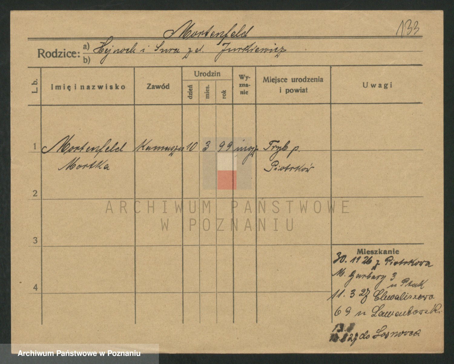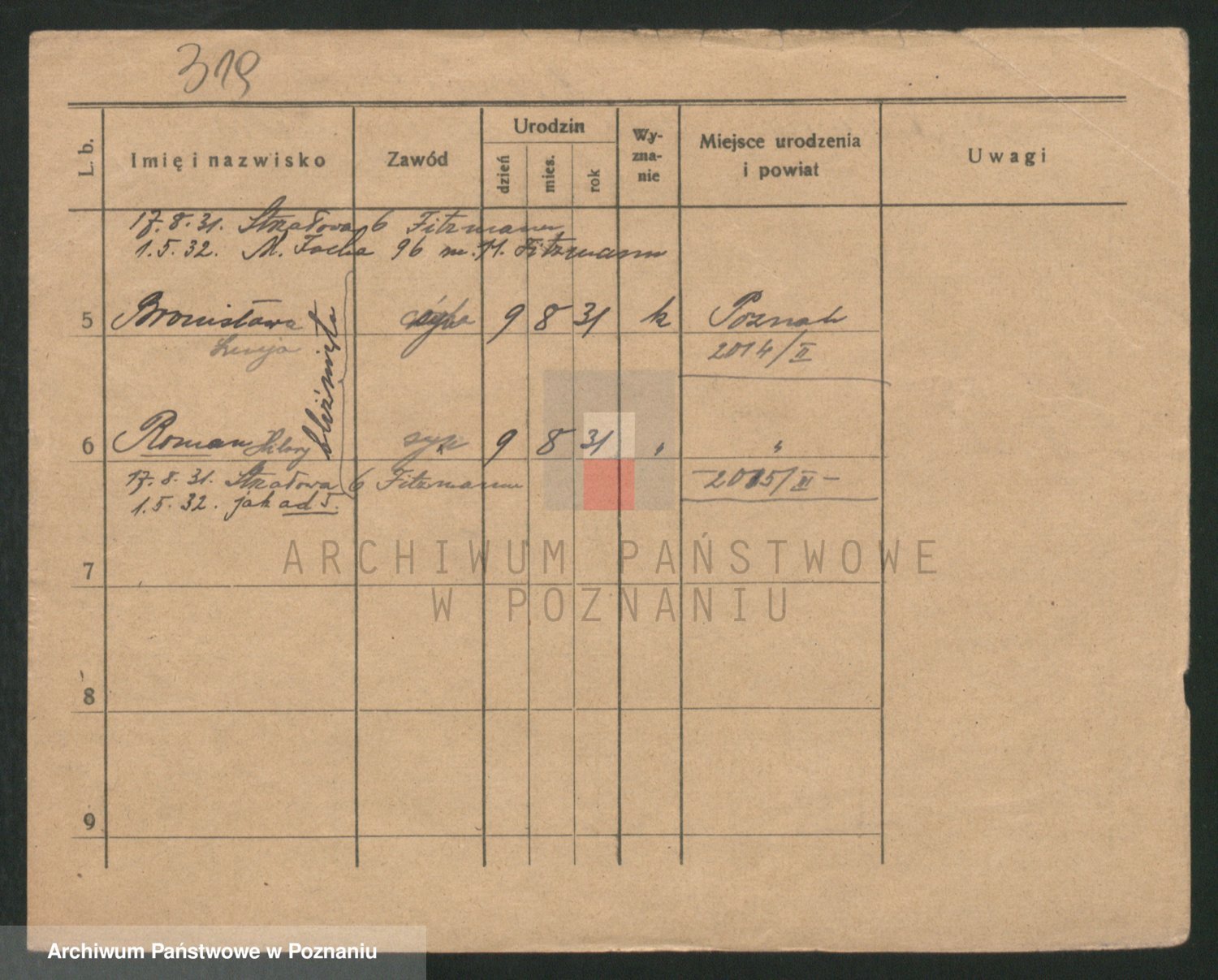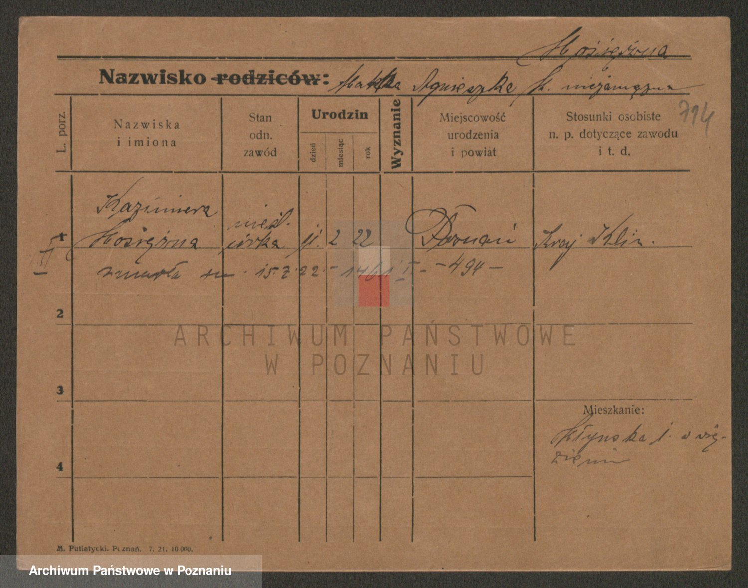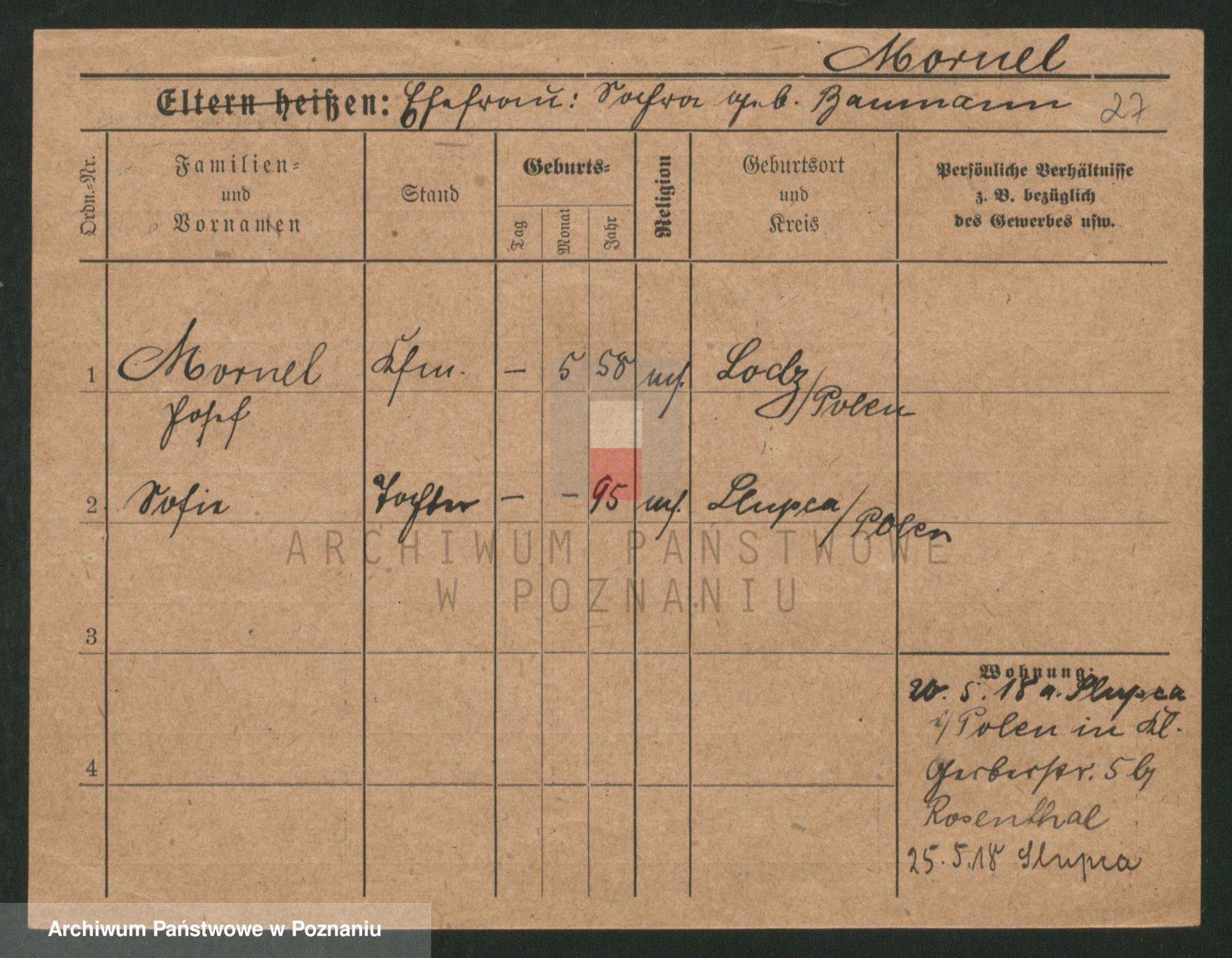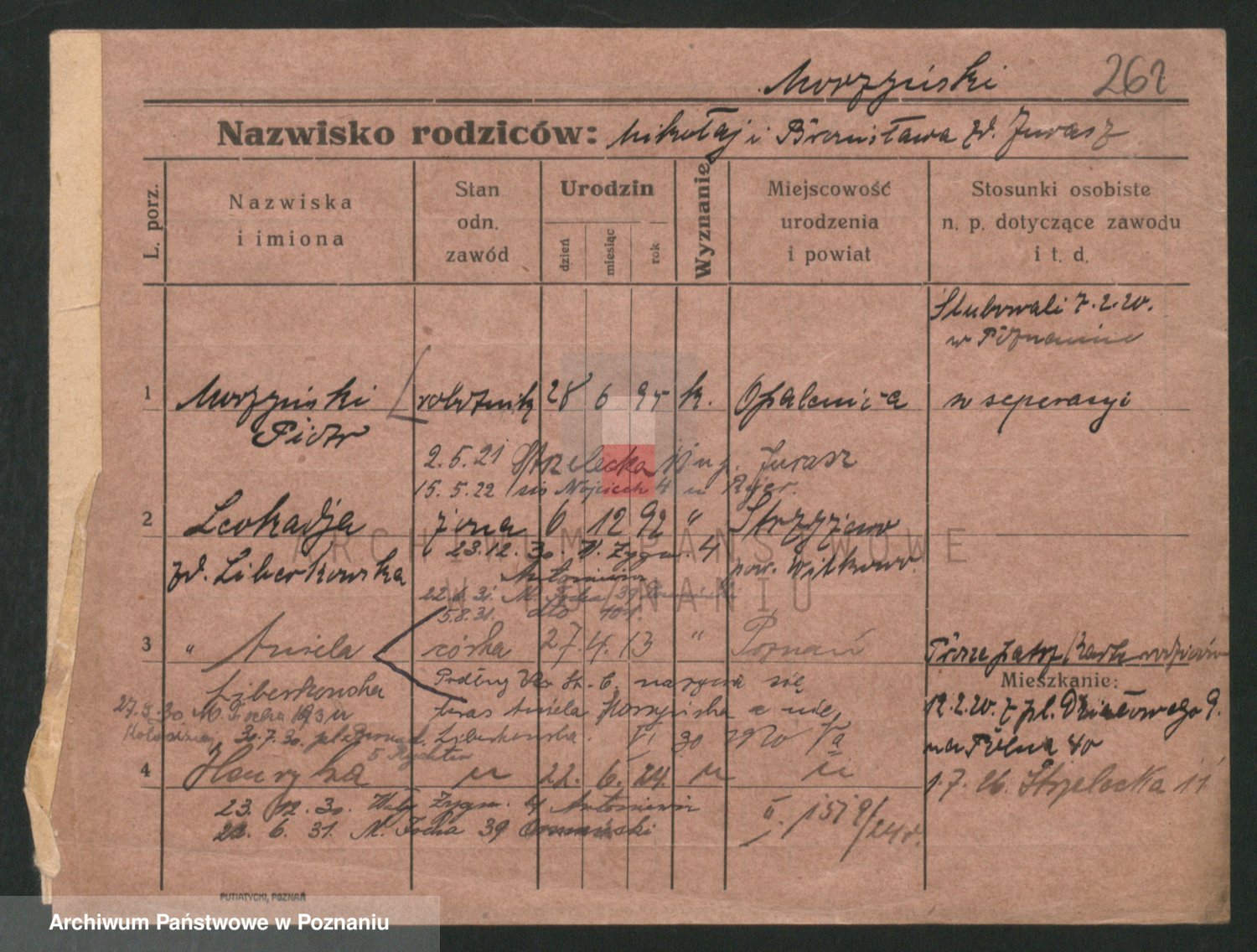 Podgląd karty osobowej dostępny jest po kliknięciu na nazwisko lub ikonkę karty. Można dokonywać powiększenia (ikony na górze) lub przechodzić między kolejnymi skanami (strzałki po bokach).