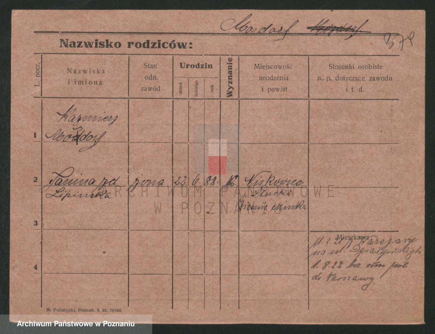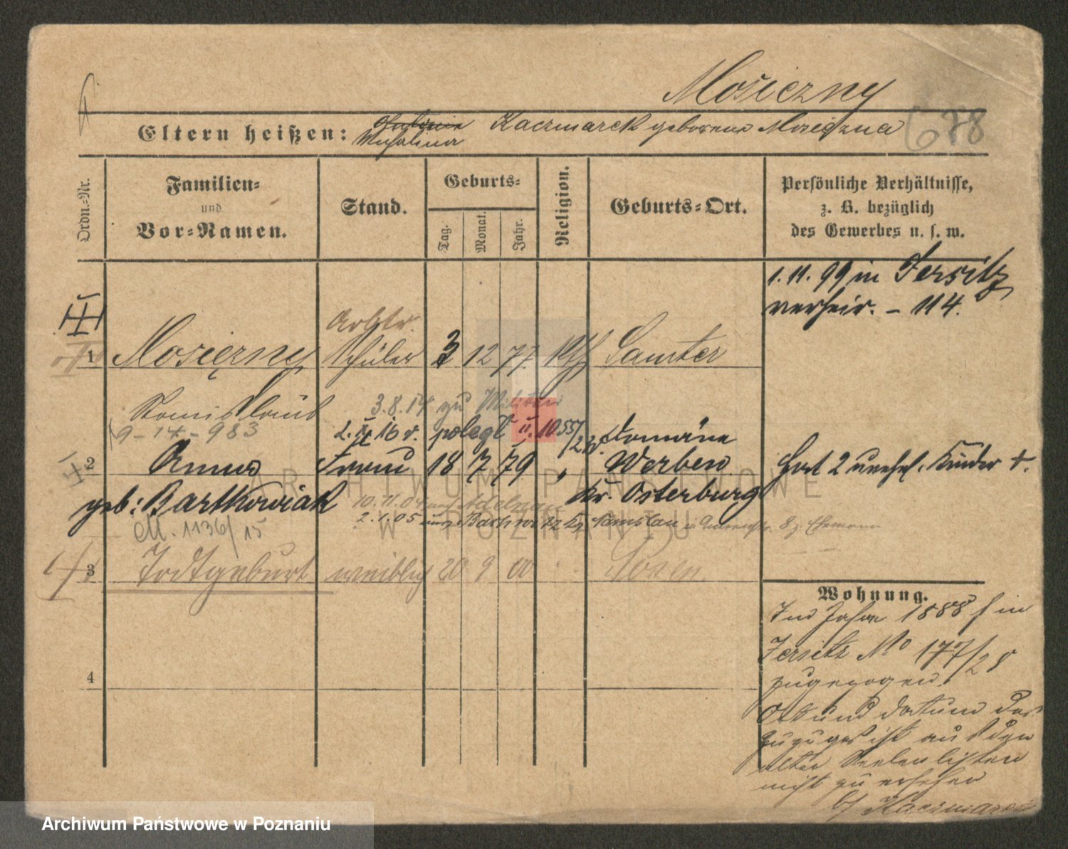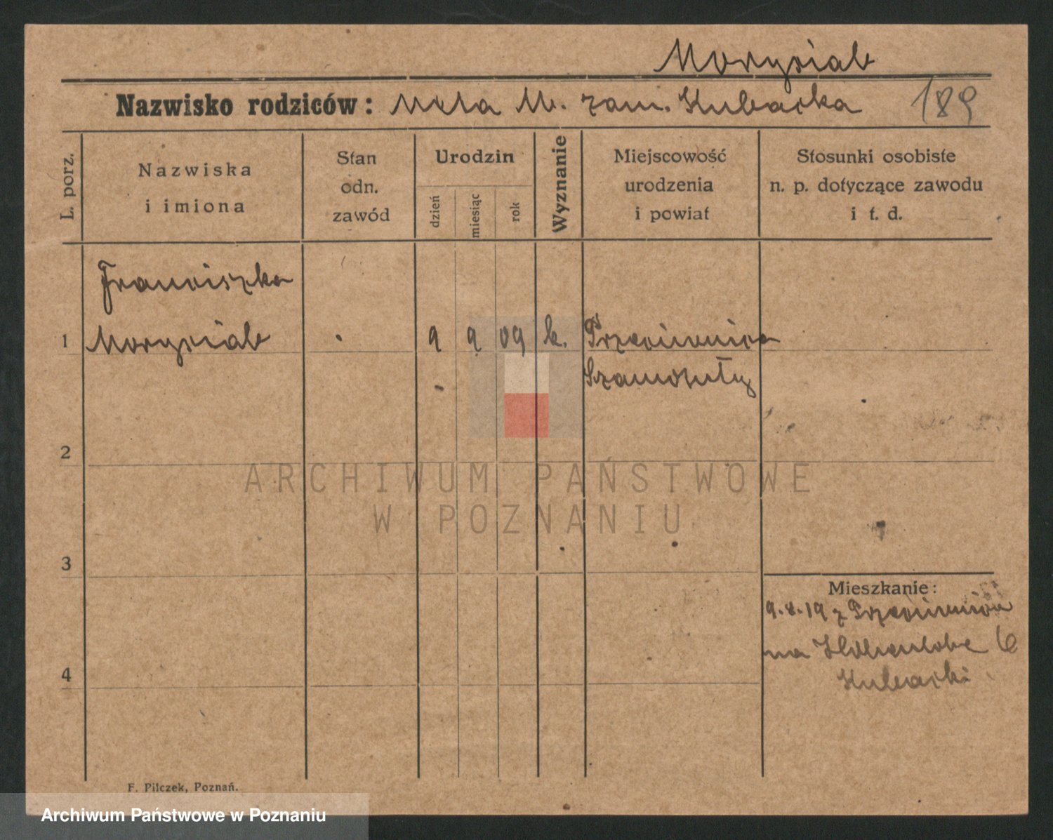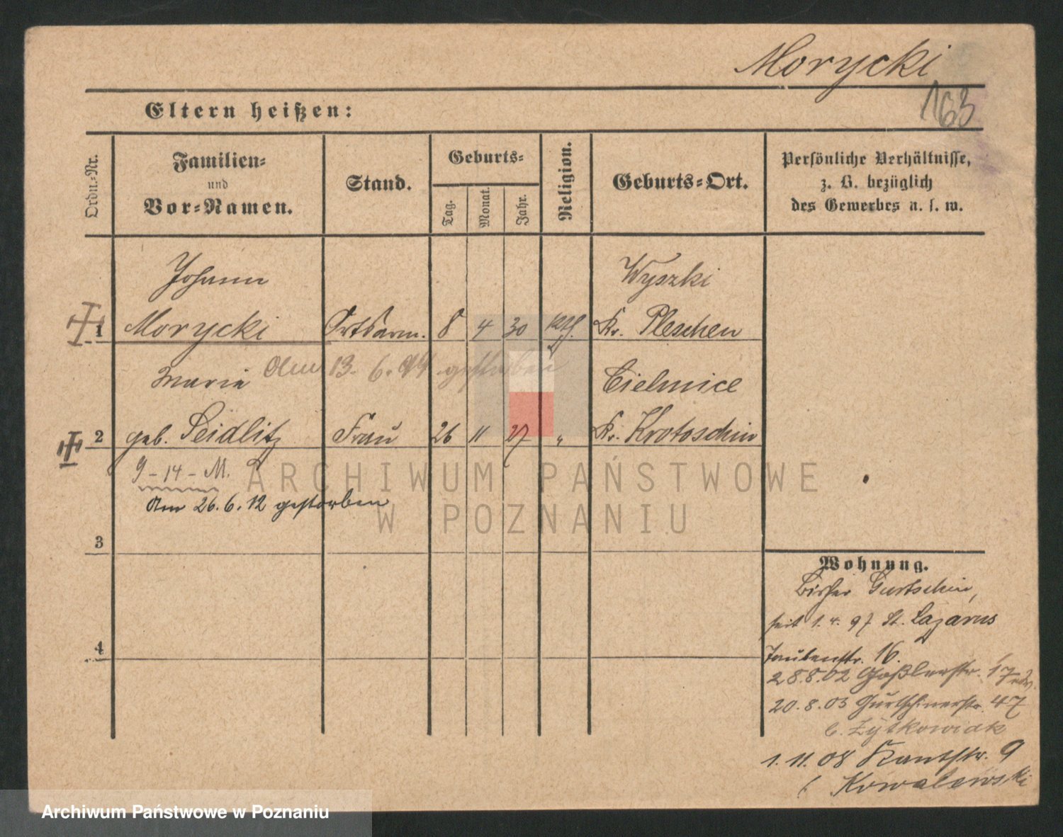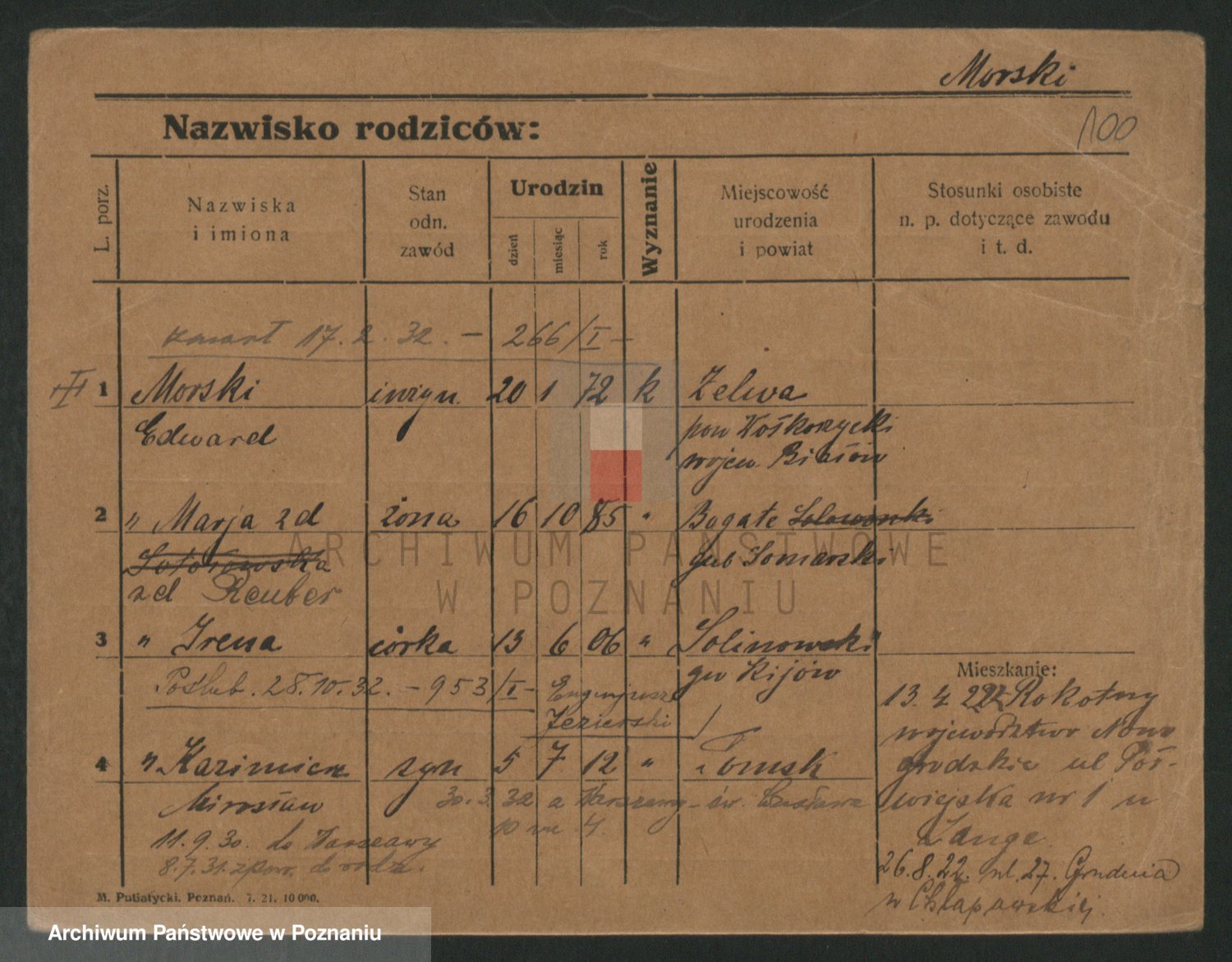 Podgląd karty osobowej dostępny jest po kliknięciu na nazwisko lub ikonkę karty. Można dokonywać powiększenia (ikony na górze) lub przechodzić między kolejnymi skanami (strzałki po bokach).