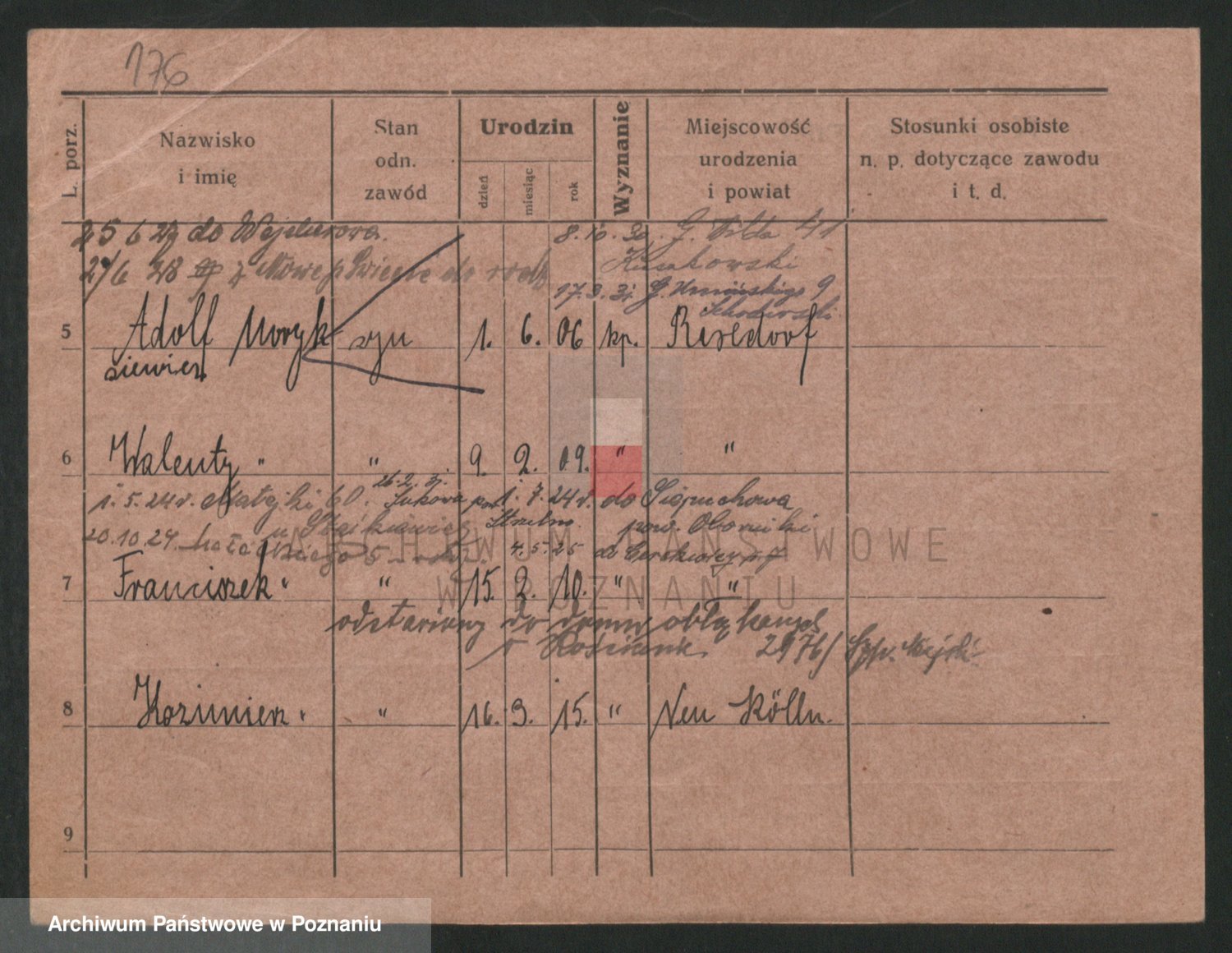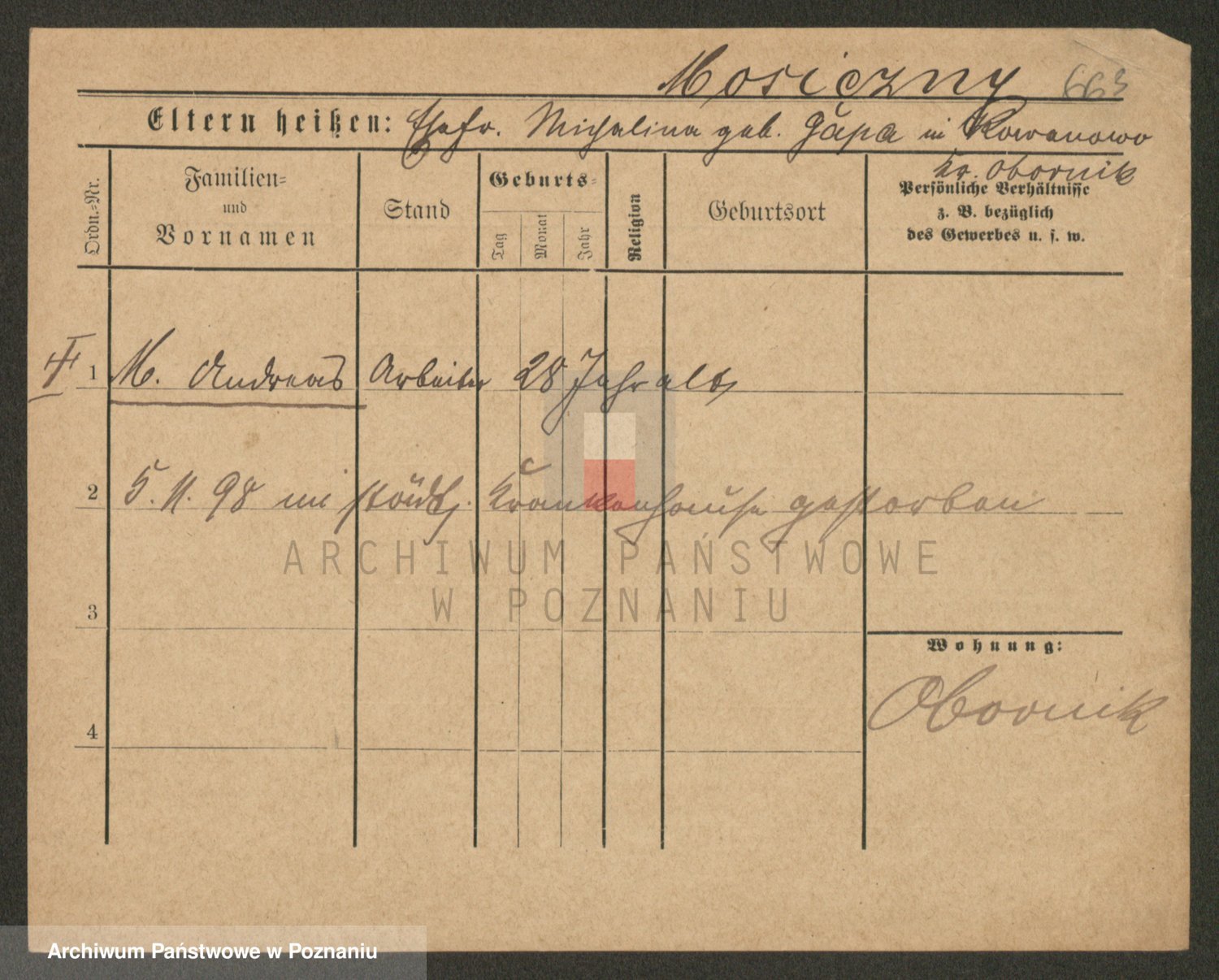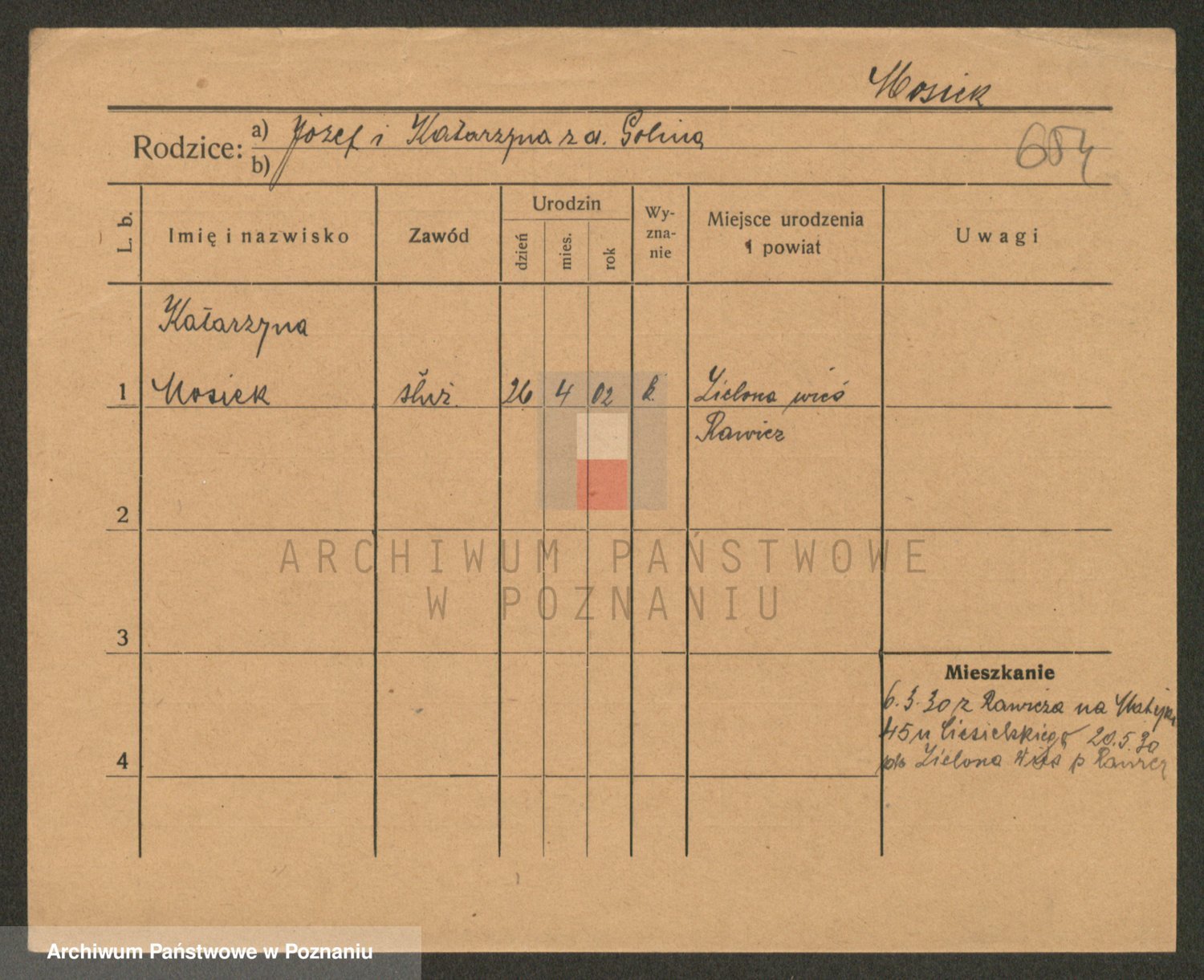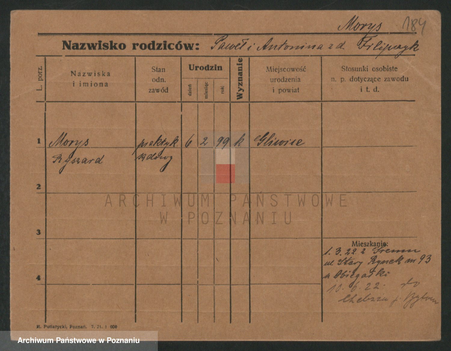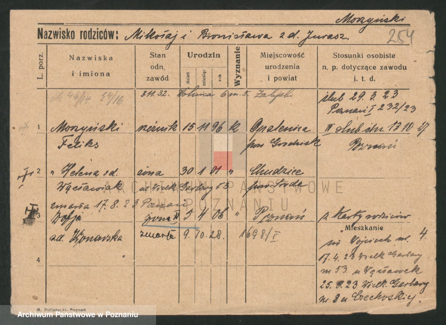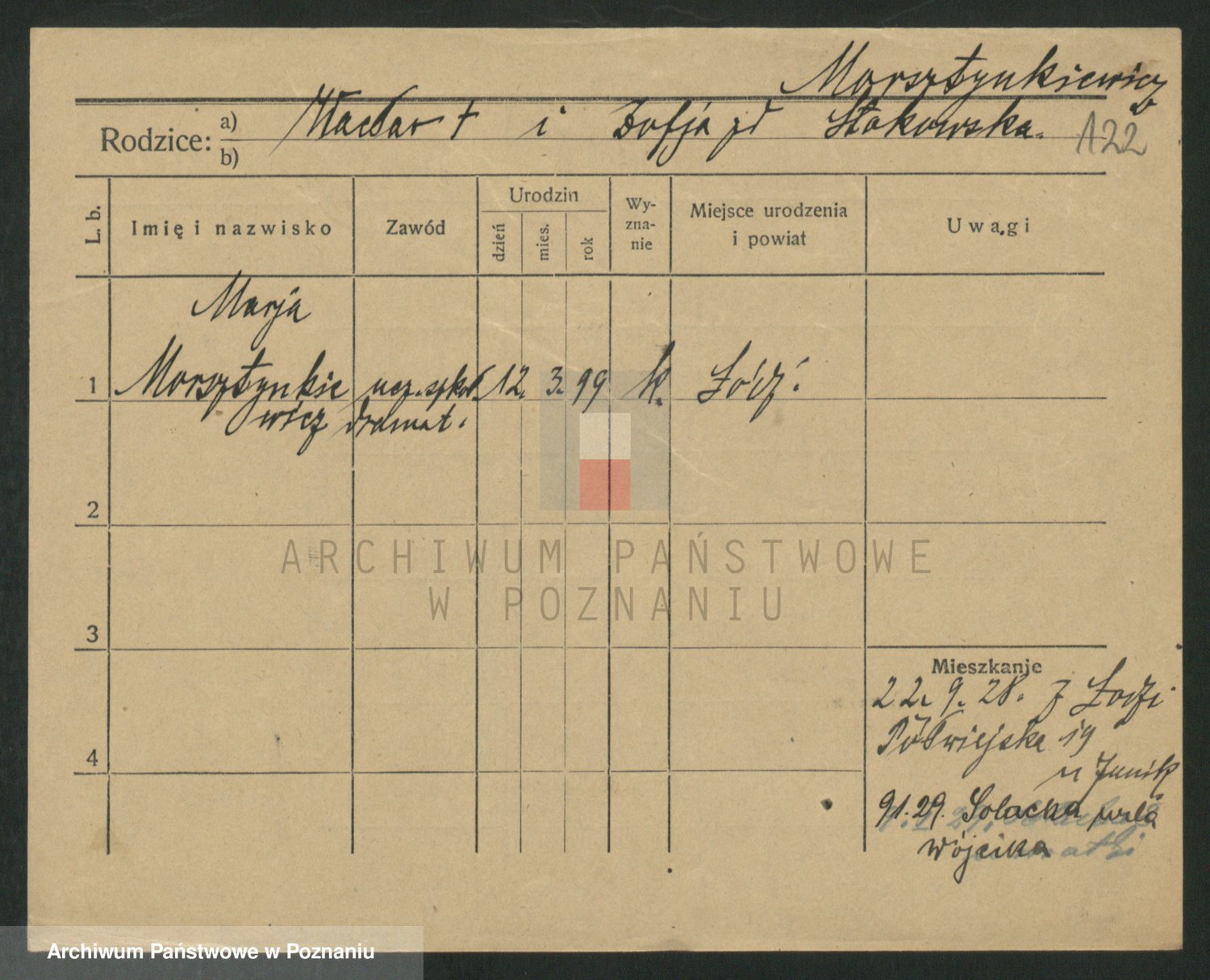 Podgląd karty osobowej dostępny jest po kliknięciu na nazwisko lub ikonkę karty. Można dokonywać powiększenia (ikony na górze) lub przechodzić między kolejnymi skanami (strzałki po bokach).